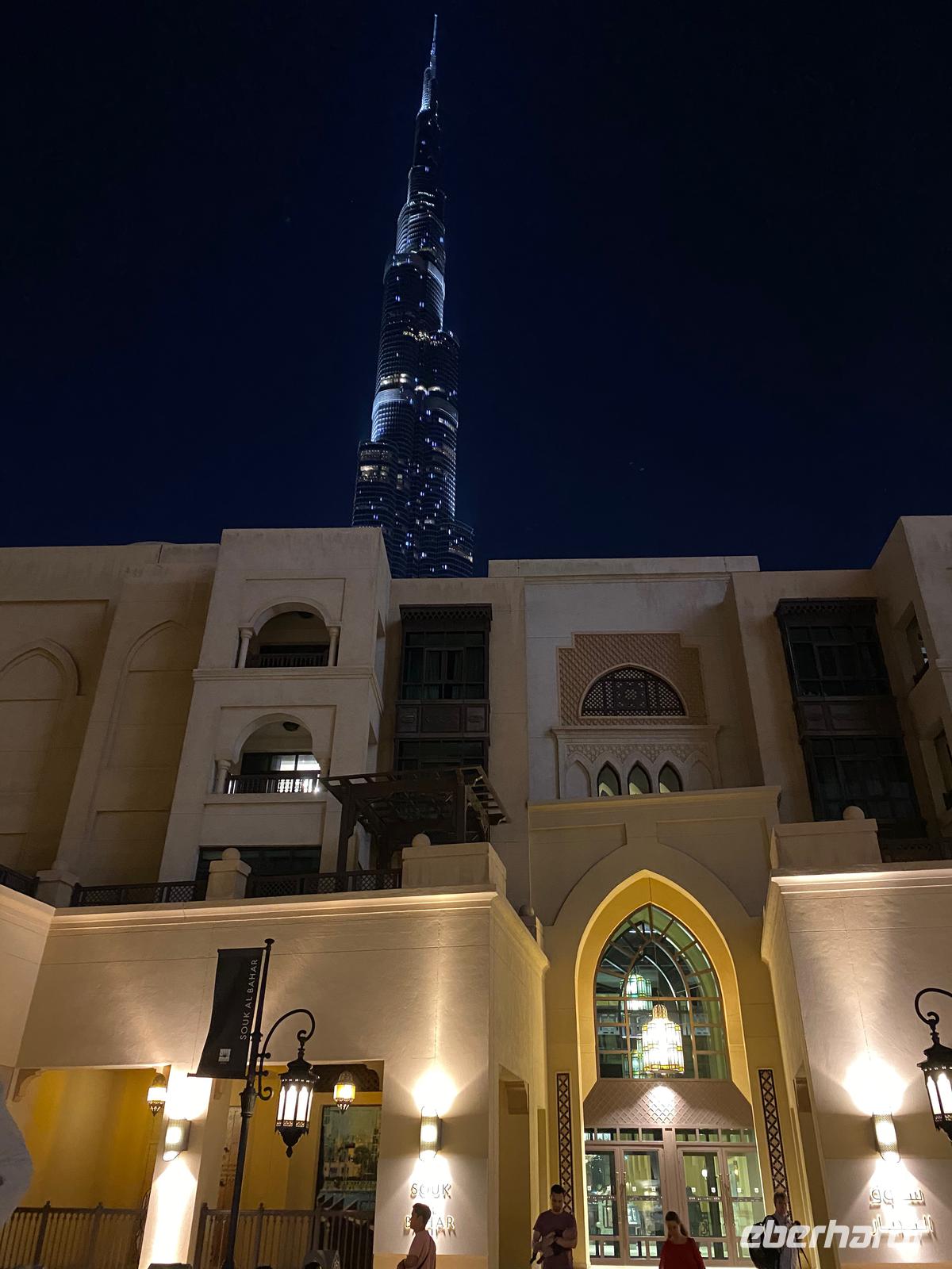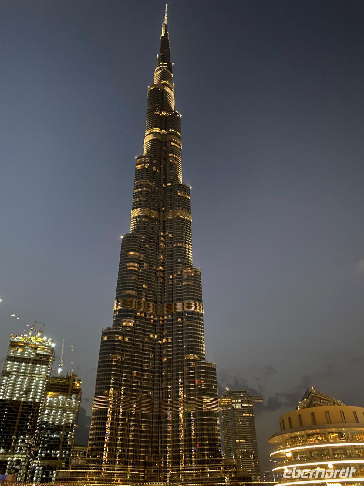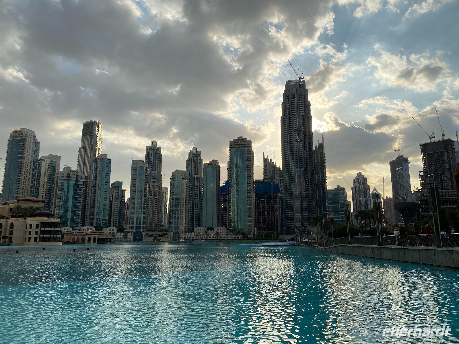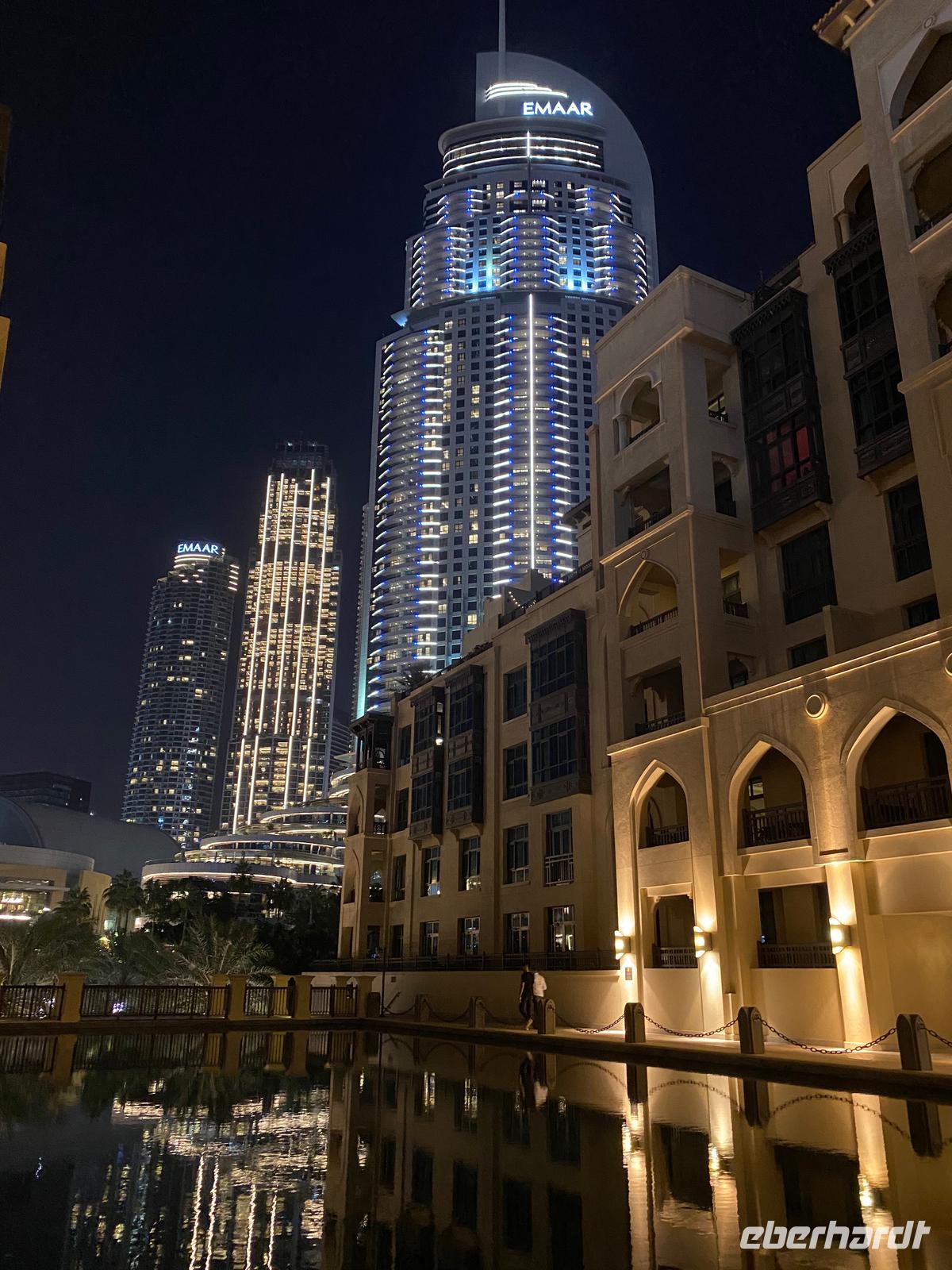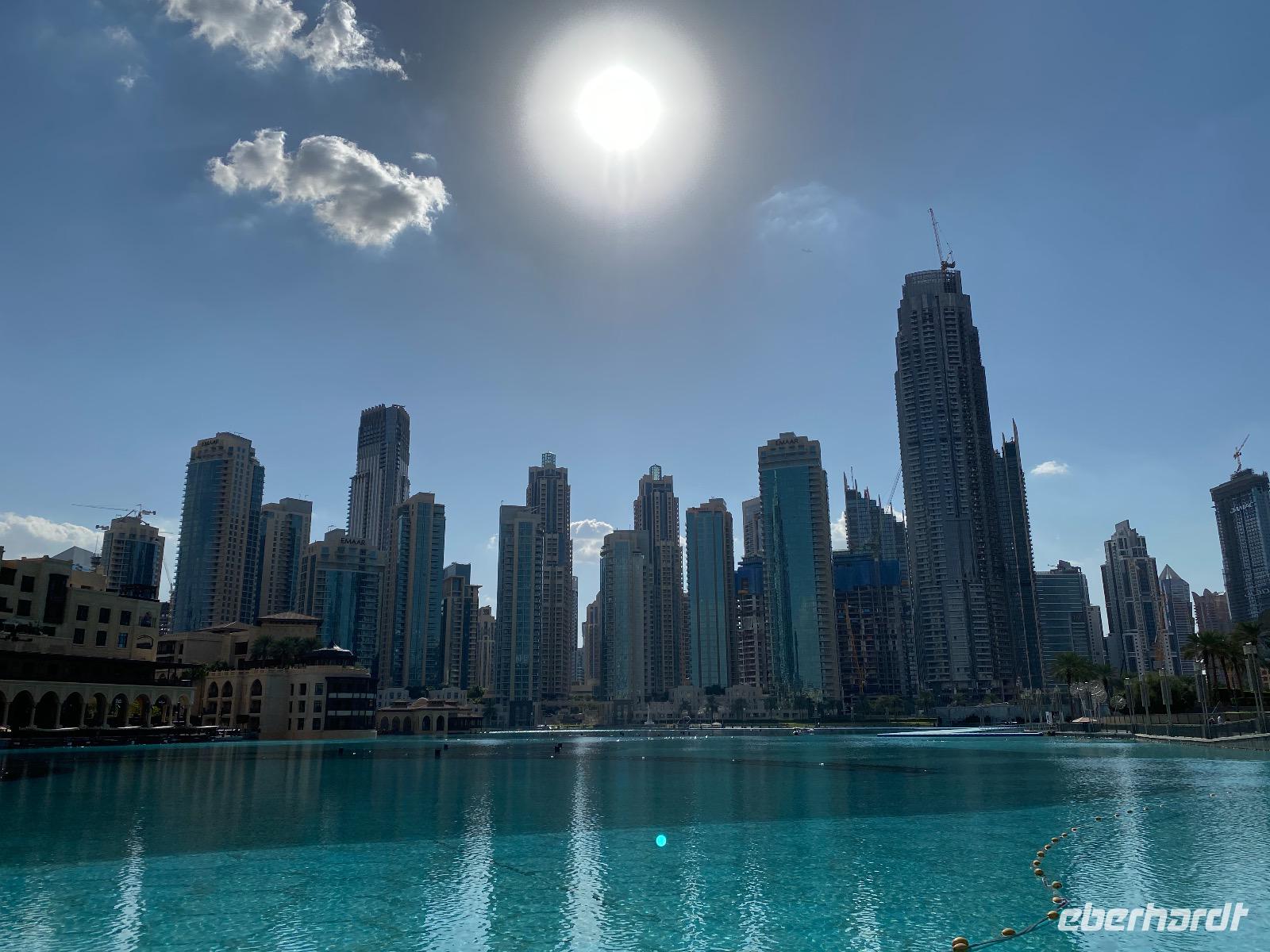 Schließlich trafen wir uns bei einsetzender Dämmerung wieder, um die Mall gemeinsam zu verlassen und uns auf den Weg zum Restaurant für das heutige Abendessen zu machen. Dieses lag an der anderen Seite des türkisblauen Wassers, direkt gegenüber der Mall sowie des Burj Khalifa. Kaum waren wir an unseren Plätzen angekommen, begannen auch schon die täglich ab 18.00 Uhr stattfindenden Wasserspiele. Riesige Fontänen stiegen in die Höhe, musikalisch untermalt und Teil einer wunderbaren Choreografie. Aller 30 Minuten durften wir das Schauspiel von Neuem bewundern, doch immer wieder war es etwas anders und mit einer anderen Musikart unterlegt. Absolut beeindruckend! Dabei ließen wir uns ein sehr reichliches und schmackhaftes, typisch arabisches Abendessen schmecken. Ein toller Ausklang eines Tages voller Highlights. Satt und zufrieden verließen wir das Restaurant und spazierten durch die imposante, beleuchtete Stadt hindurch zu unserem Bus, welcher uns sicher zurück zu unserem Hotel brachte.