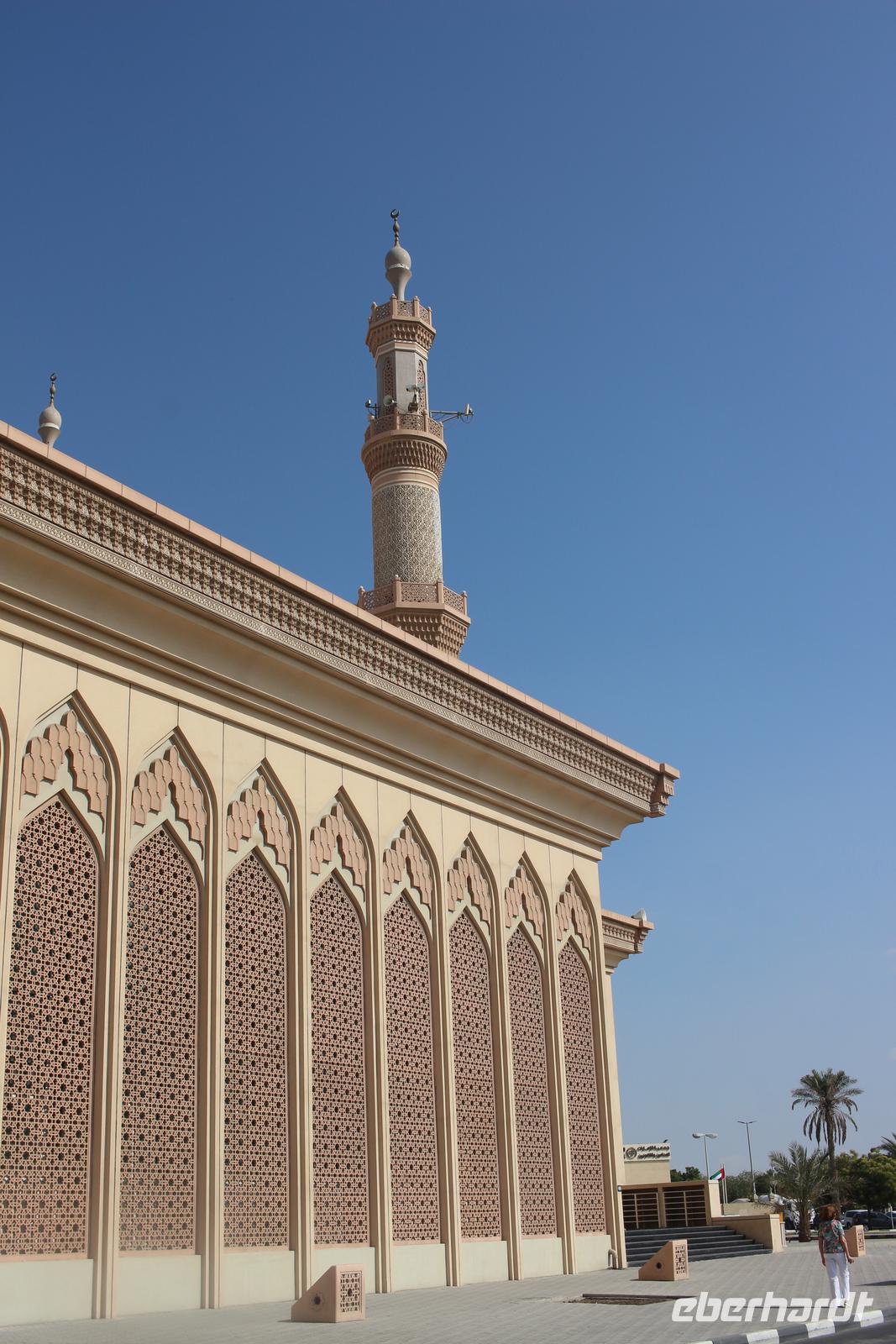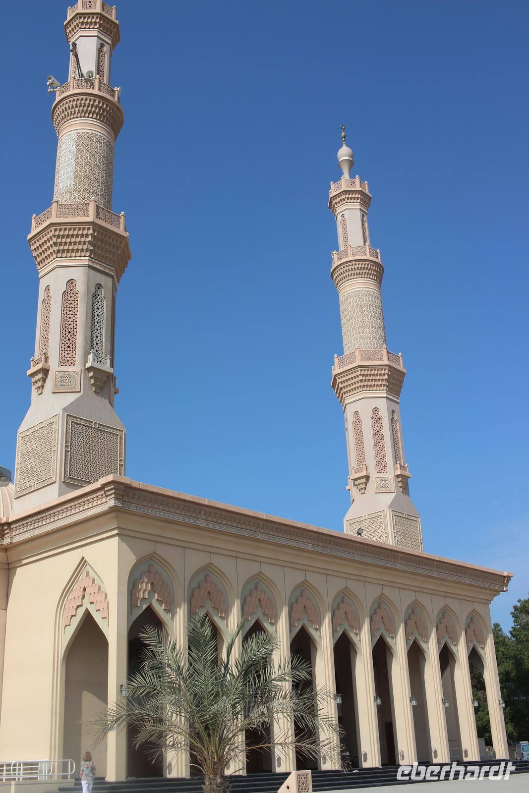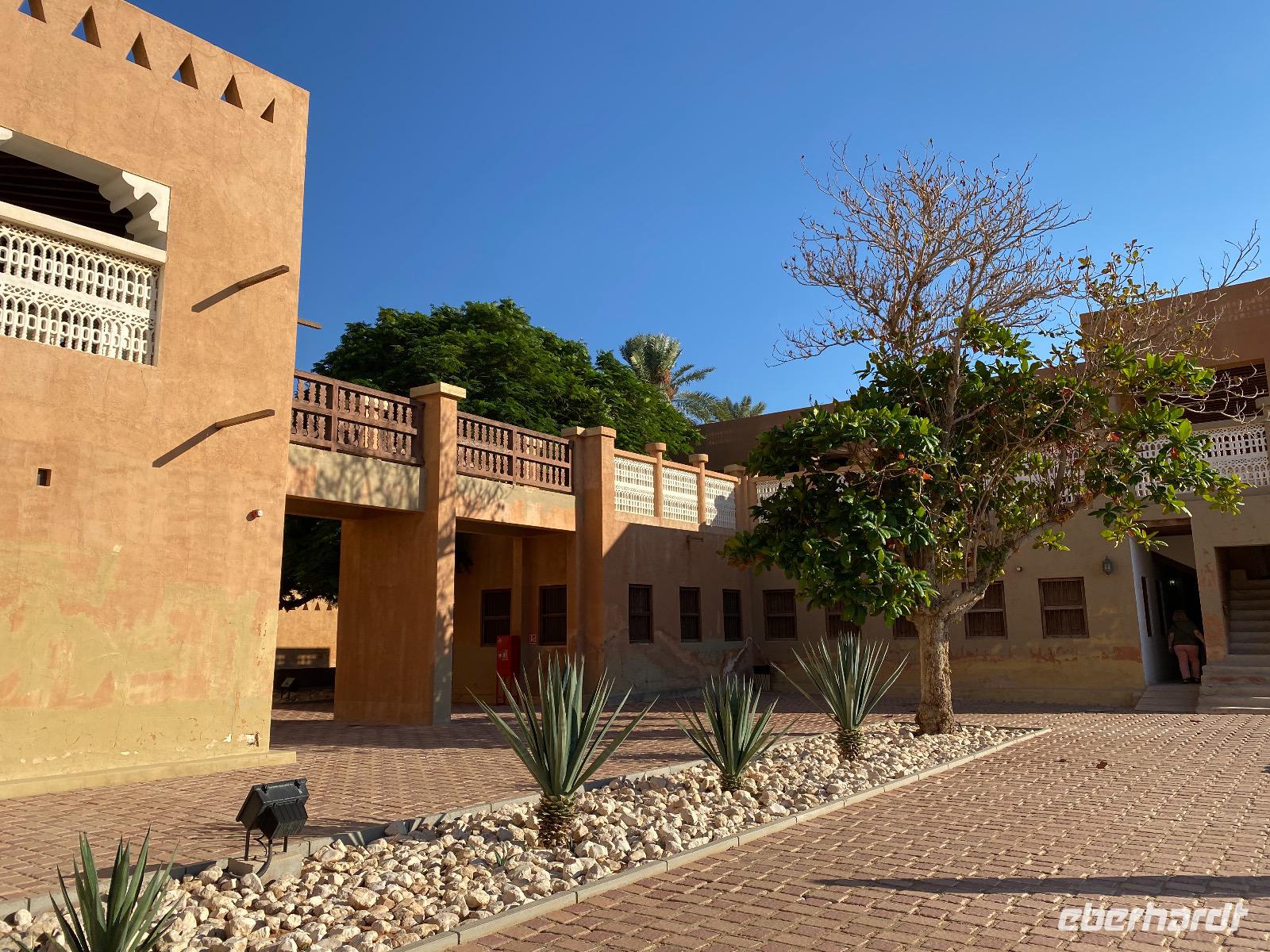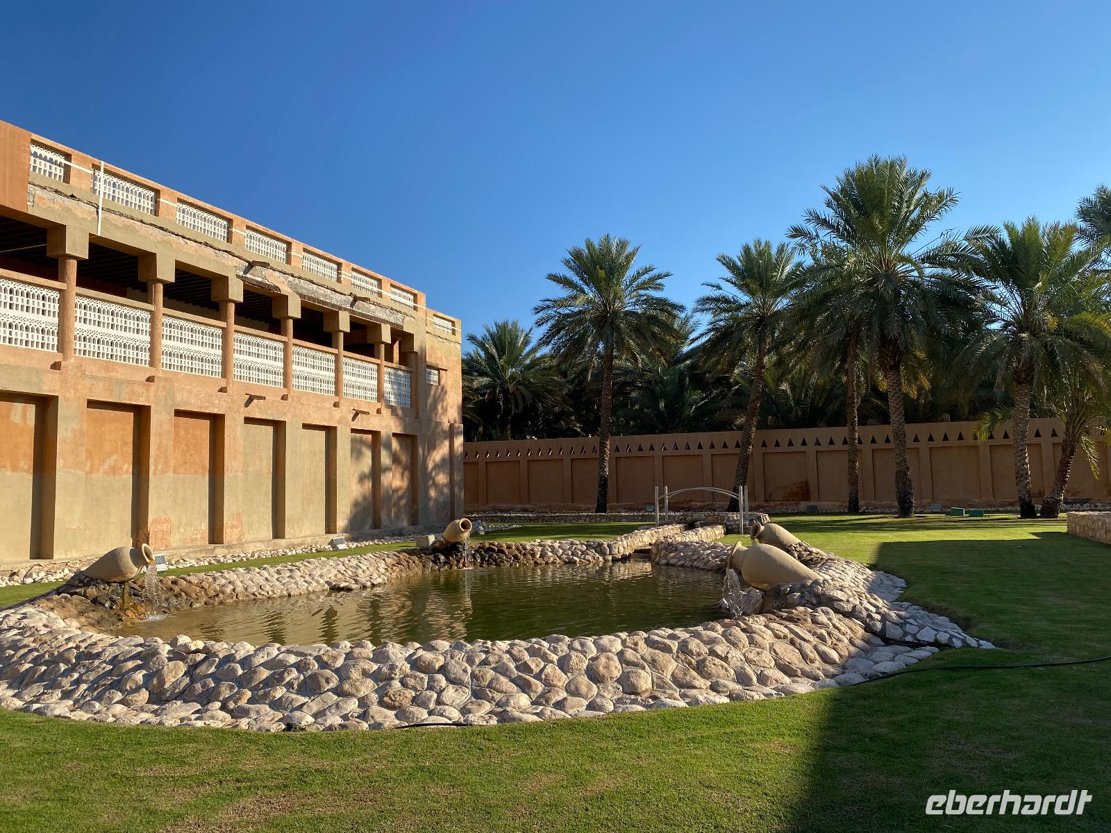 Anschließend trafen wir uns an der Kamelrennbahn, welche bereits für ein am Nachmittag stattfindendes Rennen vorbereitet wurde. Wir begutachteten einen Teil der 12 Kilometer langen Strecke und fuhren auch noch zum Kamelmarkt. Hier bekamen wir einen Einblick, welche „Reiter" während eines solchen Rennens auf den Kamelen zum Einsatz kommen. Dies sind keine Menschen mehr, sondern lediglich Roboter, welche aus einer Bohrmaschine gebaut werden. Wirklich interessant! Schließlich setzten wir unsere Fahrt fort und erreichten am Nachmittag die Oasenstadt El Ain. Hier schauten wir uns zunächst die Moschee von außen an und besuchten auch das Palastmuseum, welches die ursprünglichen Wohnräume der Scheichfamilie von Abu Dhabi zeigte. Hier erfuhren wir auch einiges über die Scheichfamilie selbst sowie deren Stammbaum. Wir genossen das angenehme Klima und schlenderten durch die hübsche und gepflegte Anlage.