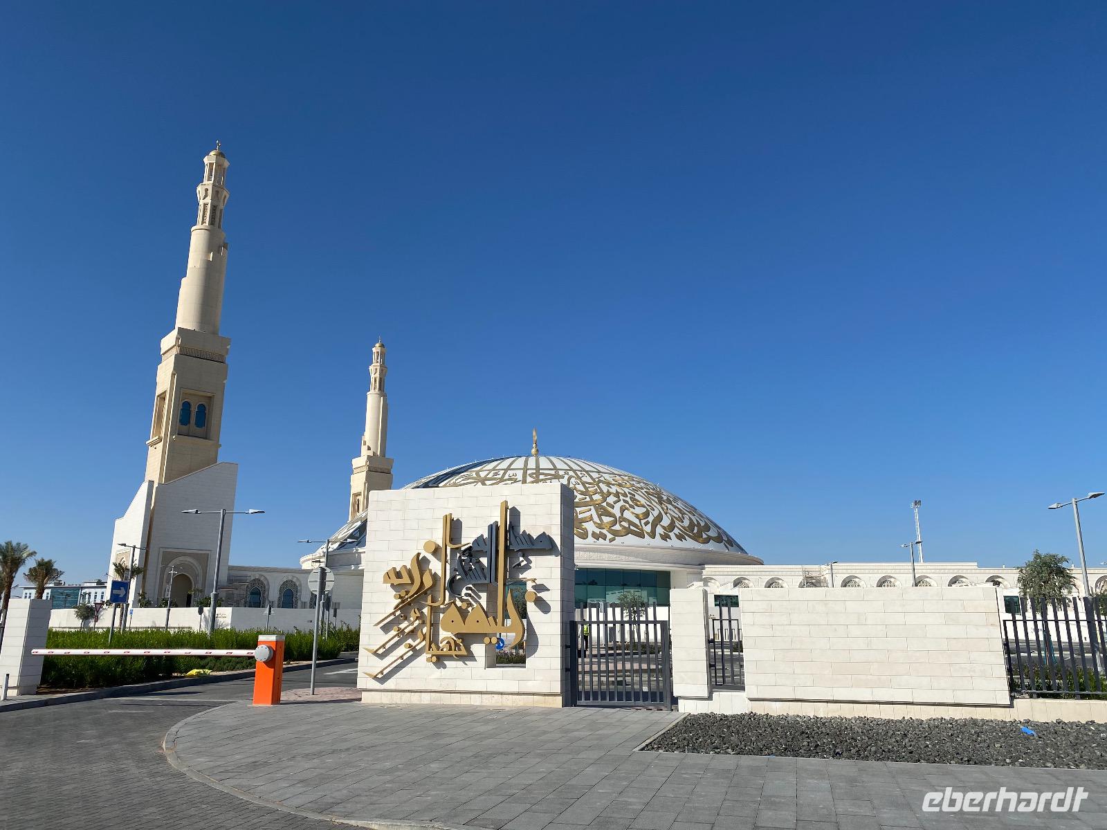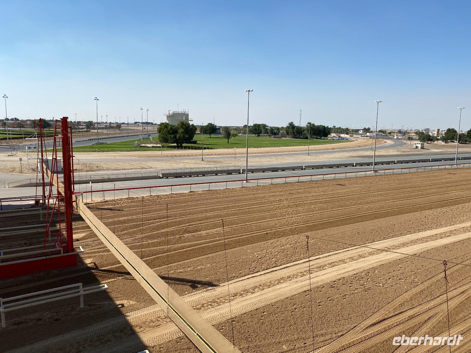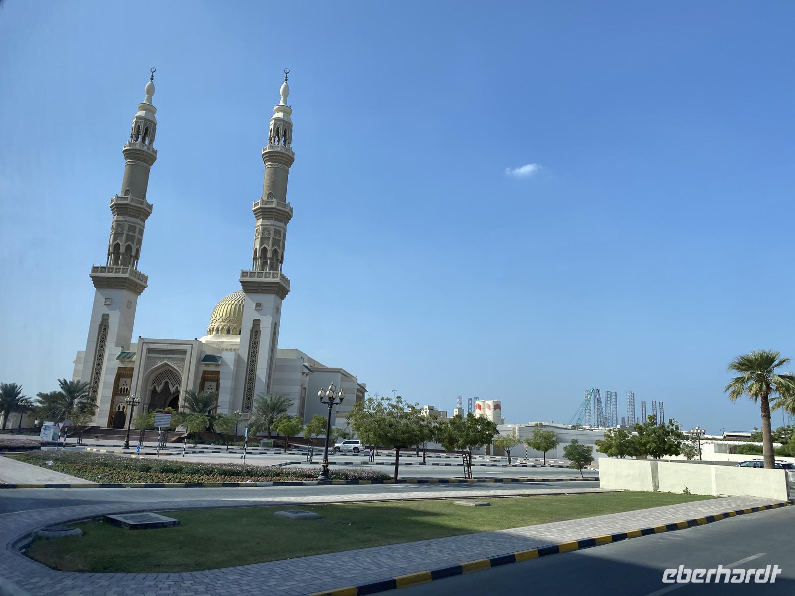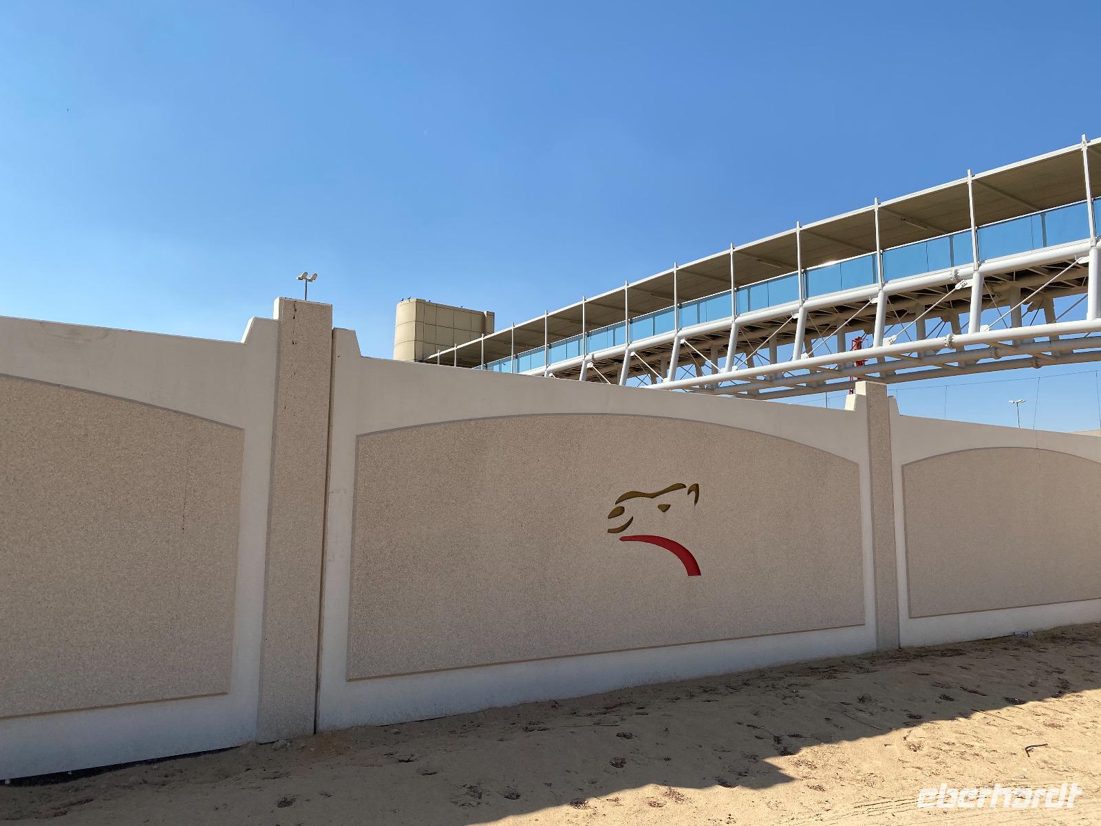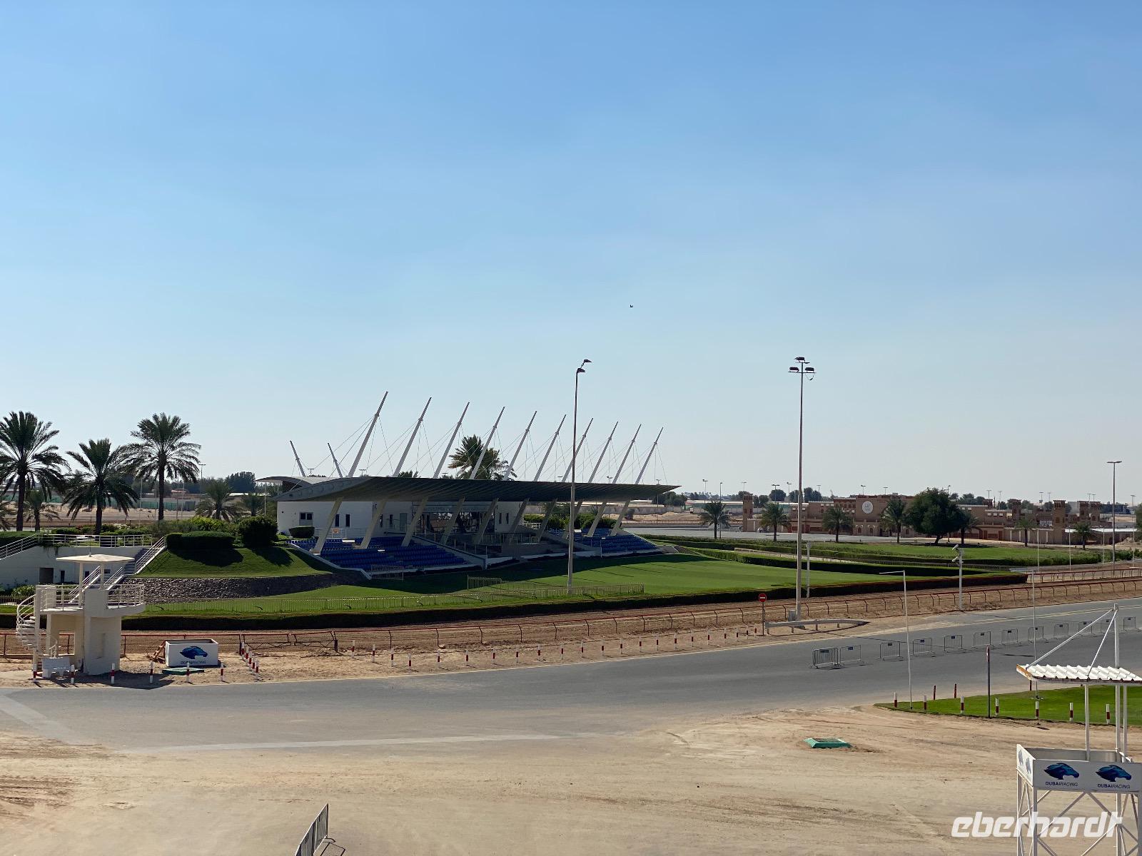Anschließend trafen wir uns an der Kamelrennbahn, welche bereits für ein am Nachmittag stattfindendes Rennen vorbereitet wurde. Wir begutachteten einen Teil der 12 Kilometer langen Strecke und fuhren auch noch zum Kamelmarkt. Hier bekamen wir einen Einblick, welche „Reiter" während eines solchen Rennens auf den Kamelen zum Einsatz kommen. Dies sind keine Menschen mehr, sondern lediglich Roboter, welche aus einer Bohrmaschine gebaut werden. Wirklich interessant! Schließlich setzten wir unsere Fahrt fort und erreichten am Nachmittag die Oasenstadt El Ain. Hier schauten wir uns zunächst die Moschee von außen an und besuchten auch das Palastmuseum, welches die ursprünglichen Wohnräume der Scheichfamilie von Abu Dhabi zeigte. Hier erfuhren wir auch einiges über die Scheichfamilie selbst sowie deren Stammbaum. Wir genossen das angenehme Klima und schlenderten durch die hübsche und gepflegte Anlage.
