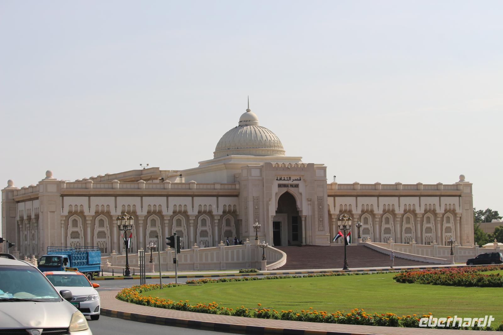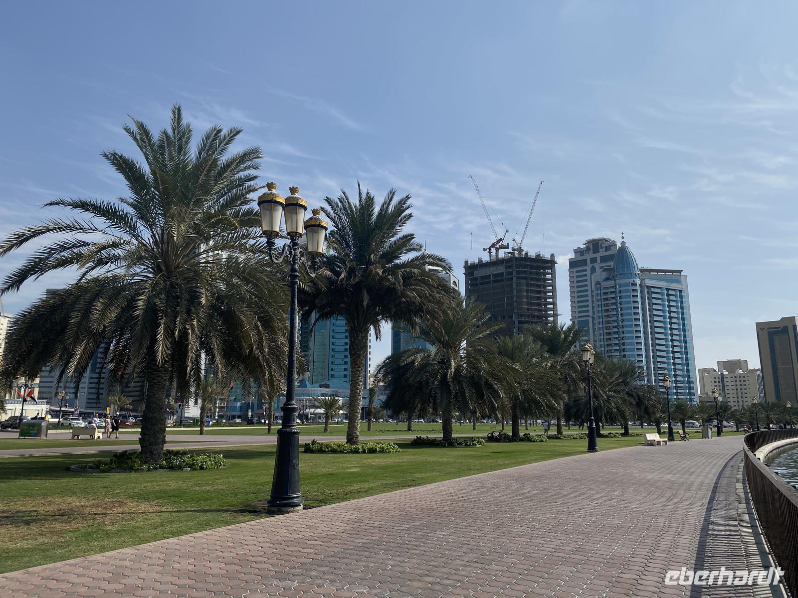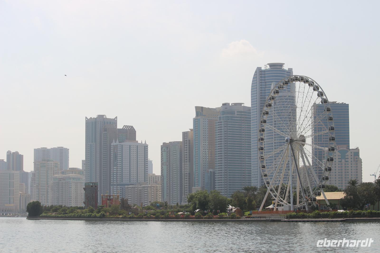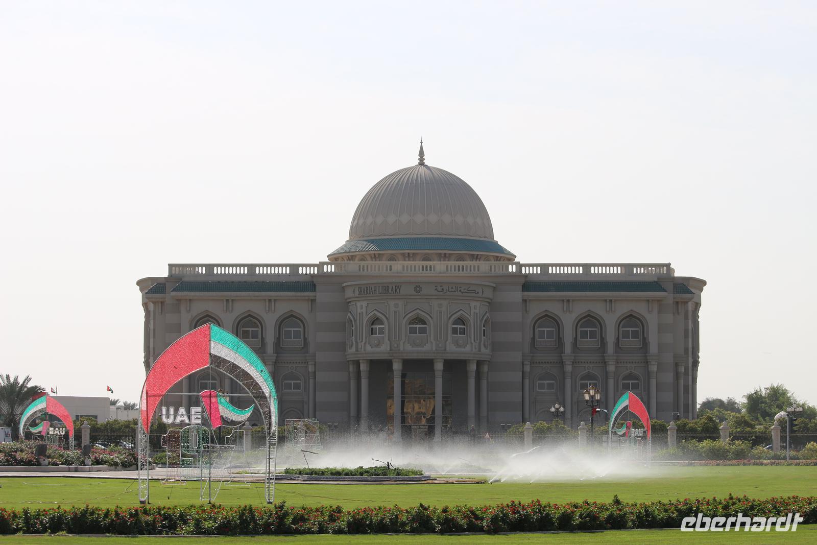 Nach einem reichlichen Frühstück trafen wir uns, um heute gemeinsam das Emirat Sharjah zu erkunden. Bekannt wurde die Großstadt durch die zweimalige Ernennung zur Kulturhauptstadt der Arabischen Welt, 1998 und 2014. Von unserem Hotel aus fuhren wir ca. 30 Minuten bis ins Nachbaremirat. Währenddessen erzählte uns Ibrahim einiges über die Geschichte der Vereinigten Arabischen Emirate sowie deren Entstehung. In Sharjah angekommen, fuhren wir zunächst zum sogenannten Koran-Kreisverkehr. Hier fotografierten wir neben der Moschee auch den Kulturpalast, die Bibliothek sowie den Verwaltungssitz des Scheiches von Sharjah, Scheich Sultan bin Mohamed Al-Qasimi. Anschließend setzten wir unsere Fahrt fort und erreichten bald die Altstadt der Kulturhauptstadt Sharjah. Hier fuhren wir entlang des Kanals und bewunderten die zahlreichen imposanten Bauten. Anschließend fuhren wir zum Souk al Jubail, wo wir durch die Fisch- und Fleischhalle sowie den Obst- und Gemüsemarkt schlenderten. Hier konnten wir unter anderem leckere Datteln probieren. In direkter Nachbarschaft besuchten wir weiterhin den Zentralen Markt, den sogenannten Blauen Souk. Hier erwarteten uns zahlreiche Schmuckverkäufer, bei welchen Goldschmuck aller Art erstanden werden konnte. Das Nachbargebäude lockte mit Tückern und verschiedensten Kleidungsstücken. Wer nicht in Shoppinglaune war, konnte entlang der Lagune spazieren gehen oder die intensive Mittagssonne auf einer Parkbank genießen, bevor wir zurück zu unserem Hotel in Dubai fuhren.