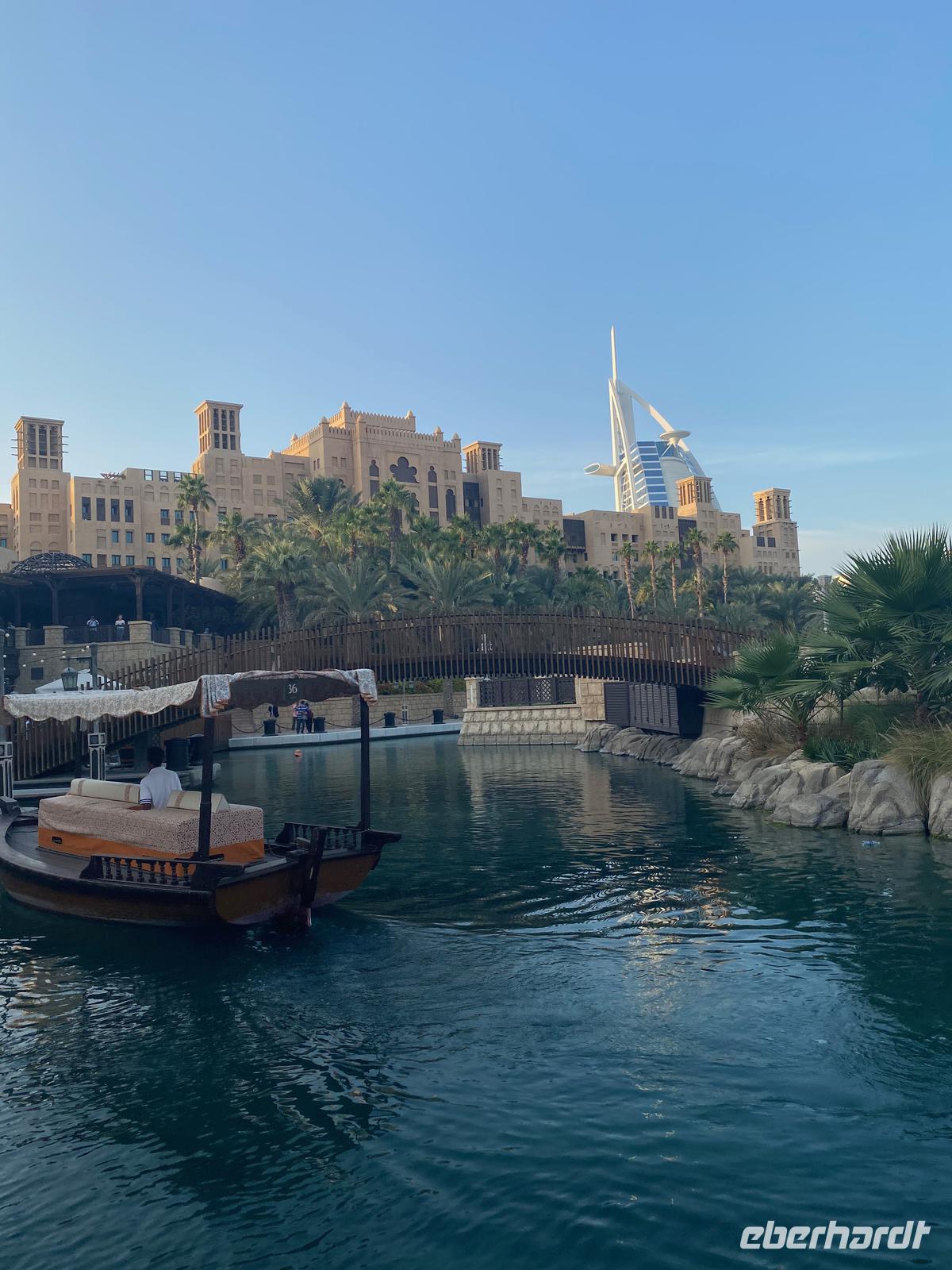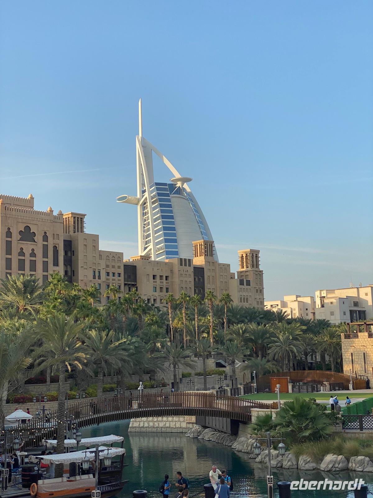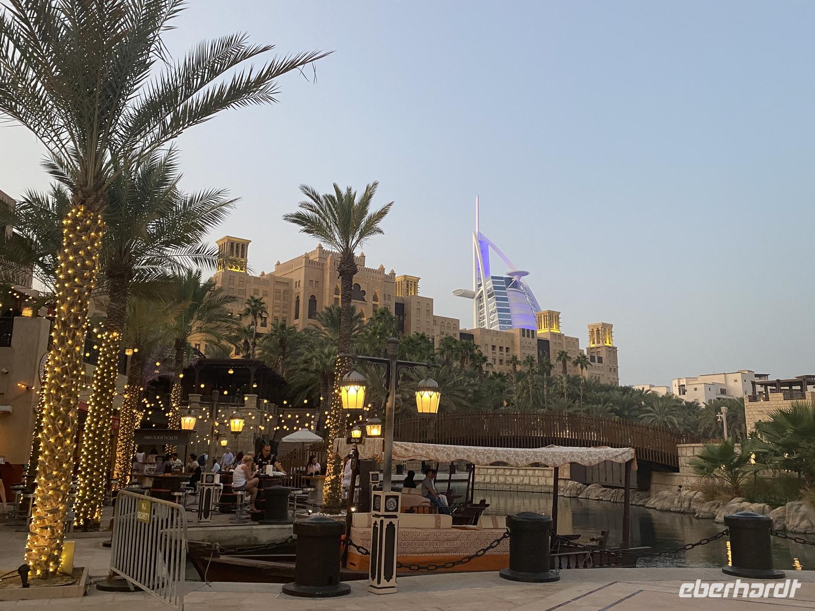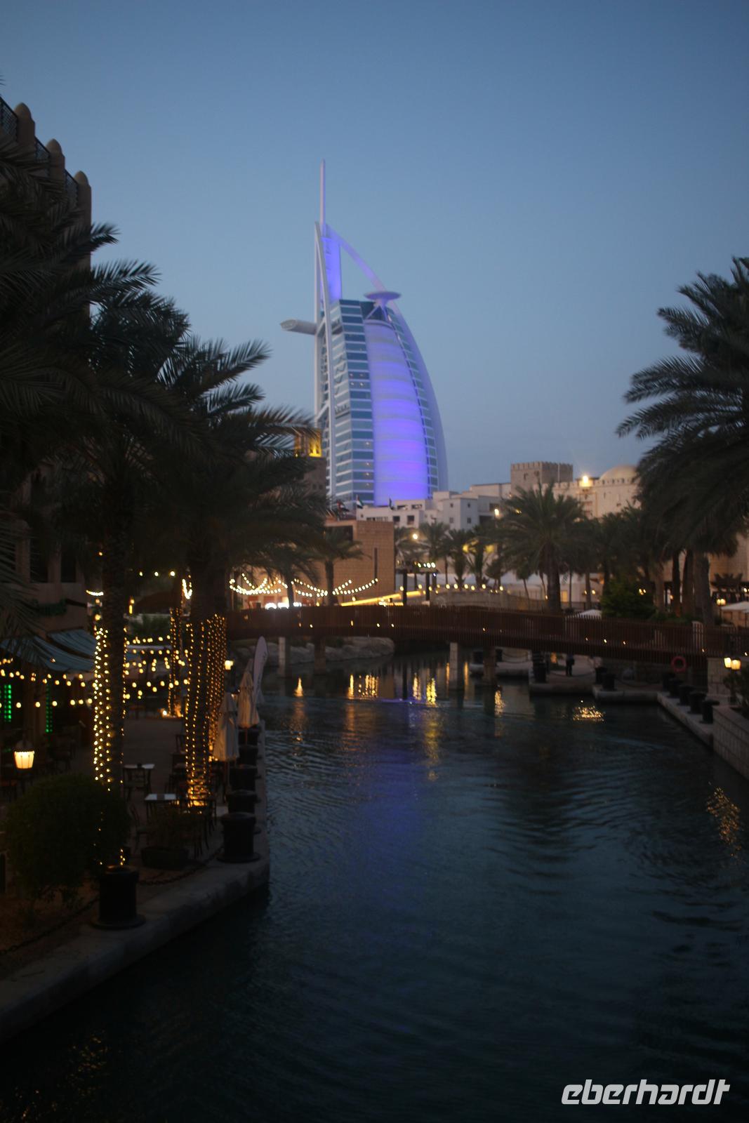 Hier blieb kurz Zeit, um sich ein wenig frisch zu machen, bevor ein großer Teil der Reisegruppe sich zum Luxushotel Burj al Arab begaben. Viele verbachten den Nachmittag im benachbarten Madinat Souk. Hier konnte man entlang des Kanals flanieren, durch die zahlreichen geschmackvollen Geschäfte bummeln oder einen Kaffee genießen. Immer wieder boten sich uns dabei tolle Blicke auf das Burj al Arab. Dieses 7-Sterne-Hotel besuchte ein anderer Teil unserer Reisegruppe und verbrachte eine Teestunde in exklusiver Atmosphäre in der oberen Etage des Hauses. Nach diesem einmaligen Erlebnis fuhren wir alle gemeinsam zurück zu unserem Hotel und begaben uns schließlich in die Altstadt, wo wir am Dubai Creek bereits zum Abendessen erwartet wurden. Wieder einmal konnten wir uns von der Reichlichkeit einer arabischen Mahlzeit überzeugen sowie auch vom wirklich guten Geschmack dieser. Satt und zufrieden traten wir schließlich zu Fuß den Heimweg an. Wir schlenderten durch die gemütlichen Gassen der nachgebauten Altstadt und genossen die entspannte Atmosphäre. Als wir schließlich am Hotel ankamen, gingen wir mit zahlreichen neuen Erlebnissen, die uns der heutige Tag beschert hatte, zu Bett.