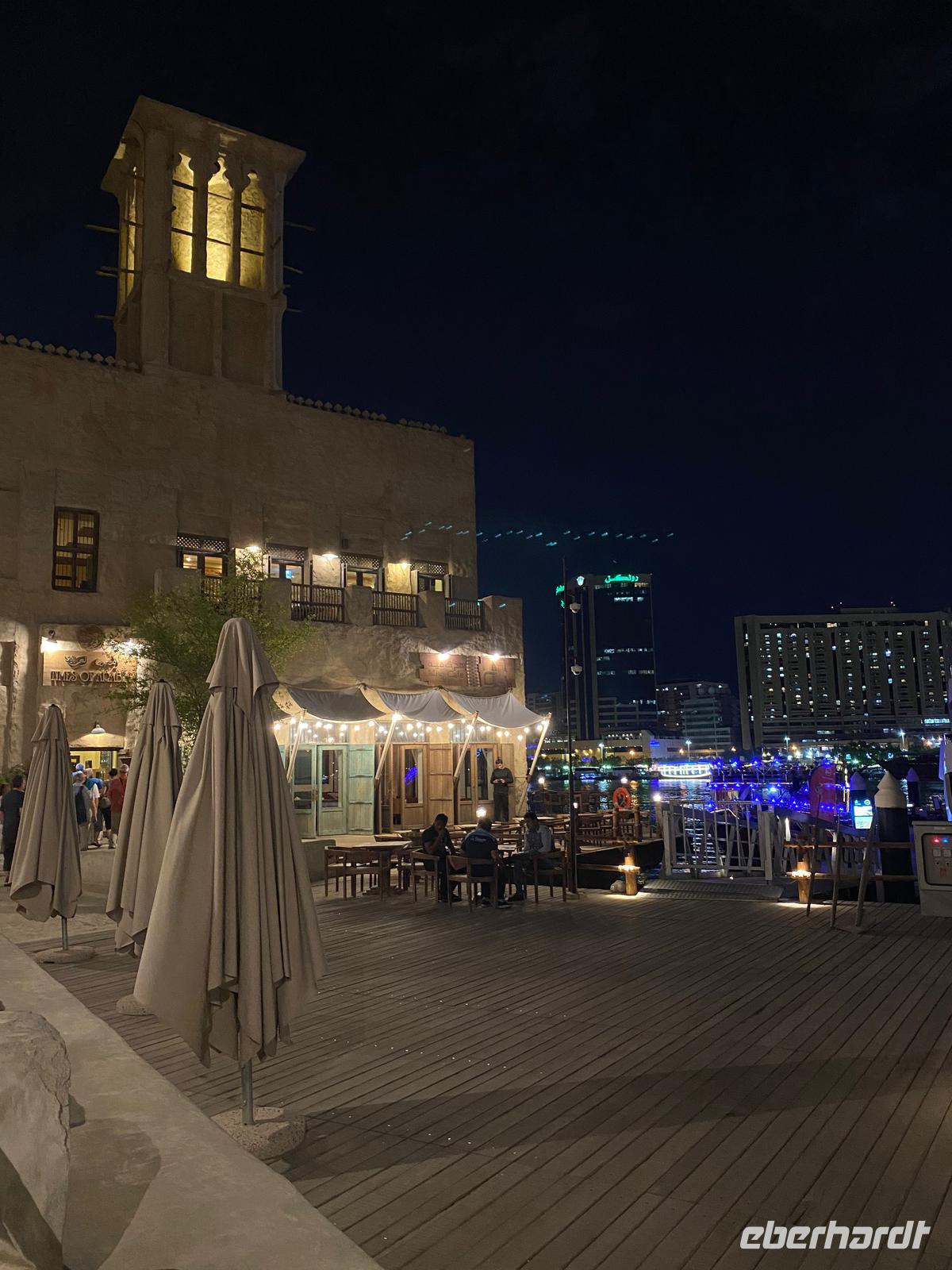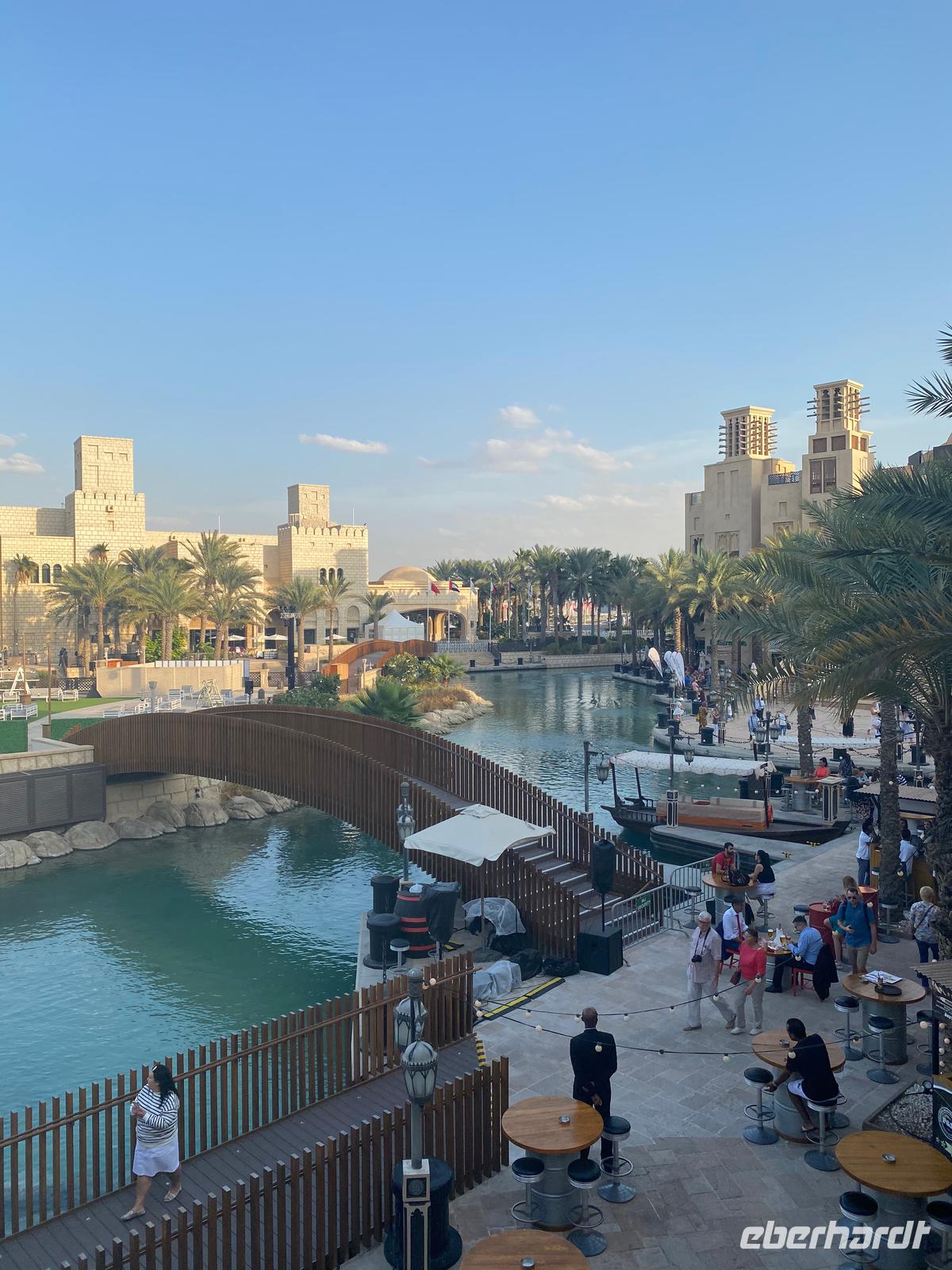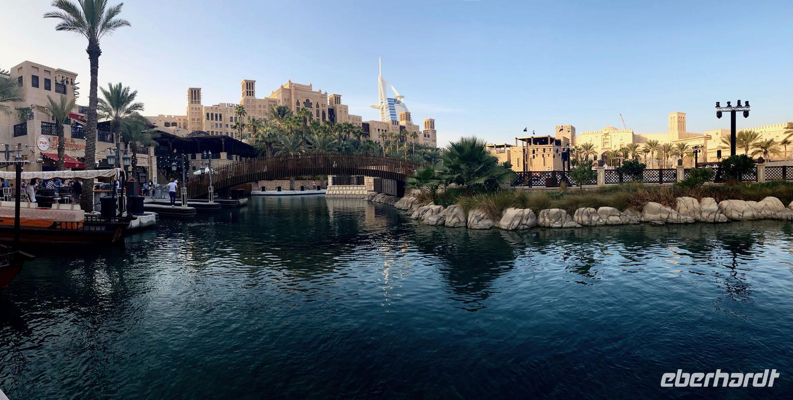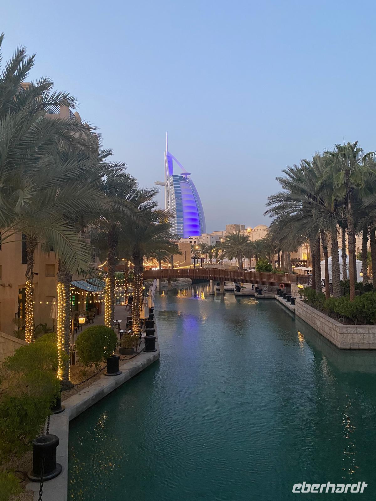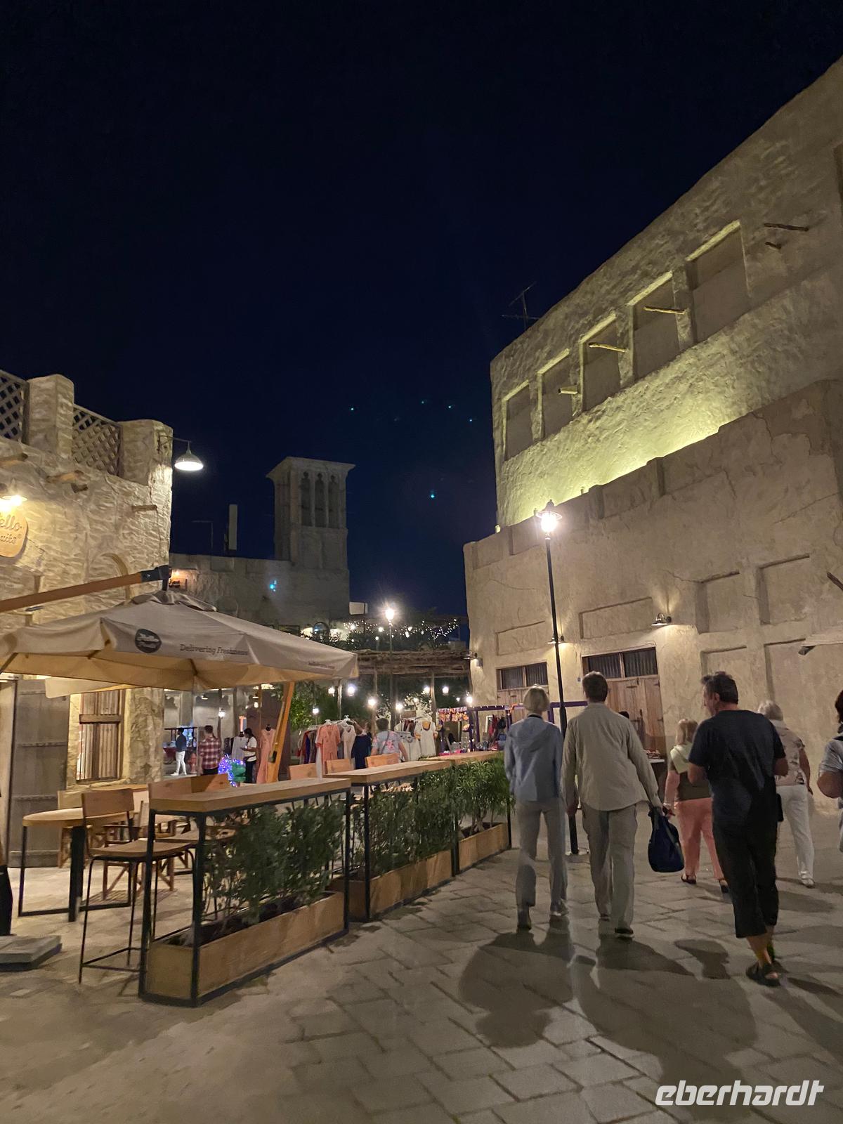 Hier blieb kurz Zeit, um sich ein wenig frisch zu machen, bevor ein großer Teil der Reisegruppe sich zum Luxushotel Burj al Arab begaben. Viele verbachten den Nachmittag im benachbarten Madinat Souk. Hier konnte man entlang des Kanals flanieren, durch die zahlreichen geschmackvollen Geschäfte bummeln oder einen Kaffee genießen. Immer wieder boten sich uns dabei tolle Blicke auf das Burj al Arab. Dieses 7-Sterne-Hotel besuchte ein anderer Teil unserer Reisegruppe und verbrachte eine Teestunde in exklusiver Atmosphäre in der oberen Etage des Hauses. Nach diesem einmaligen Erlebnis fuhren wir alle gemeinsam zurück zu unserem Hotel und begaben uns schließlich in die Altstadt, wo wir am Dubai Creek bereits zum Abendessen erwartet wurden. Wieder einmal konnten wir uns von der Reichlichkeit einer arabischen Mahlzeit überzeugen sowie auch vom wirklich guten Geschmack dieser. Satt und zufrieden traten wir schließlich zu Fuß den Heimweg an. Wir schlenderten durch die gemütlichen Gassen der nachgebauten Altstadt und genossen die entspannte Atmosphäre. Als wir schließlich am Hotel ankamen, gingen wir mit zahlreichen neuen Erlebnissen, die uns der heutige Tag beschert hatte, zu Bett.