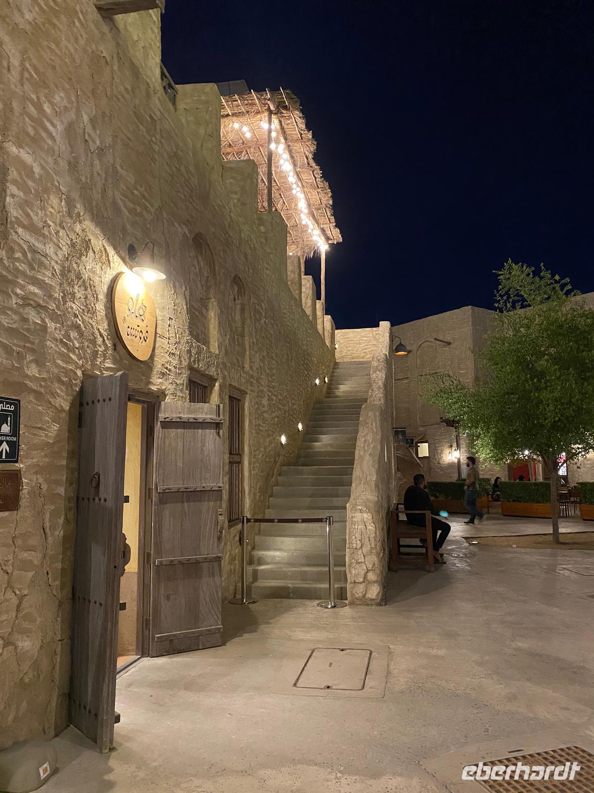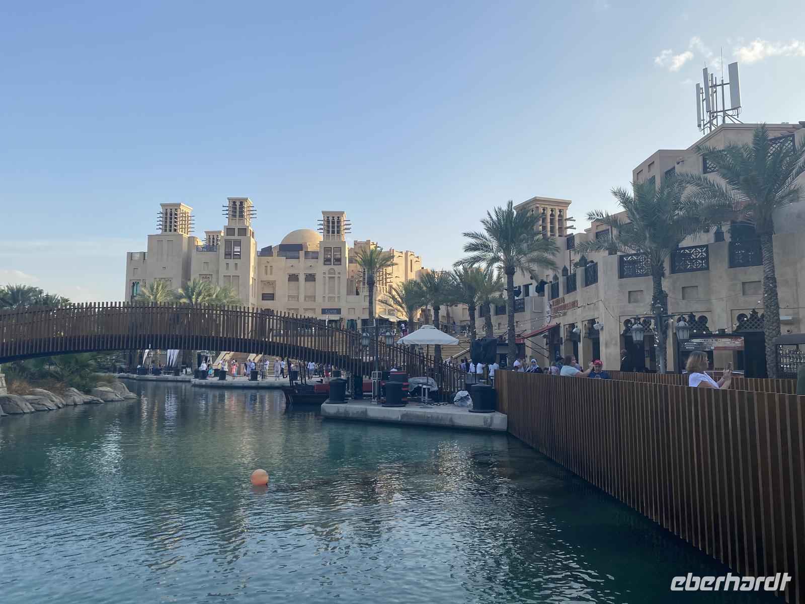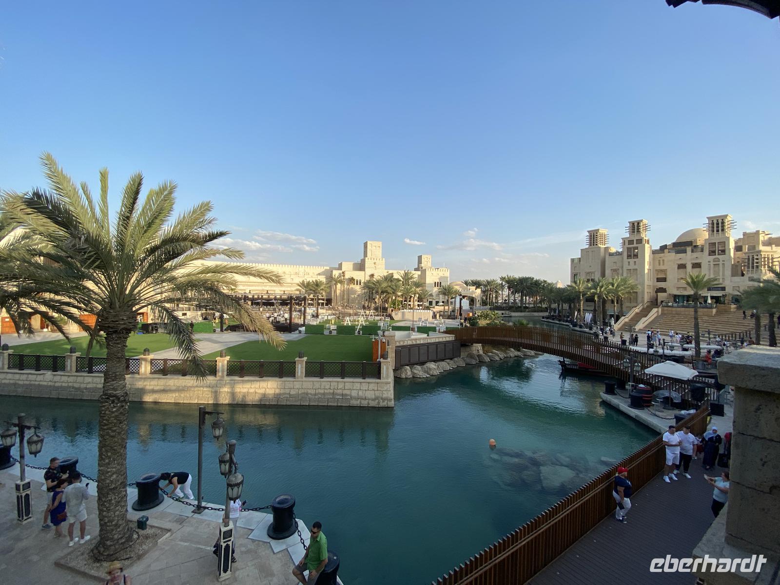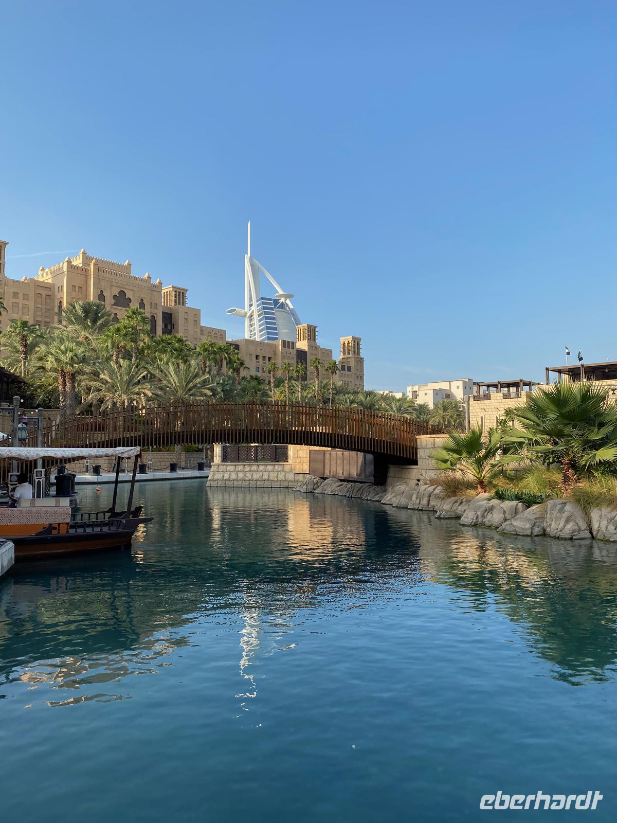 Hier blieb kurz Zeit, um sich ein wenig frisch zu machen, bevor ein großer Teil der Reisegruppe sich zum Luxushotel Burj al Arab begaben. Viele verbachten den Nachmittag im benachbarten Madinat Souk. Hier konnte man entlang des Kanals flanieren, durch die zahlreichen geschmackvollen Geschäfte bummeln oder einen Kaffee genießen. Immer wieder boten sich uns dabei tolle Blicke auf das Burj al Arab. Dieses 7-Sterne-Hotel besuchte ein anderer Teil unserer Reisegruppe und verbrachte eine Teestunde in exklusiver Atmosphäre in der oberen Etage des Hauses. Nach diesem einmaligen Erlebnis fuhren wir alle gemeinsam zurück zu unserem Hotel und begaben uns schließlich in die Altstadt, wo wir am Dubai Creek bereits zum Abendessen erwartet wurden. Wieder einmal konnten wir uns von der Reichlichkeit einer arabischen Mahlzeit überzeugen sowie auch vom wirklich guten Geschmack dieser. Satt und zufrieden traten wir schließlich zu Fuß den Heimweg an. Wir schlenderten durch die gemütlichen Gassen der nachgebauten Altstadt und genossen die entspannte Atmosphäre. Als wir schließlich am Hotel ankamen, gingen wir mit zahlreichen neuen Erlebnissen, die uns der heutige Tag beschert hatte, zu Bett.