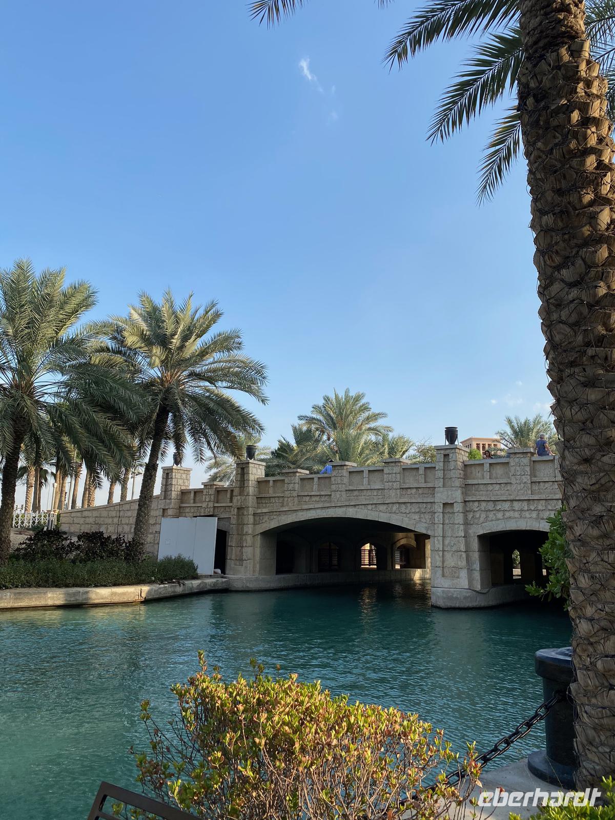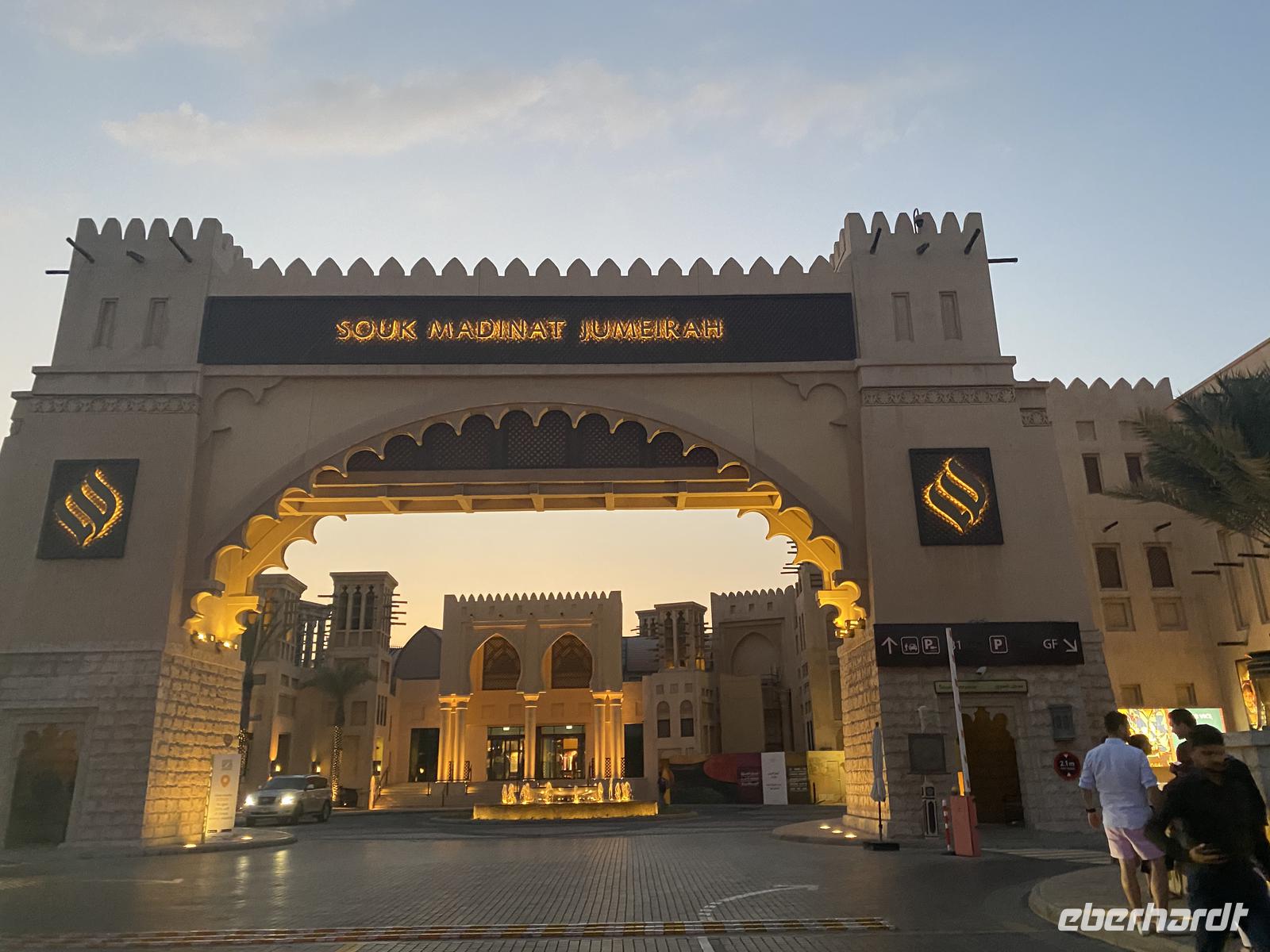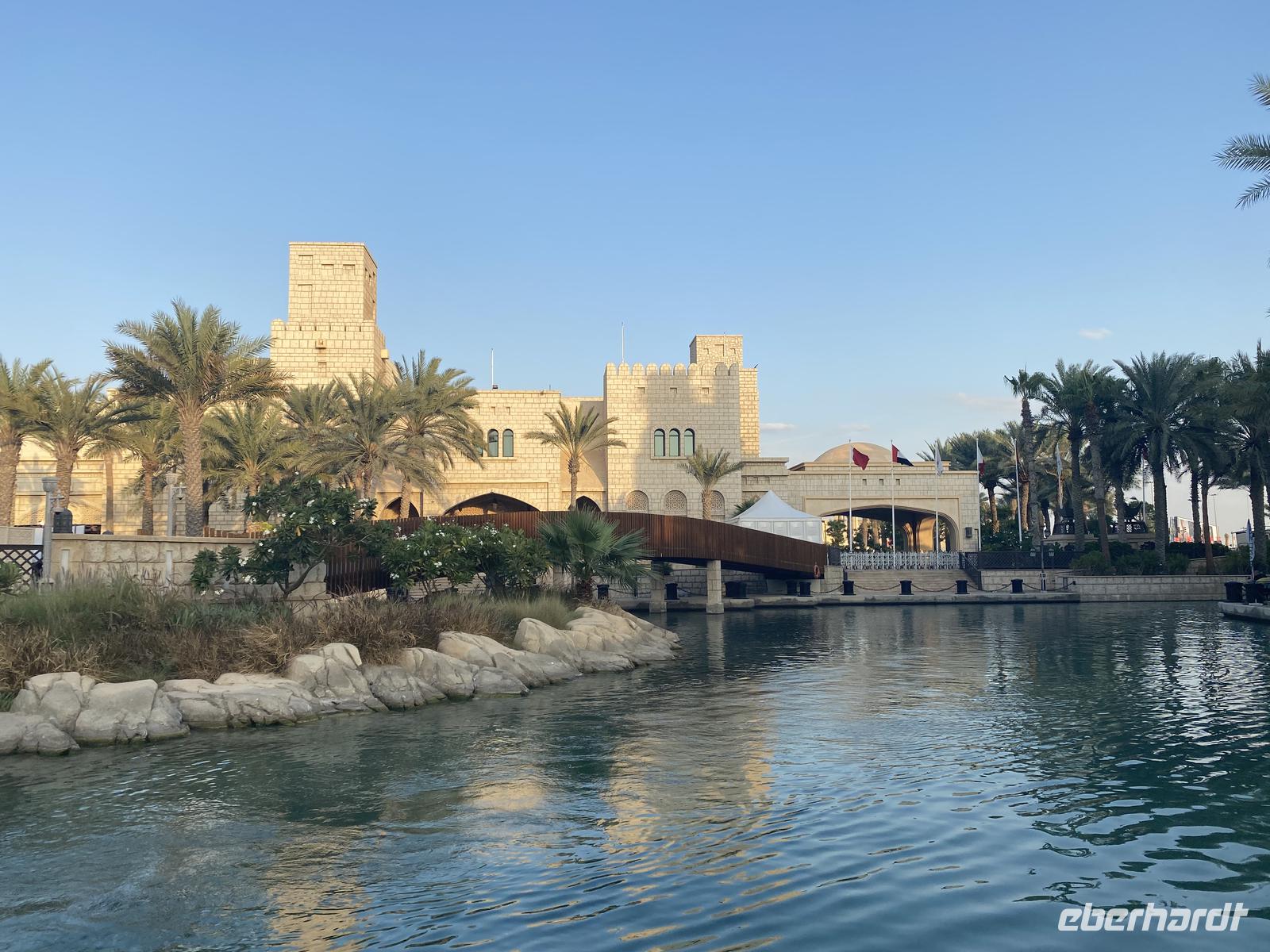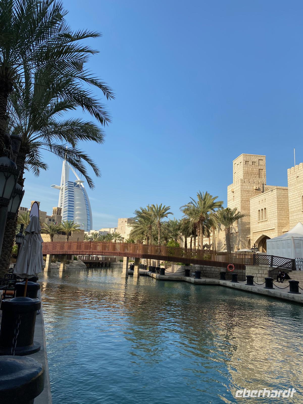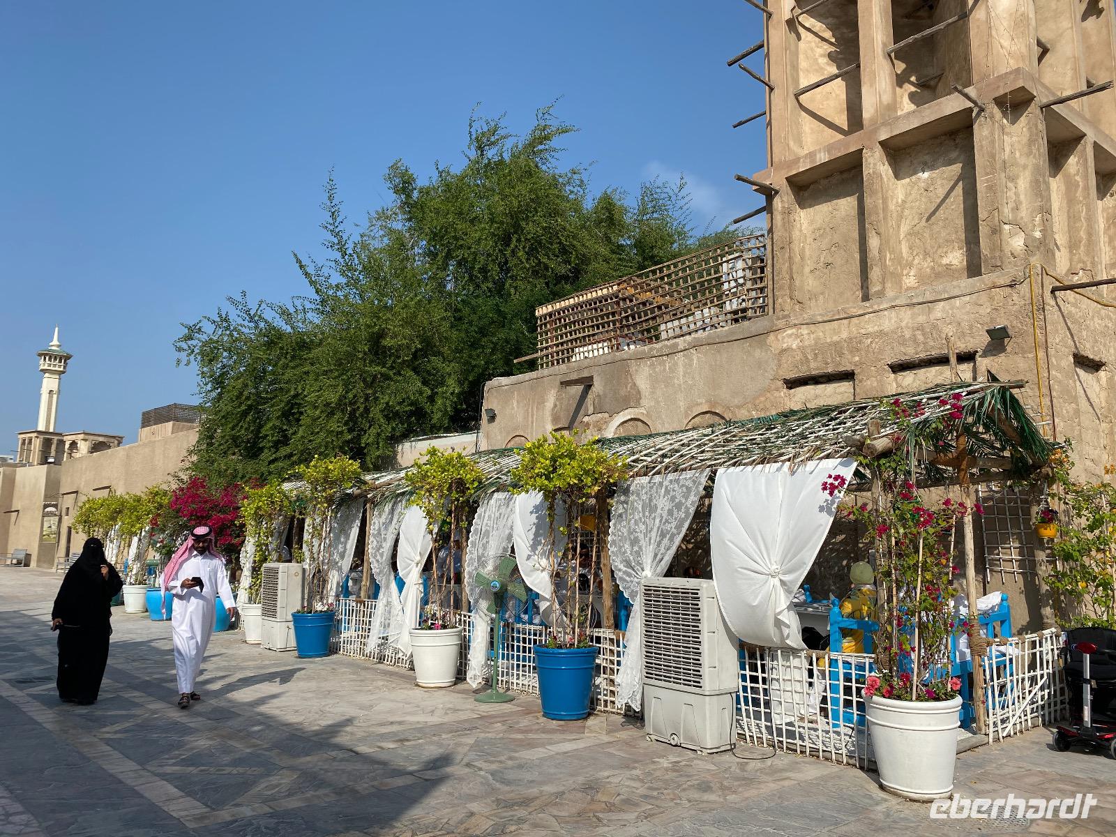 Hier blieb kurz Zeit, um sich ein wenig frisch zu machen, bevor ein großer Teil der Reisegruppe sich zum Luxushotel Burj al Arab begaben. Viele verbachten den Nachmittag im benachbarten Madinat Souk. Hier konnte man entlang des Kanals flanieren, durch die zahlreichen geschmackvollen Geschäfte bummeln oder einen Kaffee genießen. Immer wieder boten sich uns dabei tolle Blicke auf das Burj al Arab. Dieses 7-Sterne-Hotel besuchte ein anderer Teil unserer Reisegruppe und verbrachte eine Teestunde in exklusiver Atmosphäre in der oberen Etage des Hauses. Nach diesem einmaligen Erlebnis fuhren wir alle gemeinsam zurück zu unserem Hotel und begaben uns schließlich in die Altstadt, wo wir am Dubai Creek bereits zum Abendessen erwartet wurden. Wieder einmal konnten wir uns von der Reichlichkeit einer arabischen Mahlzeit überzeugen sowie auch vom wirklich guten Geschmack dieser. Satt und zufrieden traten wir schließlich zu Fuß den Heimweg an. Wir schlenderten durch die gemütlichen Gassen der nachgebauten Altstadt und genossen die entspannte Atmosphäre. Als wir schließlich am Hotel ankamen, gingen wir mit zahlreichen neuen Erlebnissen, die uns der heutige Tag beschert hatte, zu Bett.