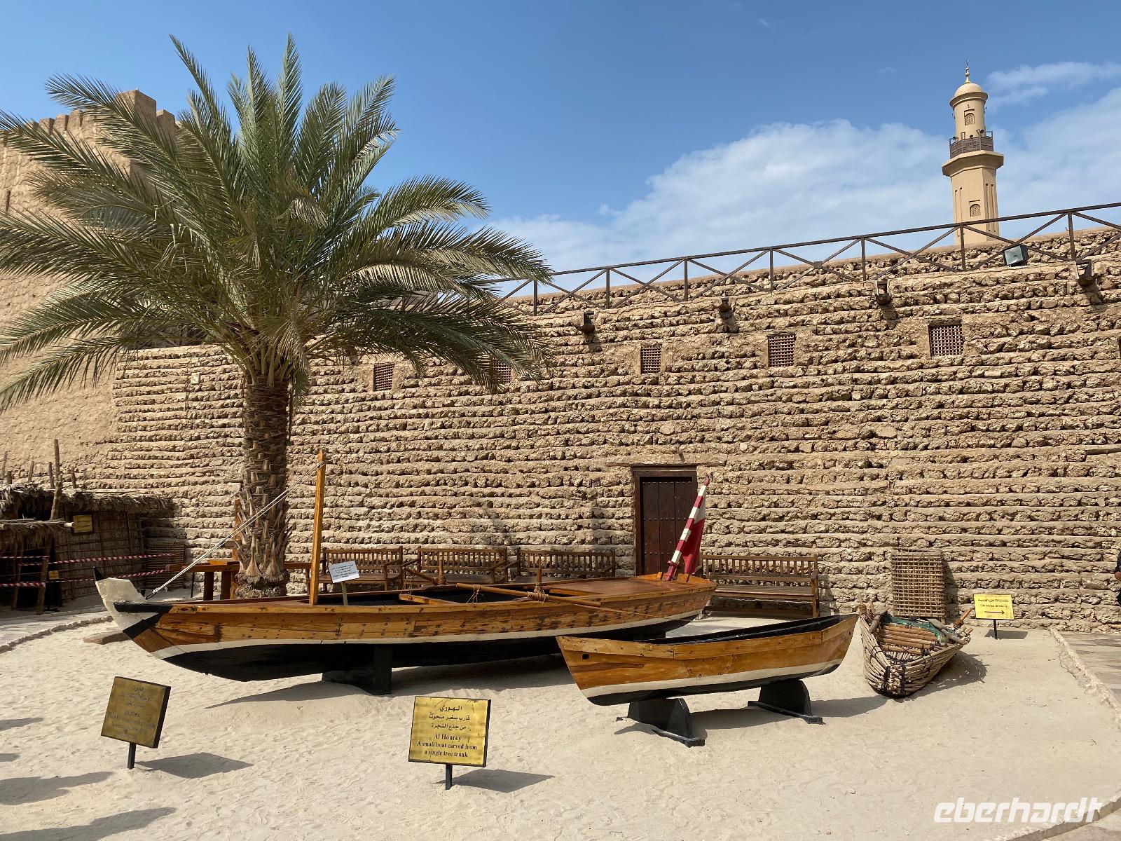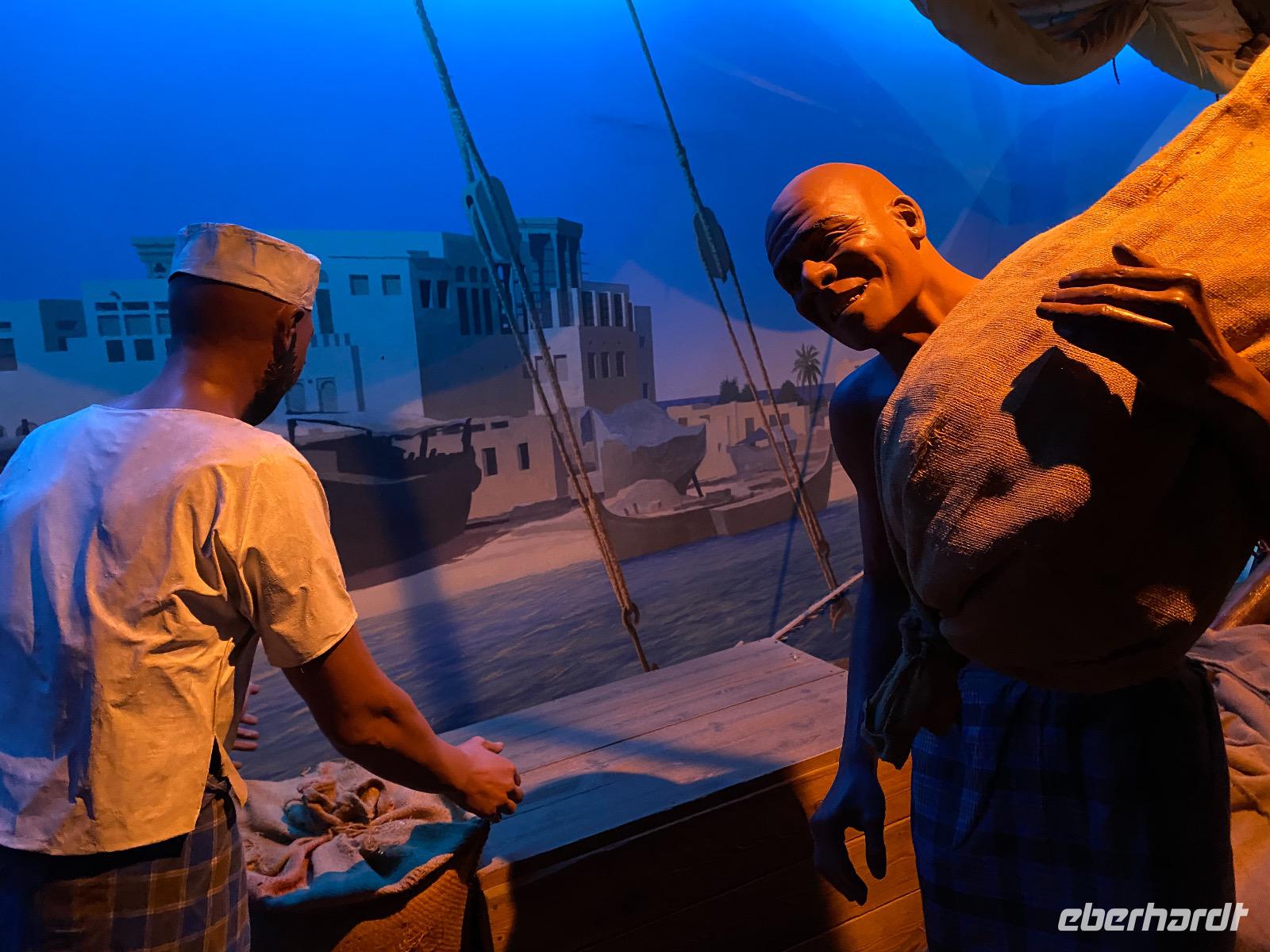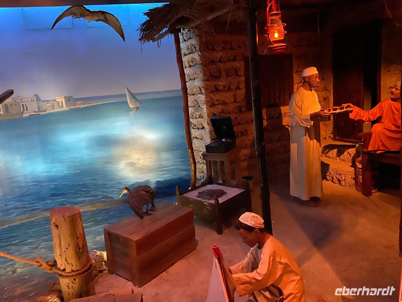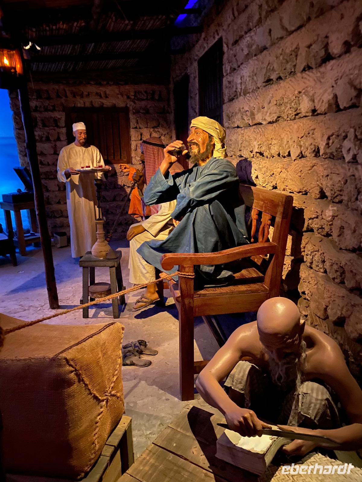 Heute wurden wir zur mittlerweile gewohnten Zeit mal nicht von unserem Bus abgeholt, sondern starteten unsere Tour zu Fuß. Durch die engen Gassen der ursprünglichen Altstadt mit ihren zahlreichen kleinen Läden spazierten wir bis zum Dubai Creek, wo wir mit einem Wassertaxi übersetzten. Wenig später erreichten wir bereits den Gewürzsouk sowie den Goldsouk. Hier blieb nun etwas Zeit zur freien Verfügung, um durch die Geschäfte zu schlendern, fleißig zu handeln und eventuell das eine oder andere Stück zu erstehen. Überall wurden uns verschiedenste Artikel angeboten und jeder warb mit den besten Produkten und günstigsten Preisen. Nach erfolgreichen Einkäufen trafen wir uns schließlich wieder und begaben uns mit dem Wassertaxi wieder zurück in den Stadtteil Dubai Bur, wo sich auch unser Hotel befand. Doch bevor wir in dieses zurückkehrten, besuchten wir noch das sich direkt gegenüber befindende Museum und tauchten ein in die Geschichte Dubais.