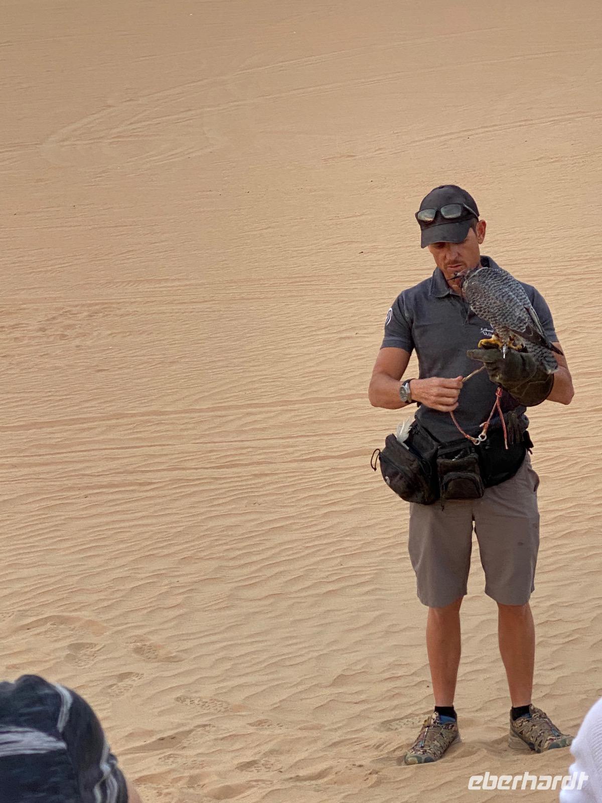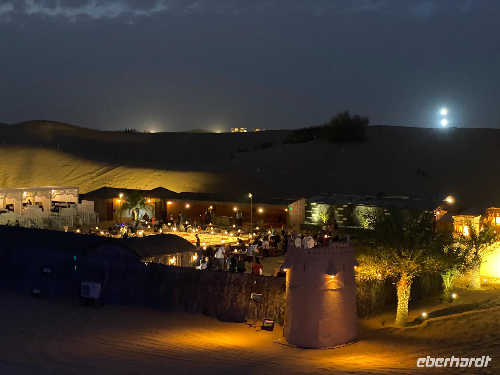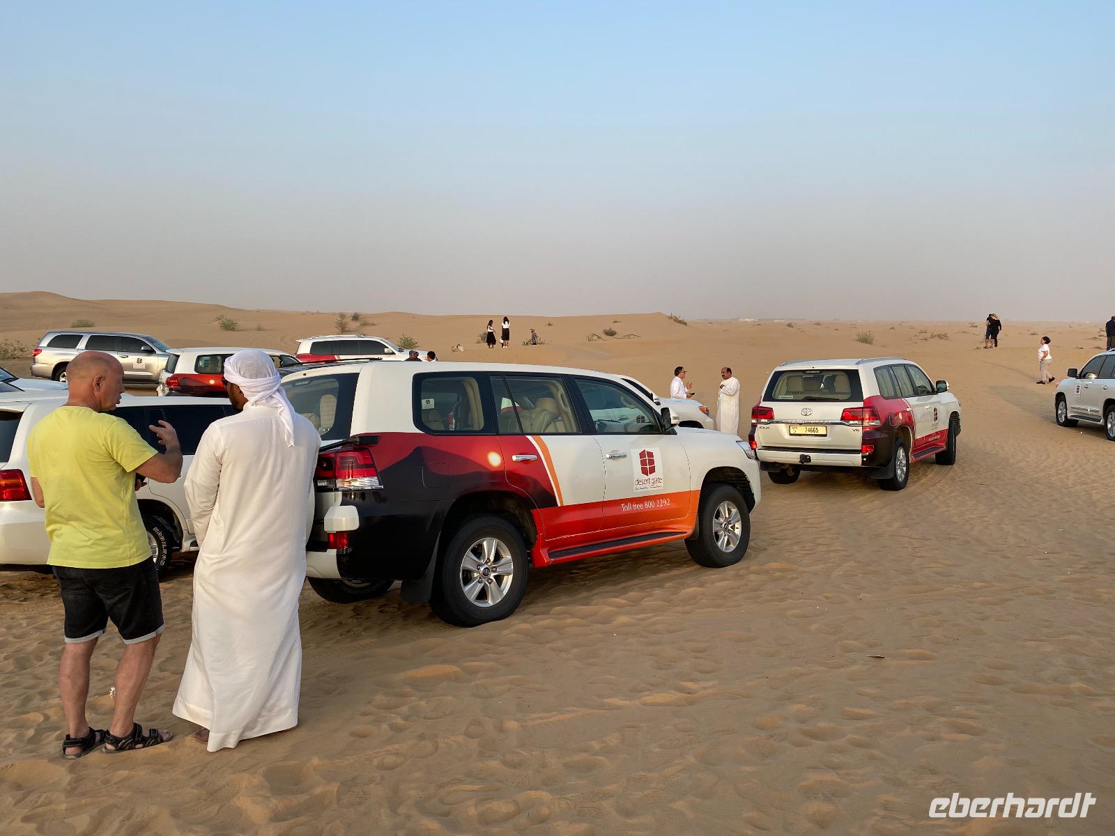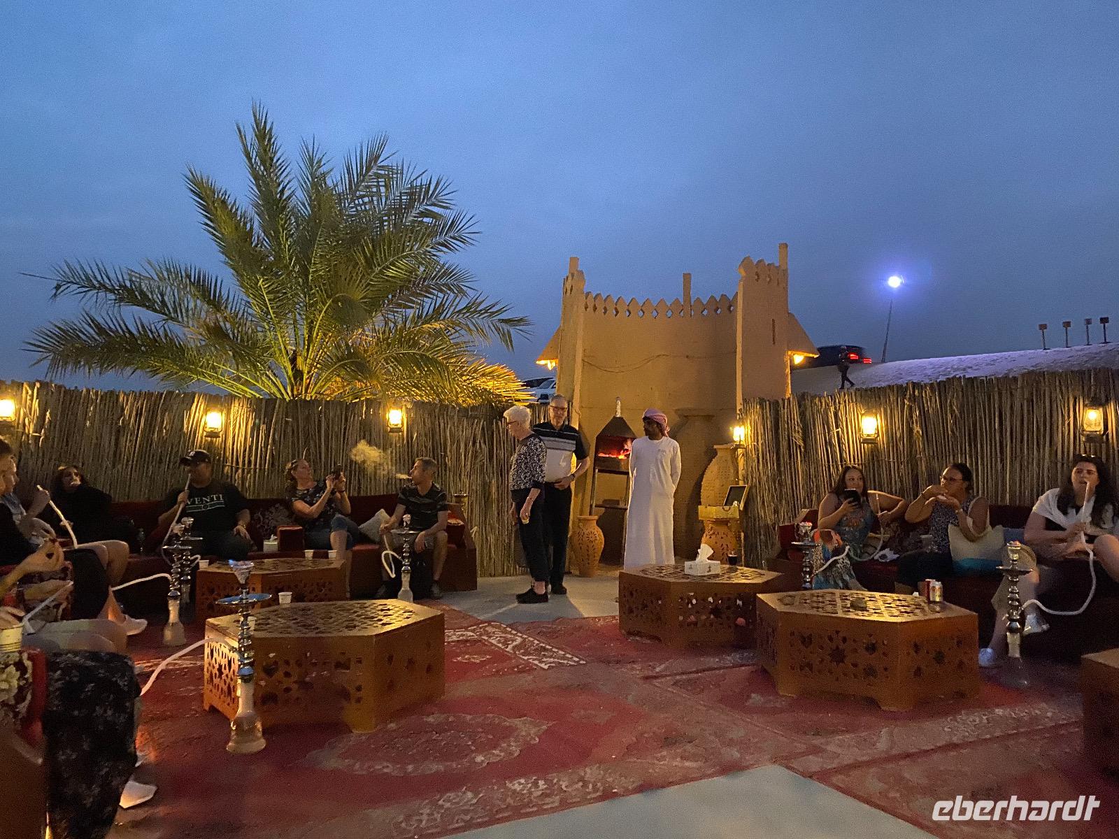 Anschließend blieb Zeit, um sich etwas auszuruhen, denn am Nachmittag erwartete uns bereits ein weiteres Highlight. Wir wurden von vier Jeeps abgeholt, mit welchen wir die Stadt Dubai schließlich verließen. Nach ca. 45minütiger Fahrt fanden wir uns in der Wüste wieder, wo wir zunächst einen kleinen Stop einlegten. Diesen nutzten wir für zahlreiche Fotos, während unsere Fahrer die Autos für die Weiterfahrt präparierten, indem die Luft von den Reifen abgelassen wurde. Anschließend ging es über die Dünen weiter. Je nachdem wie wir es wünschten, gaben die Fahrer ordentlich Gas und wir genossen die aufregende Fahrt. Als wir schließlich das Wüstencamp erreichten, erwartete uns zunächst eine kleine Falkenshow und wer wollte, konnte die Gelegenheit nutzen, auf einem Kamel zu reiten. Anschließend begaben wir uns in das Camp und gingen zu unseren Tischen. Hier konnten wir bereits eine Kleinigkeit essen und etwas trinken. Weiterhin bestand die Möglichkeit, sich ein Henna-Tattoo malen zu lassen, was der eine oder andere auch ausprobierte. Zahlreiche andere Aktivitäten wurden ebenfalls angeboten sowie verschiedene Tänze aufgeführt. Schließlich genossen wir ein leckeres Grillbuffet mit verschiedenen Spezialitäten. Im Anschluss traten wir mit den Jeeps wieder die Heimreise zurück in die Stadt an und wurden zu unserem Hotel gebracht. Hier ließ ein Teil der Reisegruppe den Abend noch im hoteleigenen Pub ausklingen.