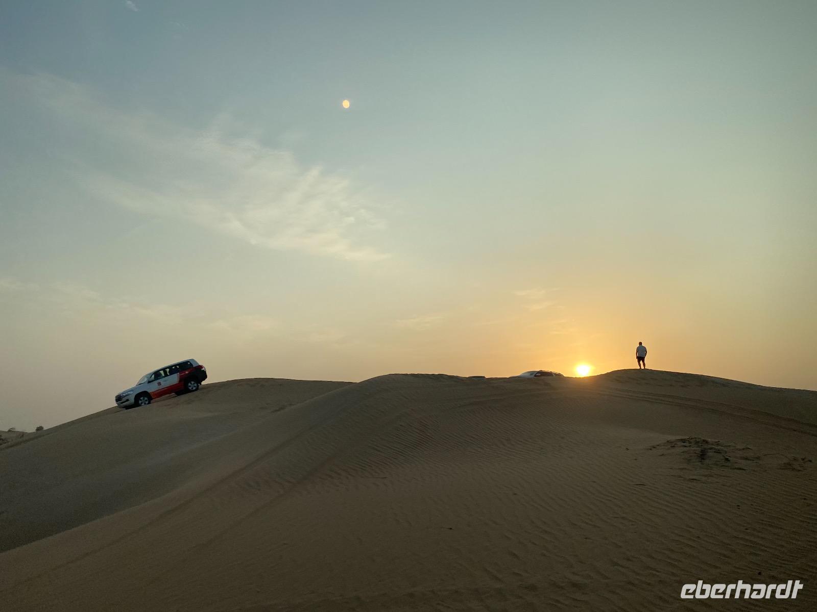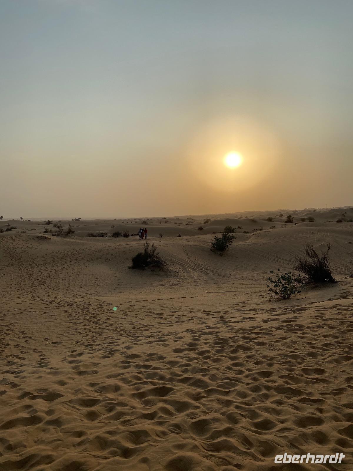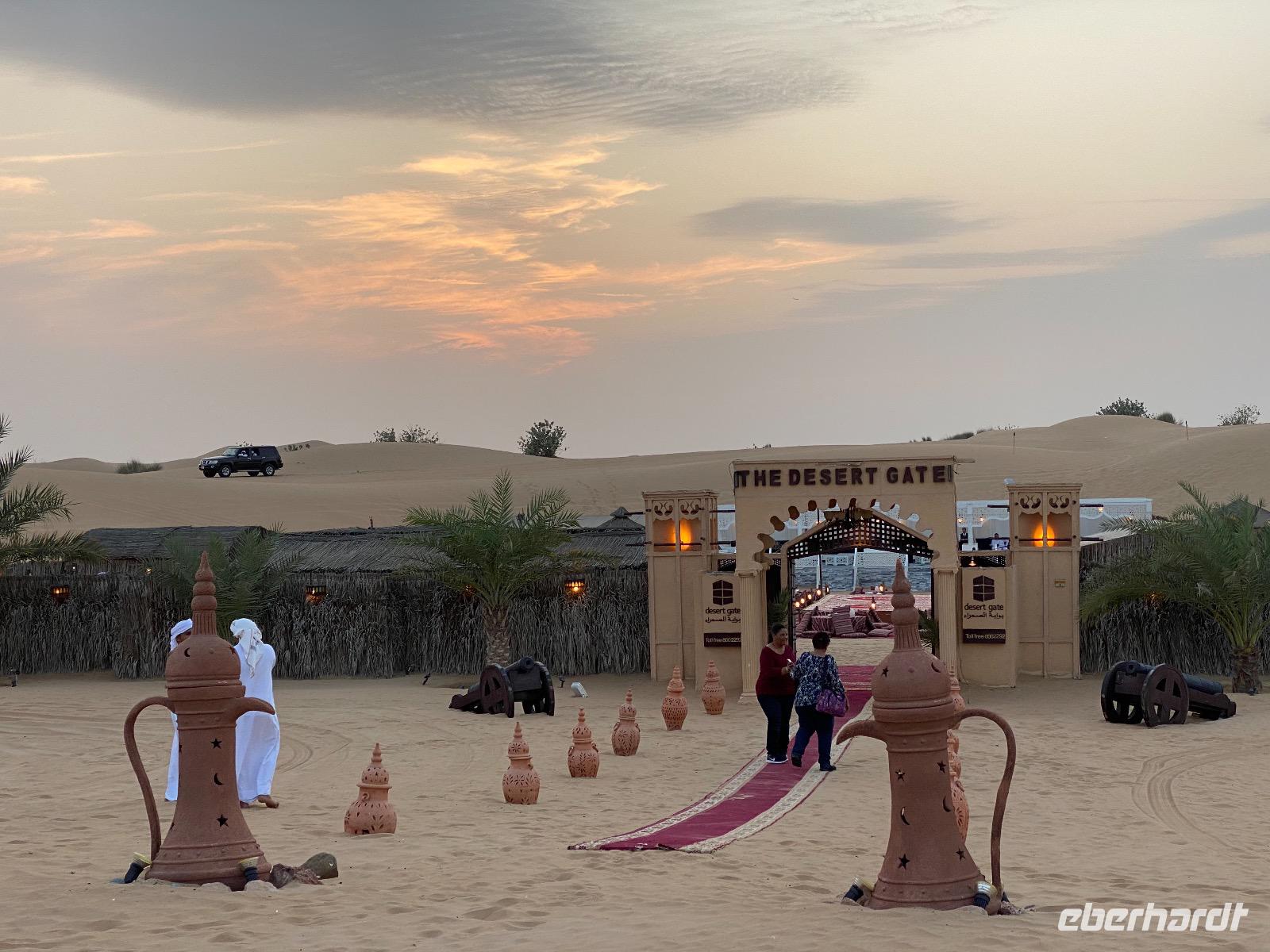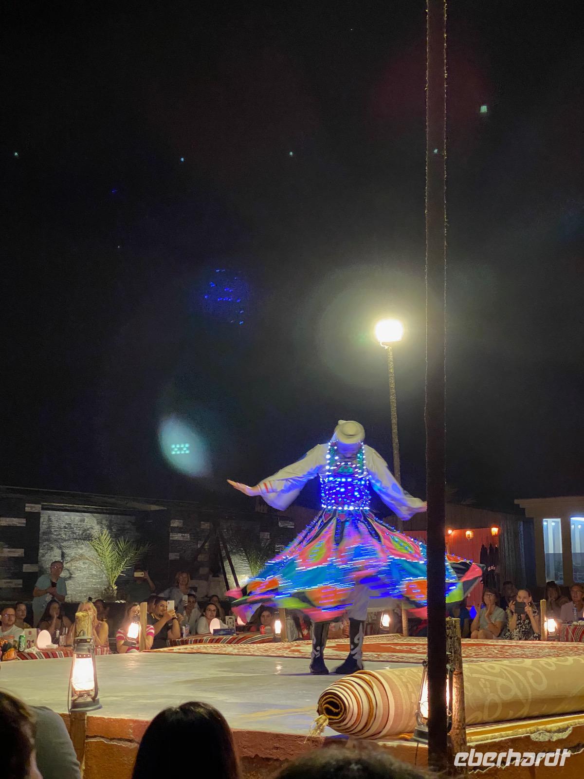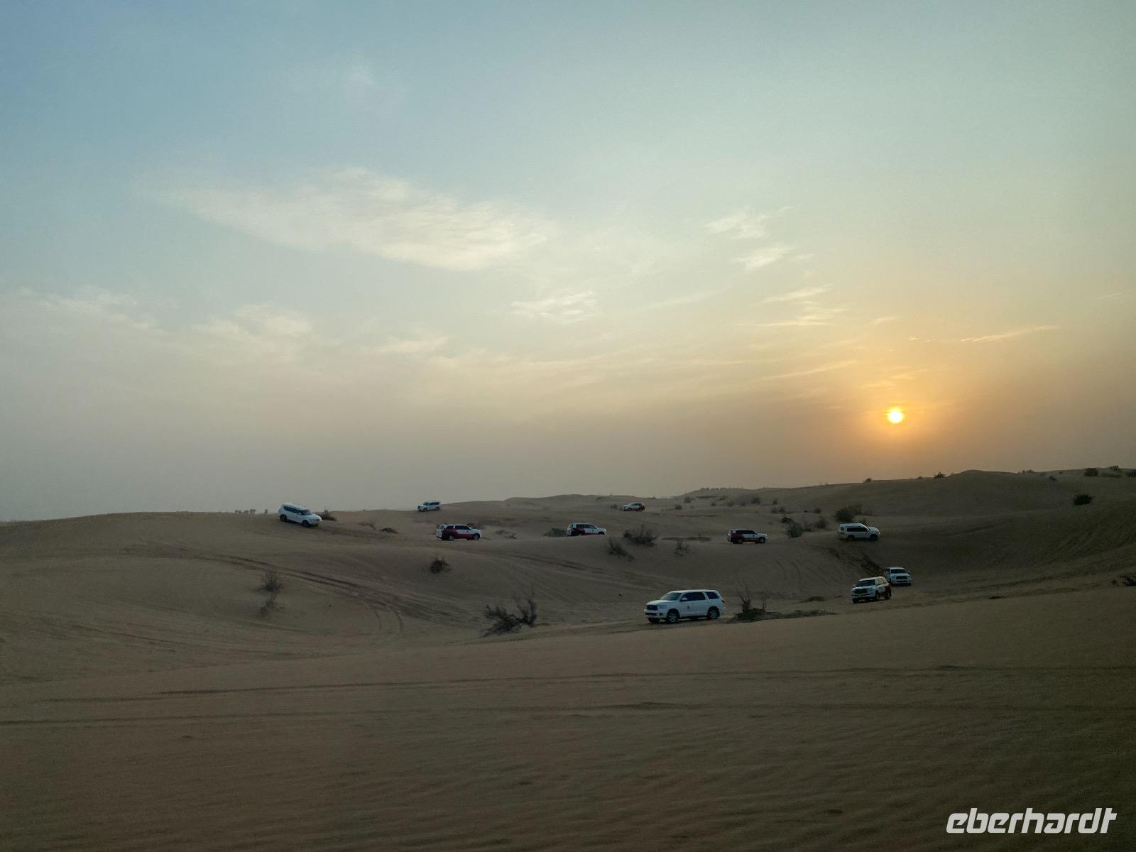 Anschließend blieb Zeit, um sich etwas auszuruhen, denn am Nachmittag erwartete uns bereits ein weiteres Highlight. Wir wurden von vier Jeeps abgeholt, mit welchen wir die Stadt Dubai schließlich verließen. Nach ca. 45minütiger Fahrt fanden wir uns in der Wüste wieder, wo wir zunächst einen kleinen Stop einlegten. Diesen nutzten wir für zahlreiche Fotos, während unsere Fahrer die Autos für die Weiterfahrt präparierten, indem die Luft von den Reifen abgelassen wurde. Anschließend ging es über die Dünen weiter. Je nachdem wie wir es wünschten, gaben die Fahrer ordentlich Gas und wir genossen die aufregende Fahrt. Als wir schließlich das Wüstencamp erreichten, erwartete uns zunächst eine kleine Falkenshow und wer wollte, konnte die Gelegenheit nutzen, auf einem Kamel zu reiten. Anschließend begaben wir uns in das Camp und gingen zu unseren Tischen. Hier konnten wir bereits eine Kleinigkeit essen und etwas trinken. Weiterhin bestand die Möglichkeit, sich ein Henna-Tattoo malen zu lassen, was der eine oder andere auch ausprobierte. Zahlreiche andere Aktivitäten wurden ebenfalls angeboten sowie verschiedene Tänze aufgeführt. Schließlich genossen wir ein leckeres Grillbuffet mit verschiedenen Spezialitäten. Im Anschluss traten wir mit den Jeeps wieder die Heimreise zurück in die Stadt an und wurden zu unserem Hotel gebracht. Hier ließ ein Teil der Reisegruppe den Abend noch im hoteleigenen Pub ausklingen.