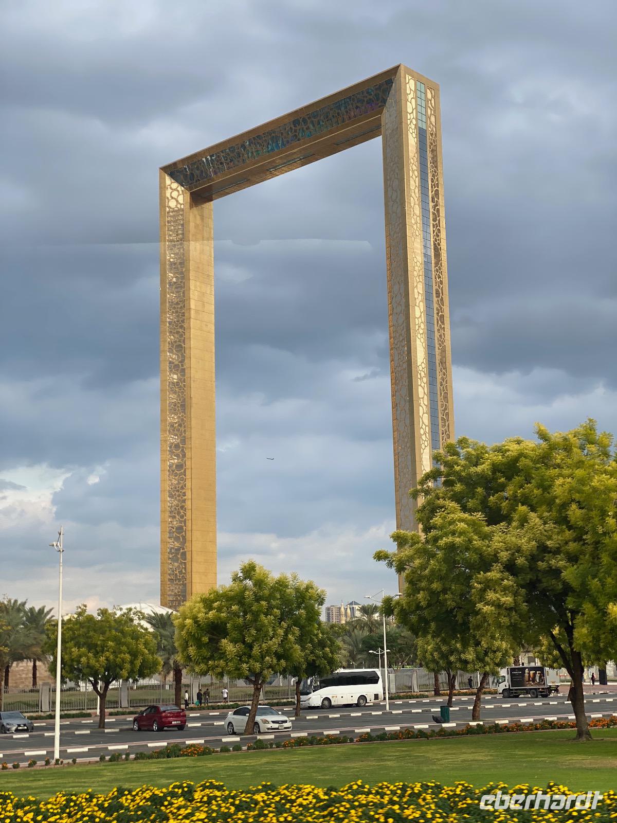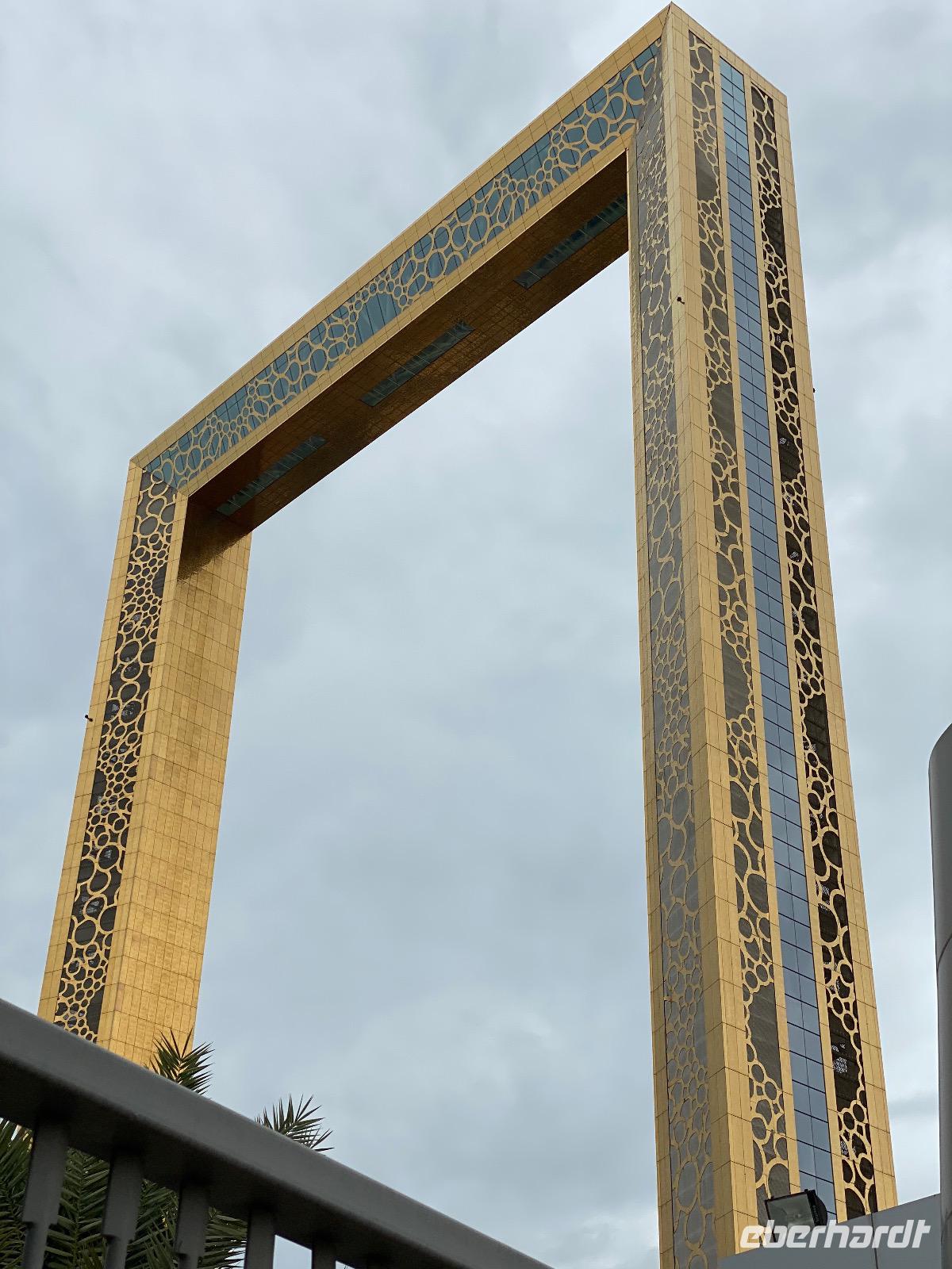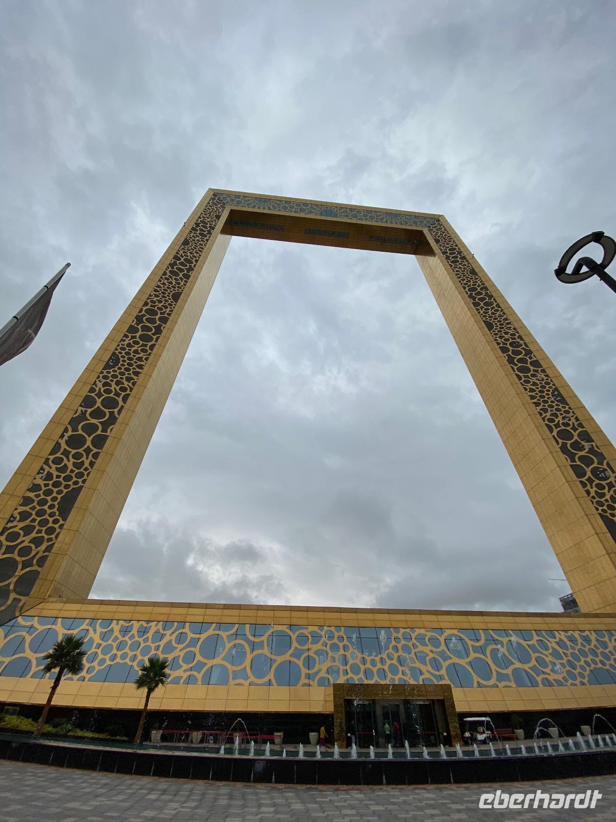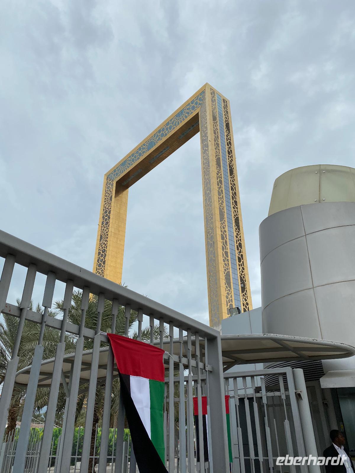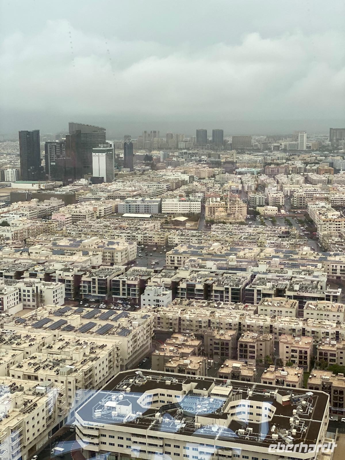 Der heutige Tag bestand aus einer Auswahl zahlreicher, fakultativ buchbarer Aktivitäten, sodass jeder heute ein etwas individuelleres Programm hatte. Ursprünglich waren für einige Gäste Rundflüge mit einem Helikopter bzw. Wasserflugzeug geplant, jedoch wurden diese leider kurzfristig aufgrund der klimatischen Bedingungen abgesagt. Denn heute herrschte „Unwetter" in Dubai. Dieses bestand aus etwas Regen und einem leichten Wind. In Dubai immerhin ausreichend, um die Schulen zu schließen, sodass alle Schüler und Studenten einen schulfreien Tag verbringen konnten. Ein Großteil der Reisegruppe entschloss sich, den Vormittag im Dubai Frame zu verbringen, dem größten Bilderrahmen der Welt. Hier erhielten wir einen Einblick in die Geschichte, die Gegenwart sowie die Zukunft Dubais. Nach einer kleinen Ausstellung zu vergangenen Zeiten konnten wir mit einem Aufzug bis auf eine Höhe von 150 Metern fahren. Hier erwartete uns eine Brücke mit teilweise gläsernem Boden, über welchen wir in nahezu schwindelerregender Höhe über Dubai wandeln konnten. Zu unserer Linken blickten wir auf das „Alte Dubai", während sich zu unserer Rechten das „Moderne Dubai" erstreckte, u.a. mit dem Burj Khalifa. Dieser versteckte sich heute jedoch etwas in den Wolken, sodass die Spitze leider nicht zu sehen war. Nach zahlreichen Fotos auf der Brücke konnten wir mit einem weiteren Aufzug wieder nach unten fahren, wo wir noch einen Einblick in das (möglicherweise) zukünftige Dubai gewinnen konnten. Mit vielen neuen Eindrücken fuhren wir schließlich zurück zum Hotel. Vom dabei vorherrschenden Regen ließen wir uns die Laune nicht vermiesen.