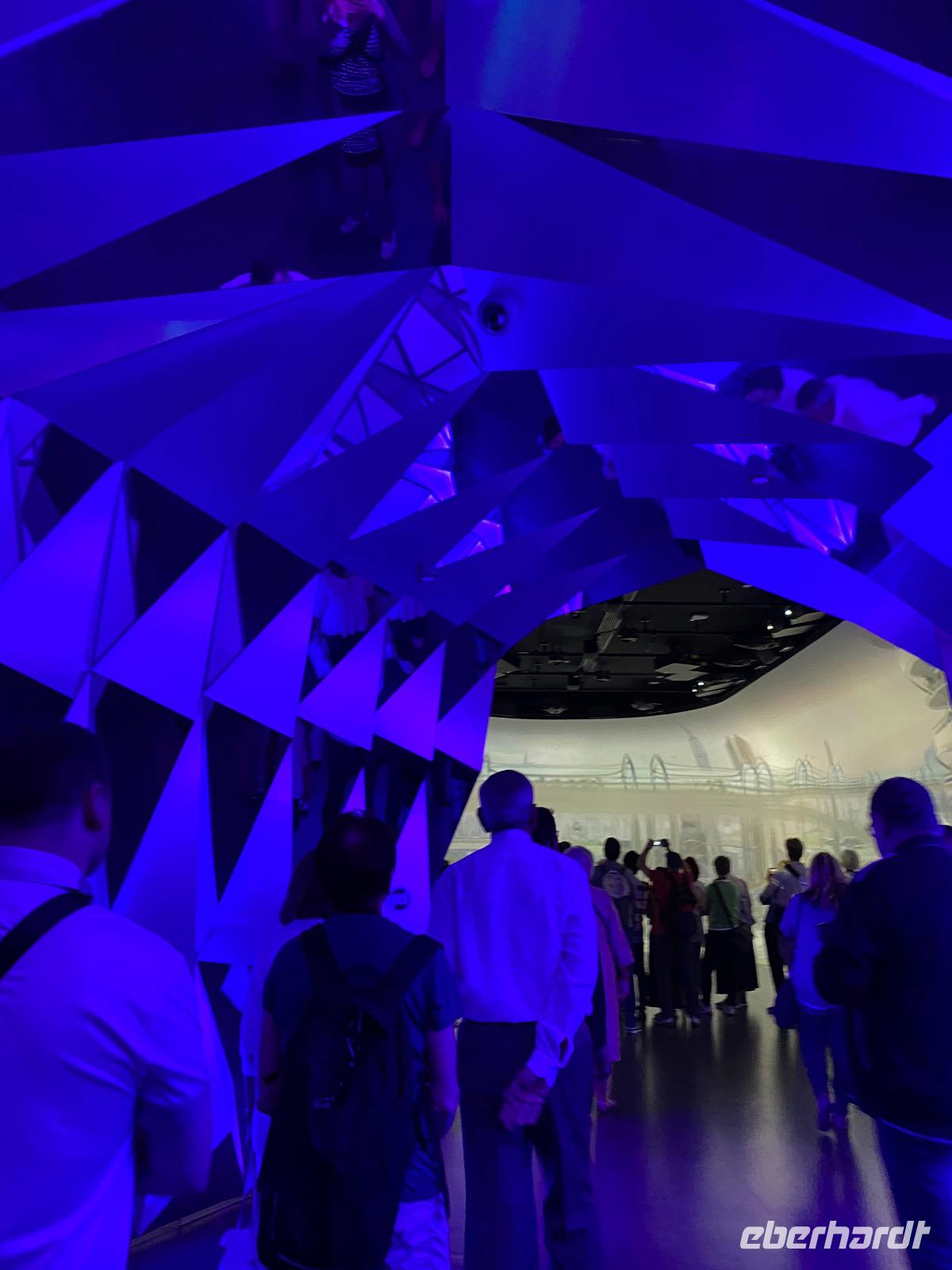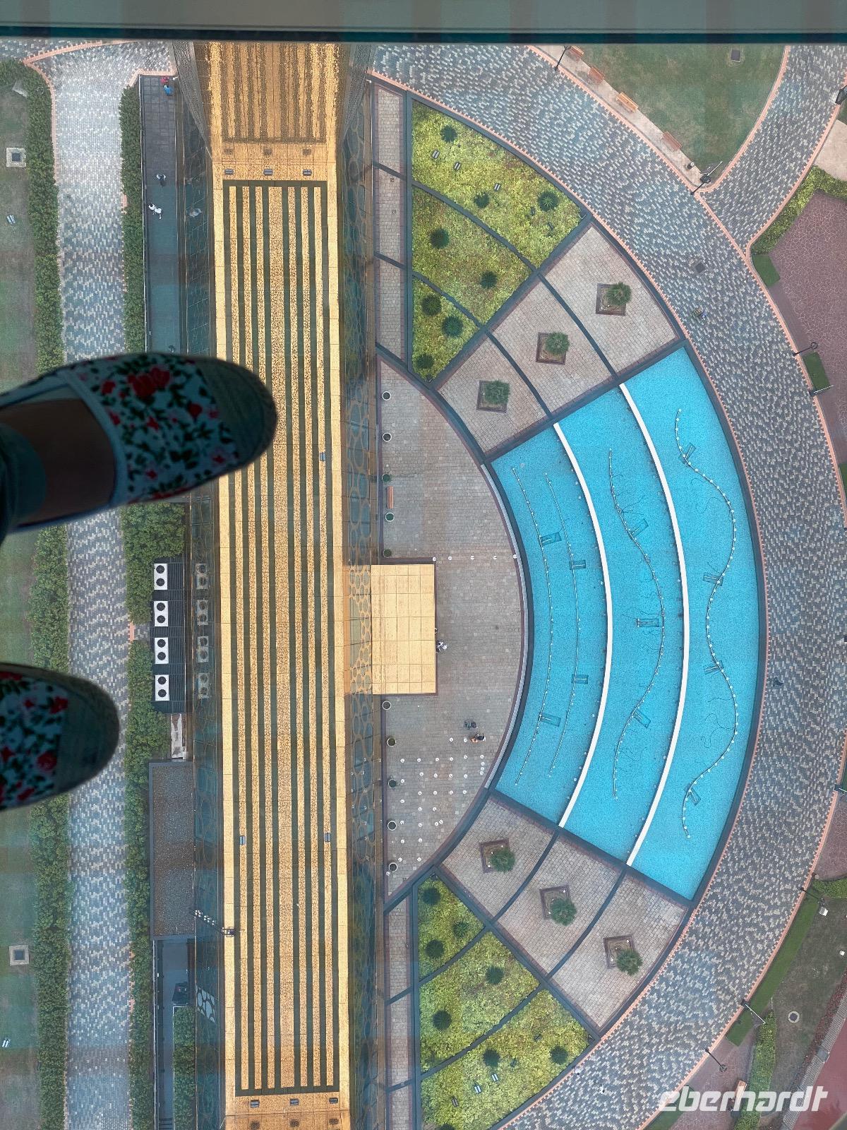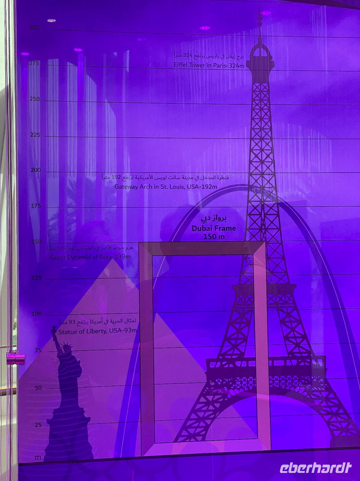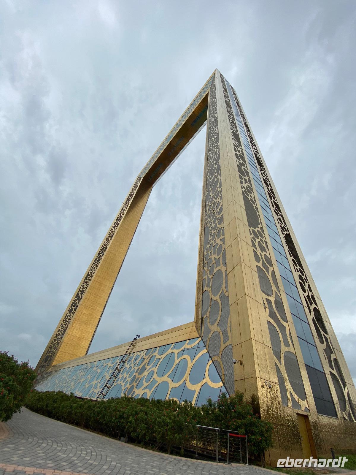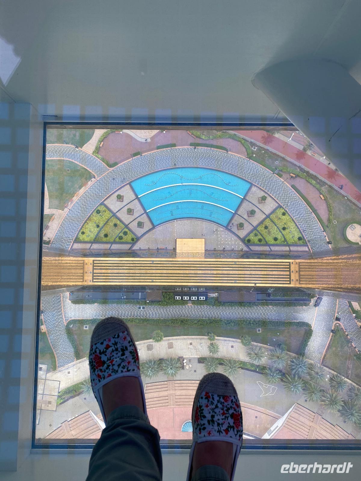 Der heutige Tag bestand aus einer Auswahl zahlreicher, fakultativ buchbarer Aktivitäten, sodass jeder heute ein etwas individuelleres Programm hatte. Ursprünglich waren für einige Gäste Rundflüge mit einem Helikopter bzw. Wasserflugzeug geplant, jedoch wurden diese leider kurzfristig aufgrund der klimatischen Bedingungen abgesagt. Denn heute herrschte „Unwetter" in Dubai. Dieses bestand aus etwas Regen und einem leichten Wind. In Dubai immerhin ausreichend, um die Schulen zu schließen, sodass alle Schüler und Studenten einen schulfreien Tag verbringen konnten. Ein Großteil der Reisegruppe entschloss sich, den Vormittag im Dubai Frame zu verbringen, dem größten Bilderrahmen der Welt. Hier erhielten wir einen Einblick in die Geschichte, die Gegenwart sowie die Zukunft Dubais. Nach einer kleinen Ausstellung zu vergangenen Zeiten konnten wir mit einem Aufzug bis auf eine Höhe von 150 Metern fahren. Hier erwartete uns eine Brücke mit teilweise gläsernem Boden, über welchen wir in nahezu schwindelerregender Höhe über Dubai wandeln konnten. Zu unserer Linken blickten wir auf das „Alte Dubai", während sich zu unserer Rechten das „Moderne Dubai" erstreckte, u.a. mit dem Burj Khalifa. Dieser versteckte sich heute jedoch etwas in den Wolken, sodass die Spitze leider nicht zu sehen war. Nach zahlreichen Fotos auf der Brücke konnten wir mit einem weiteren Aufzug wieder nach unten fahren, wo wir noch einen Einblick in das (möglicherweise) zukünftige Dubai gewinnen konnten. Mit vielen neuen Eindrücken fuhren wir schließlich zurück zum Hotel. Vom dabei vorherrschenden Regen ließen wir uns die Laune nicht vermiesen.