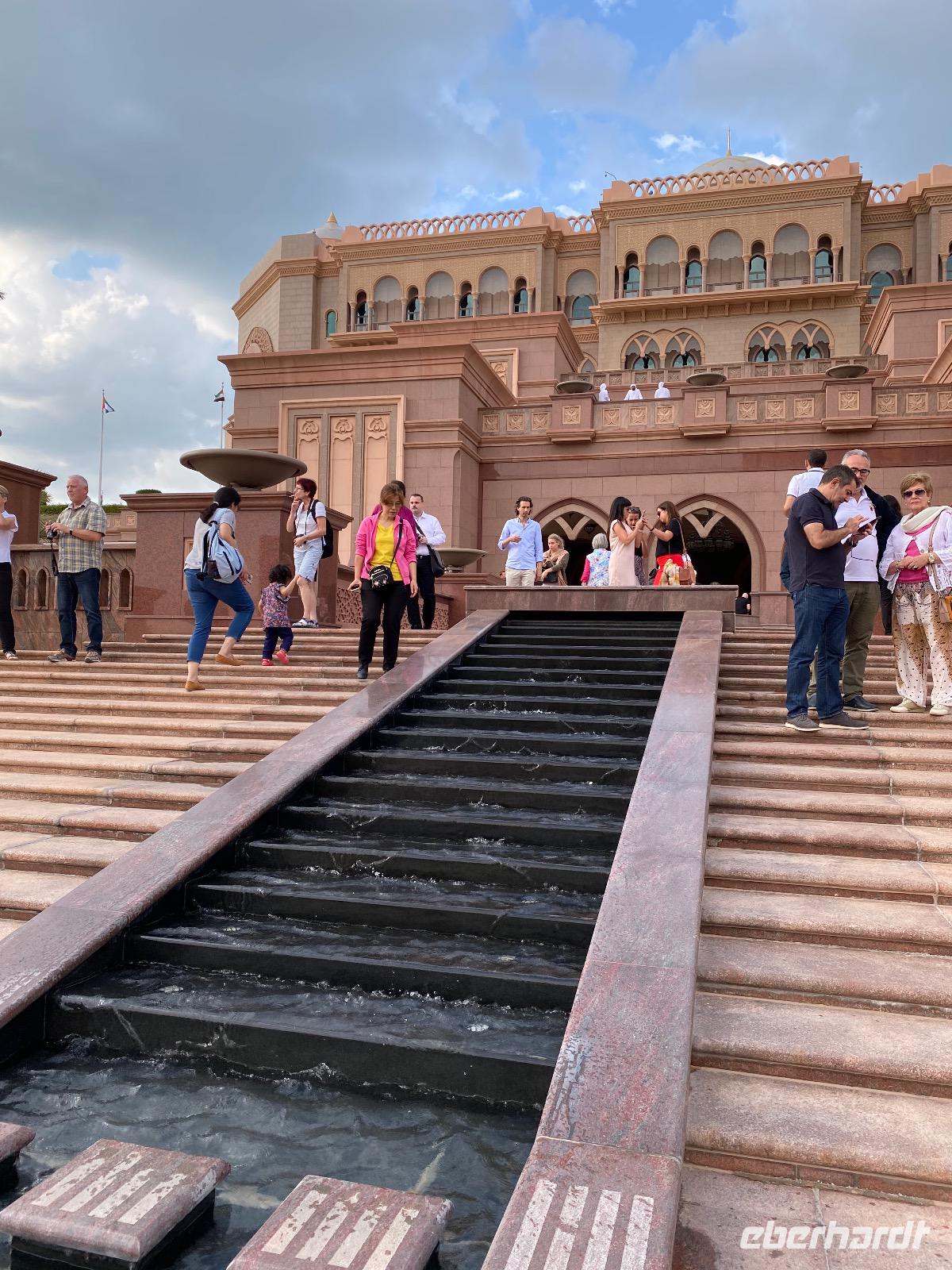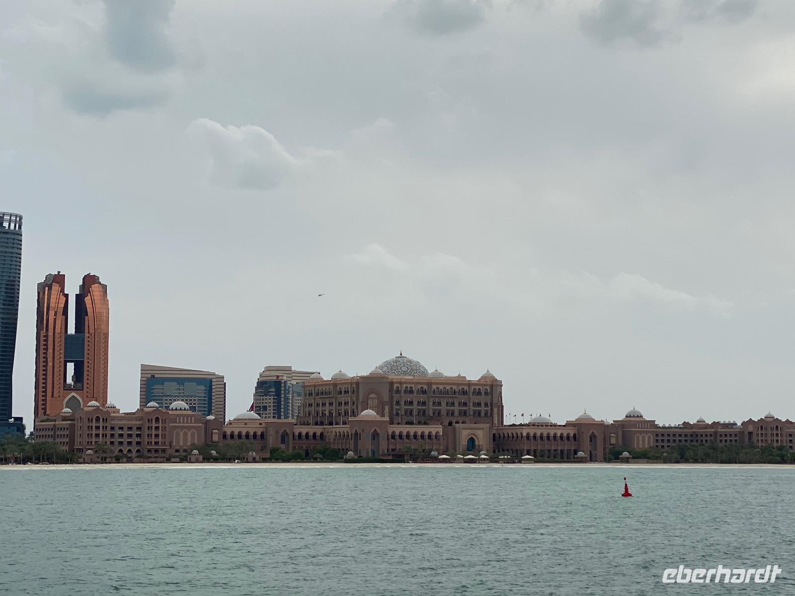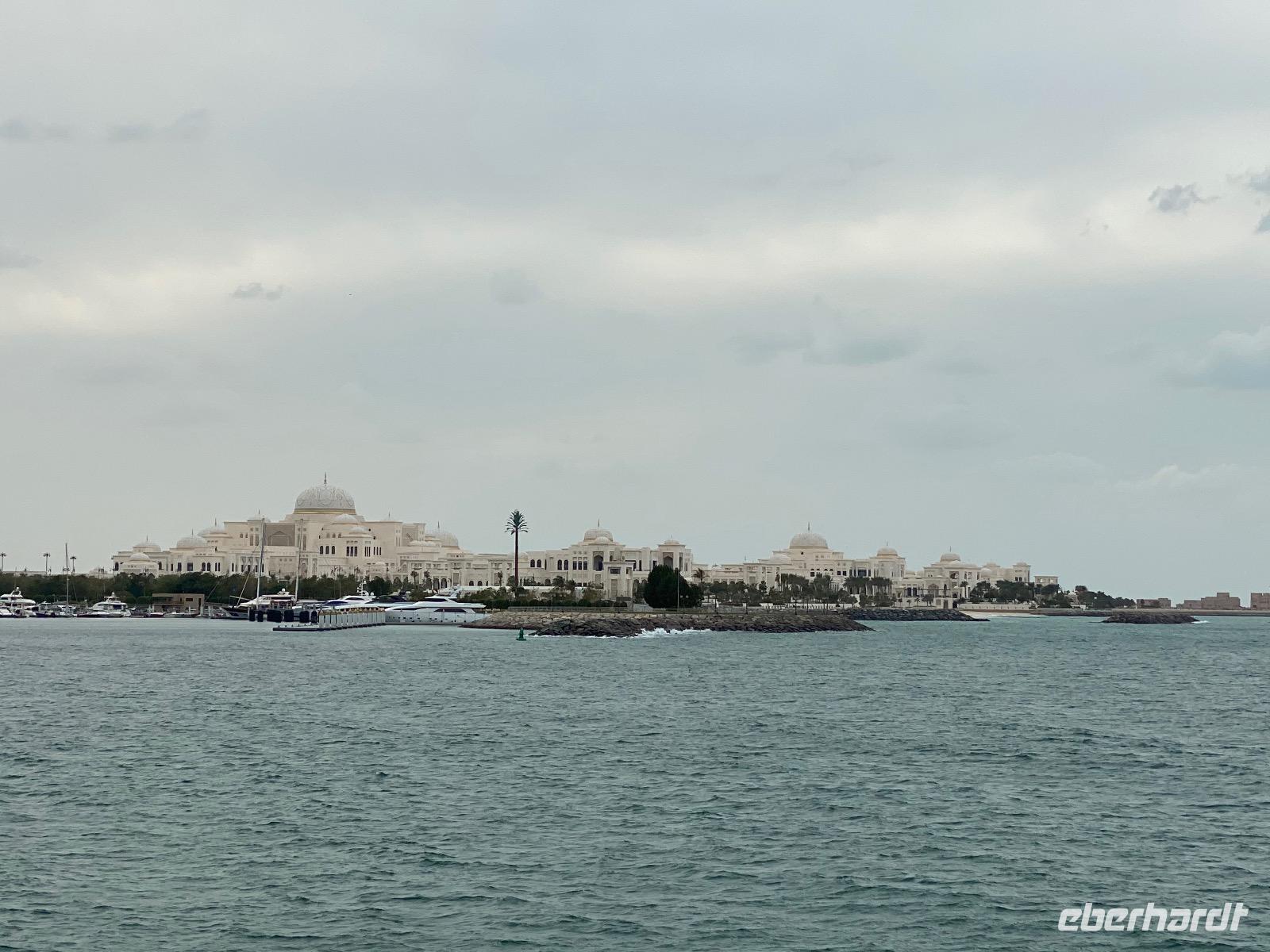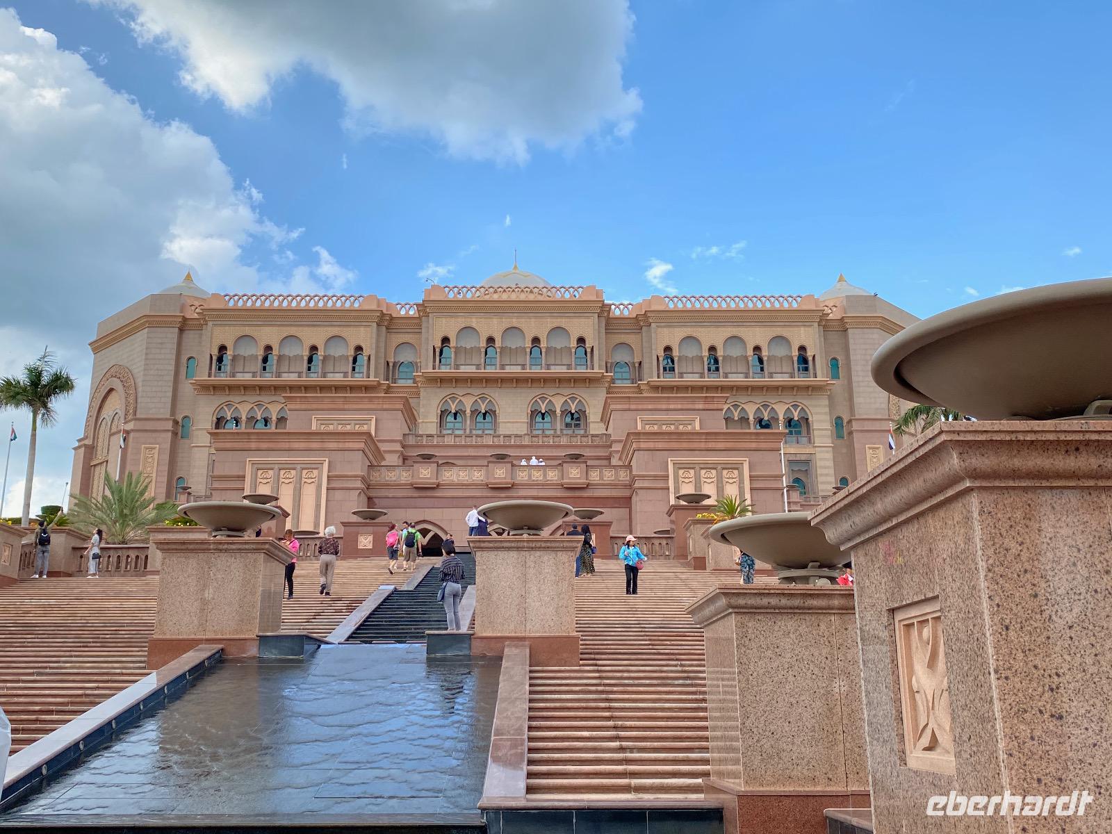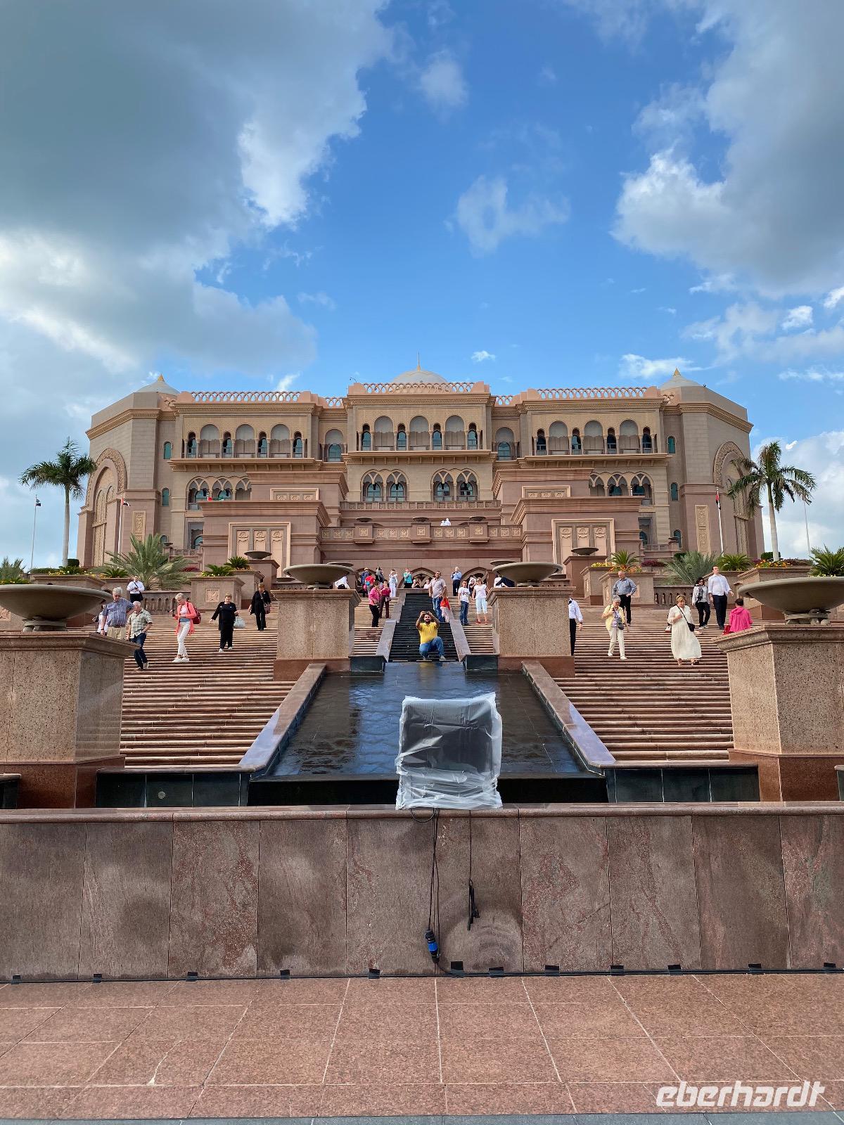 Zunächst erreichten wir Yas Island, wo wir die weltberühmte Formel 1-Strecke sowie die Ferrariworld von außen betrachten konnten. Vorbei am Louvre ging es schließlich zur Insel Abu Dhabi. Hier fuhren wir entlang der 8 Kilometer langen Strandpromenade und konnten schließlich einen wunderbaren Blick auf die Skyline der Stadt genießen. Bei einem weiteren Fotostop konnten wir das Emirates Palace sowie auch das neue Hotel, das Fairmont Hotel, fotografieren. Anschließend waren wir zur Teestunde im luxuriösesten Hotel des Emirates geladen, dem Emirates Palace, Teil der Kempinski Hotelkette. Durch die prunkvolle Lobby gelangten wir zu unseren Plätzen. Hier wurde uns Cappuccino, dekoriert mit Goldstaub, serviert. Dazu wurden Etageren mit zahlreichen Köstlichkeiten, von herzhaften Kleinigkeiten bis süßen Leckereien, gereicht. Wir genossen die kulinarischen Höhepunkte sowie die einzigartige Atmosphäre bei angenehmer Klaviermusik im Hintergrund. Anschließend begaben wir uns über die imposante Treppe nach unten, an deren Ende uns Wasserspiele erwarteten. Von hier hatten wir noch einmal einen tollen Blick auf das gewaltige Bauwerk, bevor wir mit dem Bus weiterfuhren. Wenig später fuhren wir vorbei am Palast des Scheiches von Abu Dhabi, welcher gleichzeitig auch immer der Präsident der Vereinigten Arabischen Emirate ist.
