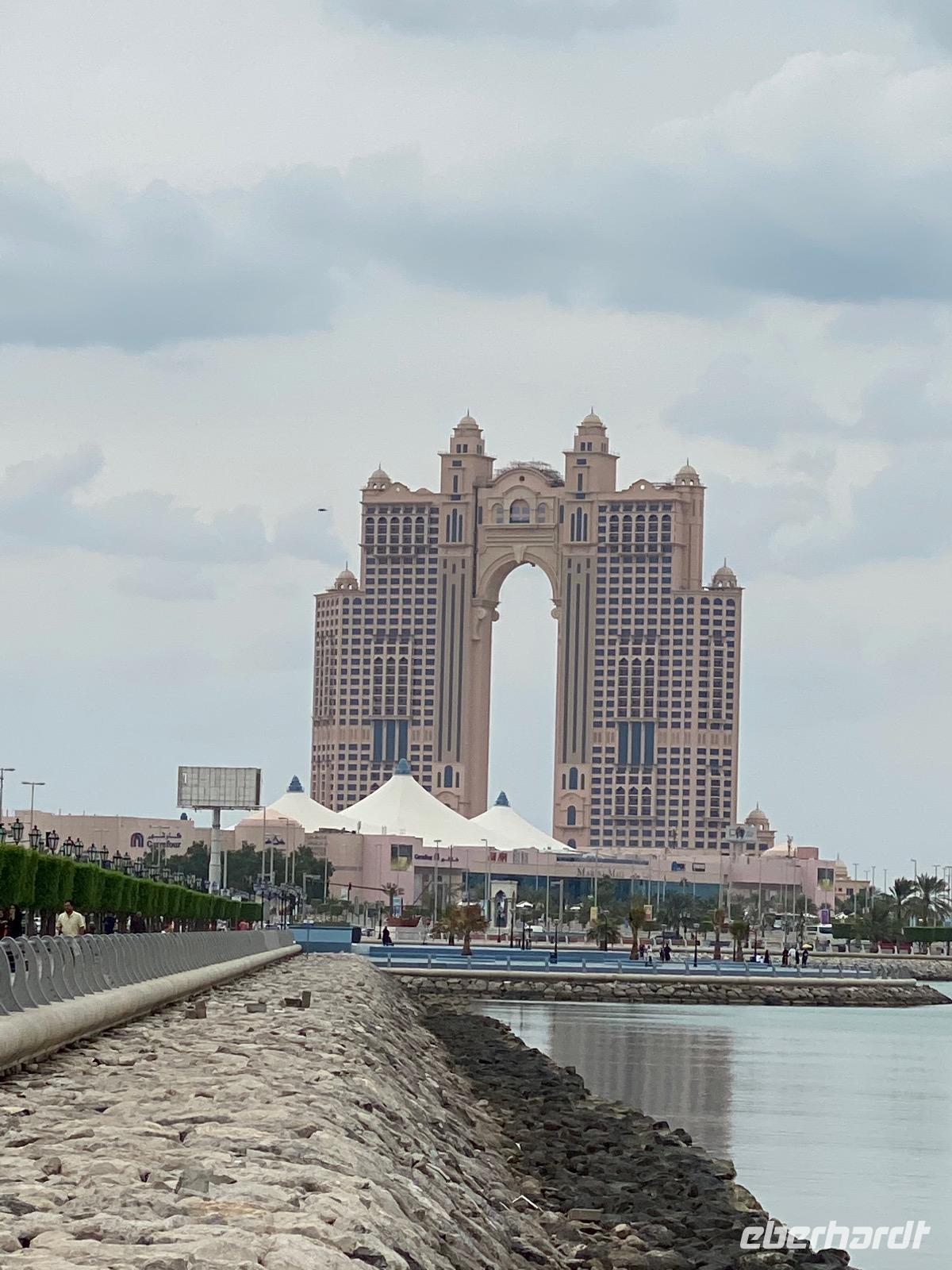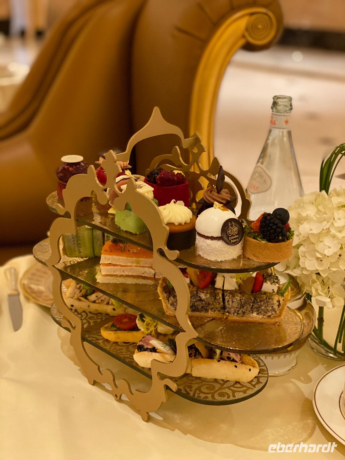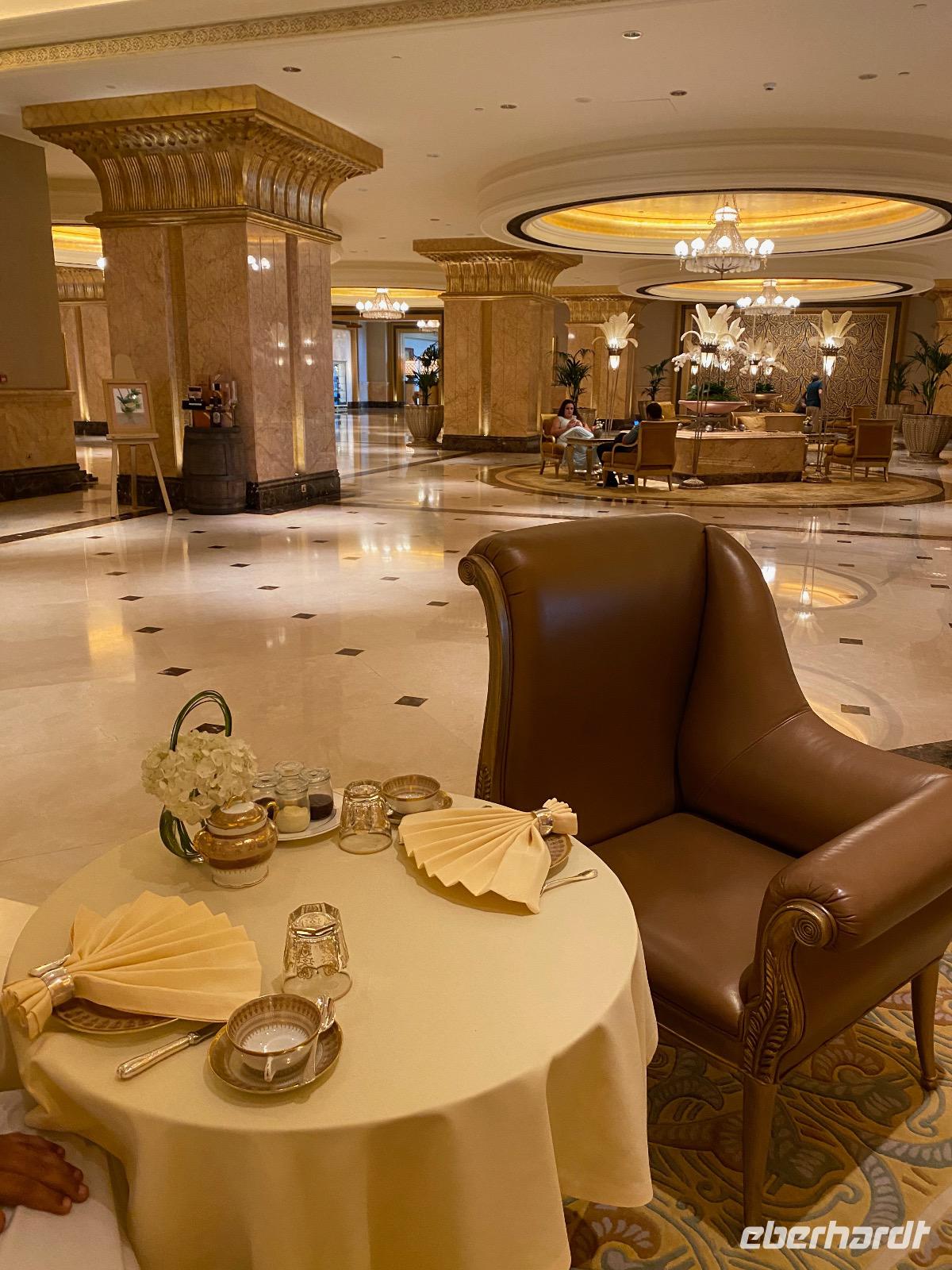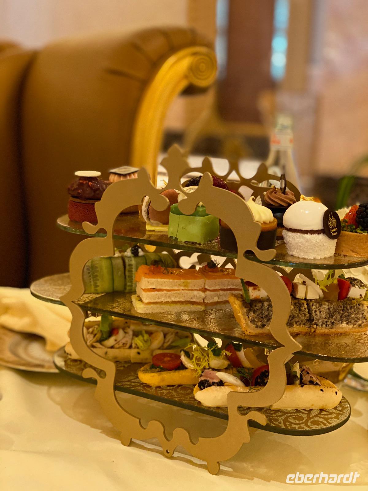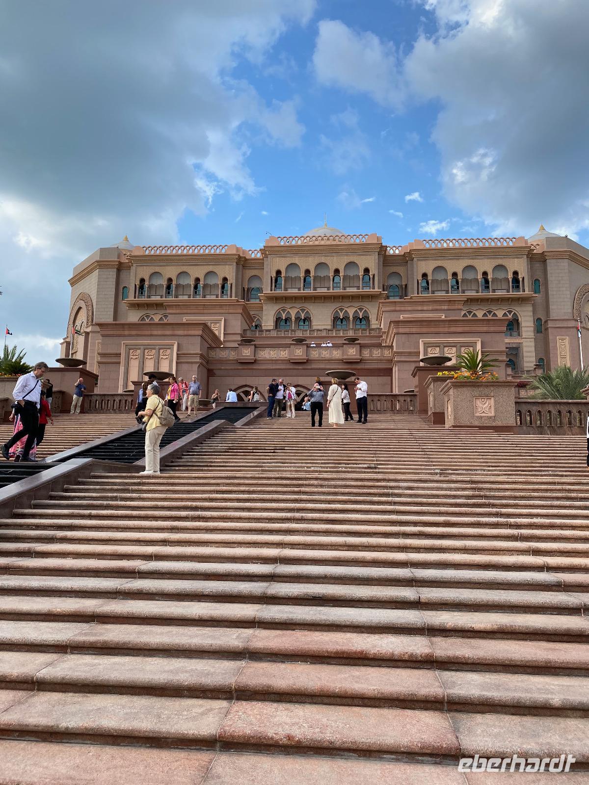 Zunächst erreichten wir Yas Island, wo wir die weltberühmte Formel 1-Strecke sowie die Ferrariworld von außen betrachten konnten. Vorbei am Louvre ging es schließlich zur Insel Abu Dhabi. Hier fuhren wir entlang der 8 Kilometer langen Strandpromenade und konnten schließlich einen wunderbaren Blick auf die Skyline der Stadt genießen. Bei einem weiteren Fotostop konnten wir das Emirates Palace sowie auch das neue Hotel, das Fairmont Hotel, fotografieren. Anschließend waren wir zur Teestunde im luxuriösesten Hotel des Emirates geladen, dem Emirates Palace, Teil der Kempinski Hotelkette. Durch die prunkvolle Lobby gelangten wir zu unseren Plätzen. Hier wurde uns Cappuccino, dekoriert mit Goldstaub, serviert. Dazu wurden Etageren mit zahlreichen Köstlichkeiten, von herzhaften Kleinigkeiten bis süßen Leckereien, gereicht. Wir genossen die kulinarischen Höhepunkte sowie die einzigartige Atmosphäre bei angenehmer Klaviermusik im Hintergrund. Anschließend begaben wir uns über die imposante Treppe nach unten, an deren Ende uns Wasserspiele erwarteten. Von hier hatten wir noch einmal einen tollen Blick auf das gewaltige Bauwerk, bevor wir mit dem Bus weiterfuhren. Wenig später fuhren wir vorbei am Palast des Scheiches von Abu Dhabi, welcher gleichzeitig auch immer der Präsident der Vereinigten Arabischen Emirate ist.