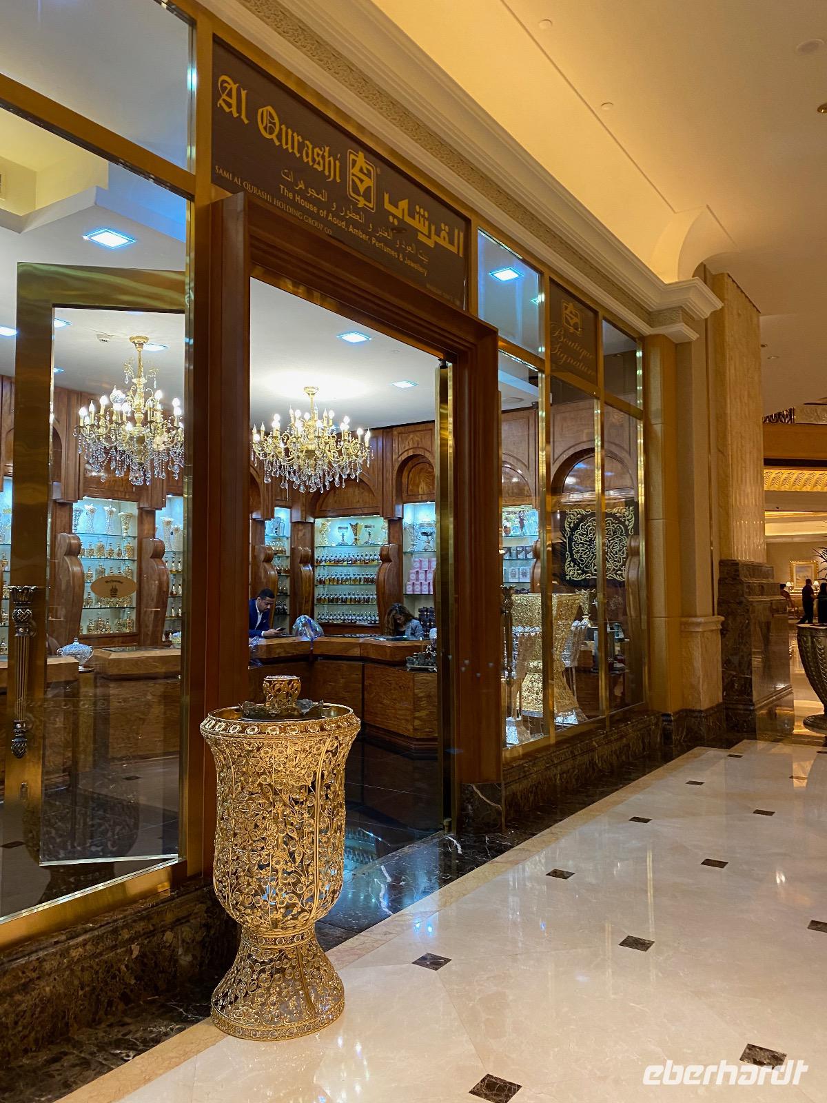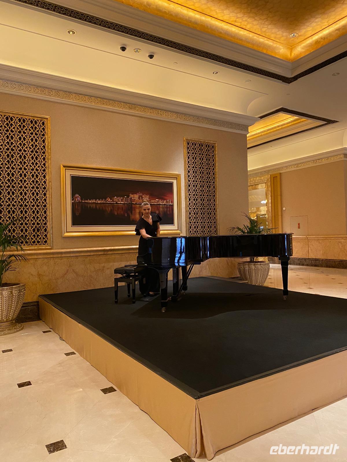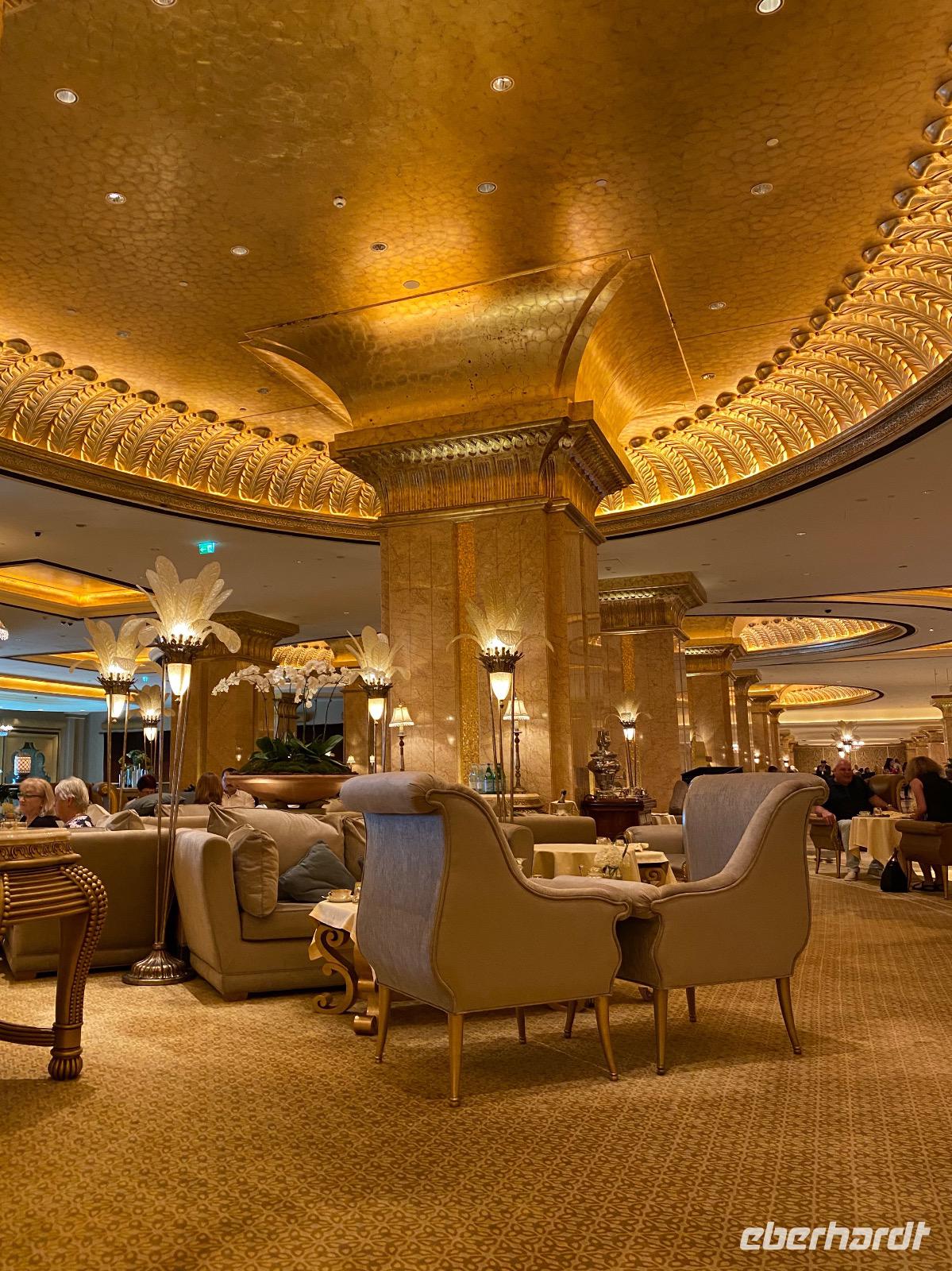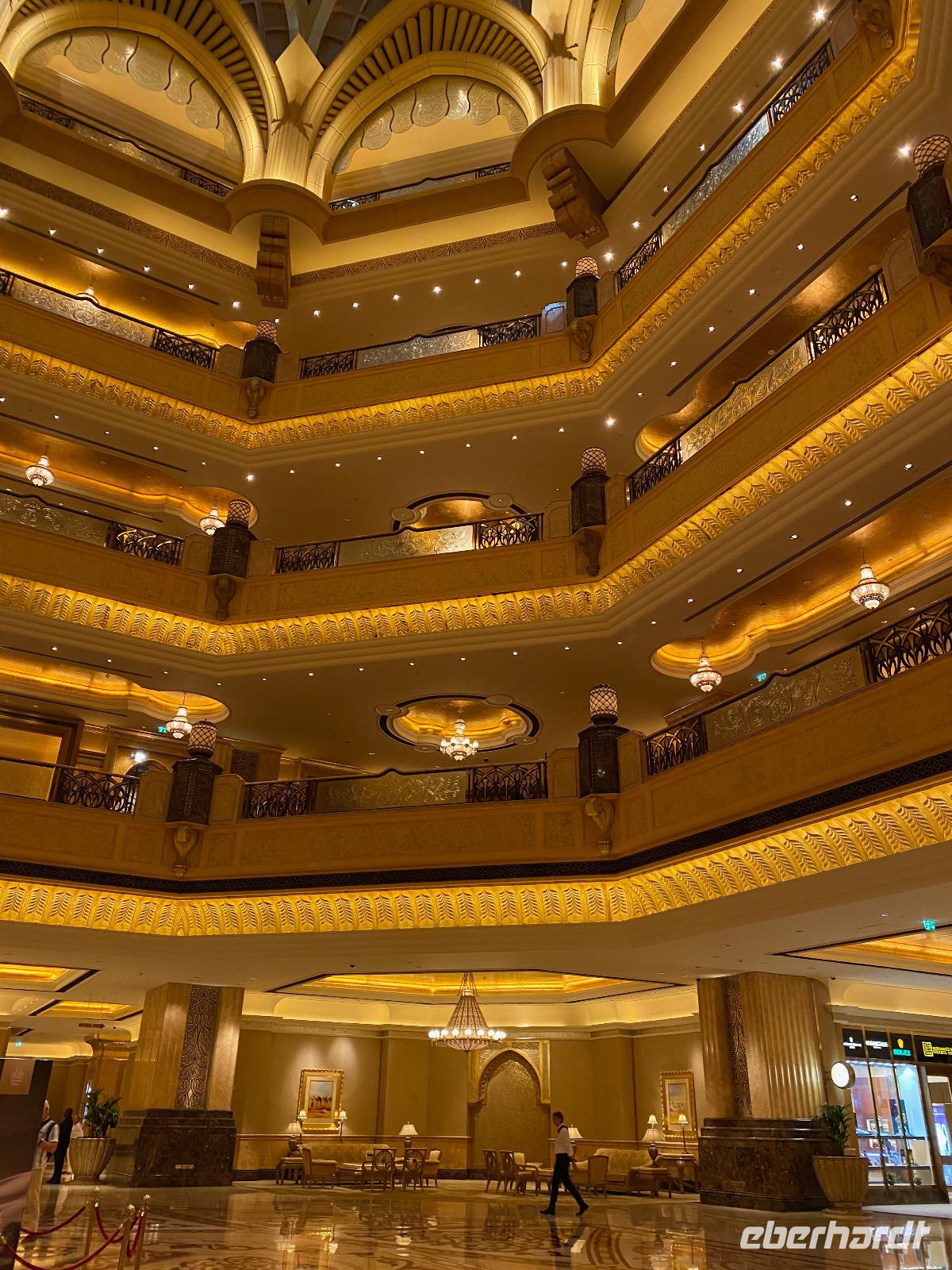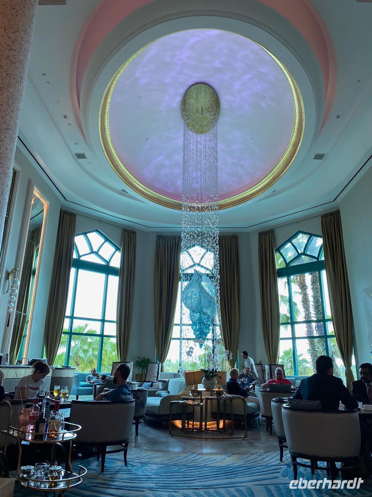 Zunächst erreichten wir Yas Island, wo wir die weltberühmte Formel 1-Strecke sowie die Ferrariworld von außen betrachten konnten. Vorbei am Louvre ging es schließlich zur Insel Abu Dhabi. Hier fuhren wir entlang der 8 Kilometer langen Strandpromenade und konnten schließlich einen wunderbaren Blick auf die Skyline der Stadt genießen. Bei einem weiteren Fotostop konnten wir das Emirates Palace sowie auch das neue Hotel, das Fairmont Hotel, fotografieren. Anschließend waren wir zur Teestunde im luxuriösesten Hotel des Emirates geladen, dem Emirates Palace, Teil der Kempinski Hotelkette. Durch die prunkvolle Lobby gelangten wir zu unseren Plätzen. Hier wurde uns Cappuccino, dekoriert mit Goldstaub, serviert. Dazu wurden Etageren mit zahlreichen Köstlichkeiten, von herzhaften Kleinigkeiten bis süßen Leckereien, gereicht. Wir genossen die kulinarischen Höhepunkte sowie die einzigartige Atmosphäre bei angenehmer Klaviermusik im Hintergrund. Anschließend begaben wir uns über die imposante Treppe nach unten, an deren Ende uns Wasserspiele erwarteten. Von hier hatten wir noch einmal einen tollen Blick auf das gewaltige Bauwerk, bevor wir mit dem Bus weiterfuhren. Wenig später fuhren wir vorbei am Palast des Scheiches von Abu Dhabi, welcher gleichzeitig auch immer der Präsident der Vereinigten Arabischen Emirate ist.