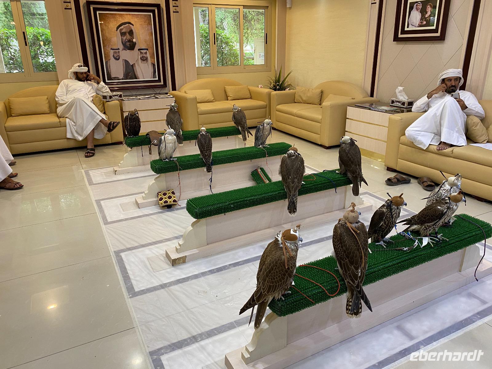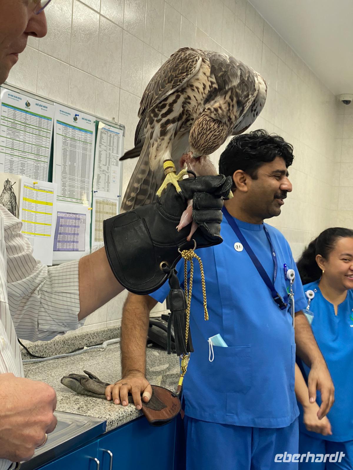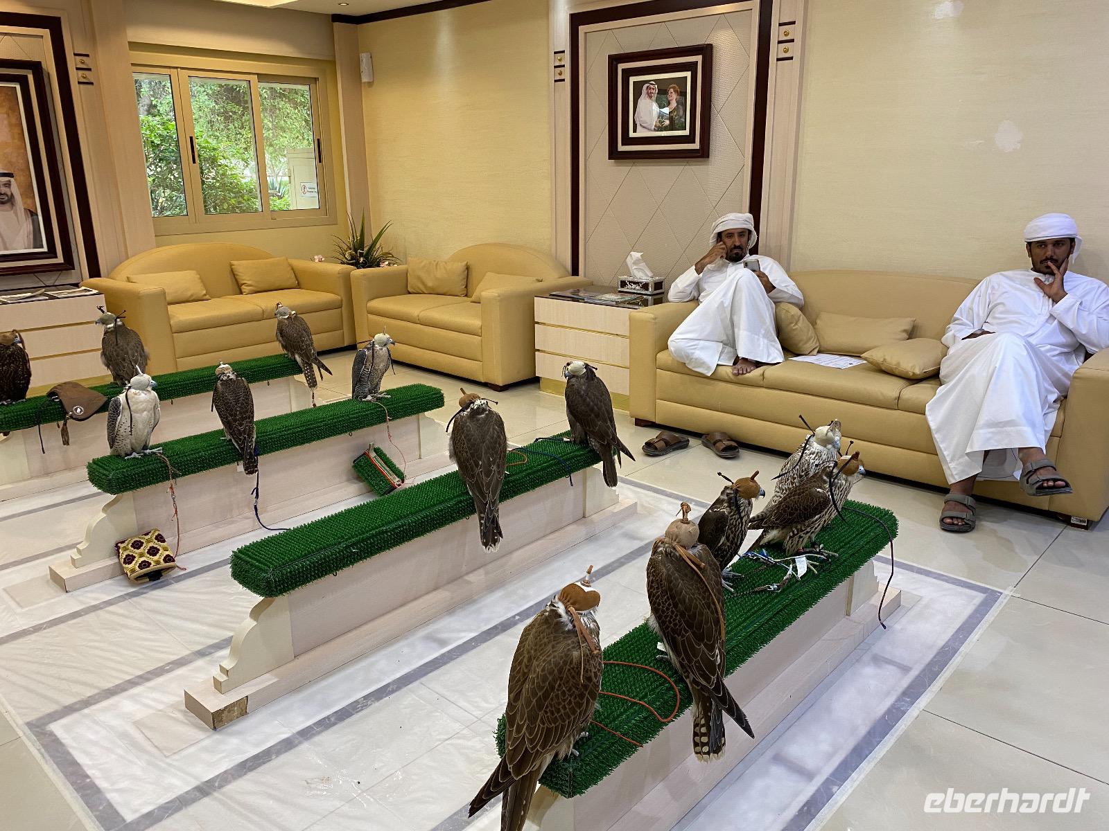Heute mussten wir mal etwas eher aufstehen als gewohnt, denn vor uns lag ein langer und ereignisreicher Tag. Nach dem zeitigeren Frühstück erwartete uns unser Bus bereits, um mit uns in das Emirat Abu Dhabi zu fahren. Heute wollten wir das größte und reichste Emirat erkunden und dafür standen einige interessante Punkte auf unserem Programm. Doch zunächst lag eine ca. 2-stündige Busfahrt vor uns. Diese verging jedoch recht schnell, denn unser Reiseleiter Ibrahim nutzte die Zeit, um uns ausführlich über die arabische Kultur zu berichten, insbesondere über die Unterschiede zwischen Gastarbeitern und Einheimischen. Schließlich erreichten wir unser erstes Tagesziel, die Falkenklinik von Frau Dr. Müller. Hier erhielten wir eine Führung durch die Anlage und konnten sogar einen Arzt bei einem kleineren Eingriff an einem Falken über die Schulter schauen. Anschließend bestand die Möglichkeit, eines der Tiere selbst auf dem Arm zu halten, bevor wir schließlich sogar die Fütterung eines Vogels miterlebten bzw. daran mitwirken konnten. Weiterhin erfuhren wir, dass ein Falke zwischen 2.000 und 500.000 Euro kosten kann. Was für unvorstellbare Summen! Mit vielen neuen Eindrücken verließen wir die Falkenklinik schließlich und fuhren nach Abu Dhabi.