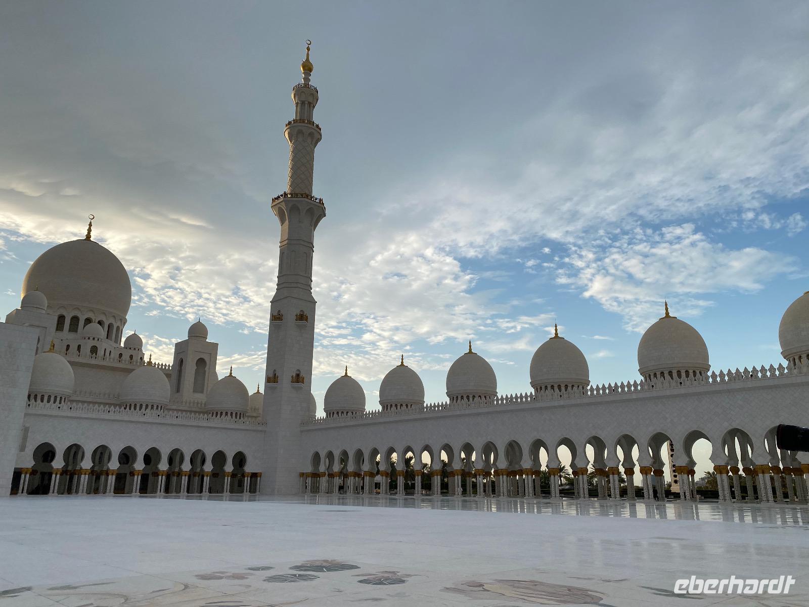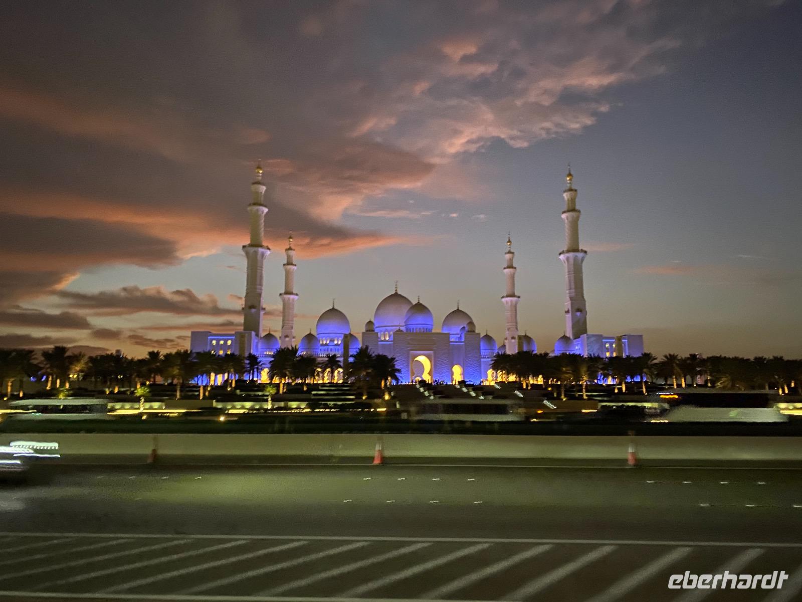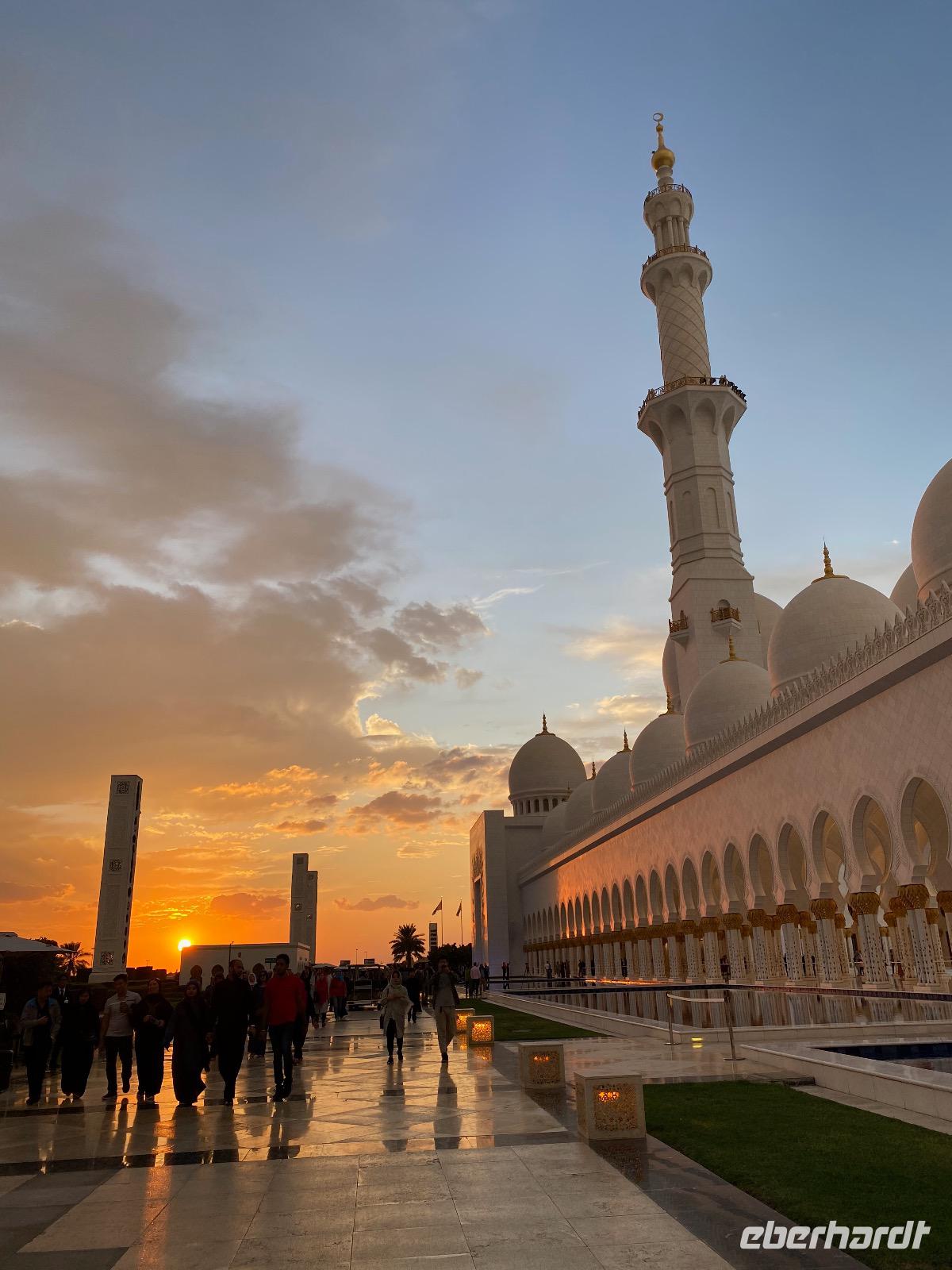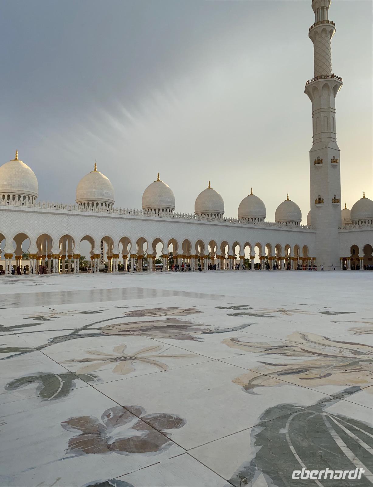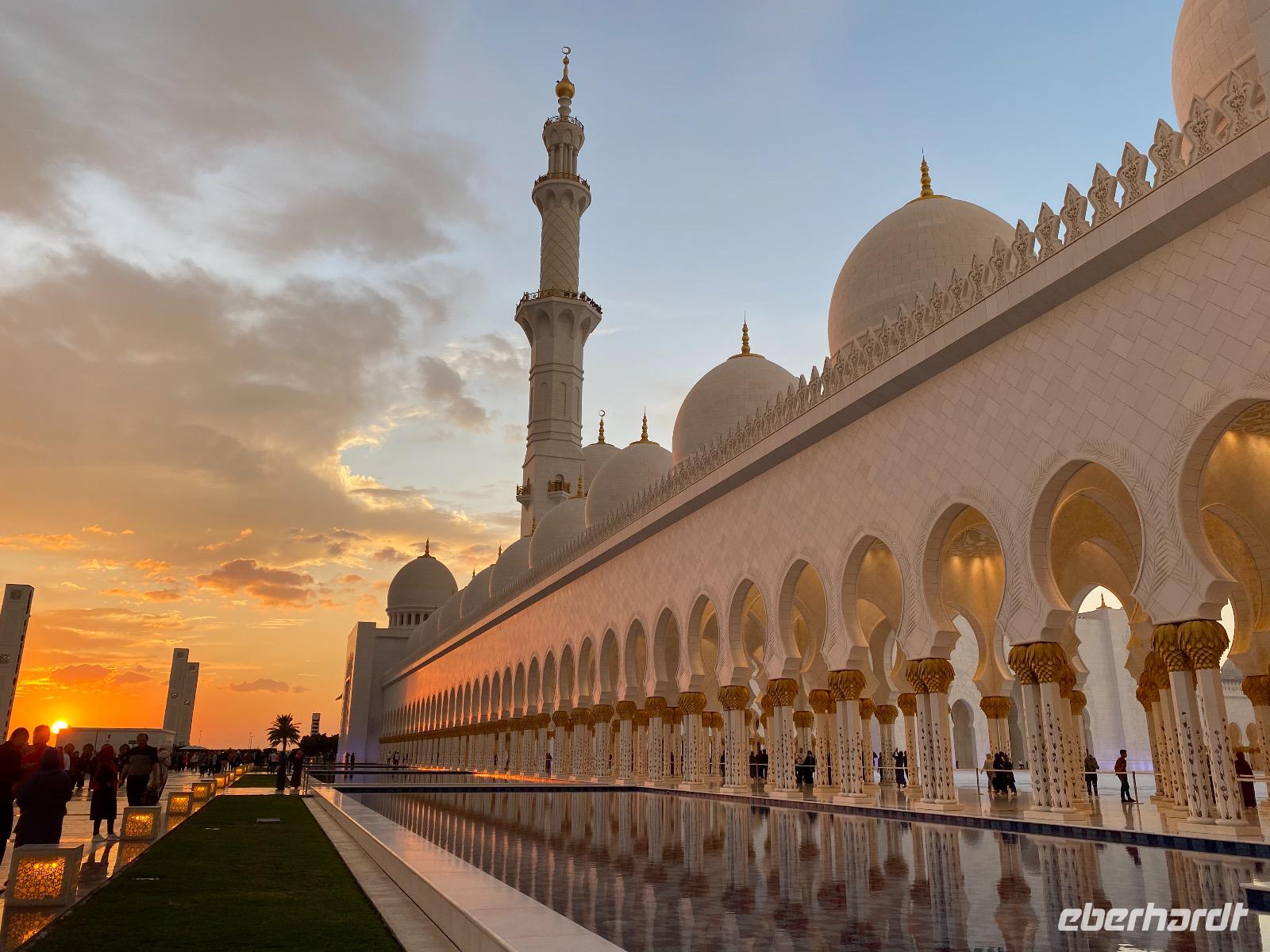 Schließlich erreichten wir die Große Moschee von Abu Dhabi, die Scheich Zayed Moschee. Diese ist die drittgrößte Moschee der Welt und bietet Platz für ca. 40.000 Gläubige. Um diese Moschee zu besuchen, mussten wir uns an besondere Kleidervorschriften halten, welche insbesondere für die Frauen hier gelten. So mussten bei den Damen Arme und Beine sowie auch der Kopf komplett bedeckt sein, lediglich Füße, Hände und Gesicht durften sichtbar sein. Nachdem wir uns entsprechend gekleidet hatten, durften wir die Moschee durch einen unterirdischen Gang betreten. Wir waren sofort beeindruckt von diesem gewaltigen Gebäude. Im Inneren fanden wir verschiedene Marmor-Sorten vor sowie zahlreiche Verzierungen aus Gold und Halbedelsteinen. Weiterhin bestaunten wir den riesigen handgeknüpften Teppich, welcher mit ca. 5.600 Quadratmetern Größe und einem Gewicht von ca. 47 Tonnen als der größte handgeknüpfte Teppich der Welt gilt. Wir schauten uns die verschiedenen Bereiche der Moschee an, bis schließlich zu Sonnenuntergang der Gebetsruf ertönte, welcher für uns gleichzeitig das Signal war, zurück zum Bus zu gehen. So bot sich uns zum Abschluss nochmal ein herrliches Motiv der Moschee - zunächst bei Sonnenuntergang sowie kurz darauf wunderschön beleuchtet. Mit vielen neuen Eindrücken und weiteren Superlativen begaben wir uns schließlich zurück nach Dubai, wo wir am Abend unser Hotel erreichten.