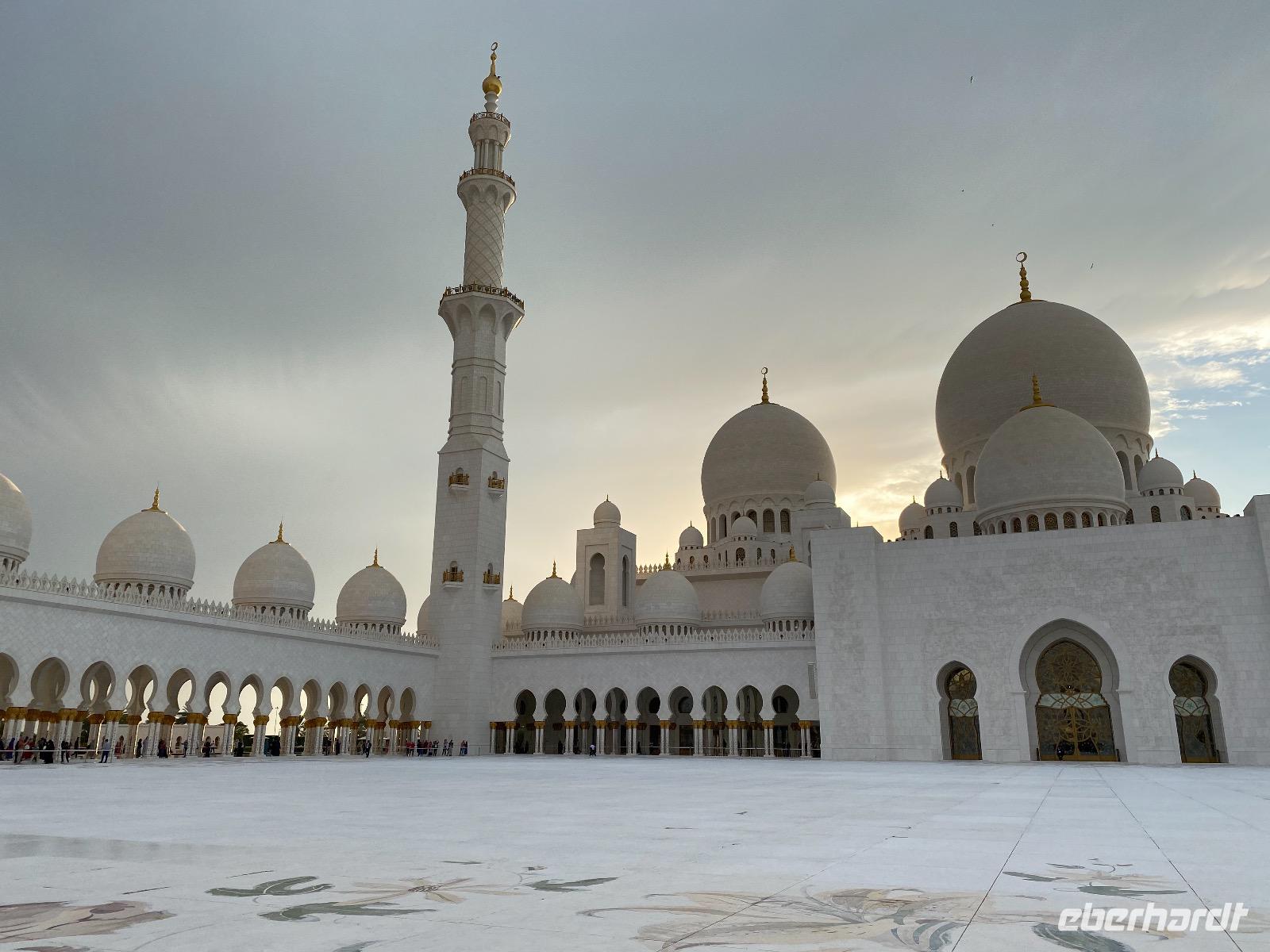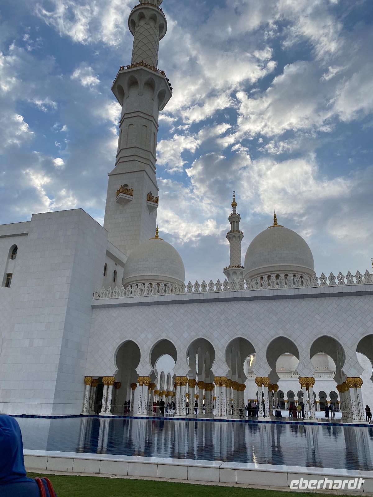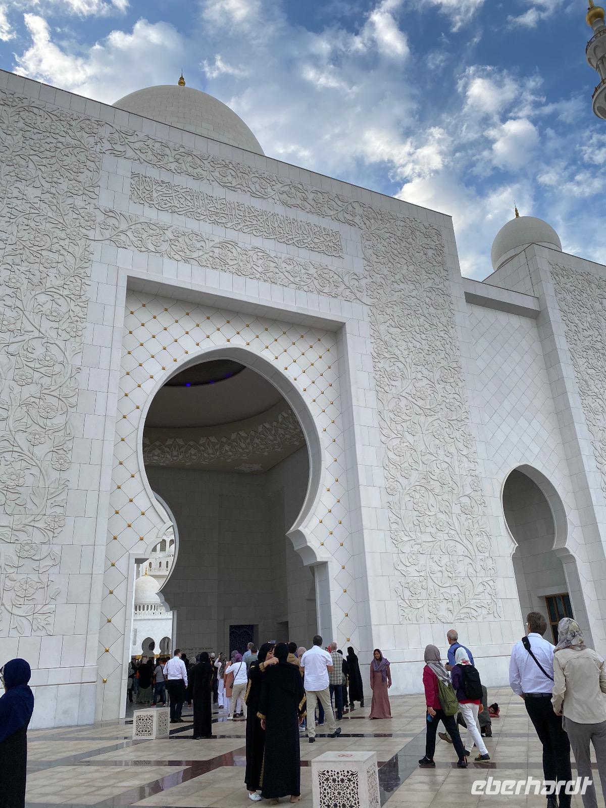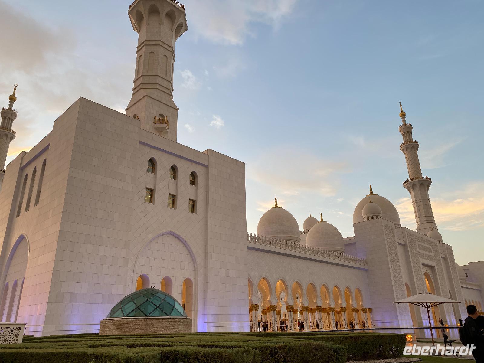 Schließlich erreichten wir die Große Moschee von Abu Dhabi, die Scheich Zayed Moschee. Diese ist die drittgrößte Moschee der Welt und bietet Platz für ca. 40.000 Gläubige. Um diese Moschee zu besuchen, mussten wir uns an besondere Kleidervorschriften halten, welche insbesondere für die Frauen hier gelten. So mussten bei den Damen Arme und Beine sowie auch der Kopf komplett bedeckt sein, lediglich Füße, Hände und Gesicht durften sichtbar sein. Nachdem wir uns entsprechend gekleidet hatten, durften wir die Moschee durch einen unterirdischen Gang betreten. Wir waren sofort beeindruckt von diesem gewaltigen Gebäude. Im Inneren fanden wir verschiedene Marmor-Sorten vor sowie zahlreiche Verzierungen aus Gold und Halbedelsteinen. Weiterhin bestaunten wir den riesigen handgeknüpften Teppich, welcher mit ca. 5.600 Quadratmetern Größe und einem Gewicht von ca. 47 Tonnen als der größte handgeknüpfte Teppich der Welt gilt. Wir schauten uns die verschiedenen Bereiche der Moschee an, bis schließlich zu Sonnenuntergang der Gebetsruf ertönte, welcher für uns gleichzeitig das Signal war, zurück zum Bus zu gehen. So bot sich uns zum Abschluss nochmal ein herrliches Motiv der Moschee - zunächst bei Sonnenuntergang sowie kurz darauf wunderschön beleuchtet. Mit vielen neuen Eindrücken und weiteren Superlativen begaben wir uns schließlich zurück nach Dubai, wo wir am Abend unser Hotel erreichten.