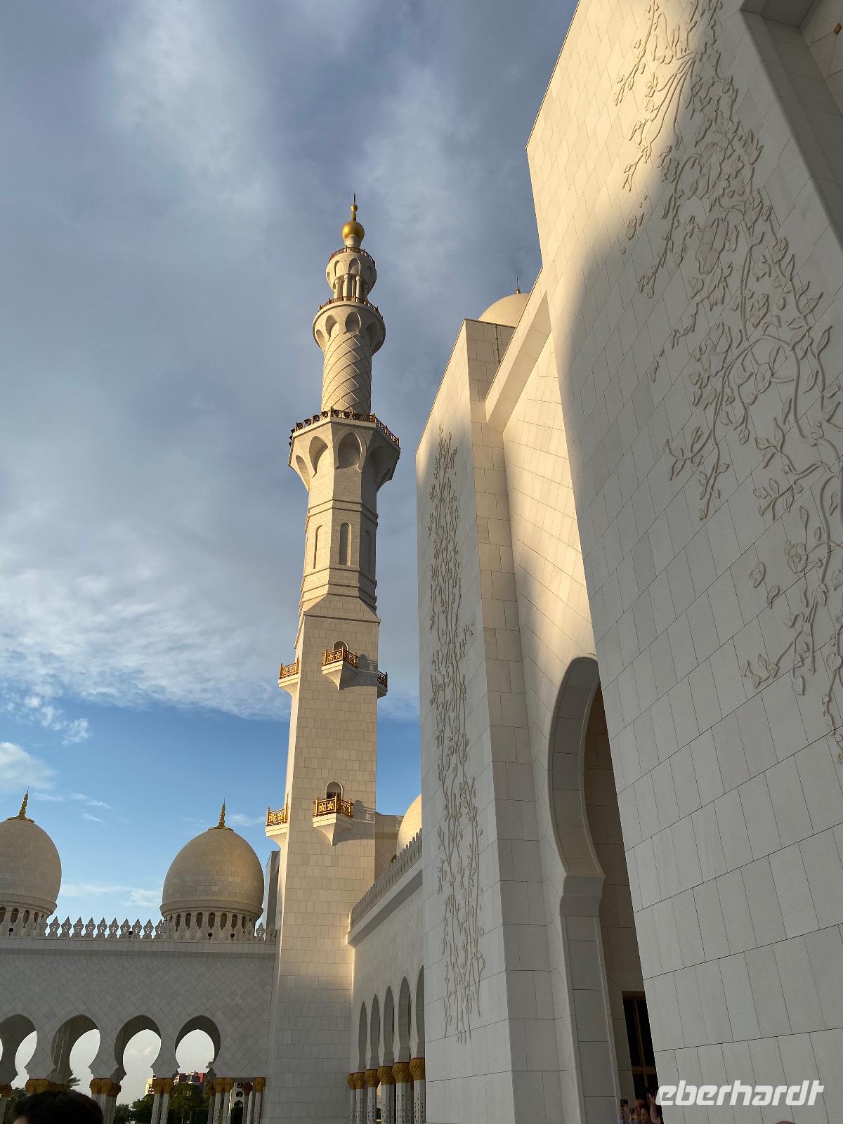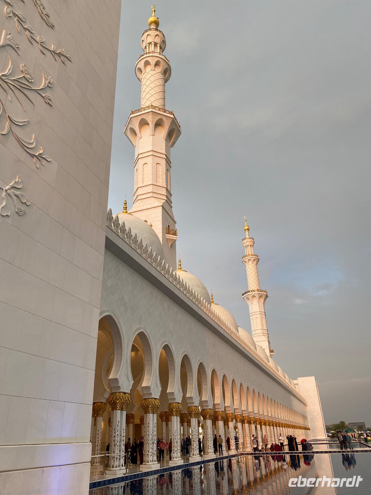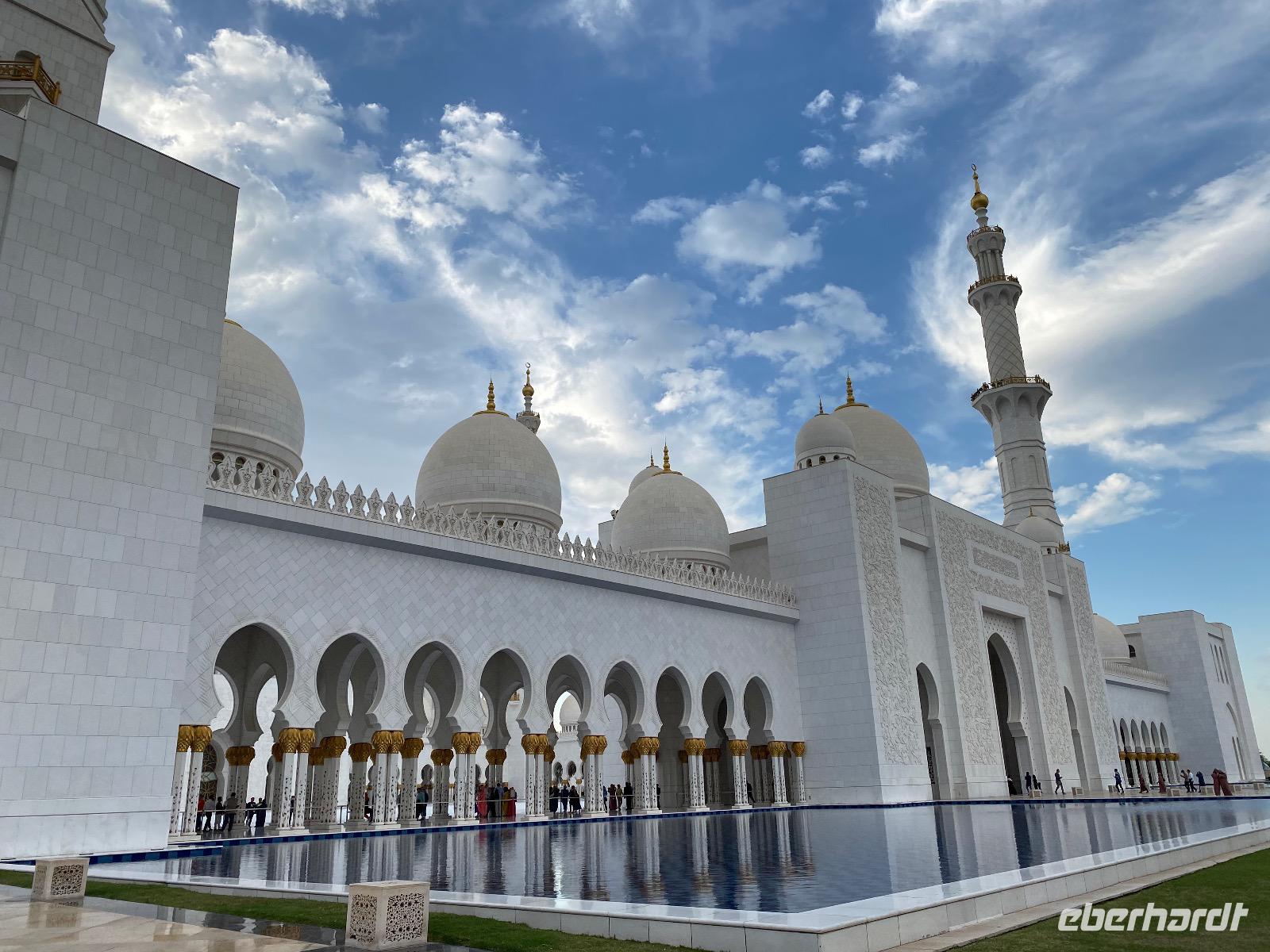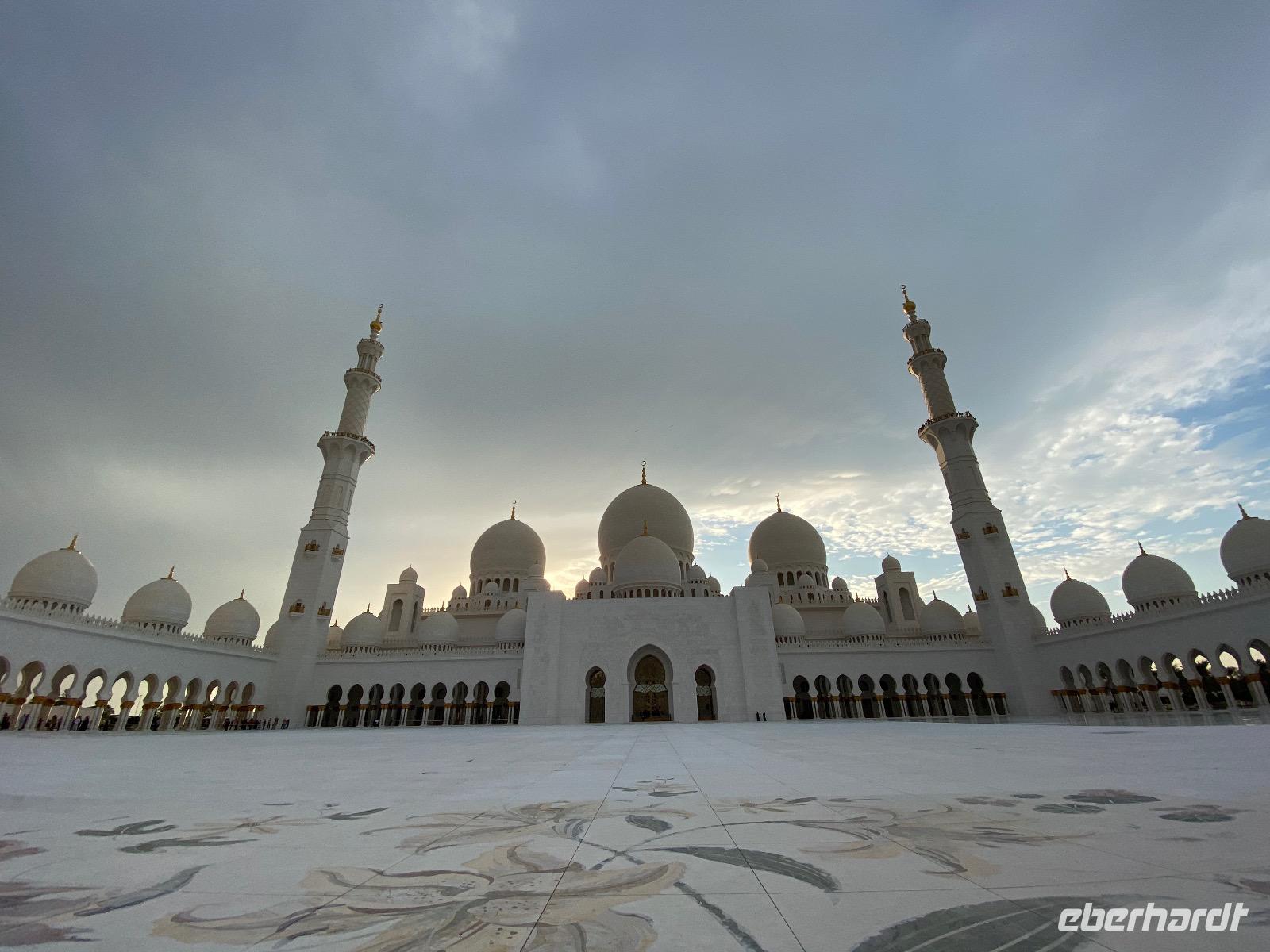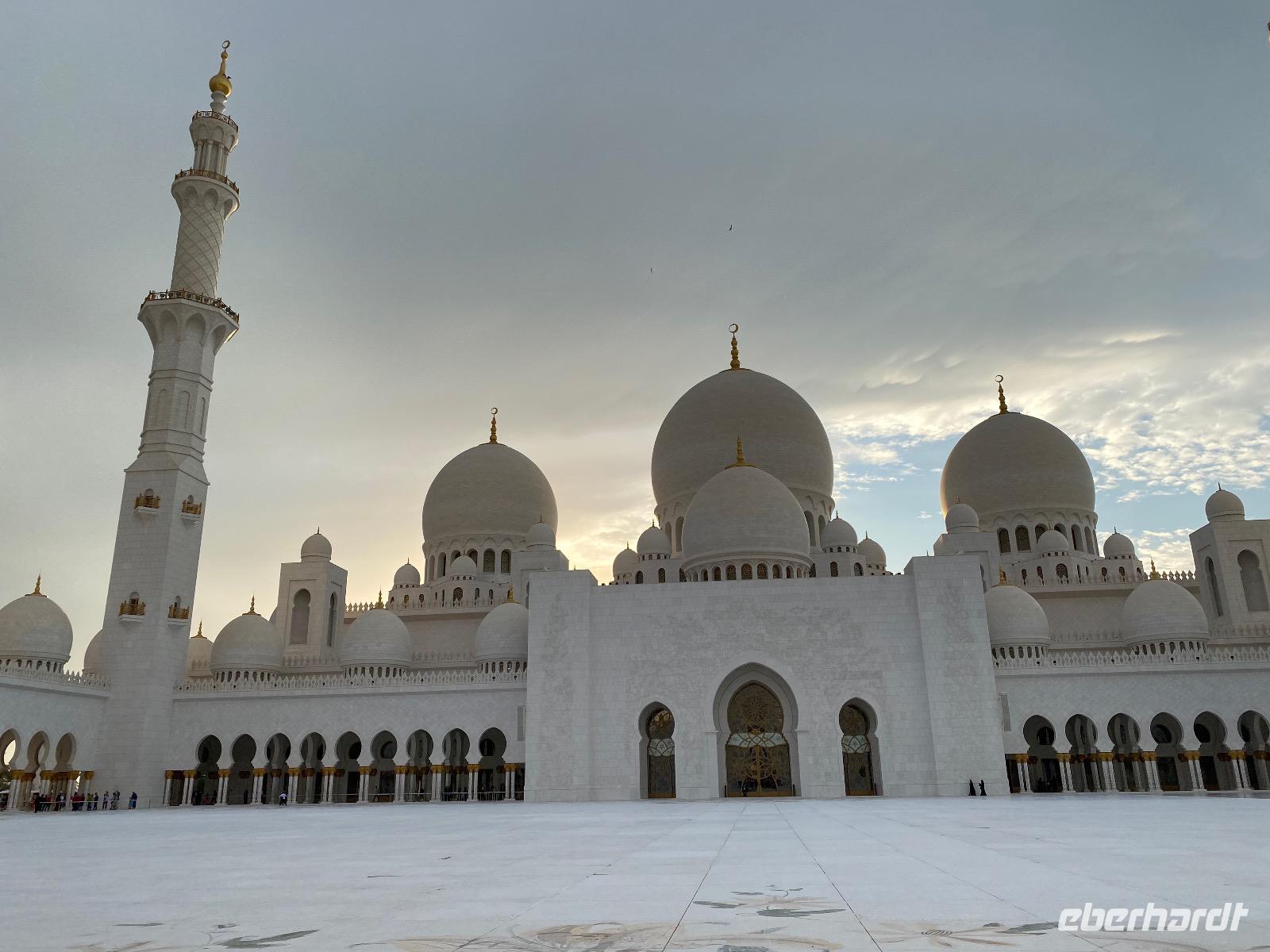 Schließlich erreichten wir die Große Moschee von Abu Dhabi, die Scheich Zayed Moschee. Diese ist die drittgrößte Moschee der Welt und bietet Platz für ca. 40.000 Gläubige. Um diese Moschee zu besuchen, mussten wir uns an besondere Kleidervorschriften halten, welche insbesondere für die Frauen hier gelten. So mussten bei den Damen Arme und Beine sowie auch der Kopf komplett bedeckt sein, lediglich Füße, Hände und Gesicht durften sichtbar sein. Nachdem wir uns entsprechend gekleidet hatten, durften wir die Moschee durch einen unterirdischen Gang betreten. Wir waren sofort beeindruckt von diesem gewaltigen Gebäude. Im Inneren fanden wir verschiedene Marmor-Sorten vor sowie zahlreiche Verzierungen aus Gold und Halbedelsteinen. Weiterhin bestaunten wir den riesigen handgeknüpften Teppich, welcher mit ca. 5.600 Quadratmetern Größe und einem Gewicht von ca. 47 Tonnen als der größte handgeknüpfte Teppich der Welt gilt. Wir schauten uns die verschiedenen Bereiche der Moschee an, bis schließlich zu Sonnenuntergang der Gebetsruf ertönte, welcher für uns gleichzeitig das Signal war, zurück zum Bus zu gehen. So bot sich uns zum Abschluss nochmal ein herrliches Motiv der Moschee - zunächst bei Sonnenuntergang sowie kurz darauf wunderschön beleuchtet. Mit vielen neuen Eindrücken und weiteren Superlativen begaben wir uns schließlich zurück nach Dubai, wo wir am Abend unser Hotel erreichten.