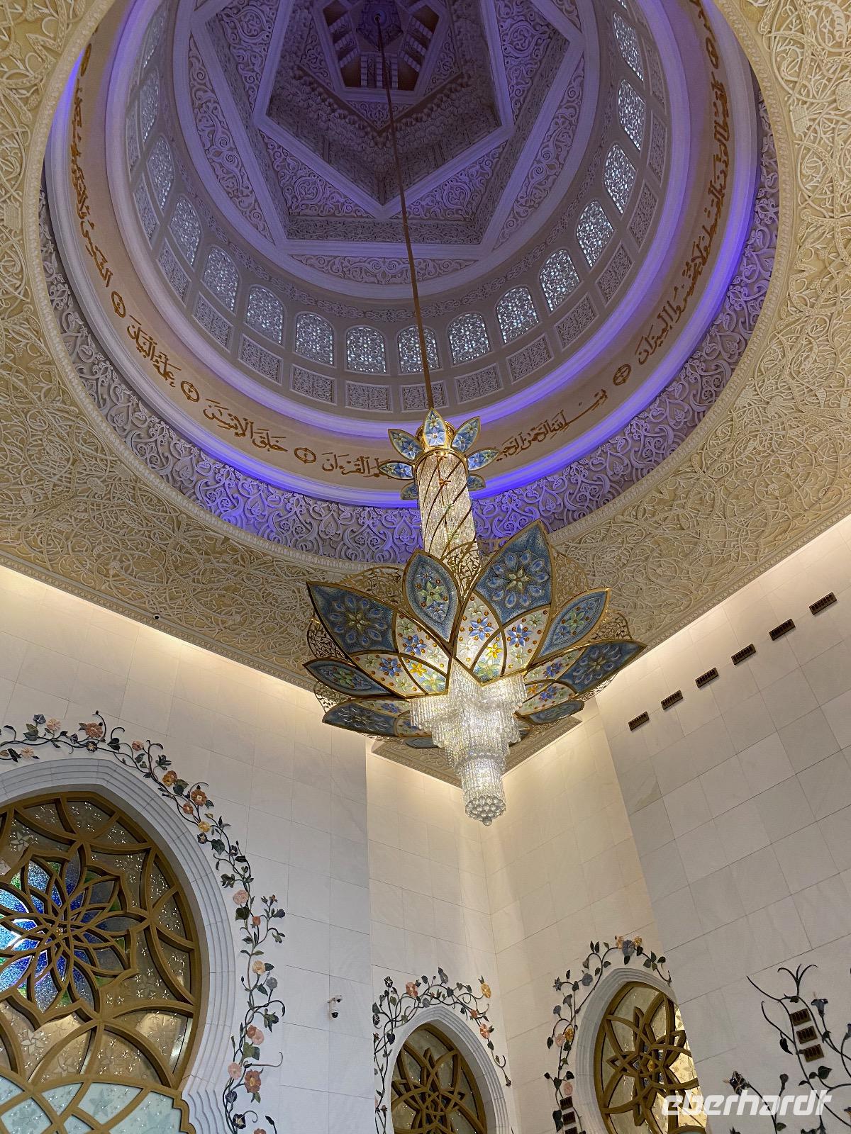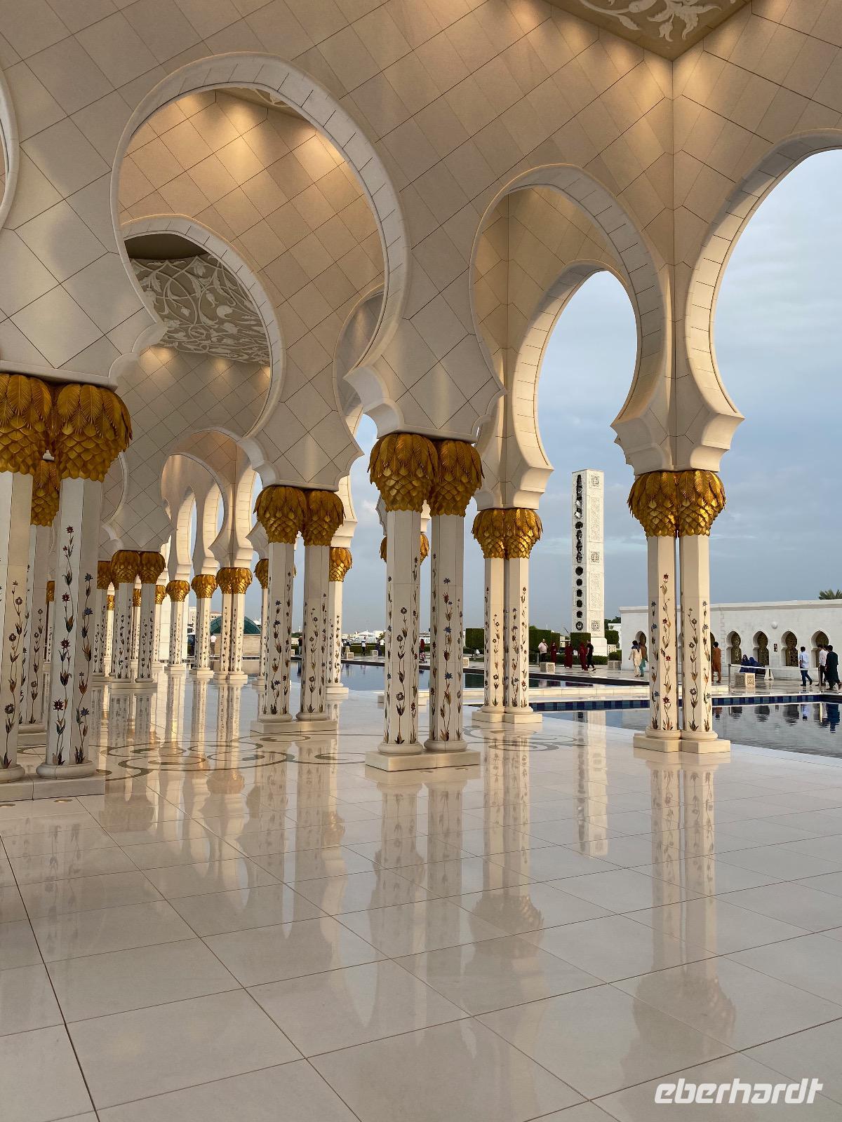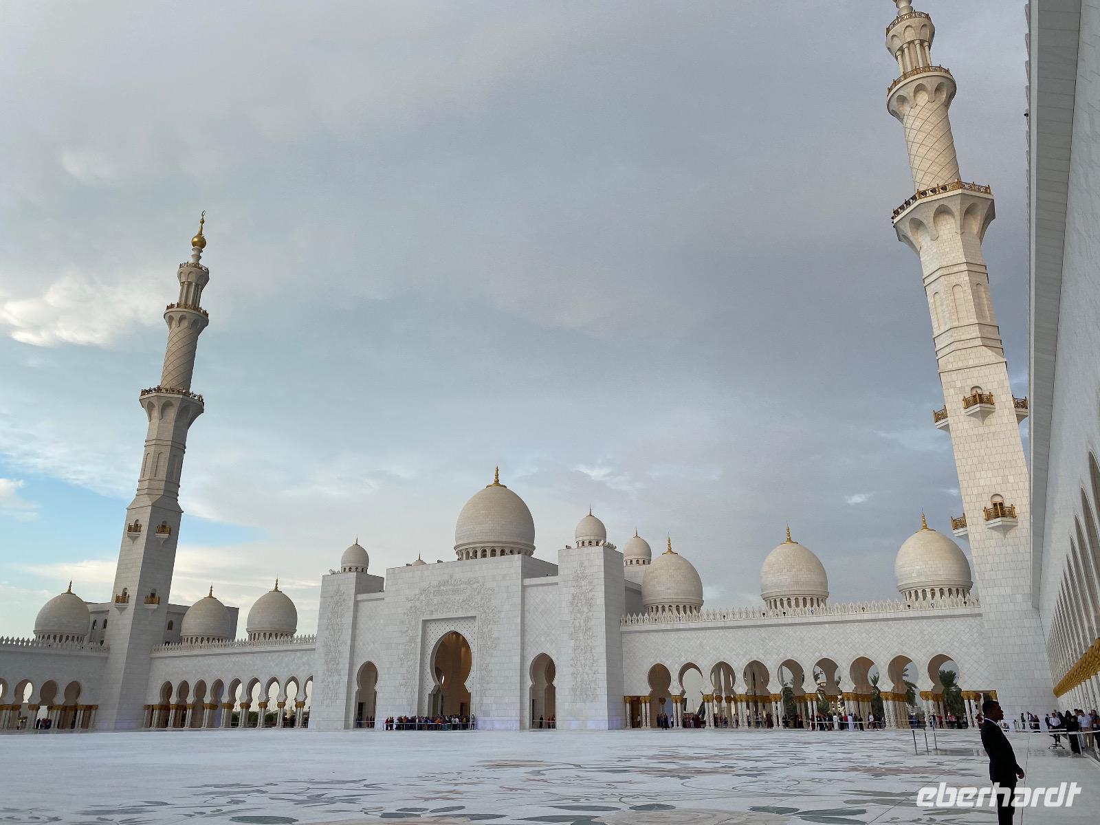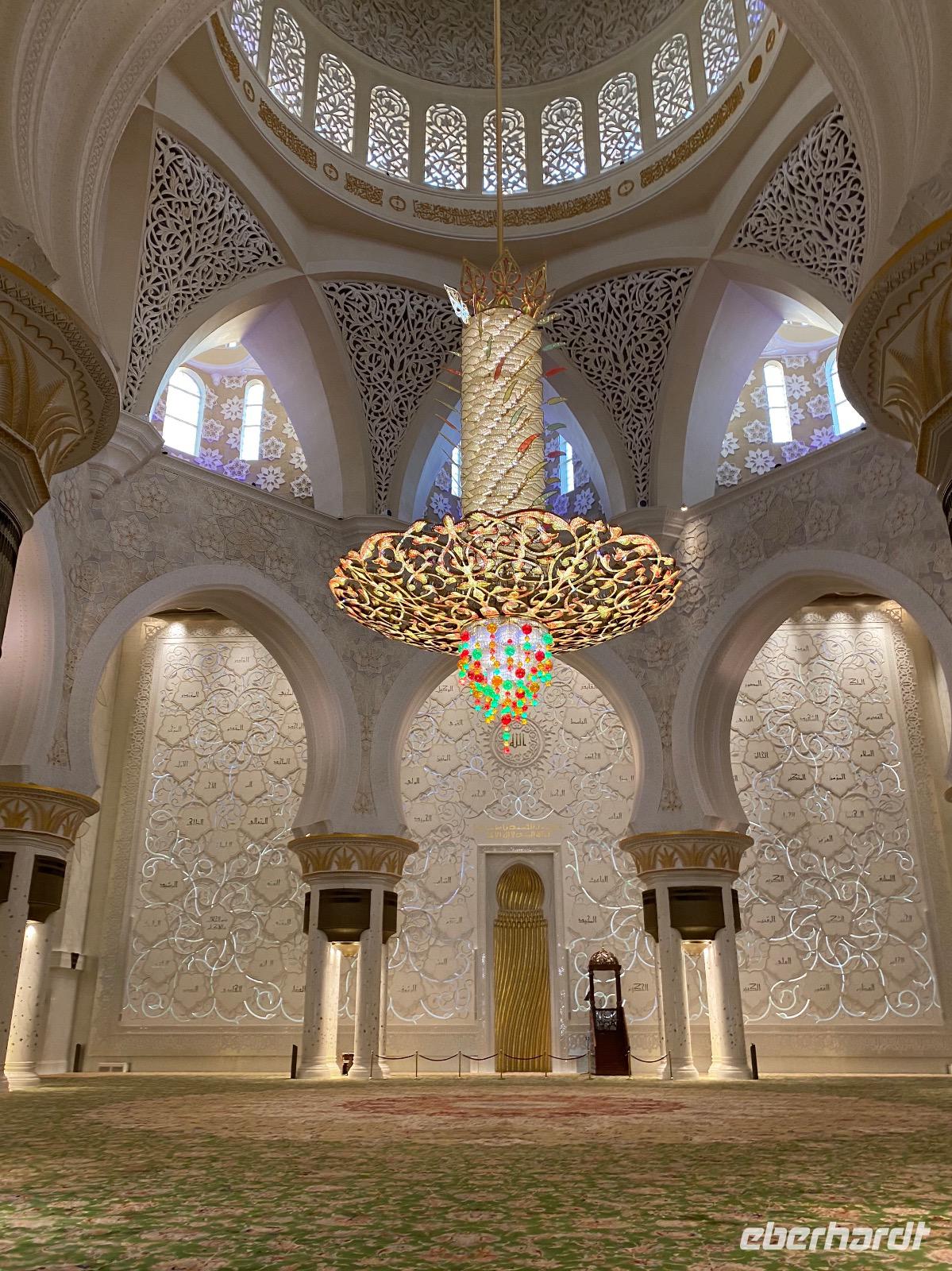 Schließlich erreichten wir die Große Moschee von Abu Dhabi, die Scheich Zayed Moschee. Diese ist die drittgrößte Moschee der Welt und bietet Platz für ca. 40.000 Gläubige. Um diese Moschee zu besuchen, mussten wir uns an besondere Kleidervorschriften halten, welche insbesondere für die Frauen hier gelten. So mussten bei den Damen Arme und Beine sowie auch der Kopf komplett bedeckt sein, lediglich Füße, Hände und Gesicht durften sichtbar sein. Nachdem wir uns entsprechend gekleidet hatten, durften wir die Moschee durch einen unterirdischen Gang betreten. Wir waren sofort beeindruckt von diesem gewaltigen Gebäude. Im Inneren fanden wir verschiedene Marmor-Sorten vor sowie zahlreiche Verzierungen aus Gold und Halbedelsteinen. Weiterhin bestaunten wir den riesigen handgeknüpften Teppich, welcher mit ca. 5.600 Quadratmetern Größe und einem Gewicht von ca. 47 Tonnen als der größte handgeknüpfte Teppich der Welt gilt. Wir schauten uns die verschiedenen Bereiche der Moschee an, bis schließlich zu Sonnenuntergang der Gebetsruf ertönte, welcher für uns gleichzeitig das Signal war, zurück zum Bus zu gehen. So bot sich uns zum Abschluss nochmal ein herrliches Motiv der Moschee - zunächst bei Sonnenuntergang sowie kurz darauf wunderschön beleuchtet. Mit vielen neuen Eindrücken und weiteren Superlativen begaben wir uns schließlich zurück nach Dubai, wo wir am Abend unser Hotel erreichten.