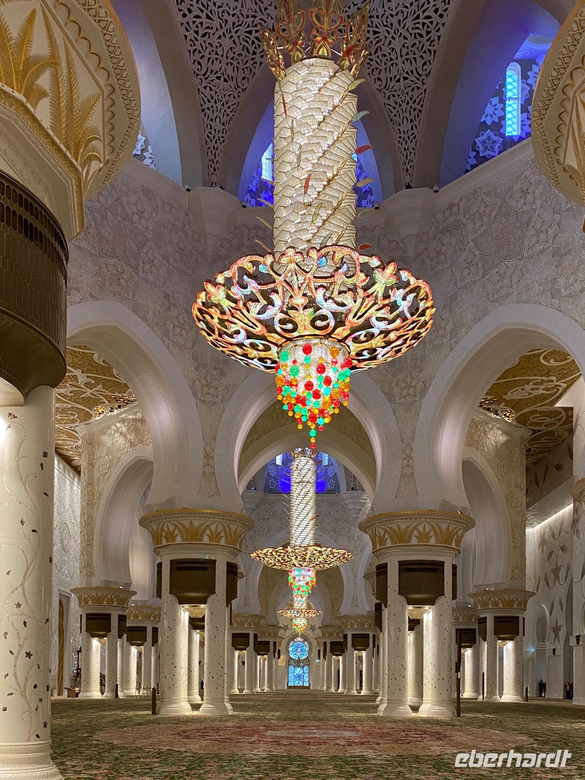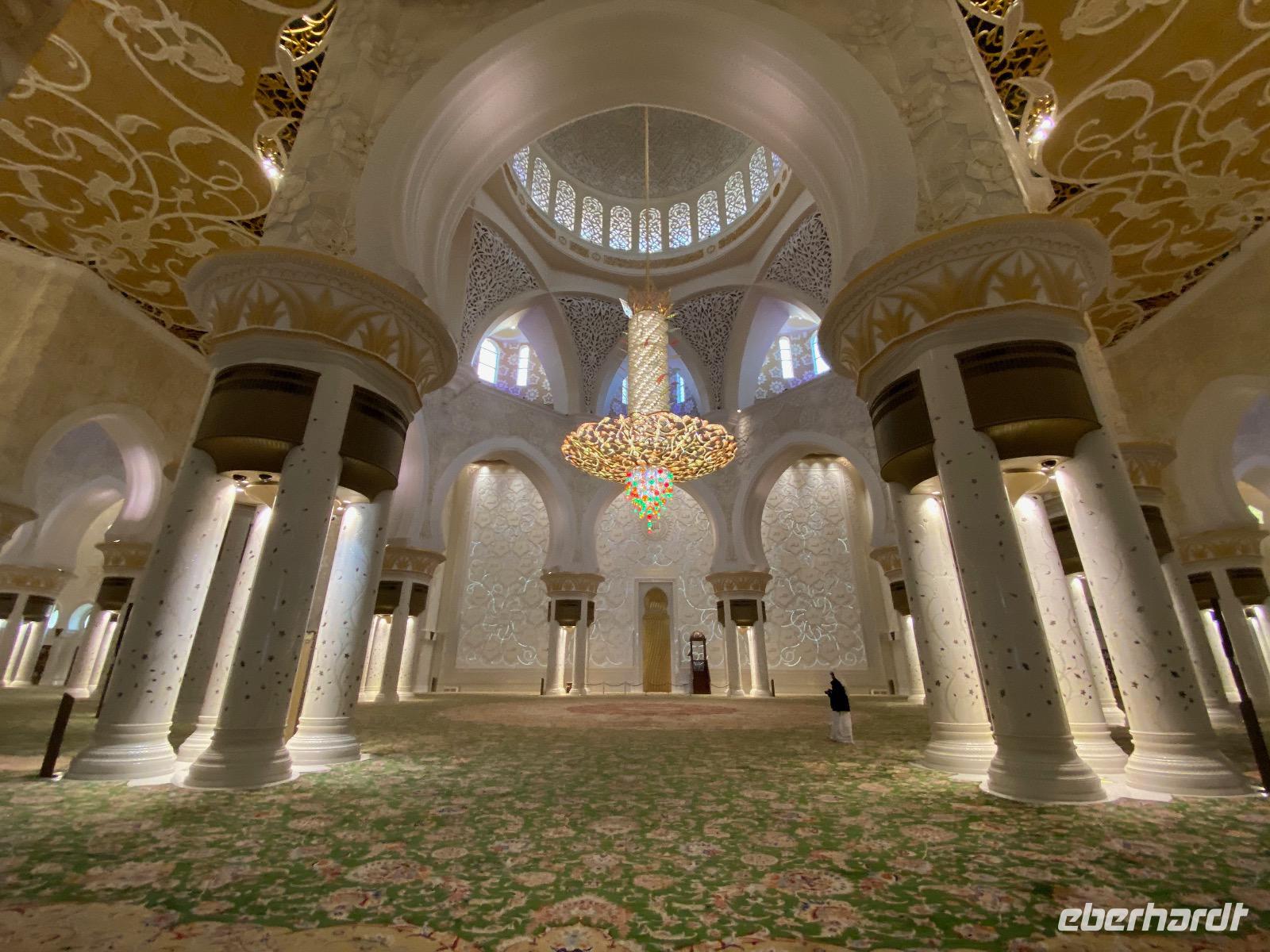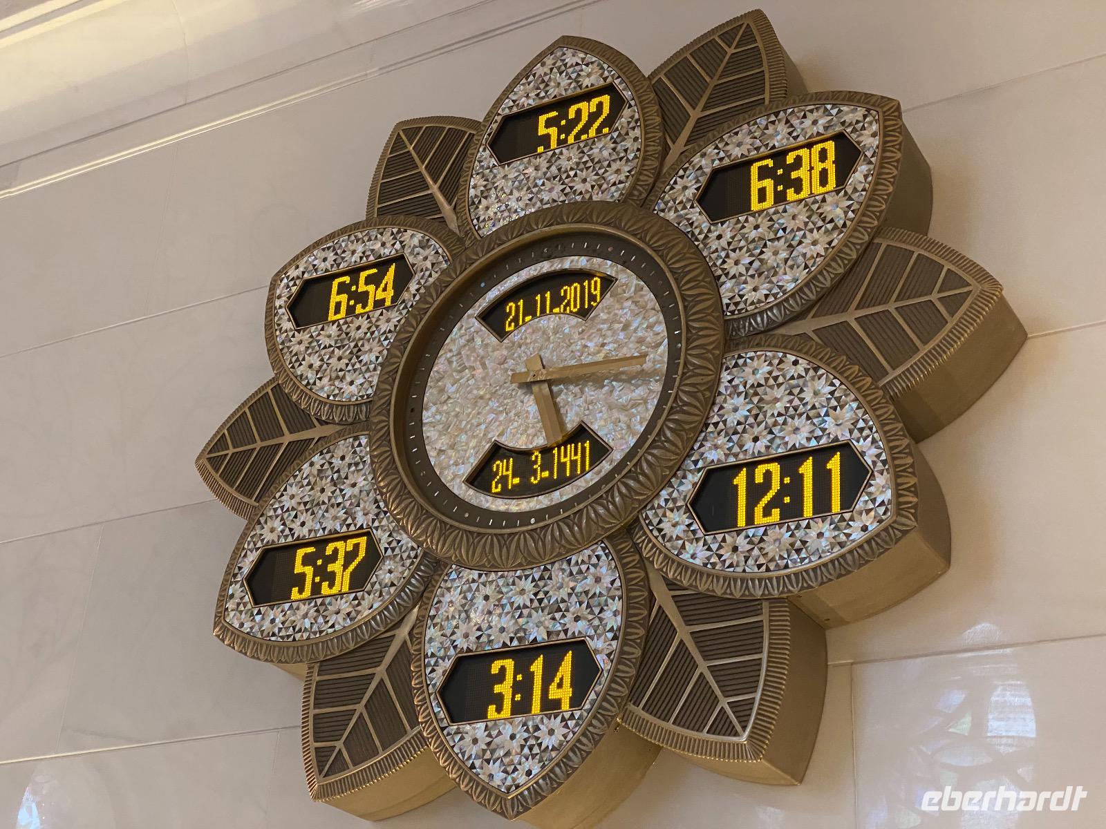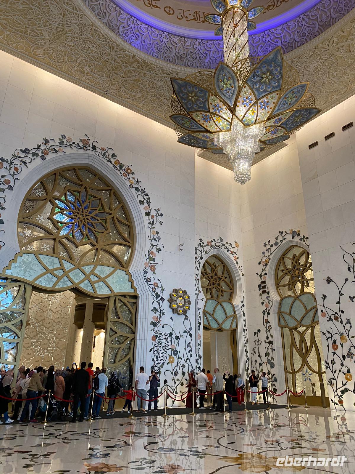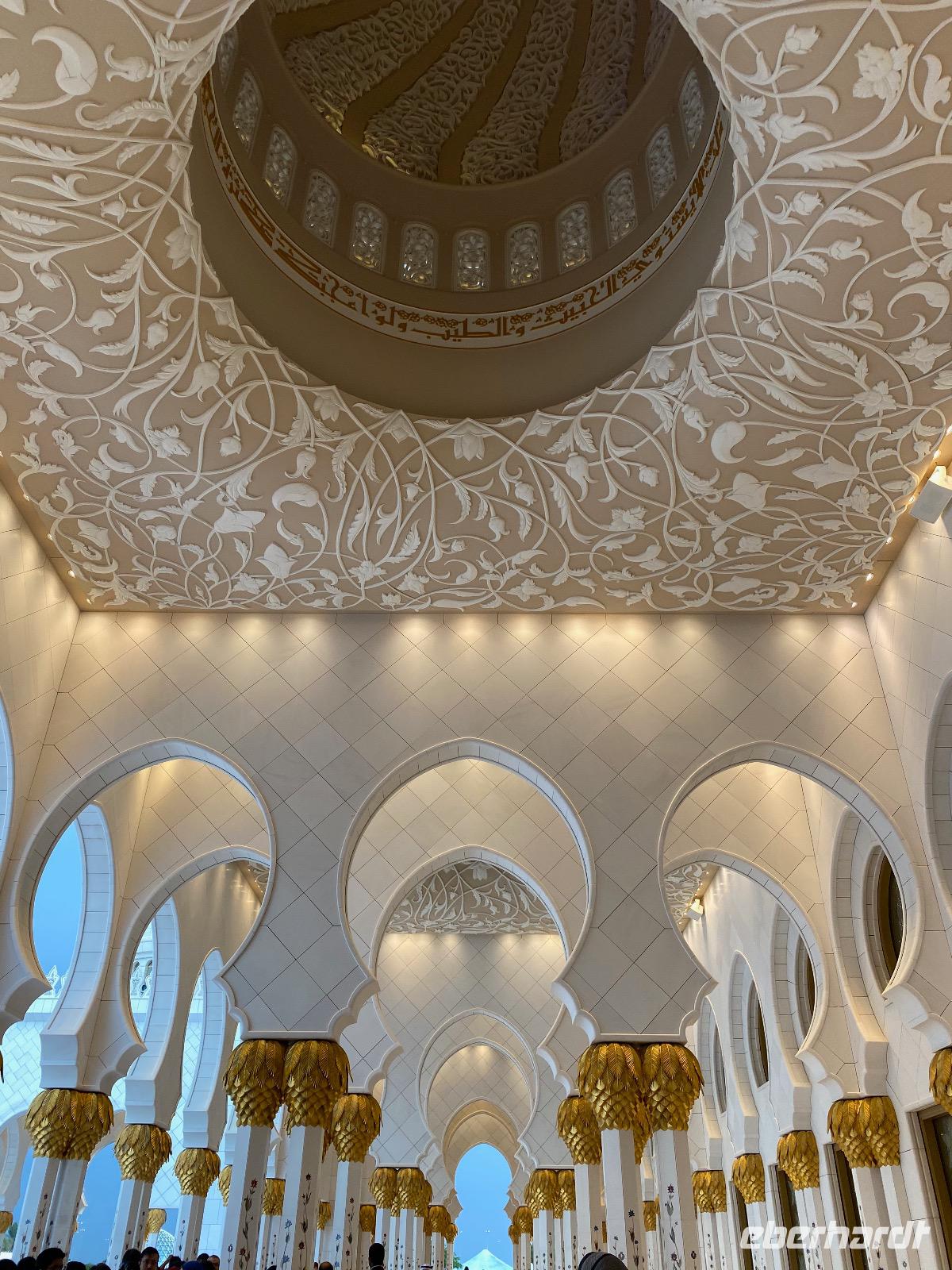 Schließlich erreichten wir die Große Moschee von Abu Dhabi, die Scheich Zayed Moschee. Diese ist die drittgrößte Moschee der Welt und bietet Platz für ca. 40.000 Gläubige. Um diese Moschee zu besuchen, mussten wir uns an besondere Kleidervorschriften halten, welche insbesondere für die Frauen hier gelten. So mussten bei den Damen Arme und Beine sowie auch der Kopf komplett bedeckt sein, lediglich Füße, Hände und Gesicht durften sichtbar sein. Nachdem wir uns entsprechend gekleidet hatten, durften wir die Moschee durch einen unterirdischen Gang betreten. Wir waren sofort beeindruckt von diesem gewaltigen Gebäude. Im Inneren fanden wir verschiedene Marmor-Sorten vor sowie zahlreiche Verzierungen aus Gold und Halbedelsteinen. Weiterhin bestaunten wir den riesigen handgeknüpften Teppich, welcher mit ca. 5.600 Quadratmetern Größe und einem Gewicht von ca. 47 Tonnen als der größte handgeknüpfte Teppich der Welt gilt. Wir schauten uns die verschiedenen Bereiche der Moschee an, bis schließlich zu Sonnenuntergang der Gebetsruf ertönte, welcher für uns gleichzeitig das Signal war, zurück zum Bus zu gehen. So bot sich uns zum Abschluss nochmal ein herrliches Motiv der Moschee - zunächst bei Sonnenuntergang sowie kurz darauf wunderschön beleuchtet. Mit vielen neuen Eindrücken und weiteren Superlativen begaben wir uns schließlich zurück nach Dubai, wo wir am Abend unser Hotel erreichten.