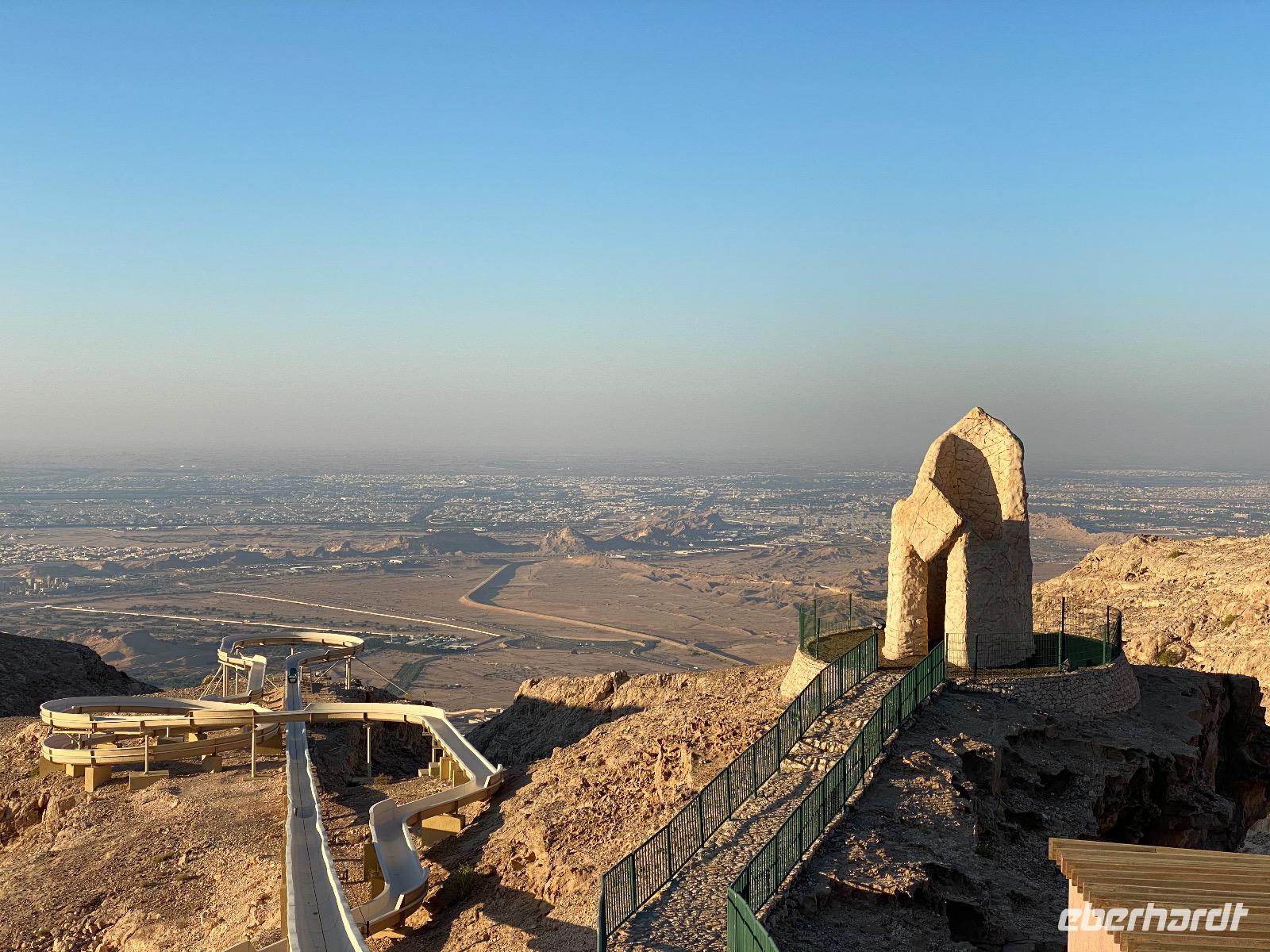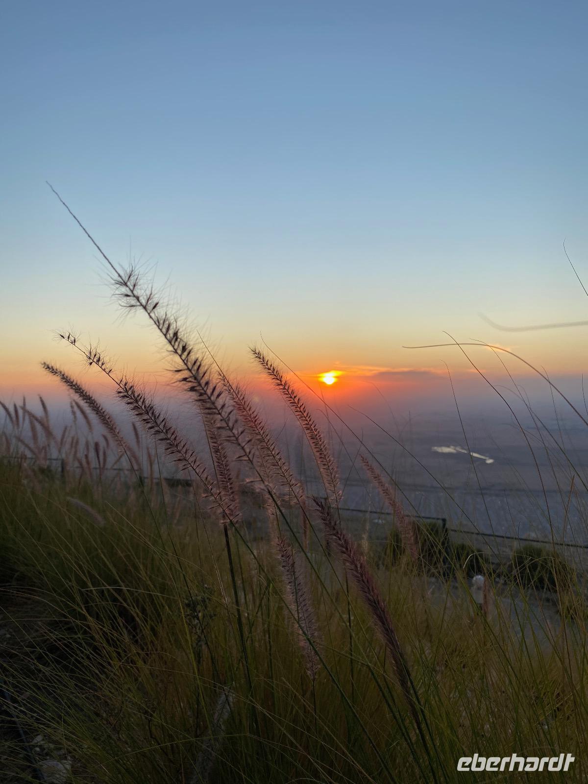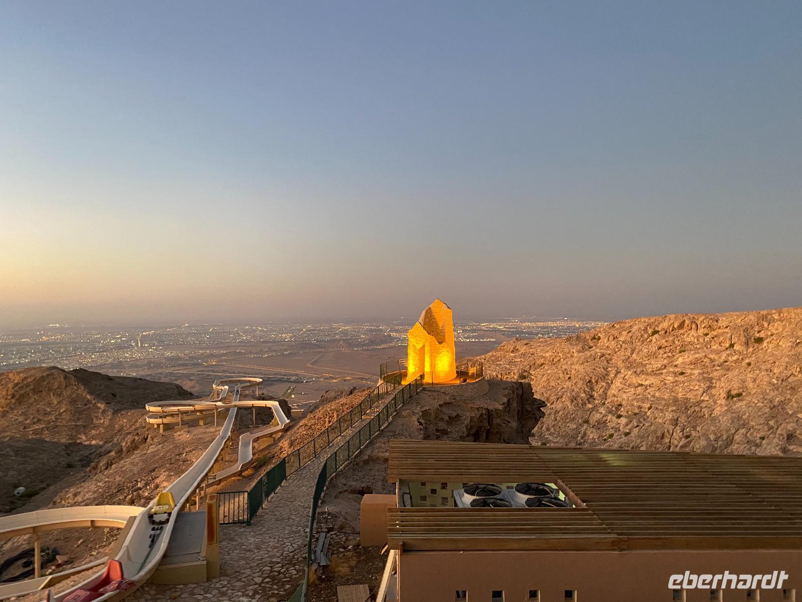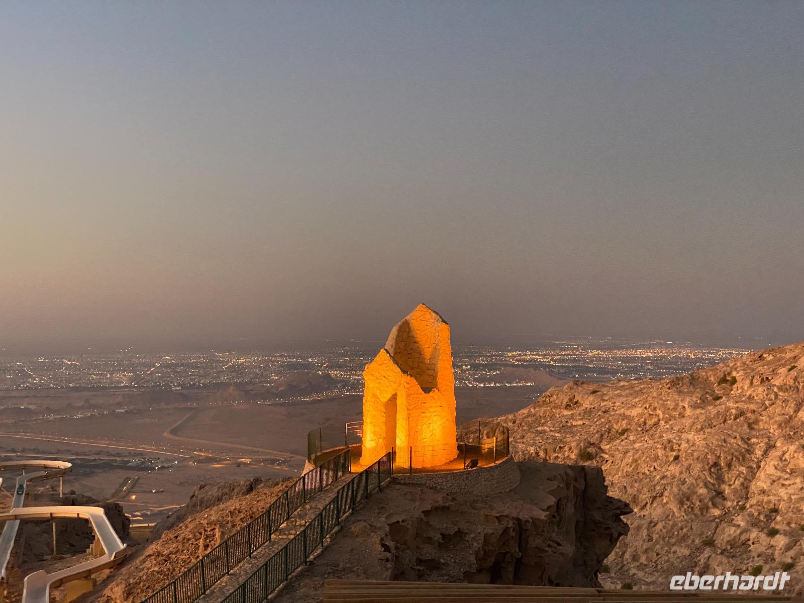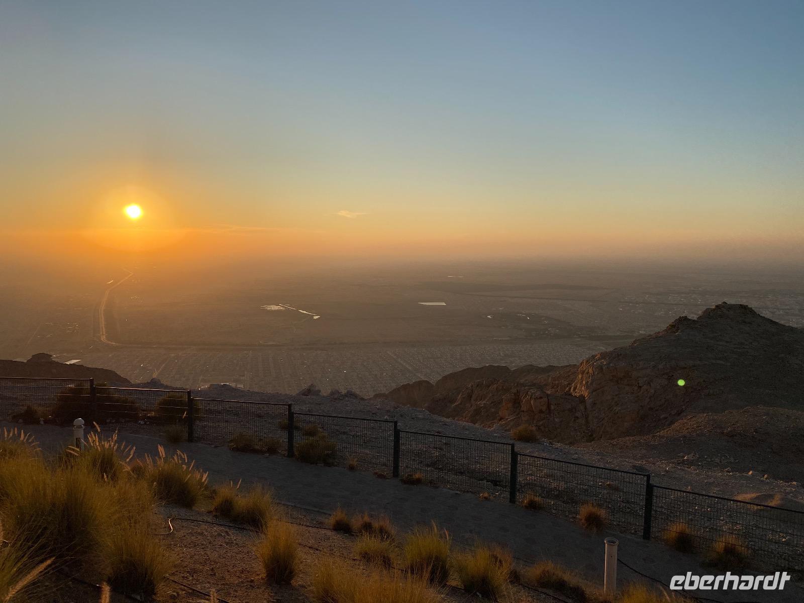 Anschließend ging es noch zum Jebel Hafeet, welcher mit 1.240 Metern der höchste Punkt der Emirate ist. Auf einer engen, kurvigen Straße fuhren wir nach oben, wo uns sofort etwas andere Temperaturen erwarteten. Es wehte ein etwas kühler Wind und wir waren froh, unsere Jacken dabei zu haben. Von der Terrasse des Mercure Hotels genossen wir einen wunderschönen Blick auf die Umgebung. Dazu erwartete uns ein Grill-Buffet, sodass wir unsere Reise bei einem leckeren Essen mit einmaligem Ausblick ausklingen lassen konnten. Bald ging auch schon die Sonne unter, was uns noch einmal tolle Fotomotive bescherte. Satt und zufrieden begaben wir uns schließlich zurück zum Bus und fuhren wieder nach Dubai zu unserem Hotel. Hier konnten wir zunächst alle noch einmal auf unsere Zimmer gehen und die letzten Sachen zusammenpacken.
