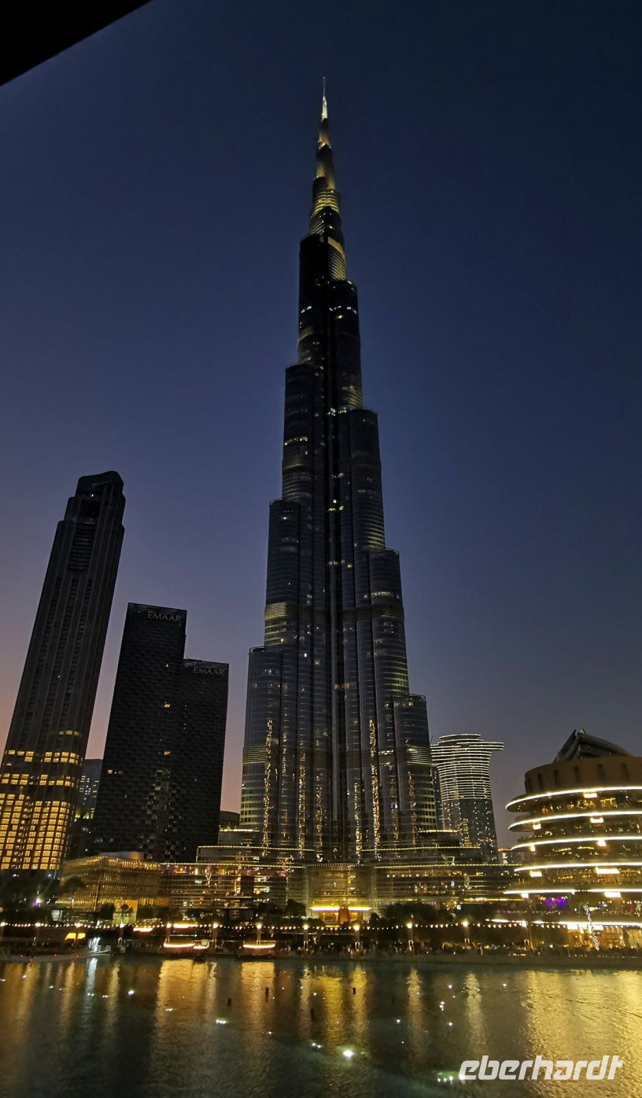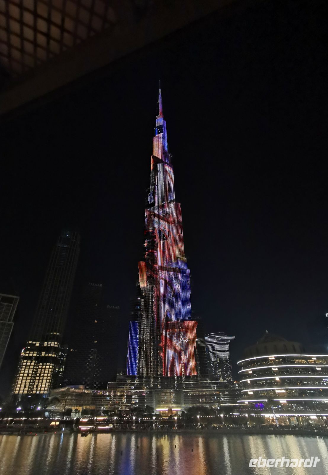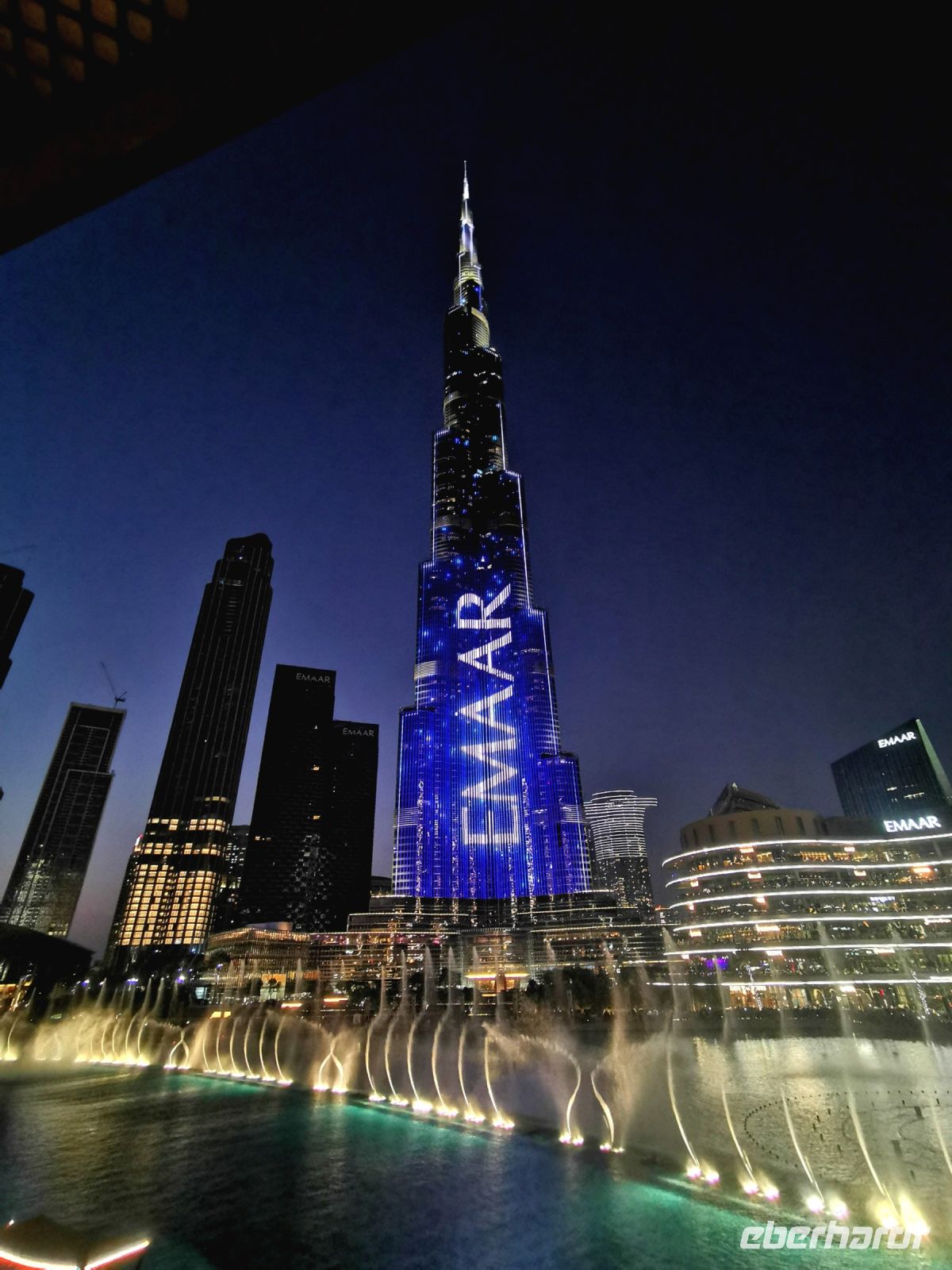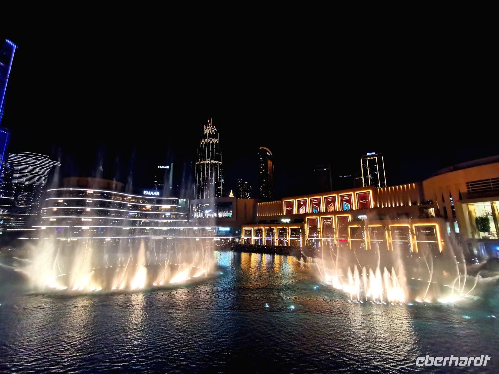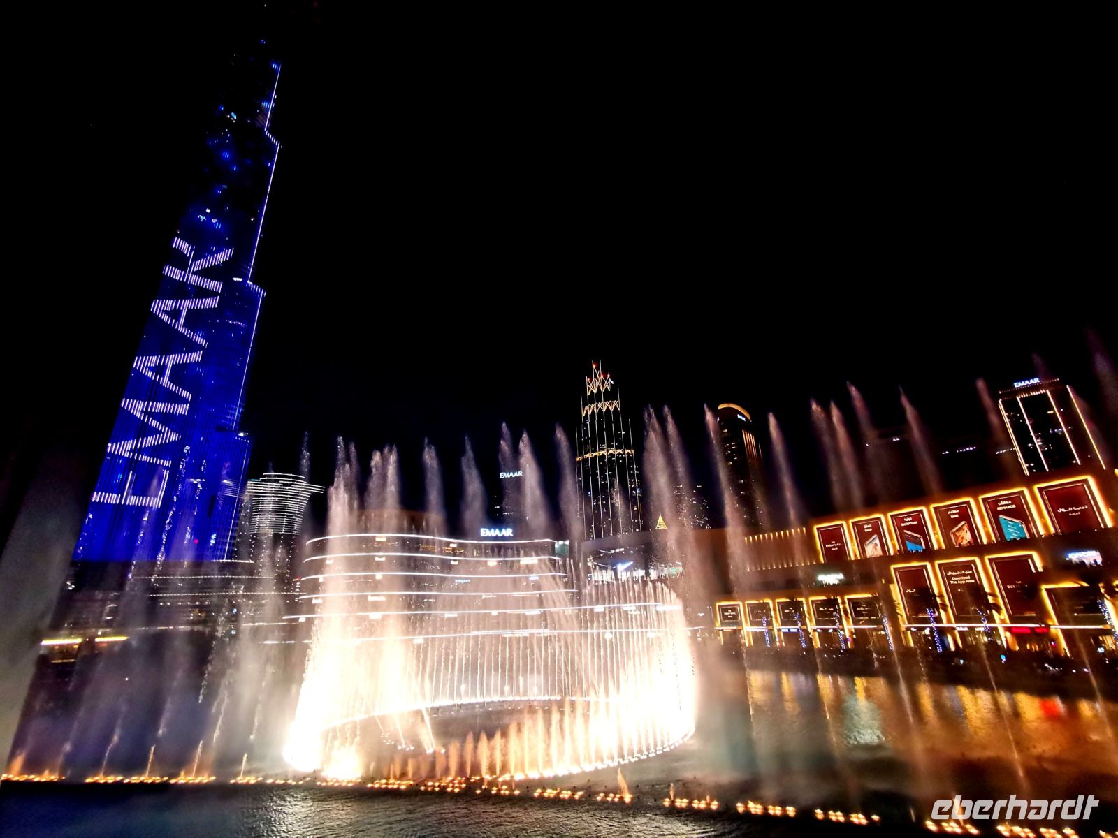 Am frühen Abend, pünktlich zum Beginn der Wasserspiele am Fuße des Burj Khalifa, treffen wir uns alle wieder und gehen gemeinsam zum Abendessen ins Restaurant Abdel Wahab. Auf der Terrasse speisen wir nicht nur vorzüglich und üppig sondern haben hier als I-Tüpfelchen einen Traumblick auf die Wasserspiele, die jeden Abend um 18 Uhr beginnen und bis spät in die Nacht andauern. Das Wasser schießt alle 30 Minuten im Takt der Musik aus verschiedenen Fontänen bis zu 150 Meter hoch in die Luft und die Gäste sind fasziniert von diesem Spektakel. Dahinter trohnt majestätisch der Burj Khalifa und bei einer der Shows wird er komplett von Laseranimationen verwandelt. Eigentlich könnte man sich nur auf diese Show konzentrieren, wäre da nicht das überaus leckere Essen ... Ein ein fantastischer Tag mit unglaublichen Eindrücken aus der Glitzerwelt dieser Stadt am Golf geht zu Ende.