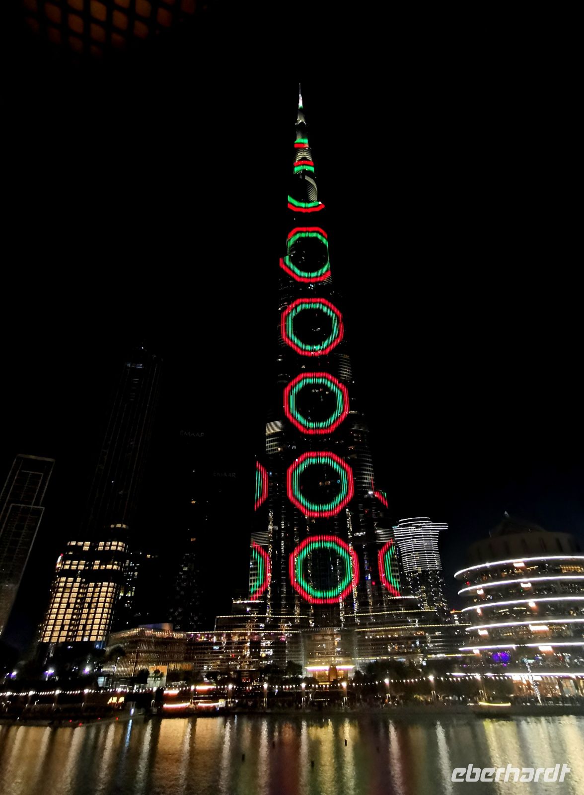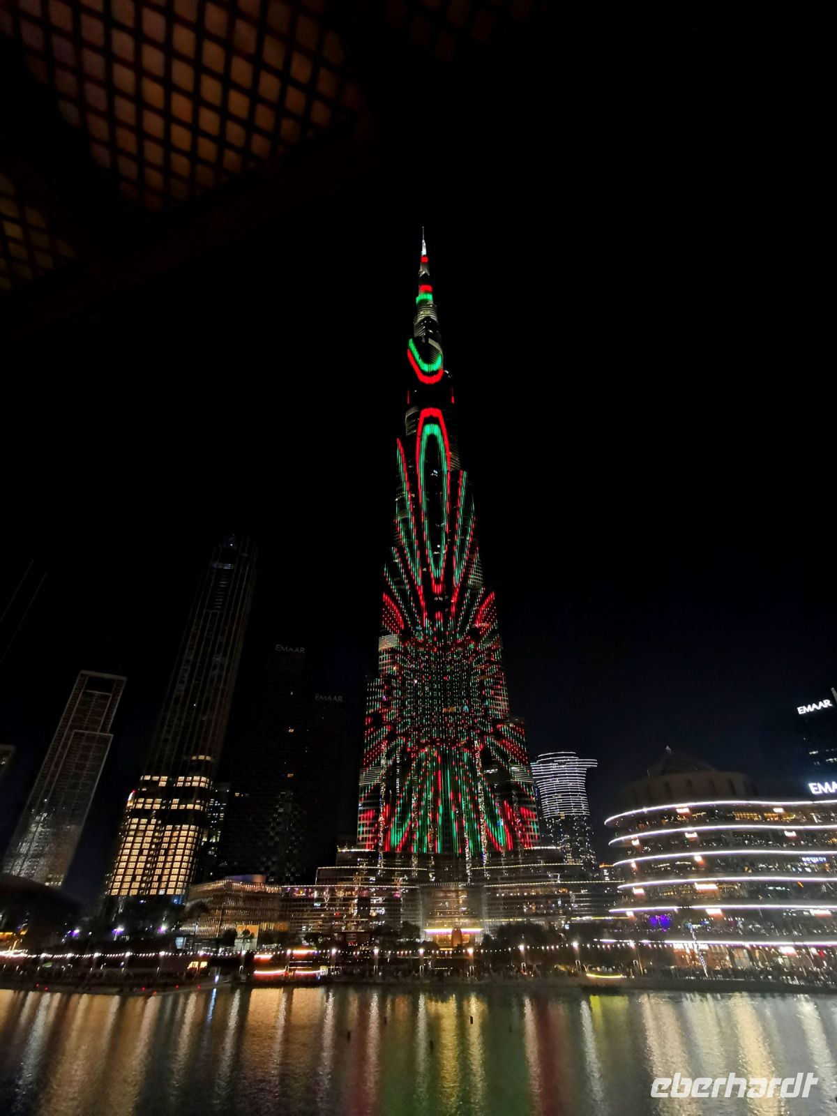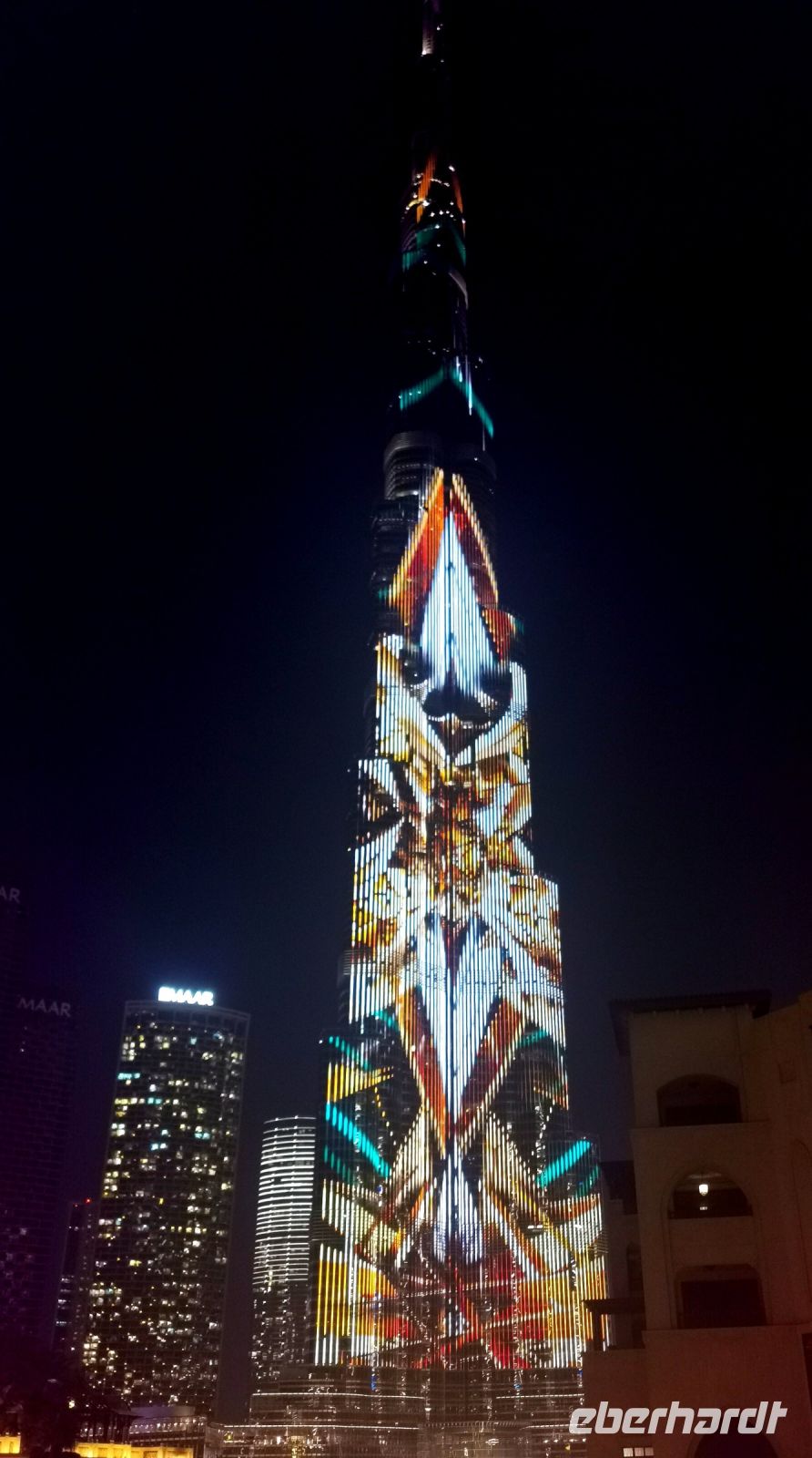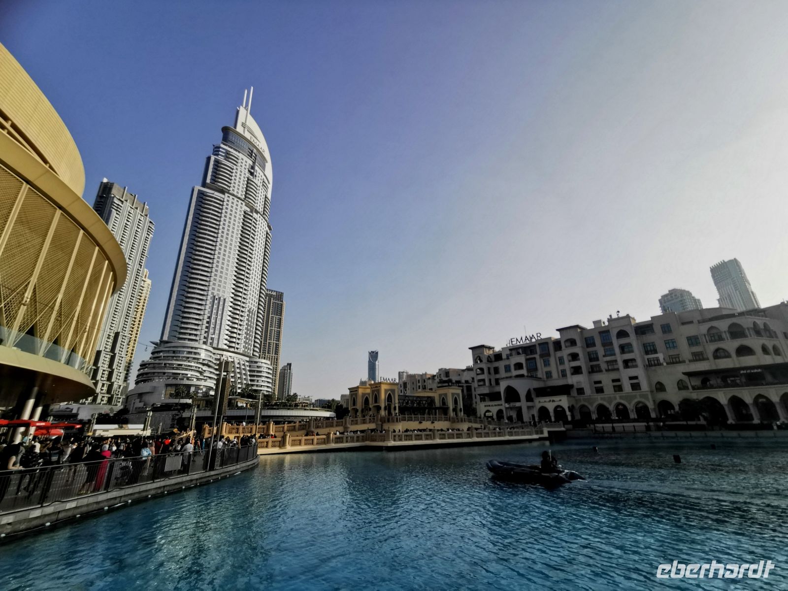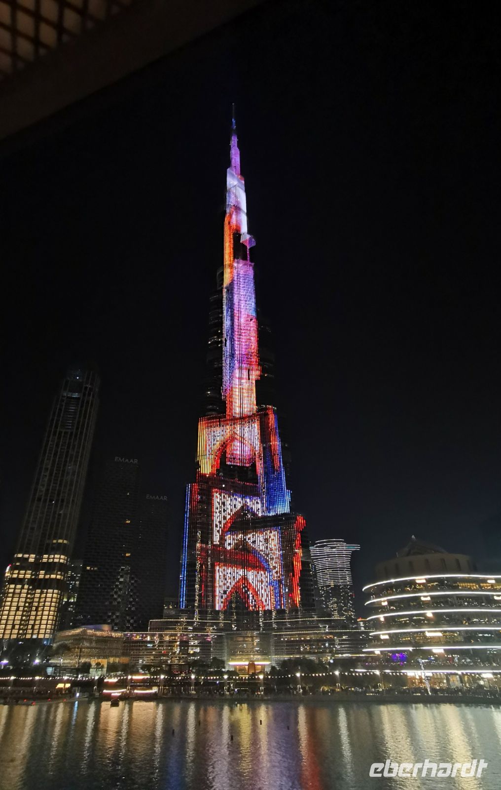 Am frühen Abend, pünktlich zum Beginn der Wasserspiele am Fuße des Burj Khalifa, treffen wir uns alle wieder und gehen gemeinsam zum Abendessen ins Restaurant Abdel Wahab. Auf der Terrasse speisen wir nicht nur vorzüglich und üppig sondern haben hier als I-Tüpfelchen einen Traumblick auf die Wasserspiele, die jeden Abend um 18 Uhr beginnen und bis spät in die Nacht andauern. Das Wasser schießt alle 30 Minuten im Takt der Musik aus verschiedenen Fontänen bis zu 150 Meter hoch in die Luft und die Gäste sind fasziniert von diesem Spektakel. Dahinter trohnt majestätisch der Burj Khalifa und bei einer der Shows wird er komplett von Laseranimationen verwandelt. Eigentlich könnte man sich nur auf diese Show konzentrieren, wäre da nicht das überaus leckere Essen ... Ein ein fantastischer Tag mit unglaublichen Eindrücken aus der Glitzerwelt dieser Stadt am Golf geht zu Ende.