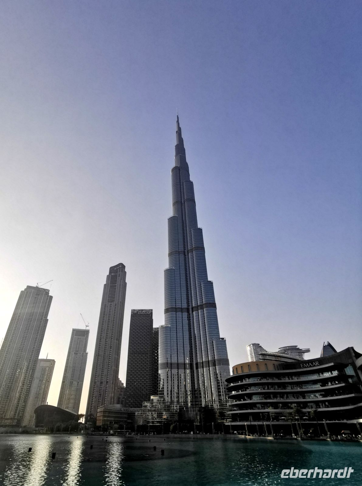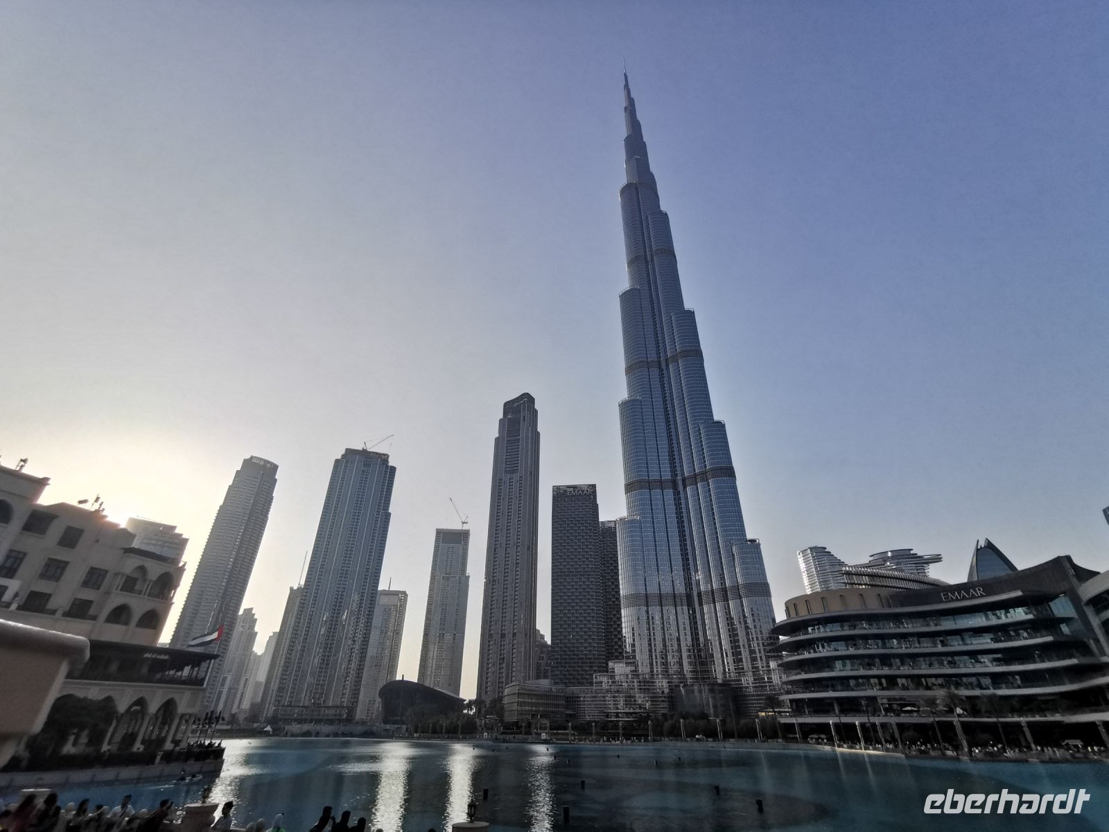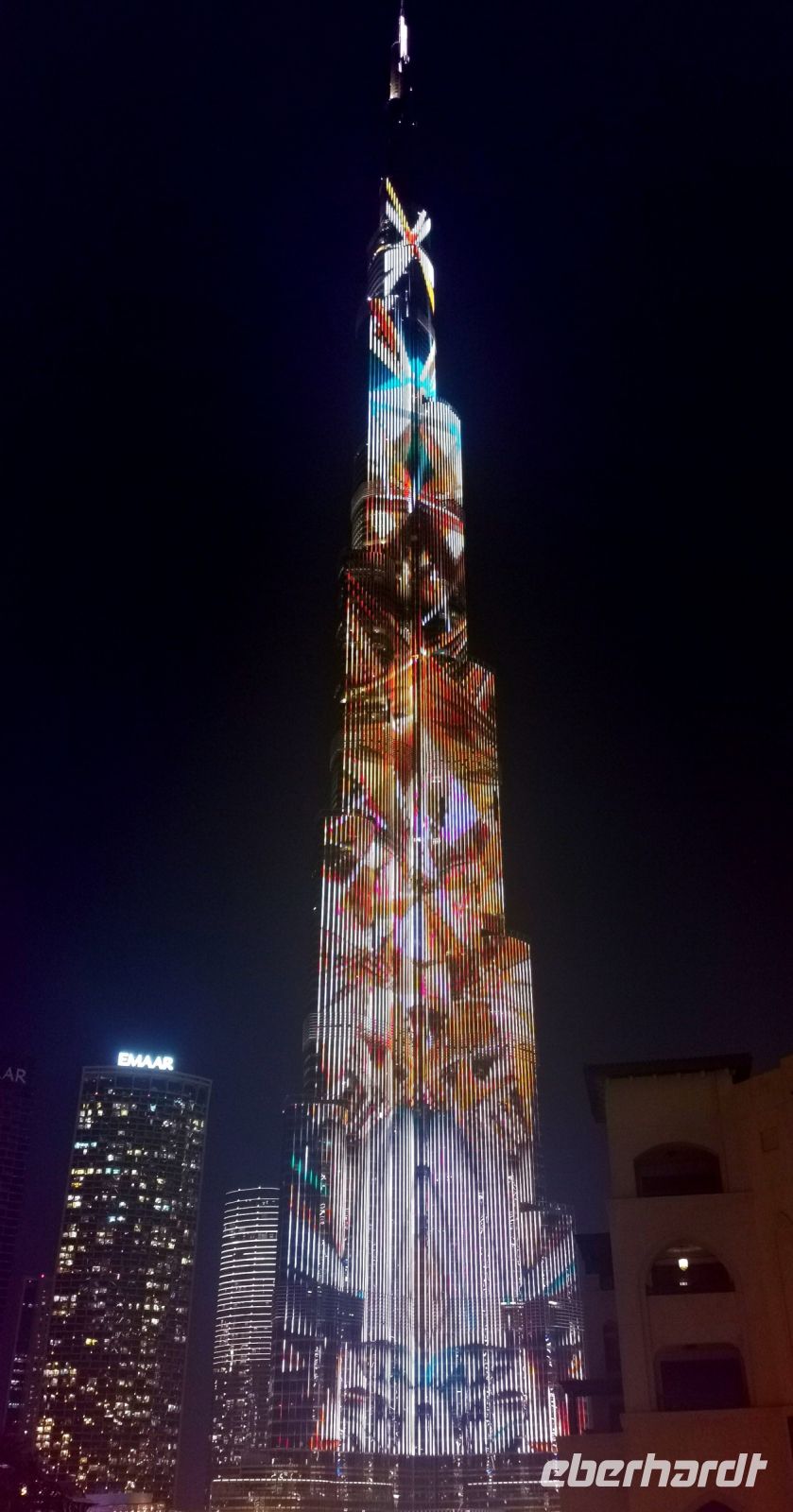 Dubai besteht ja förmlich nur aus Highlights und das nächste besuchen wir jetzt. Für viele Dubaibesucher ist es DER Höhepunkt schlechthin: die Fahrt mit dem Fahrstuhl auf die 124ste Etage des Burj Khalifa. Auf diesem 828 Meter hohen Turm kann man in zwei Etagen auf einer 360 Grad Plattform einen umwerfenden Blick auf ganz Dubai werfen, Kaffee trinken, Souvenirs erstehen und dieses Meisterwerk der Architektur bewundern und bestaunen. Weltweit besitzt der Turm die meisten Stockwerke und sein Bau hat gerade mal sechs Jahre gedauert! (Werden die Berliner hier etwa neidisch :-)) Im Anschluß an dieses Höhenerlebnis haben wir uns ein wenig Freizeit am Fuße des Giganten verdient und alle schwärmen aus für eine Pause, einen Kaffee oder um das ein oder andere Mitbringsel zu erwerben.