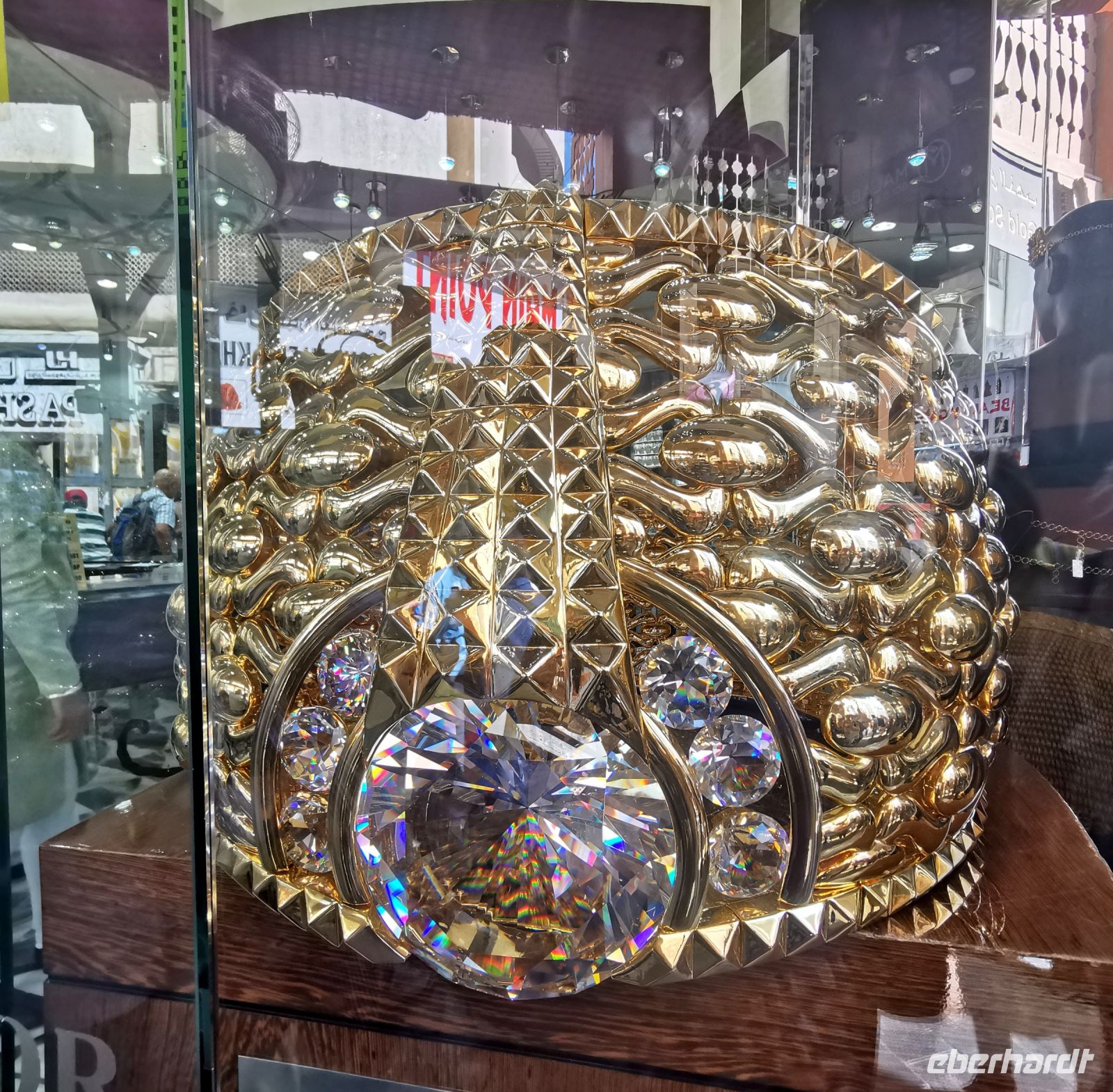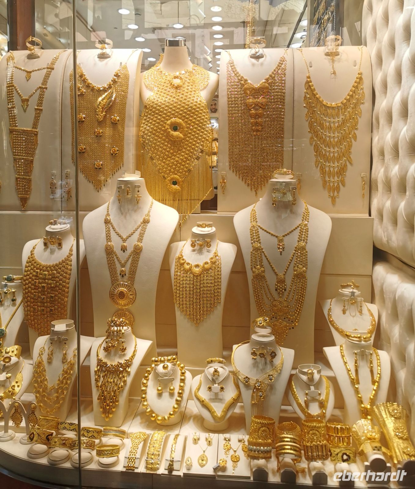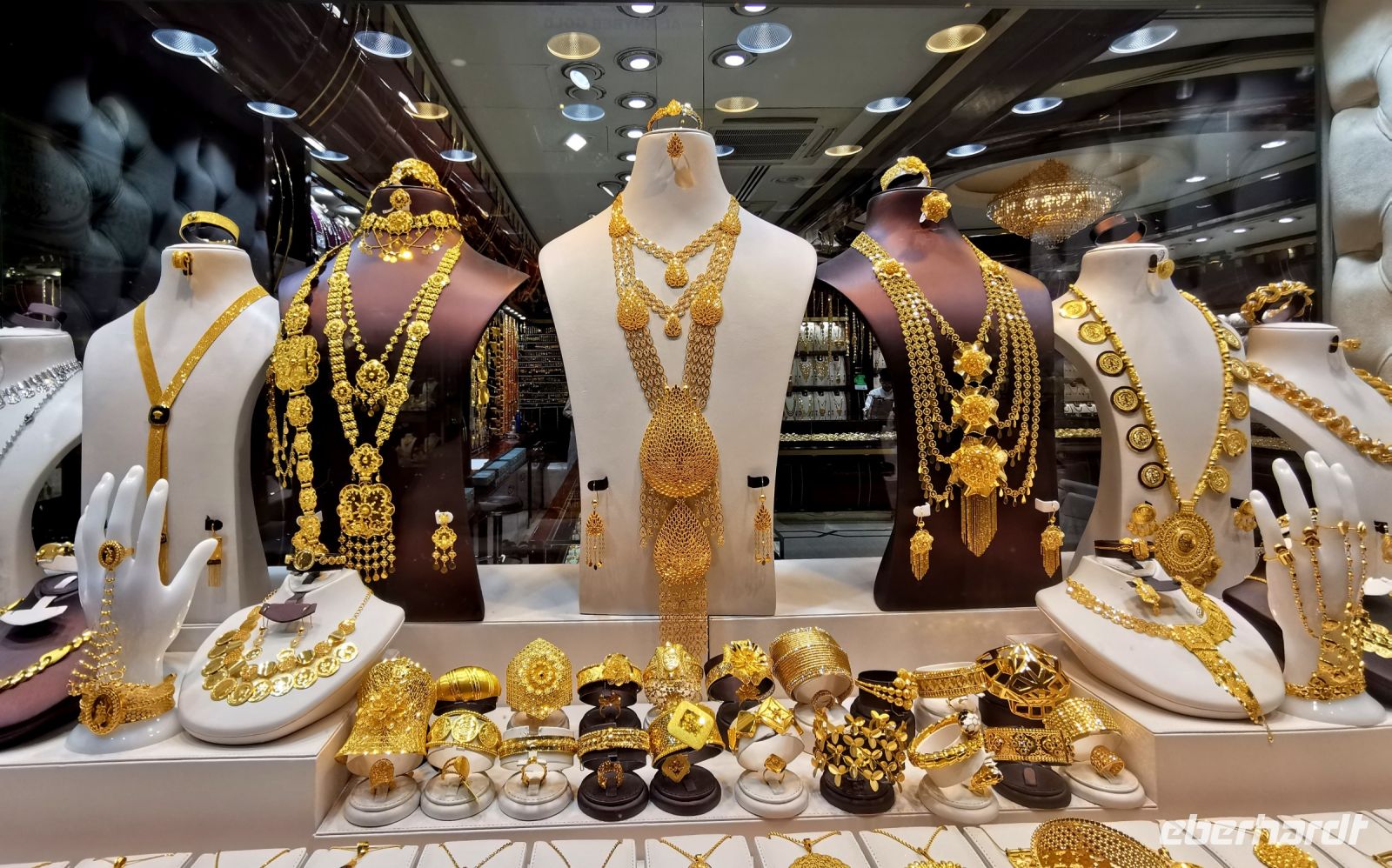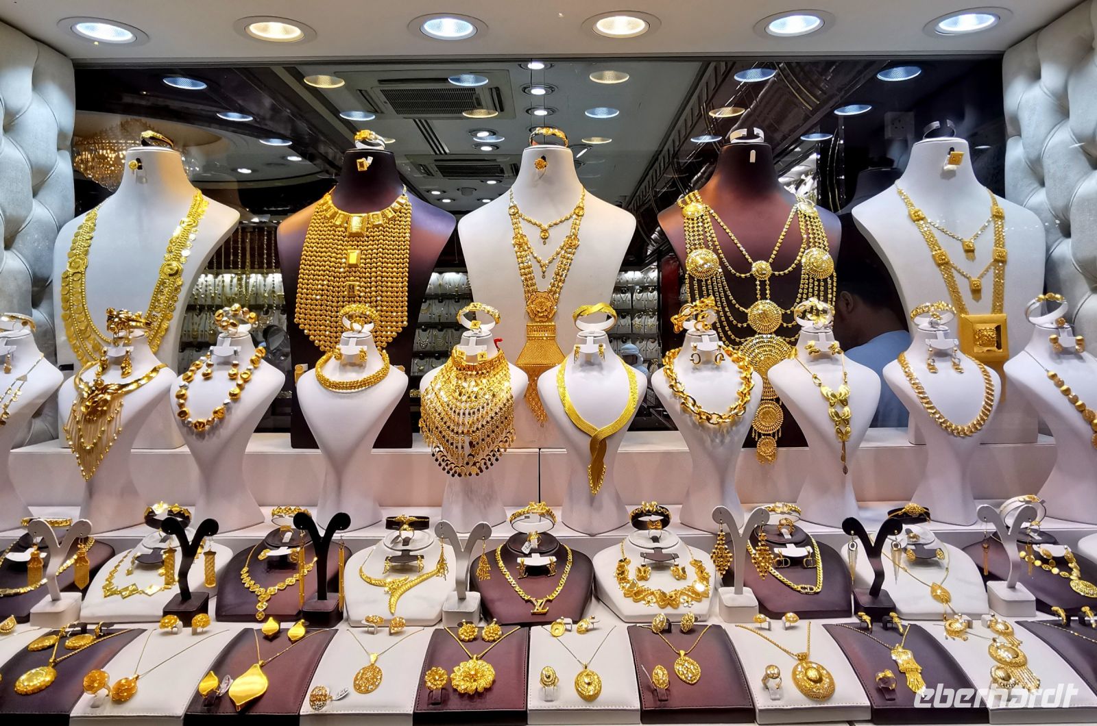 Die nächsten beiden Besichtigungen machen wir in zwei Souqs, den einheimischen Märkten. Zuerst staunen wir über Fleisch, Fisch und Obststände im Souk al Jubail. Alles ist blitzsauber, Obst, Gemüse und Kräuter sind absolut frisch und an den Dattelständen kauft Simone einige von der besten Qualität, damit alle einmal probieren können. Im zweiten Souq, dem sogenannten Blauen Basar, könnte man sich mit Gold nur so behängen lassen. Alles blitzt und blinkt und einige Geschmeide haben riesige Ausmaße. Im hinteren Marktteil gibt es Unmengen von schönen Schals, Tüchern und traditionelle Gewänder für die Muslima. Die Gäste sind fasziniert von den außerordentlich schönen Goldarbeiten. Manche der Ketten sehen so schwer aus, daß wir uns fragen, wann und wo man solchen üppigen Schmuck eigentlich trägt.