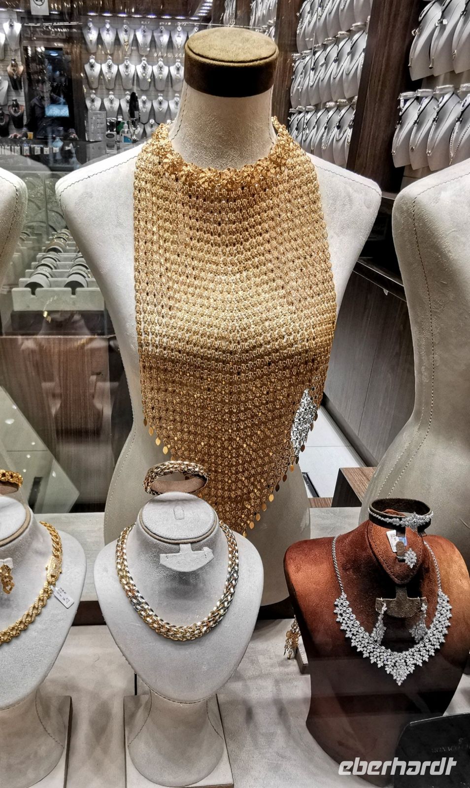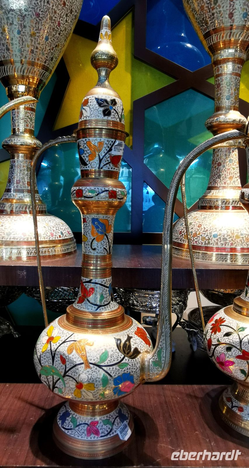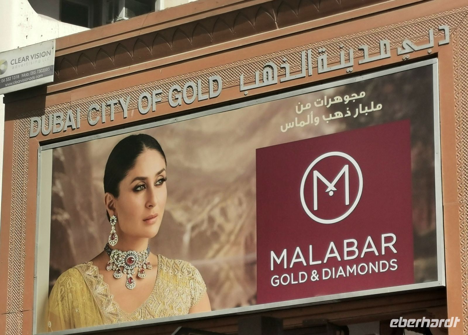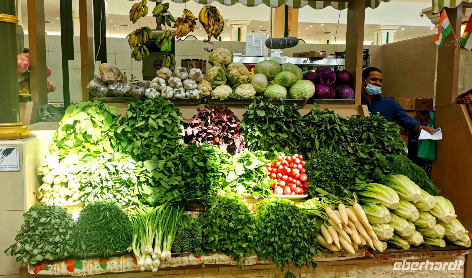 Die nächsten beiden Besichtigungen machen wir in zwei Souqs, den einheimischen Märkten. Zuerst staunen wir über Fleisch, Fisch und Obststände im Souk al Jubail. Alles ist blitzsauber, Obst, Gemüse und Kräuter sind absolut frisch und an den Dattelständen kauft Simone einige von der besten Qualität, damit alle einmal probieren können. Im zweiten Souq, dem sogenannten Blauen Basar, könnte man sich mit Gold nur so behängen lassen. Alles blitzt und blinkt und einige Geschmeide haben riesige Ausmaße. Im hinteren Marktteil gibt es Unmengen von schönen Schals, Tüchern und traditionelle Gewänder für die Muslima. Die Gäste sind fasziniert von den außerordentlich schönen Goldarbeiten. Manche der Ketten sehen so schwer aus, daß wir uns fragen, wann und wo man solchen üppigen Schmuck eigentlich trägt.