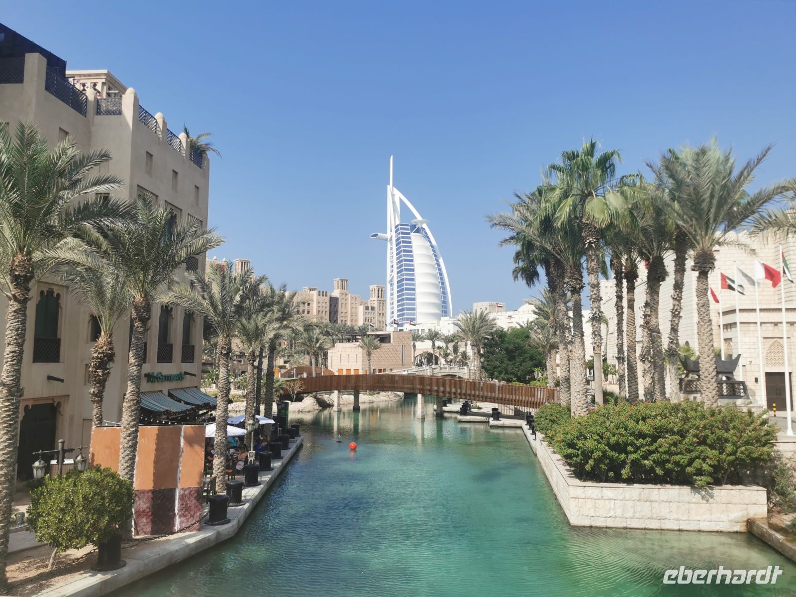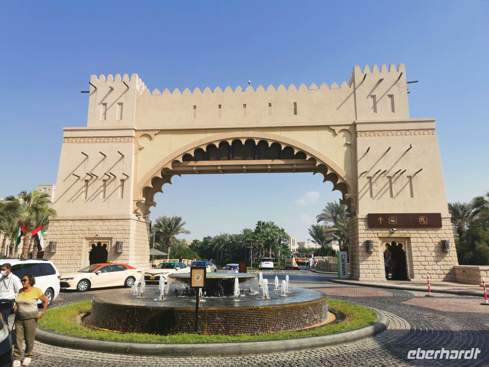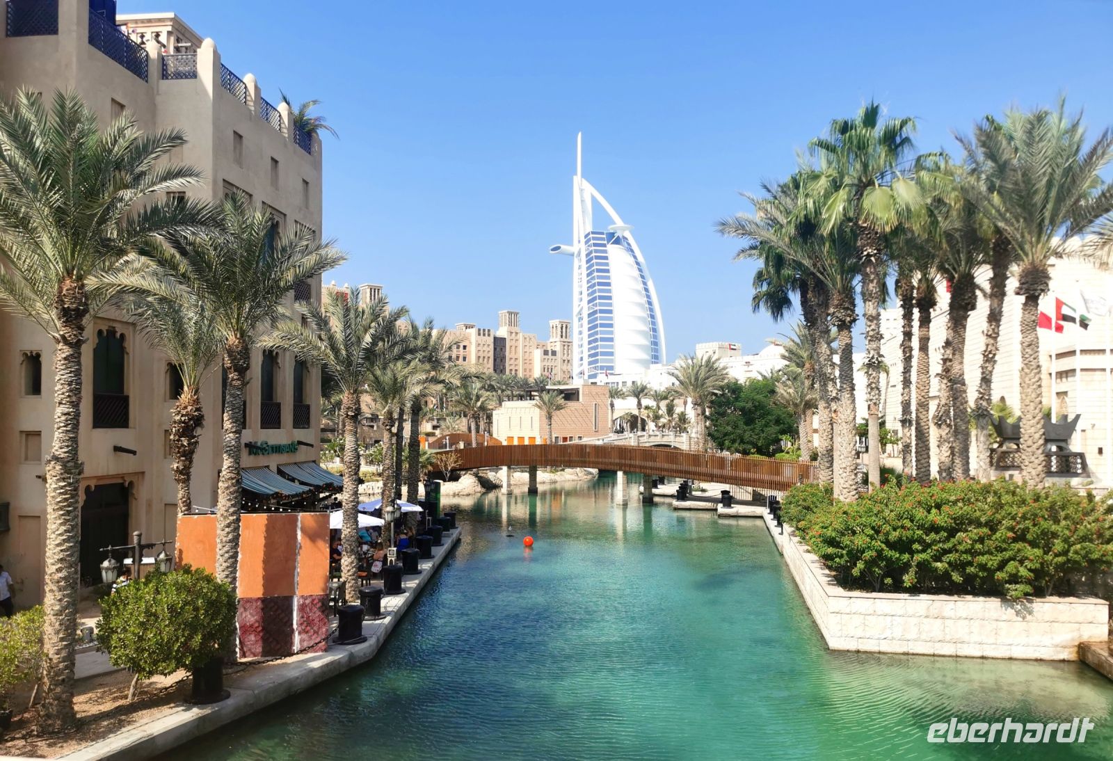 Wir fahren weiter zum Madinat Jumeirah, einem 2004 eröffneten Hotel- und Geschäftskomplex, der wie eine Lagunenstadt mit Gebäuden im Stil arabischer Paläste gestaltet wurde. Hier kann man noch die einstmals für die Gegend am Golf von Persien typischen Windtürme bewundern. Im Souq Madinat, dem Basarkomplex mit kleinen Läden, in denen vor allem Antiquitäten und Kunsthandwerk feil geboten werden, lassen wir das eher traditionell orientalische Flair ganz ohne Wolkenkratzer auf uns wirken. Von der Brücke vor dem Basar aus genießen wir einen fantastischen Blick auf das Burj al Arab, das in Form eines Segels errichtete 7-Sterne-Hotel Dubais.