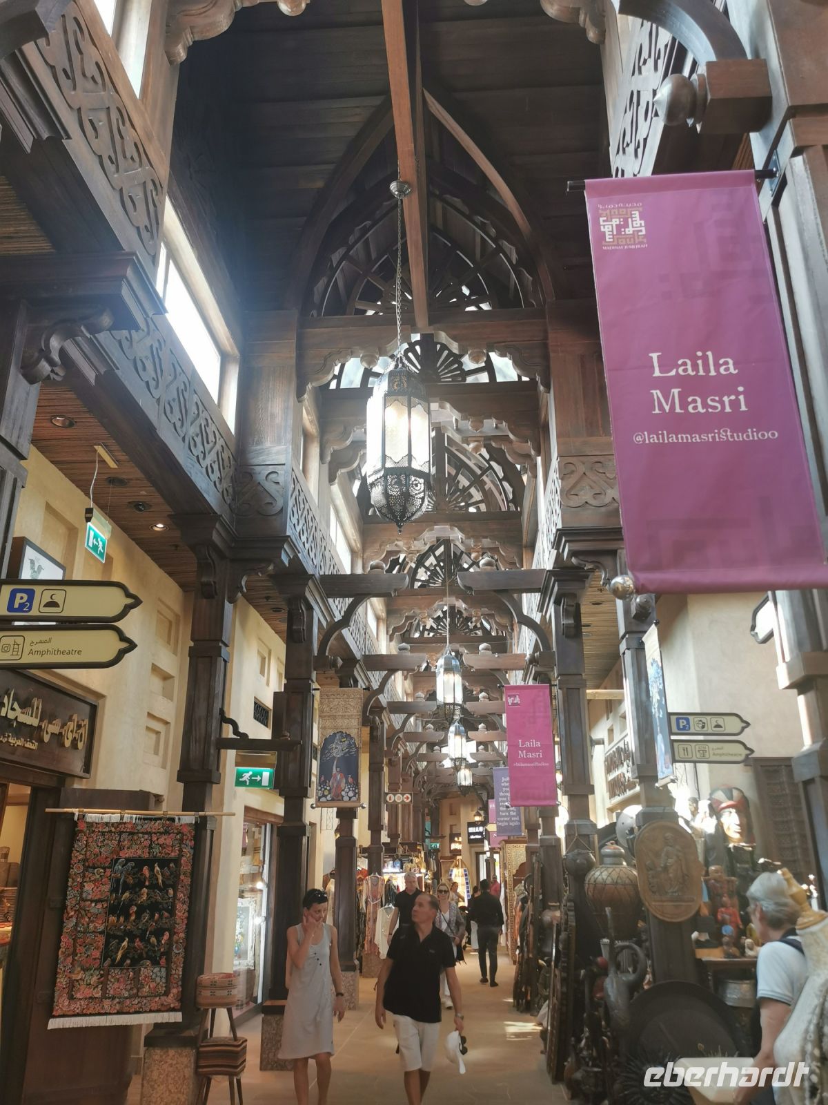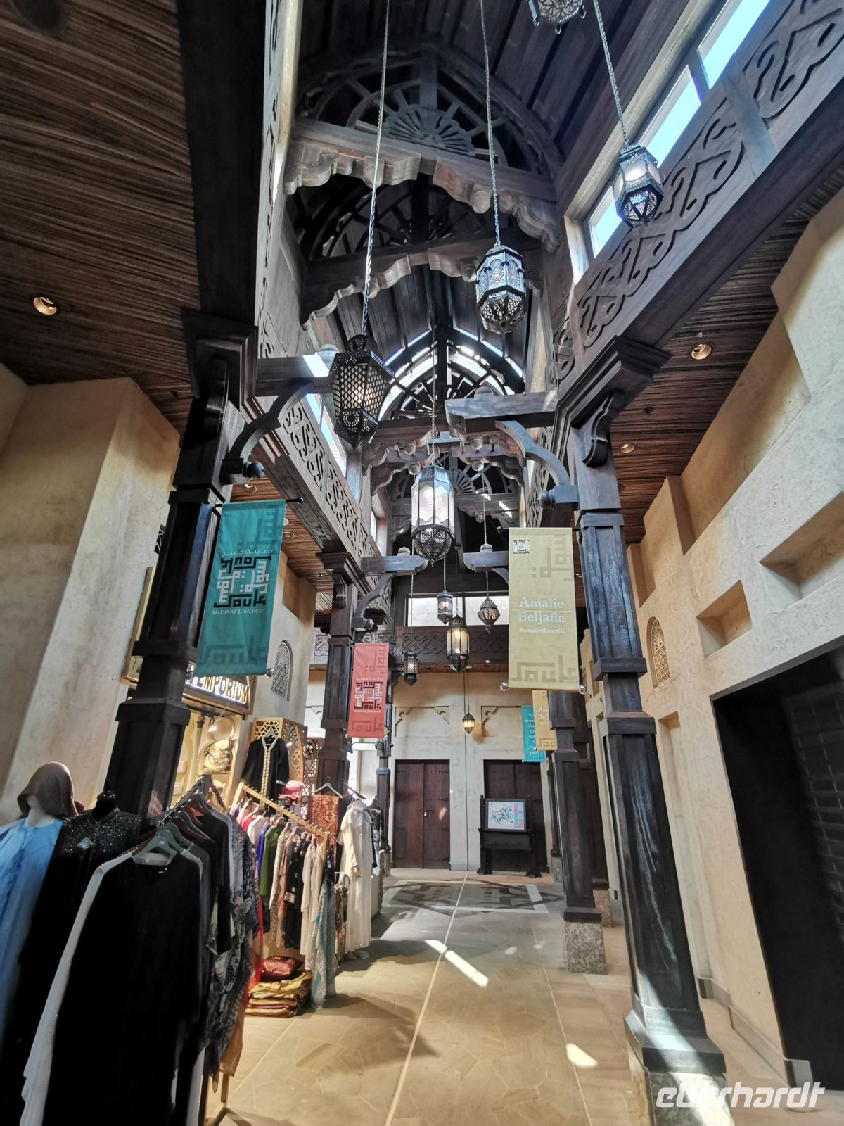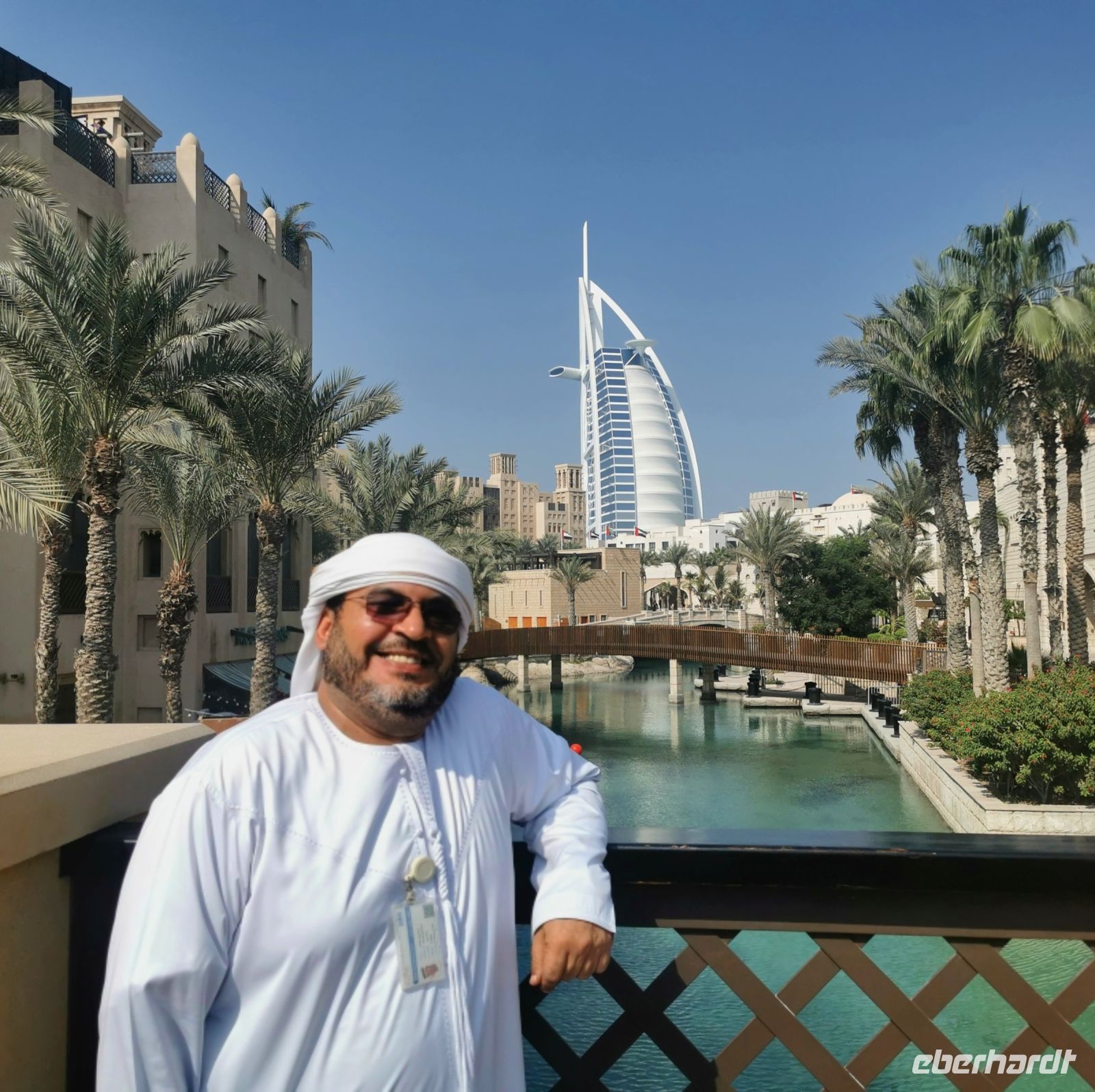 Wir fahren weiter zum Madinat Jumeirah, einem 2004 eröffneten Hotel- und Geschäftskomplex, der wie eine Lagunenstadt mit Gebäuden im Stil arabischer Paläste gestaltet wurde. Hier kann man noch die einstmals für die Gegend am Golf von Persien typischen Windtürme bewundern. Im Souq Madinat, dem Basarkomplex mit kleinen Läden, in denen vor allem Antiquitäten und Kunsthandwerk feil geboten werden, lassen wir das eher traditionell orientalische Flair ganz ohne Wolkenkratzer auf uns wirken. Von der Brücke vor dem Basar aus genießen wir einen fantastischen Blick auf das Burj al Arab, das in Form eines Segels errichtete 7-Sterne-Hotel Dubais.