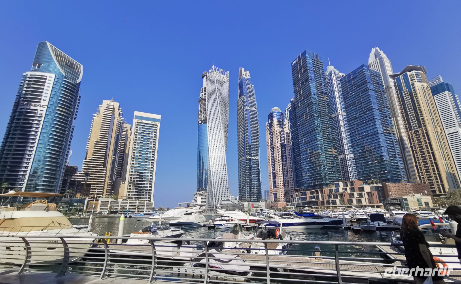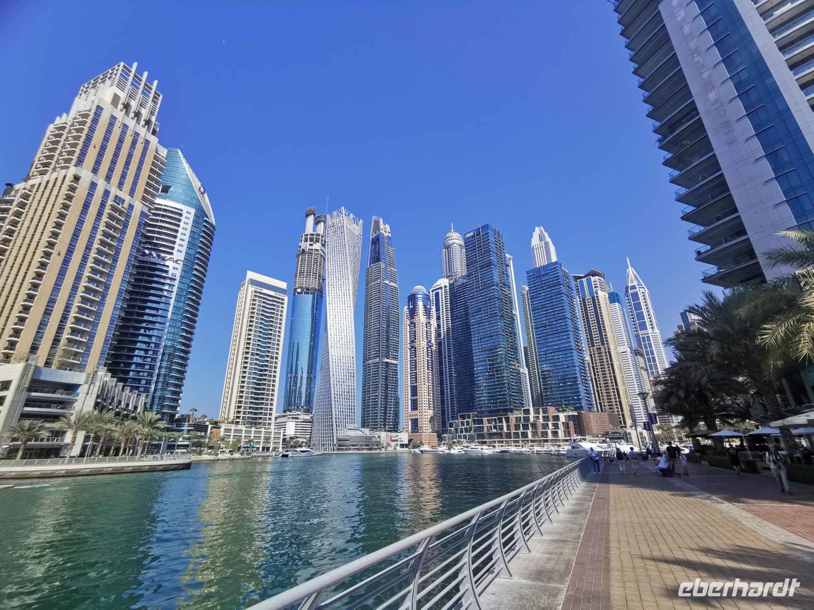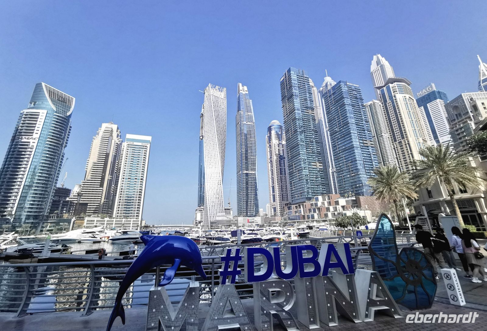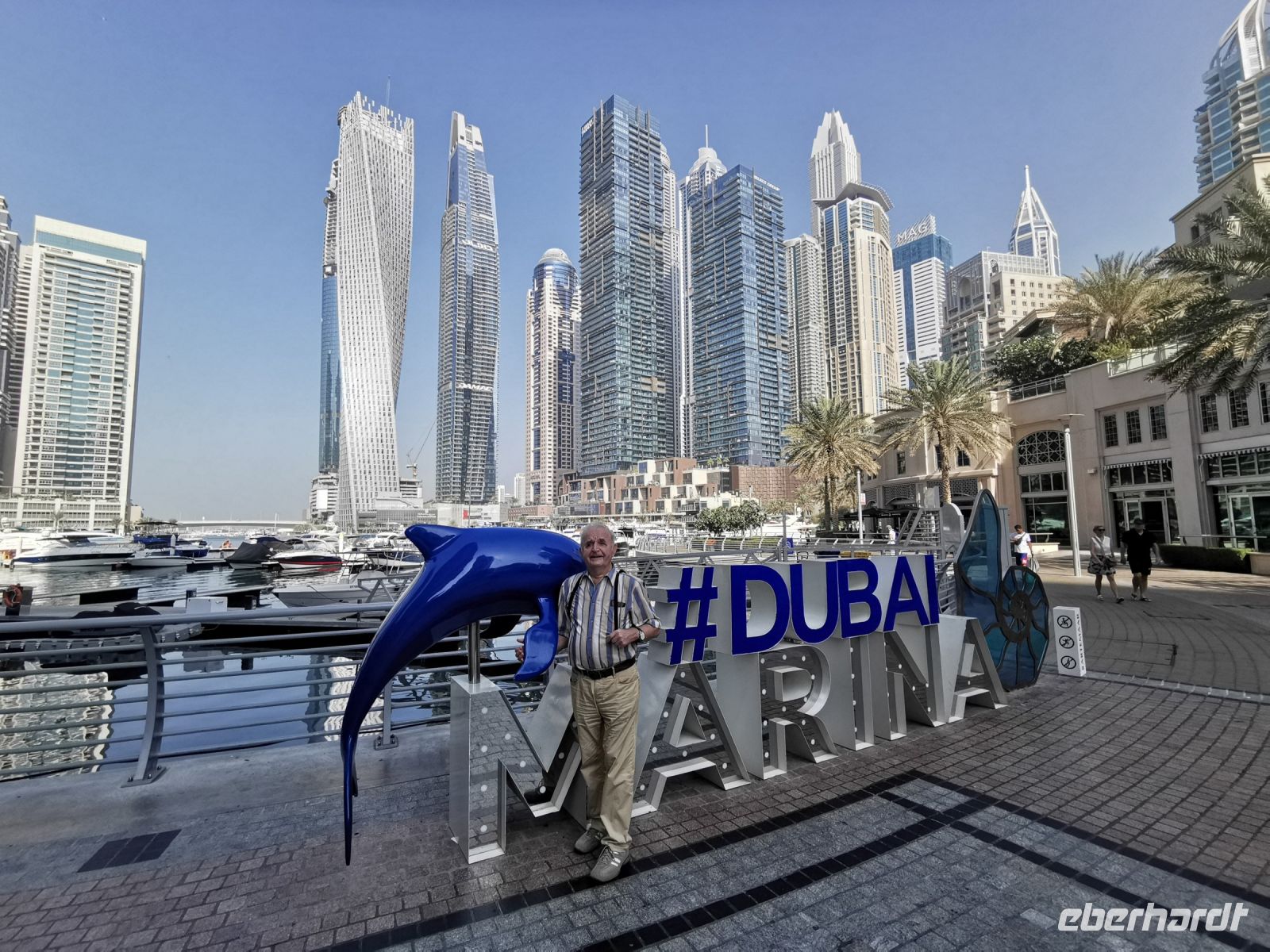Wir fahren zuerst auf der kilometerlangen schnurgeraden Sheikh Zayed Road an der Küste entlang und machen an der Dubai Marina den ersten Fotostopp. Dieses luxuriöse Wohnviertel ist bekannt für malerische Strände und die am Wasser gelegenen Cafés, in denen man den Tag mit Wasserpfeife oder Tee genießen kann. Die Kulisse voller Wolkenkratzer erinnert die Gäste an kanadische oder amerikanische Großstädte. Bereits hier merken wir, daß sich alle erdenklichen Nationen während ihres Urlaubs in Dubai tummeln. Die Bevölkerung der Stadt besteht nur zu knapp zehn Prozent aus Emiratis. Die meisten Menschen, die hier arbeiten und leben, stammen aus Indien, Pakistan, Bangladesch und den Philippinen. Ohne ihre Anstrengungen und Niedriglöhne wäre das heutige Dubai undenkbar. Das Know-how für all diese Bauwunder stammt zumeist von europäischen oder amerikanischen Architekten und Ingenieuren und ist nur dank des Geldes aus den Ölmilliarden überhaupt realisierbar geworden.