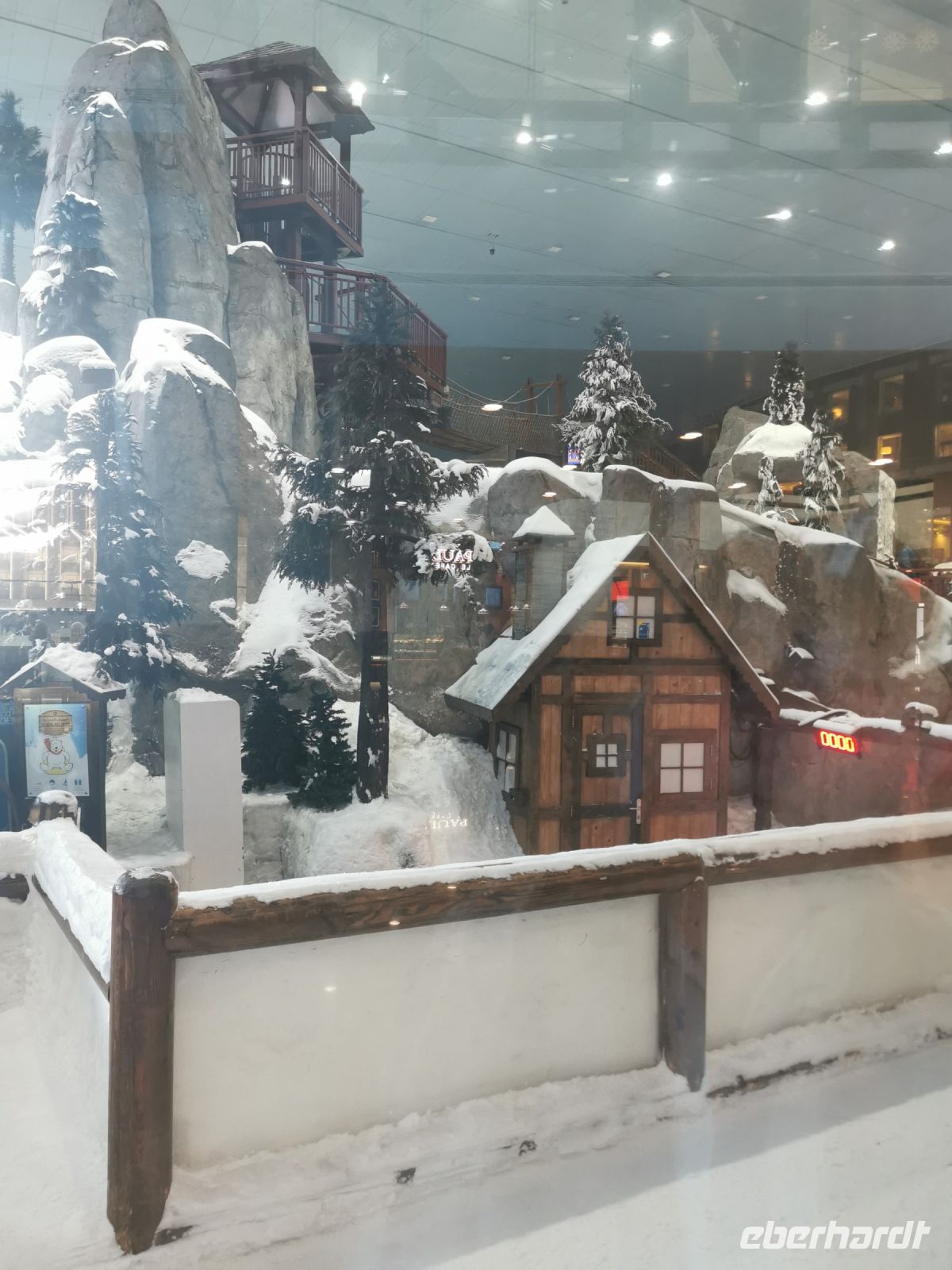 Das nächste Highlight an diesem Tag ist die Mall of the Emirates. In diesem riesigen Einkaufs- und Vergnügungskomplex befindet sich eine Ski-Welt, ja richtig gelesen! In Dubai, mit seinen bis zu 50 Grad heißen Sommern, kann man sich einfach abkühlen, indem man sich im Ski Dubai Anzug und Ski beziehungsweise Schlitten ausborgt, und dann, ganz nach Belieben, Wintersport betreibt. Auf Abfahrten muß man natürlich nicht verzichten, ein 400 Meter langer Abhang macht das Hinuntersausen möglich, und wenn man sich lange genug im Schnee vergnügt hat, oder es einem bei - 4 Grad doch zu kalt geworden ist, geht man hinaus und kann sich bei über 30 Grad im Schatten schnell wieder erwärmen. Wir genießen also einen wunderbaren Cappuchino mit Blick in die winterliche Welt und es ist gar nicht ganz zu fassen, daß man kurz darauf beim Verlassen der Mall wieder 33 Grad hat. So ist eben Dubai, nichts ist unmöglich.