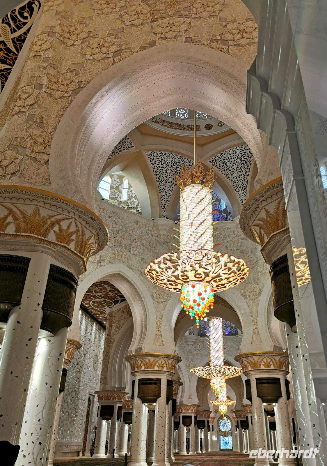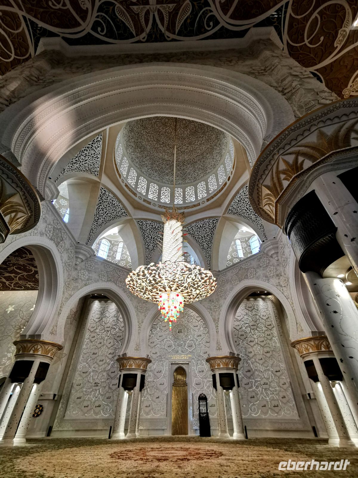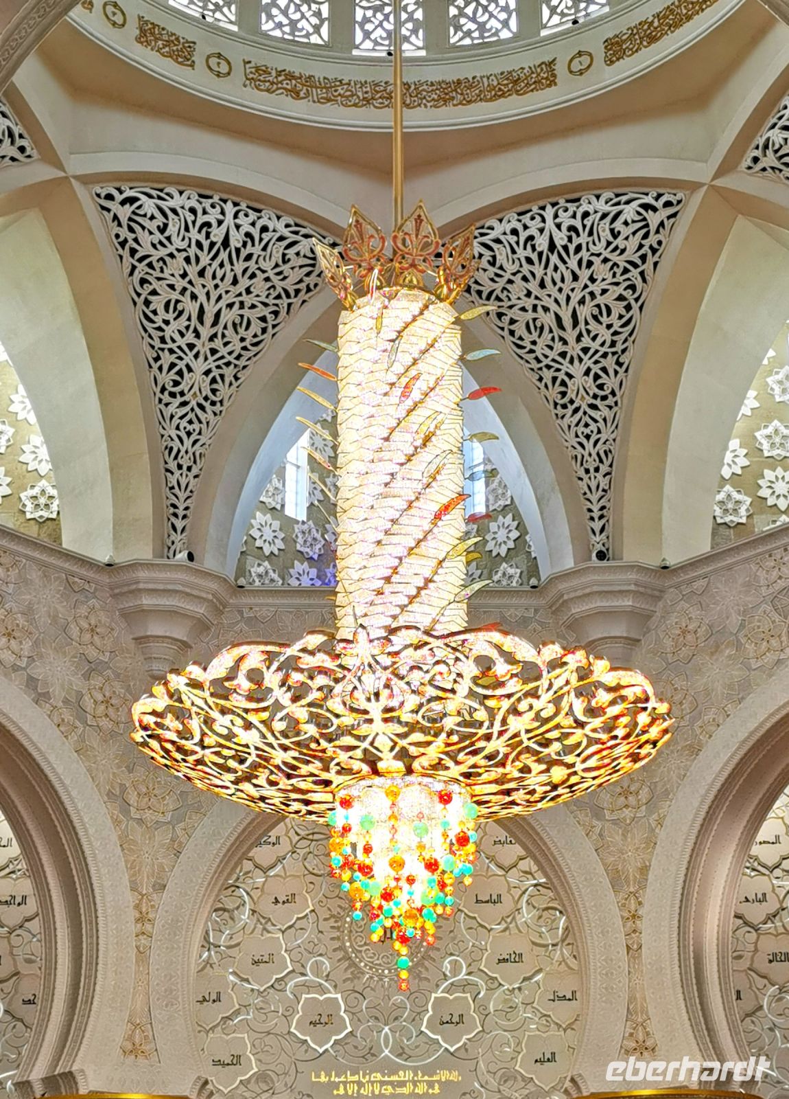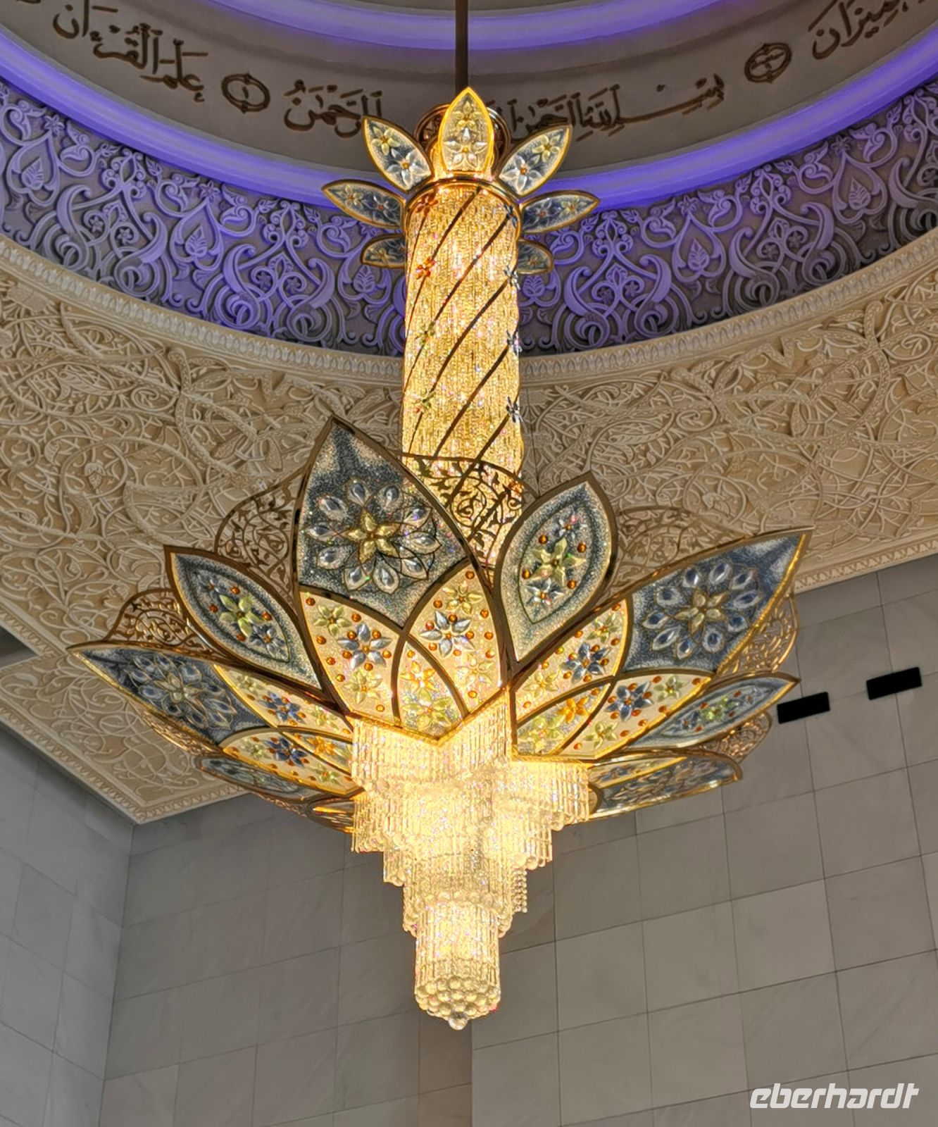 Um in diesen Traum aus weißem Marmor, blumenverzierten Säulen und unzähligen Kuppeln zu kommen, passieren wir umfangreiche Sicherheitskontrollen, und die Damen der Gruppe müssen Kopfbedeckungen anlegen. Danach dürfen wir das Heiligtum, in dem bis zu 40.000 Gläubige gleichzeitig beten können, betreten. Man munkelt, daß die Baukosten bei 550 Millionen US-Dollar gelegen haben sollen. Es wurden 15 verschiedene Marmorsorten und viel Blattgold für die Ausstattung verwendet, ein 5.627 m² großer handgeknüpfter Teppich wurde eigens im Iran gefertigt und ein 12 Tonnen schwerer Kronleuchter ziert die Gebetshalle. Dieser Leuchter wurde übrigens in München von der Firma Faustig kreiert und gilt als größter Kronleuchter der Welt.