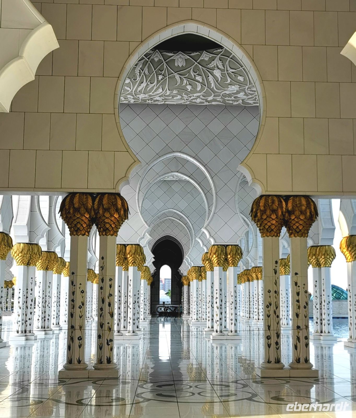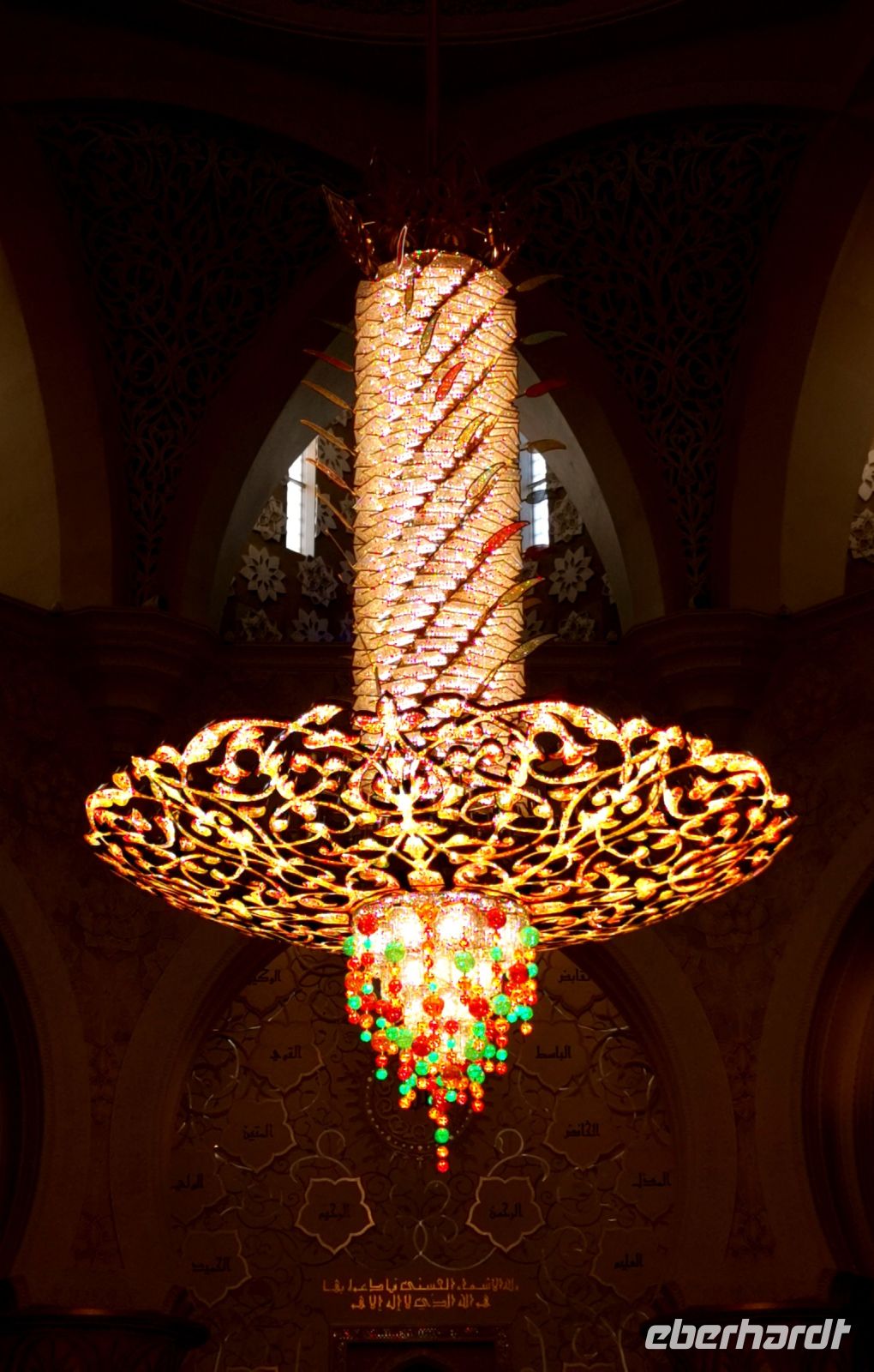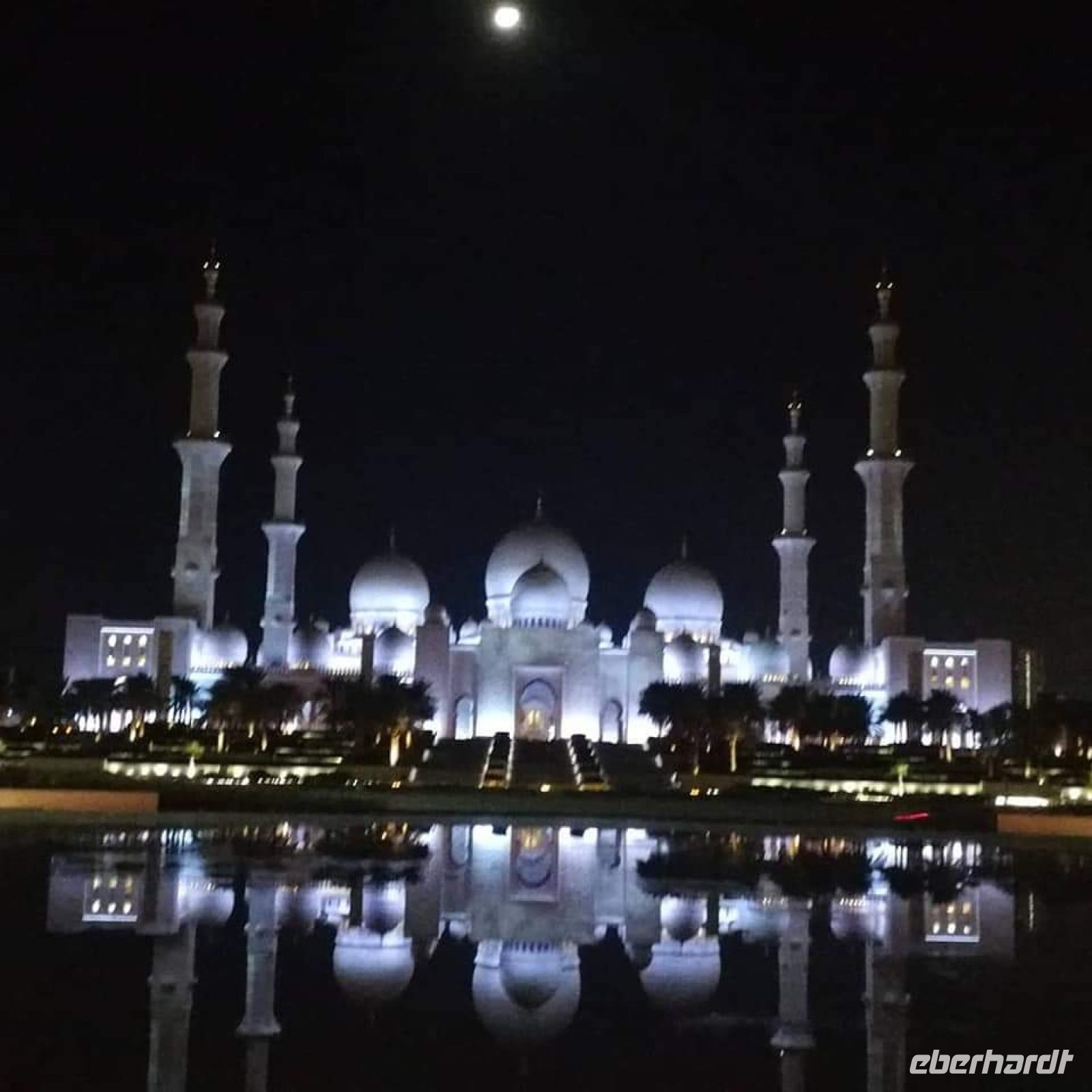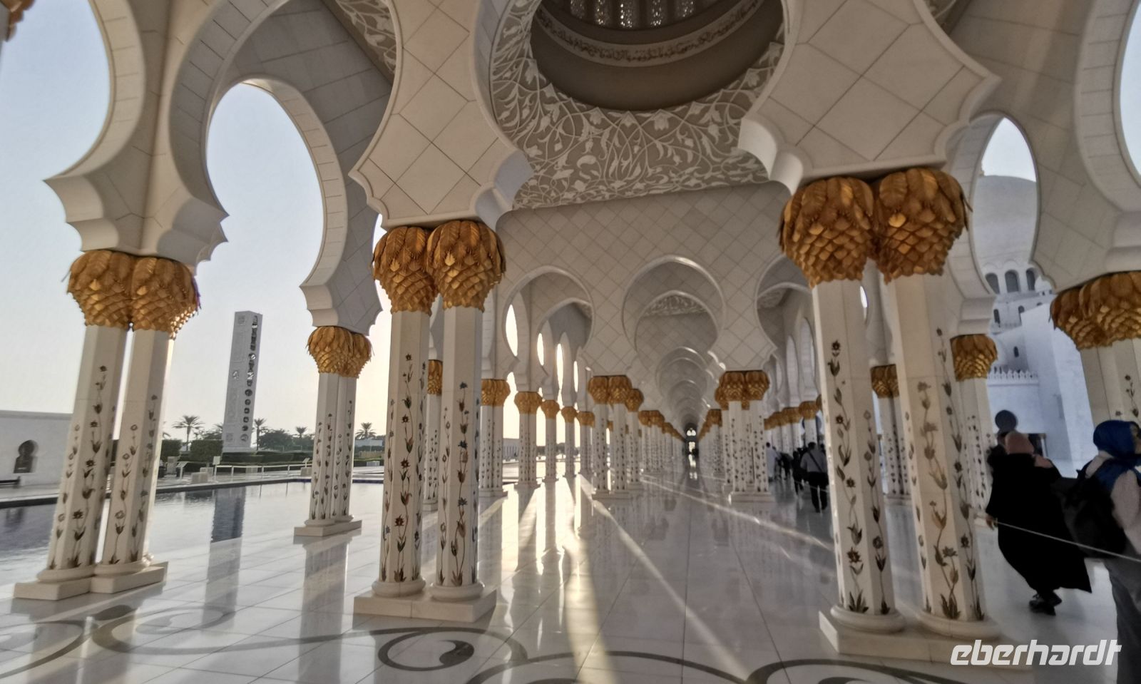 Um in diesen Traum aus weißem Marmor, blumenverzierten Säulen und unzähligen Kuppeln zu kommen, passieren wir umfangreiche Sicherheitskontrollen, und die Damen der Gruppe müssen Kopfbedeckungen anlegen. Danach dürfen wir das Heiligtum, in dem bis zu 40.000 Gläubige gleichzeitig beten können, betreten. Man munkelt, daß die Baukosten bei 550 Millionen US-Dollar gelegen haben sollen. Es wurden 15 verschiedene Marmorsorten und viel Blattgold für die Ausstattung verwendet, ein 5.627 m² großer handgeknüpfter Teppich wurde eigens im Iran gefertigt und ein 12 Tonnen schwerer Kronleuchter ziert die Gebetshalle. Dieser Leuchter wurde übrigens in München von der Firma Faustig kreiert und gilt als größter Kronleuchter der Welt.