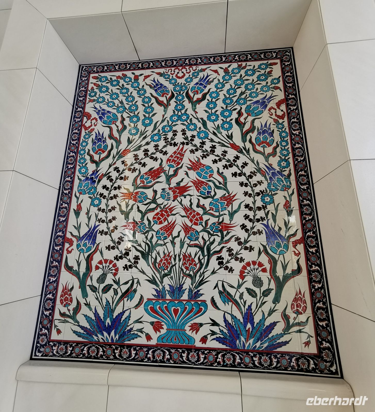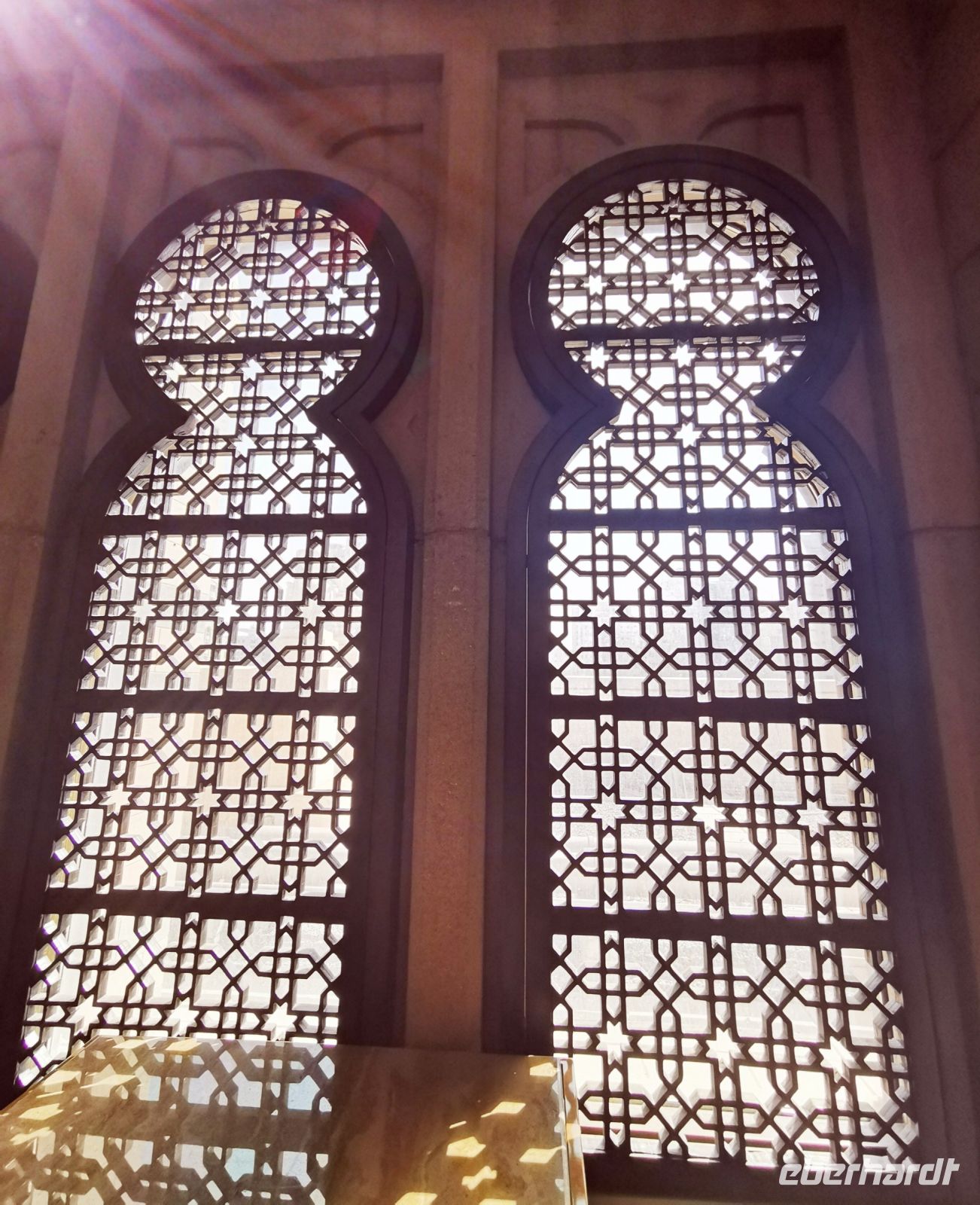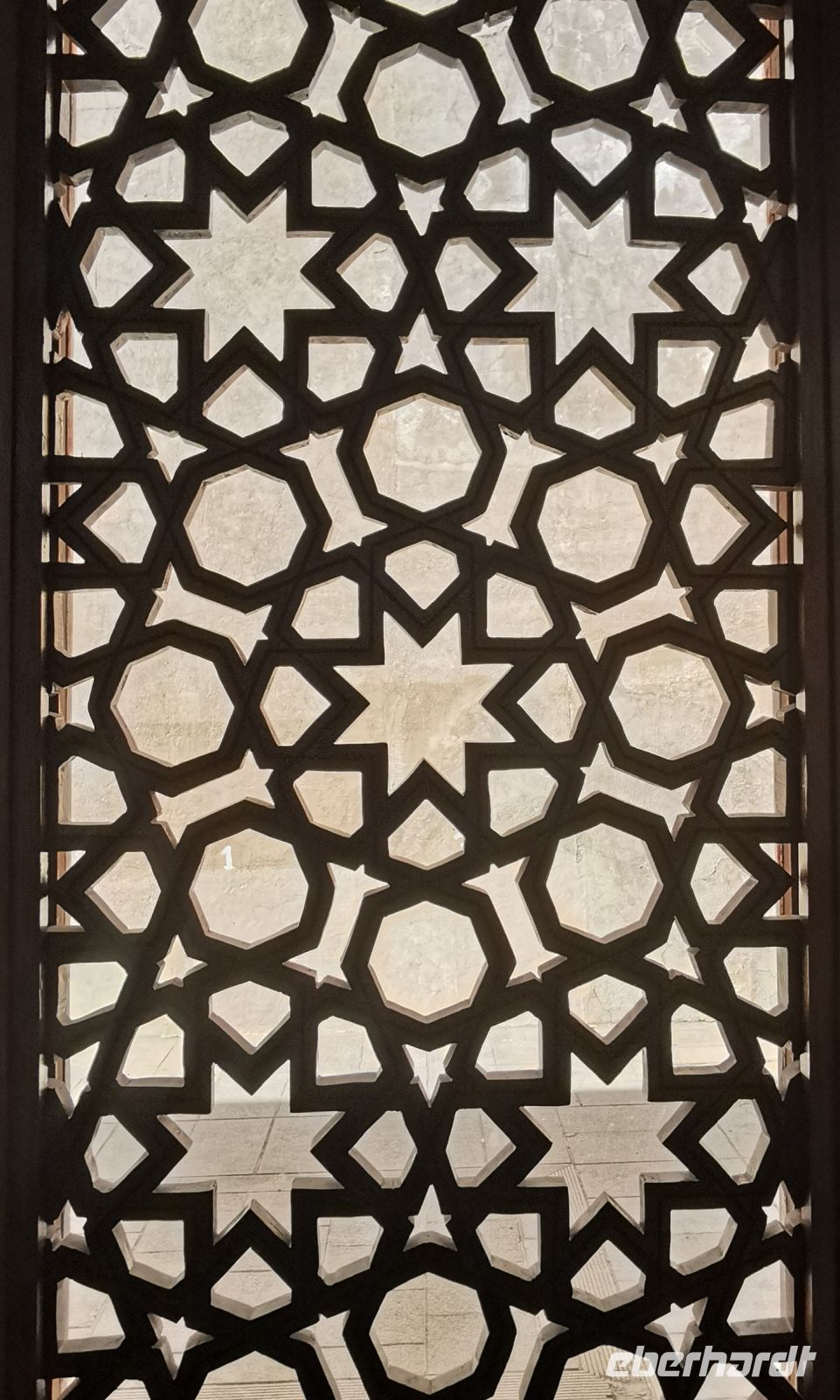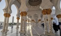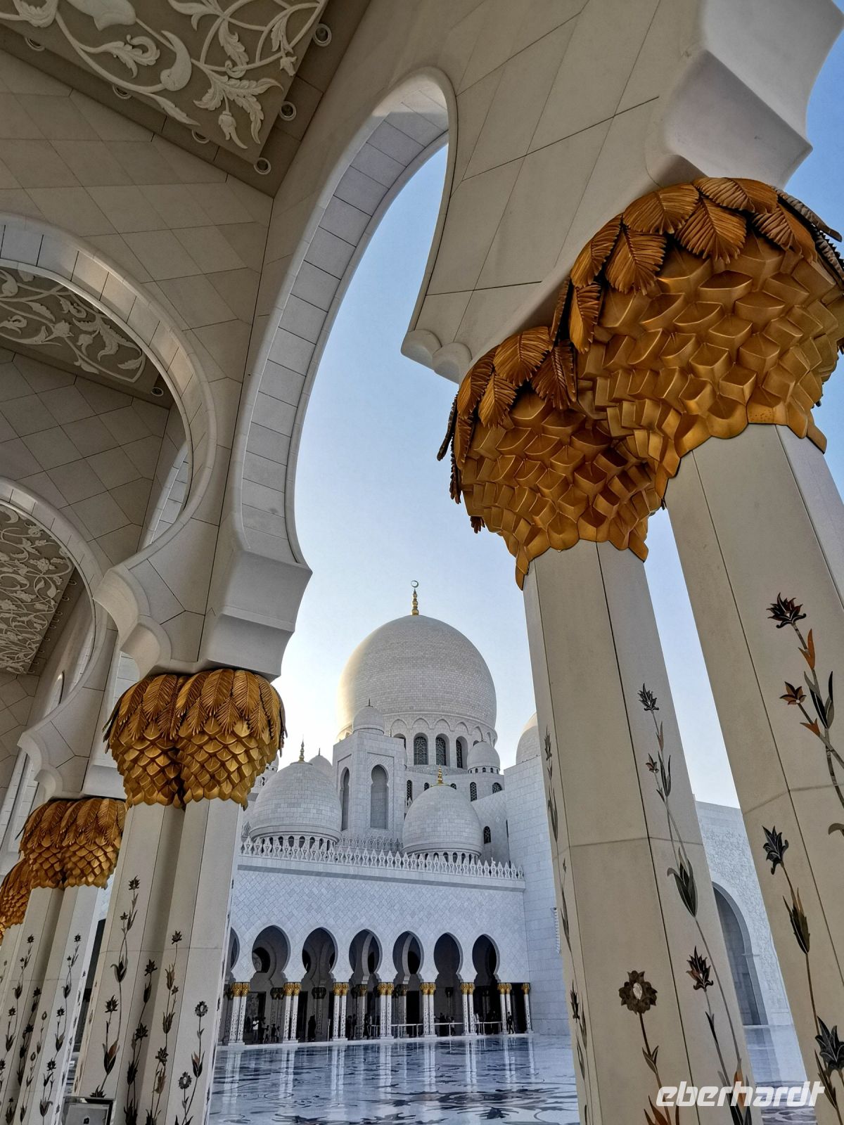 Um in diesen Traum aus weißem Marmor, blumenverzierten Säulen und unzähligen Kuppeln zu kommen, passieren wir umfangreiche Sicherheitskontrollen, und die Damen der Gruppe müssen Kopfbedeckungen anlegen. Danach dürfen wir das Heiligtum, in dem bis zu 40.000 Gläubige gleichzeitig beten können, betreten. Man munkelt, daß die Baukosten bei 550 Millionen US-Dollar gelegen haben sollen. Es wurden 15 verschiedene Marmorsorten und viel Blattgold für die Ausstattung verwendet, ein 5.627 m² großer handgeknüpfter Teppich wurde eigens im Iran gefertigt und ein 12 Tonnen schwerer Kronleuchter ziert die Gebetshalle. Dieser Leuchter wurde übrigens in München von der Firma Faustig kreiert und gilt als größter Kronleuchter der Welt.