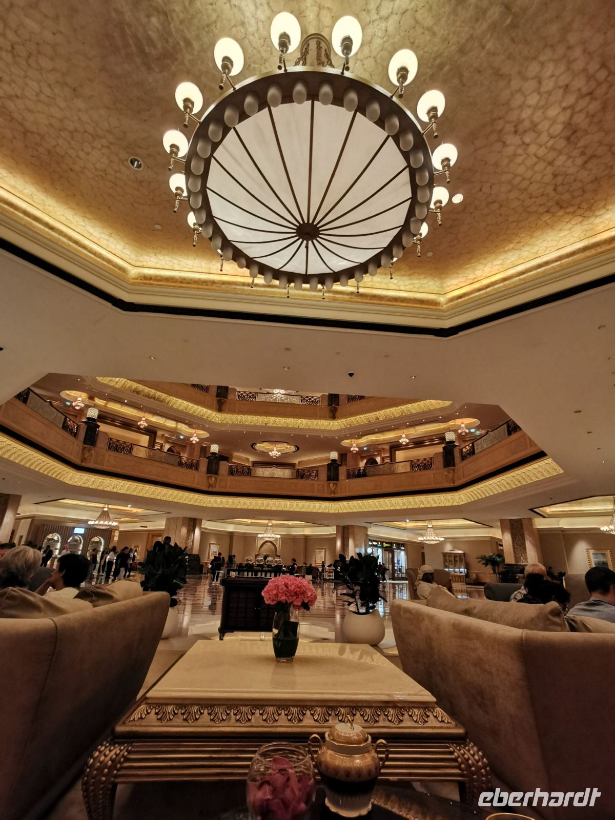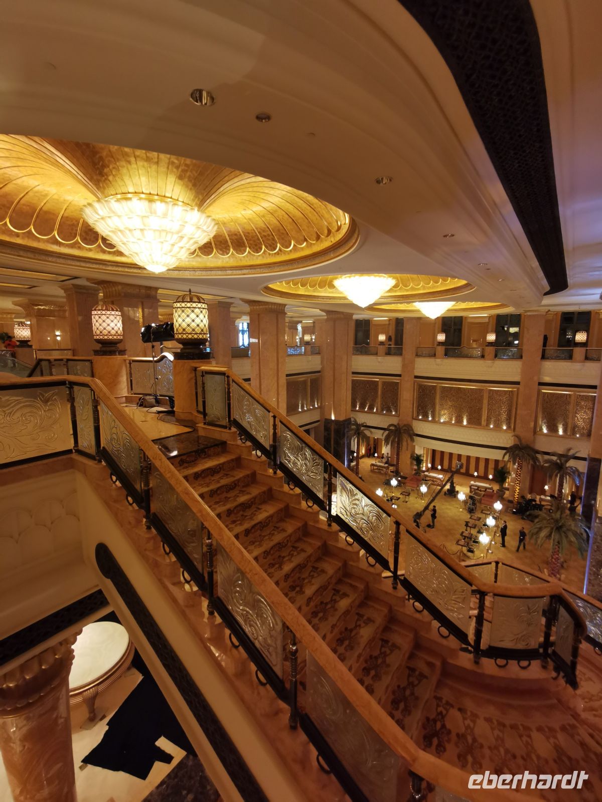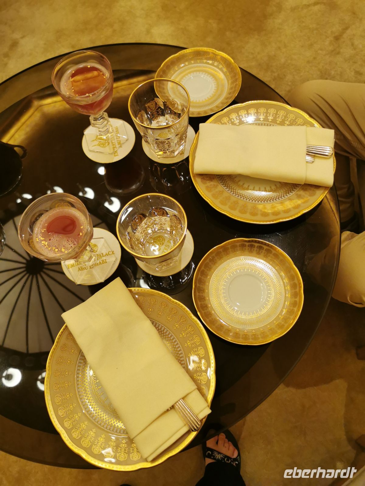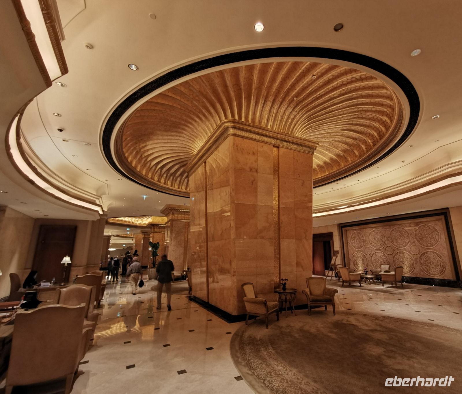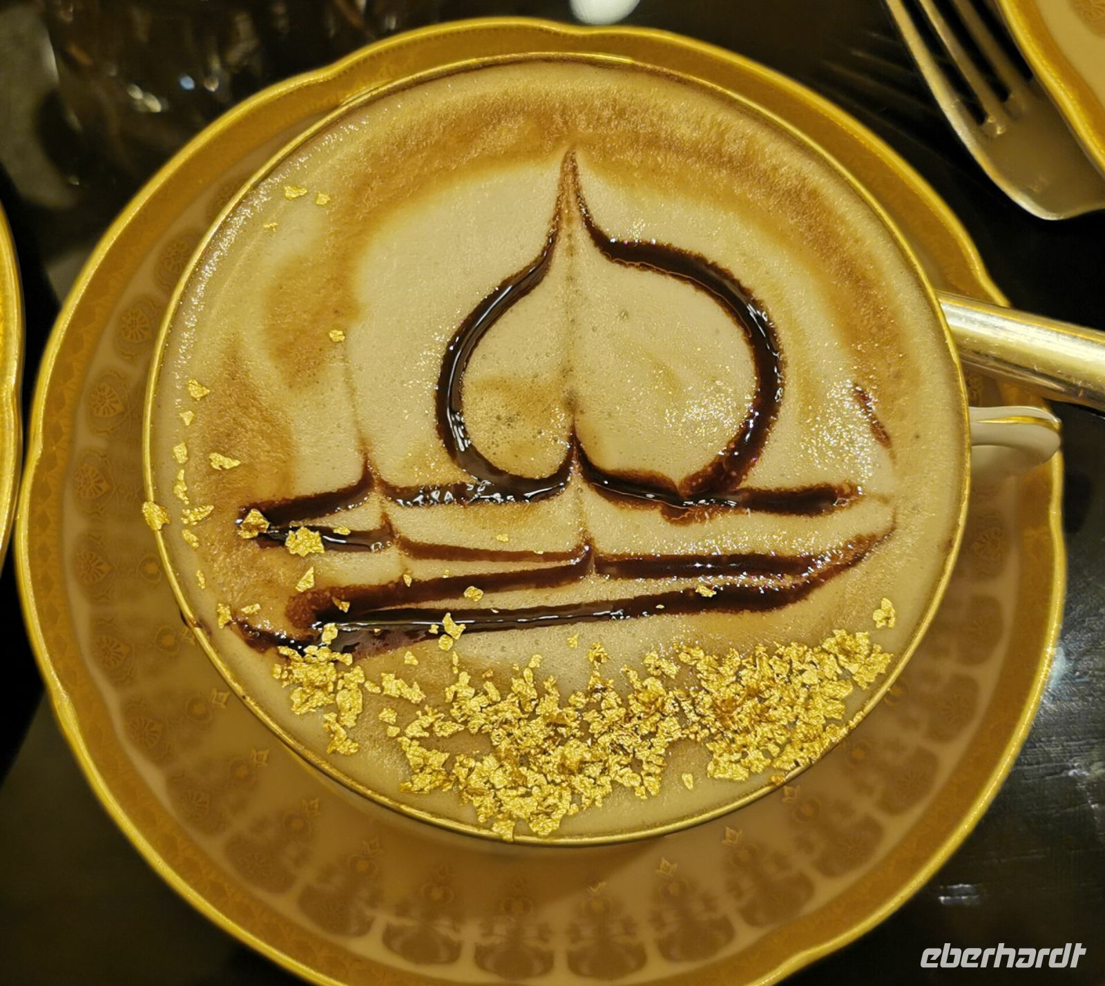 Wir begeben uns staunend durch die über und über mit Gold verzierte Lobby, bewundern die riesige Kuppel gleich nach dem Eingang und werden in gemütliche Sofalandschaften begleitet, wo bereits zierliches Porzellan mit Goldrand und Silberbesteck auf uns warten. Eine freundliche Kellnerin serviert uns süße und herzhafte Häppchen und auch der berühmte Cappuchino mit echtem Blattgold läßt nicht lange auf sich warten. Alle Gäste sind begeistert und spazieren noch eine Weile andächtig durch das geschmackvoll gestaltete Foyer und stellen fest, daß selbst in den Toiletten alles gülden glänzt.