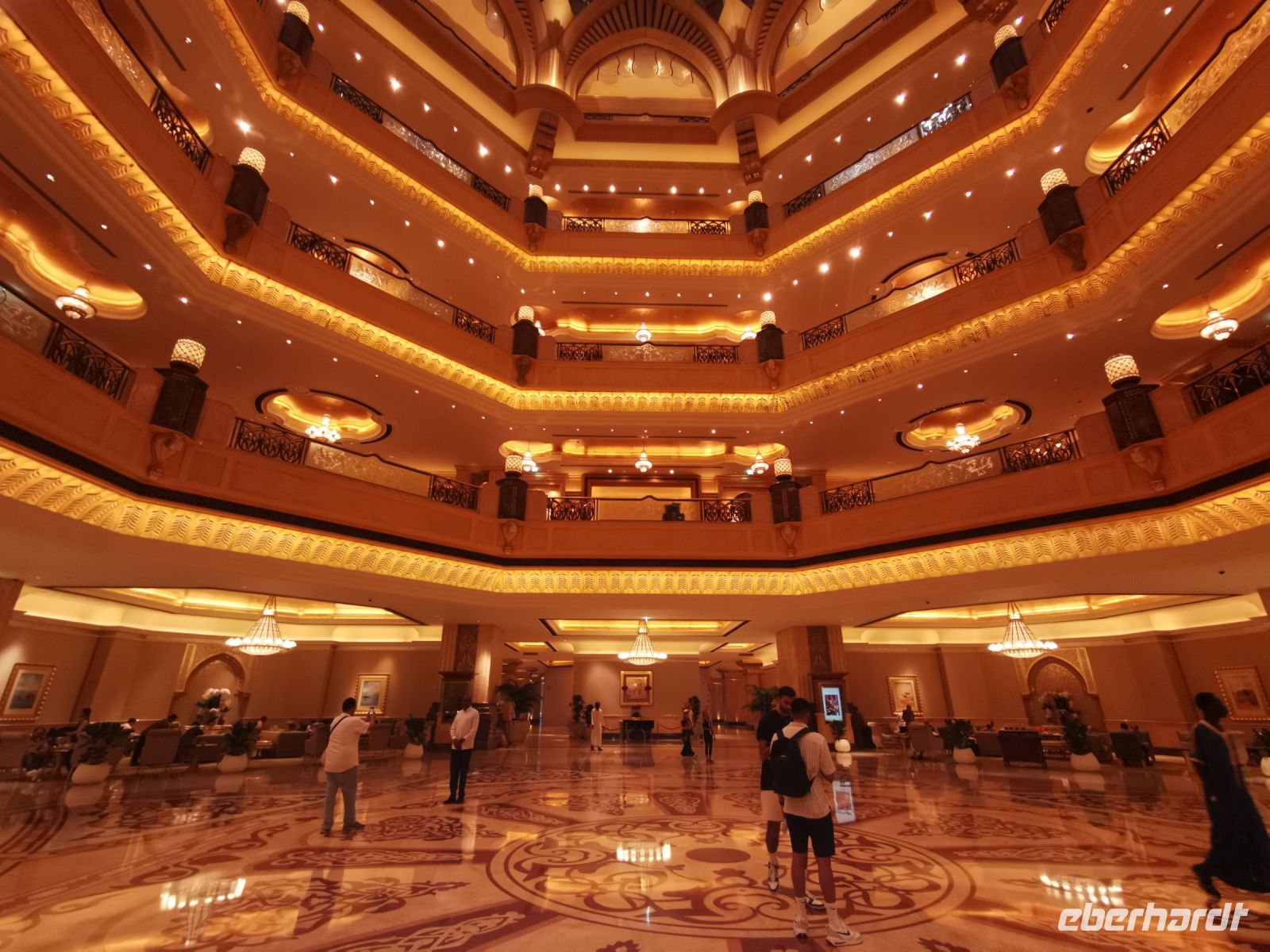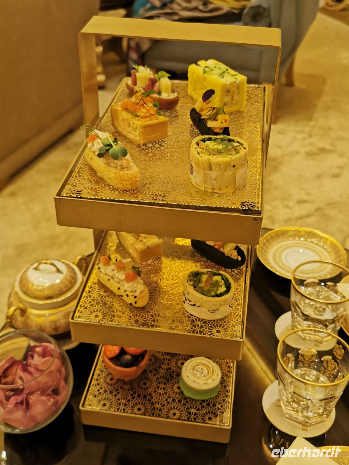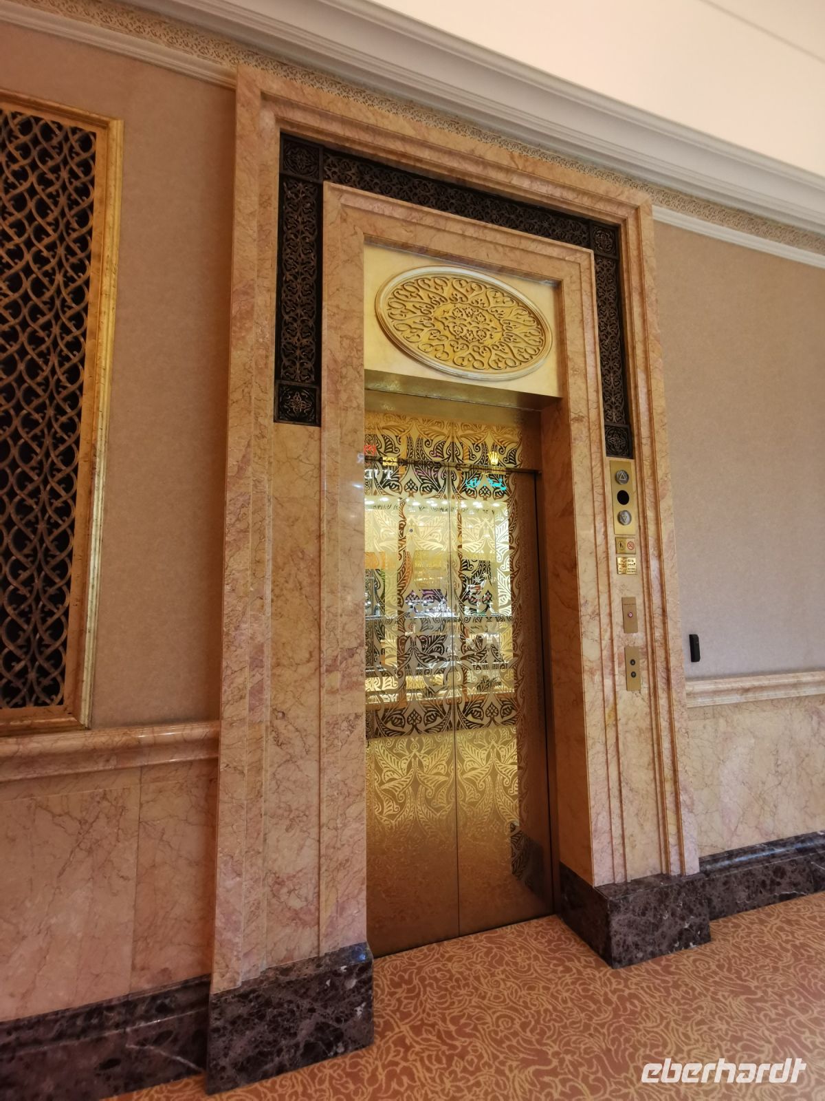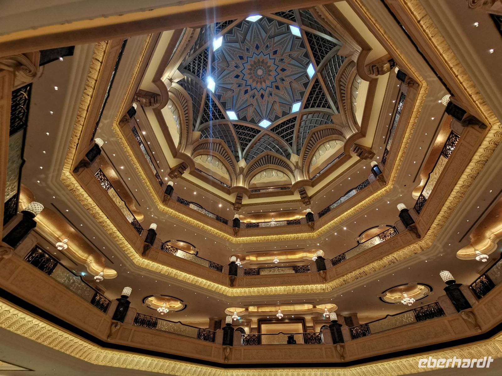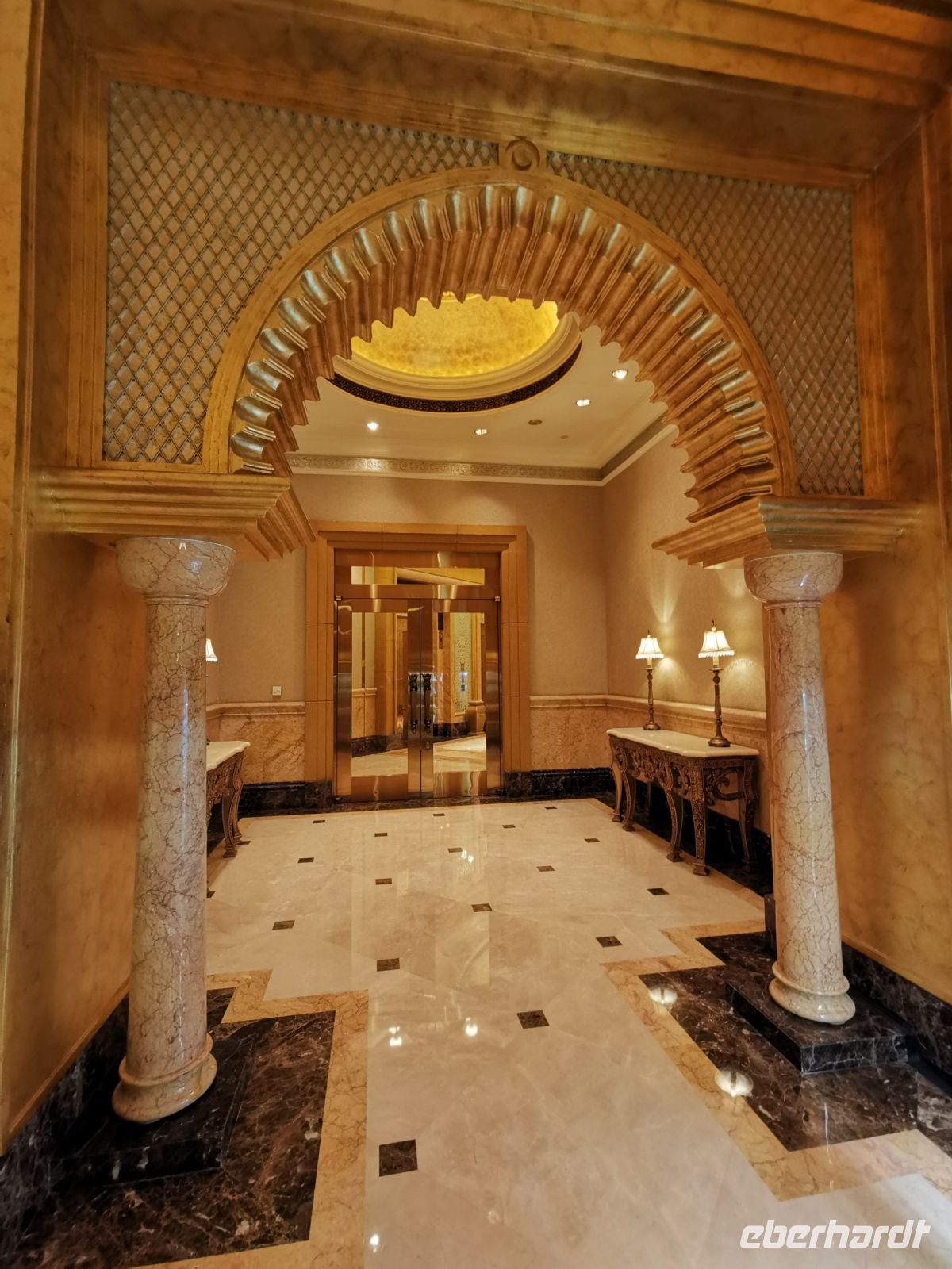Wir begeben uns staunend durch die über und über mit Gold verzierte Lobby, bewundern die riesige Kuppel gleich nach dem Eingang und werden in gemütliche Sofalandschaften begleitet, wo bereits zierliches Porzellan mit Goldrand und Silberbesteck auf uns warten. Eine freundliche Kellnerin serviert uns süße und herzhafte Häppchen und auch der berühmte Cappuchino mit echtem Blattgold läßt nicht lange auf sich warten. Alle Gäste sind begeistert und spazieren noch eine Weile andächtig durch das geschmackvoll gestaltete Foyer und stellen fest, daß selbst in den Toiletten alles gülden glänzt.