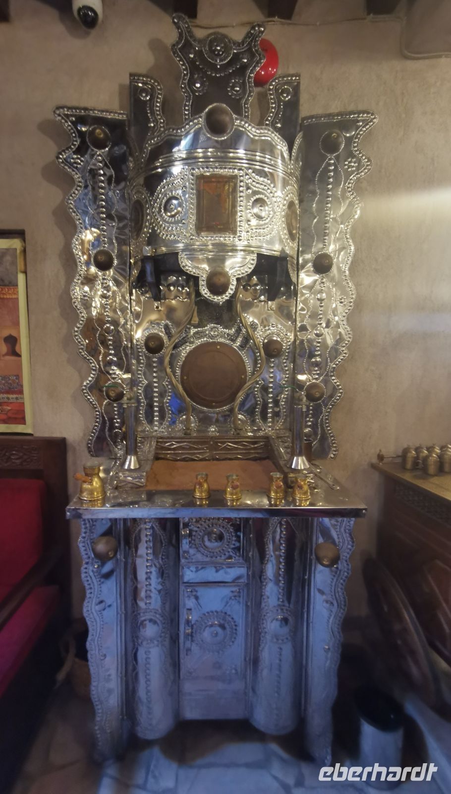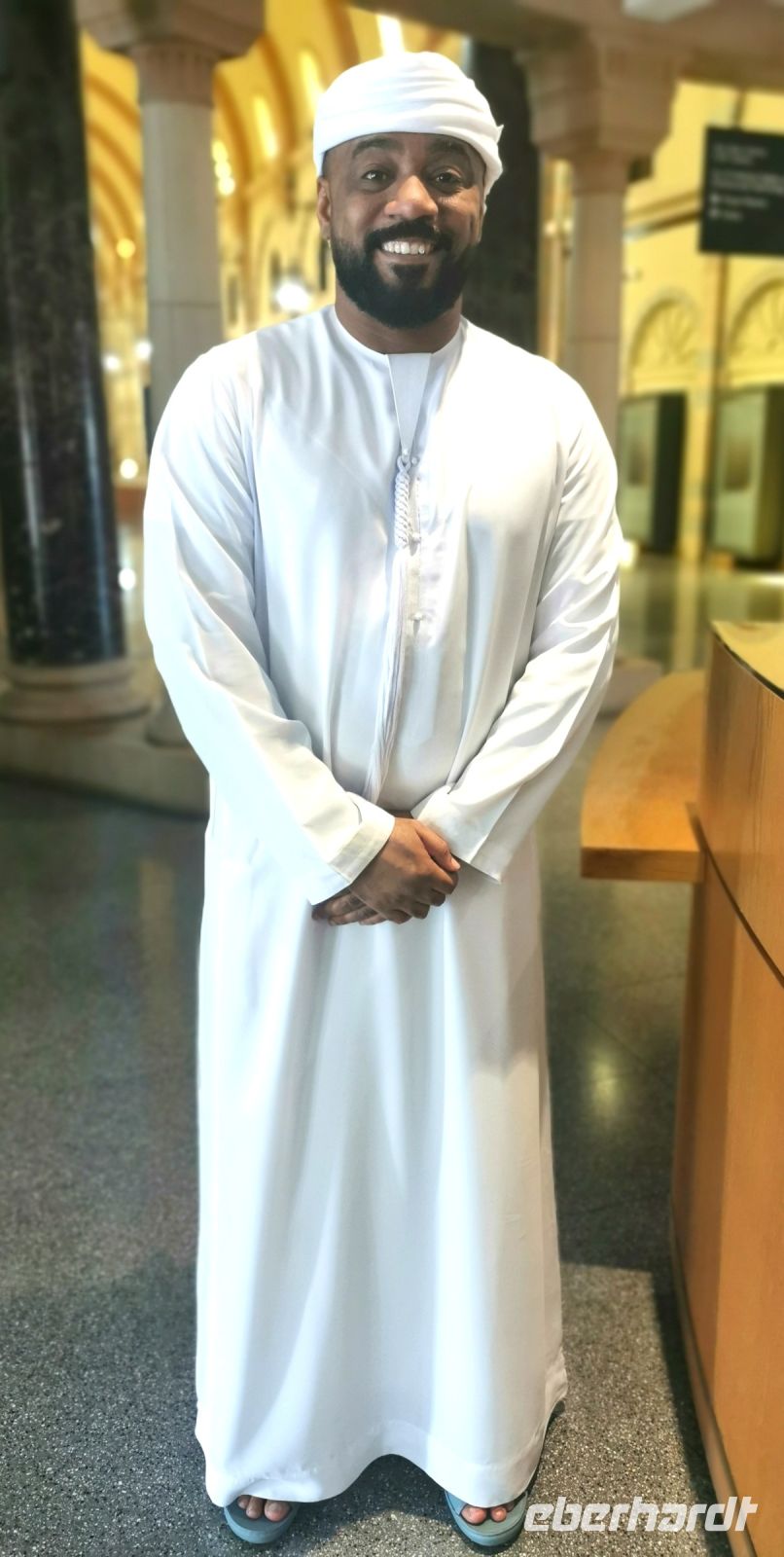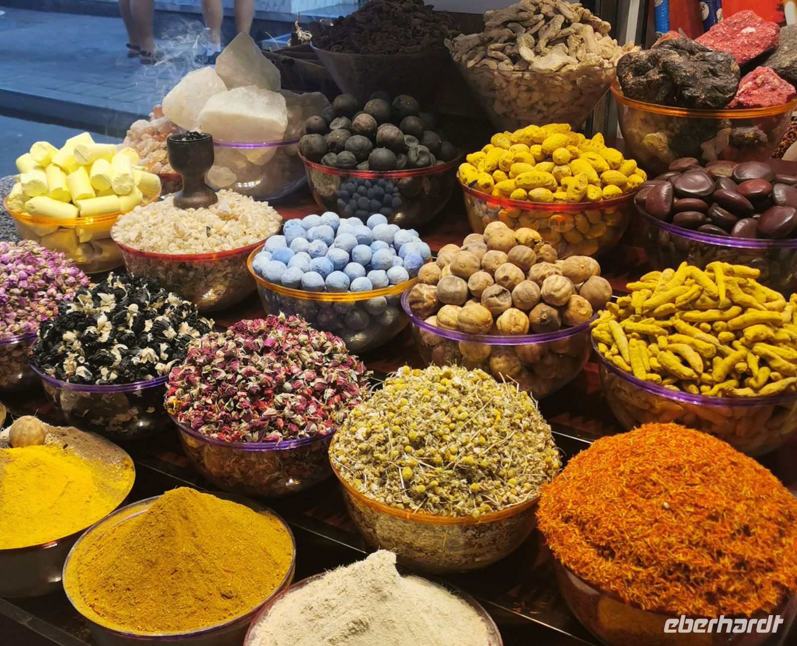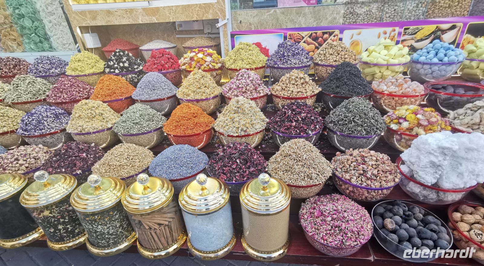Jetzt überqueren wir den Creek mit einer Abra, dem Wassertaxi. Diese kleinen Boote werden sowohl von den Einheimischen als auch von Touristen genutzt und wir landen schnell auf der anderen Seite exakt vor dem alten Souq. Zuerst schlendern wir gemeinsam durch die Gassen und bleiben am größten goldenen Ring der Welt stehen, er wiegt sage und schreibe 64 Kilogramm und ist so groß, daß man ihn eher um den Bauch, als am Finger tragen könnte. Oft wird gefragt, was er kostet, aber er ist unverkäuflich. Gleich gegenüber des Gold Souq ist der Eingang zum Gewürzbasar. Die meisten Gewürze sind offen aufgeschichtet und man kann an den Ständen vorbeischlendern und die reichen Auslagen mit allen Sinnen genießen. Es gibt allerlei Tee, Kamelmilchschokolade, getrocknete Zitronen, Safranfäden aus dem Iran, Weihrauch aus dem Oman, Pfeffer und Muskatnüsse aus Indien, Minze, Oregano, Kumin und und und. Alle Gäste dürfen nach Ibrahims Erläuterungen nach Belieben entweder die Goldauslagen studieren oder eben an den Gewürzständen probieren und etwas für zu Hause mitnehmen. Mit einigen Damen gehen wir in den großen Laden der einheimischen Kamelmilchschokoladenhersteller und etliche Tafeln werden als Mitbringsel erstanden.