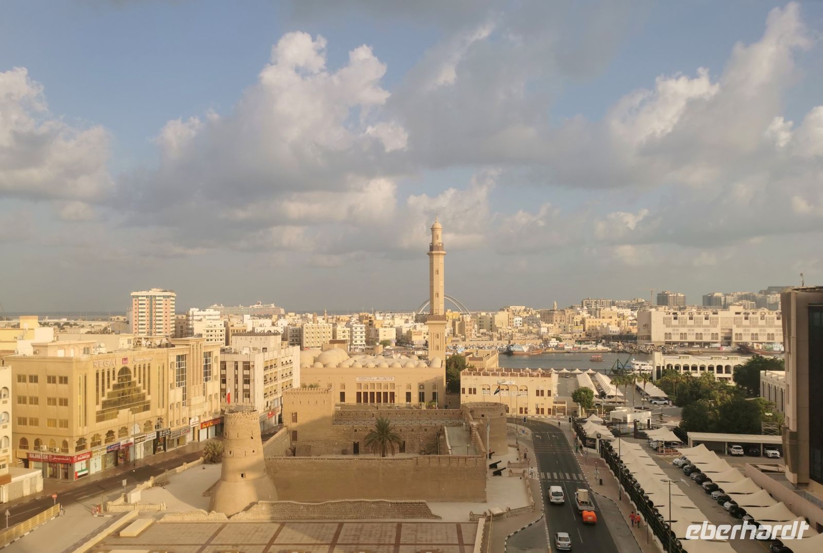 Schnell passieren wir nach der Ankunft die Einreisekontrolle, erhalten unkompliziert unsere Visa und die Koffer lassen ebenfalls nicht lange auf sich warten. Ibrahim holt uns am Flughafen Dubai ab und nach nur 20minütiger Fahrt erreichen wir unser Hotel, welches mitten in der Altstadt, gegenüber des Dubai Museums und des Creek liegt, einem Meeresarm, der durch Dubai fließt. Durch die dreistündige Zeitverschiebung sind wir erst kurz nach Mitternacht am Hotel und schnell ziehen sich alle Gäste zurück und wollen ausruhen.