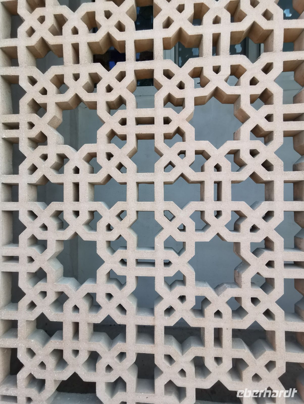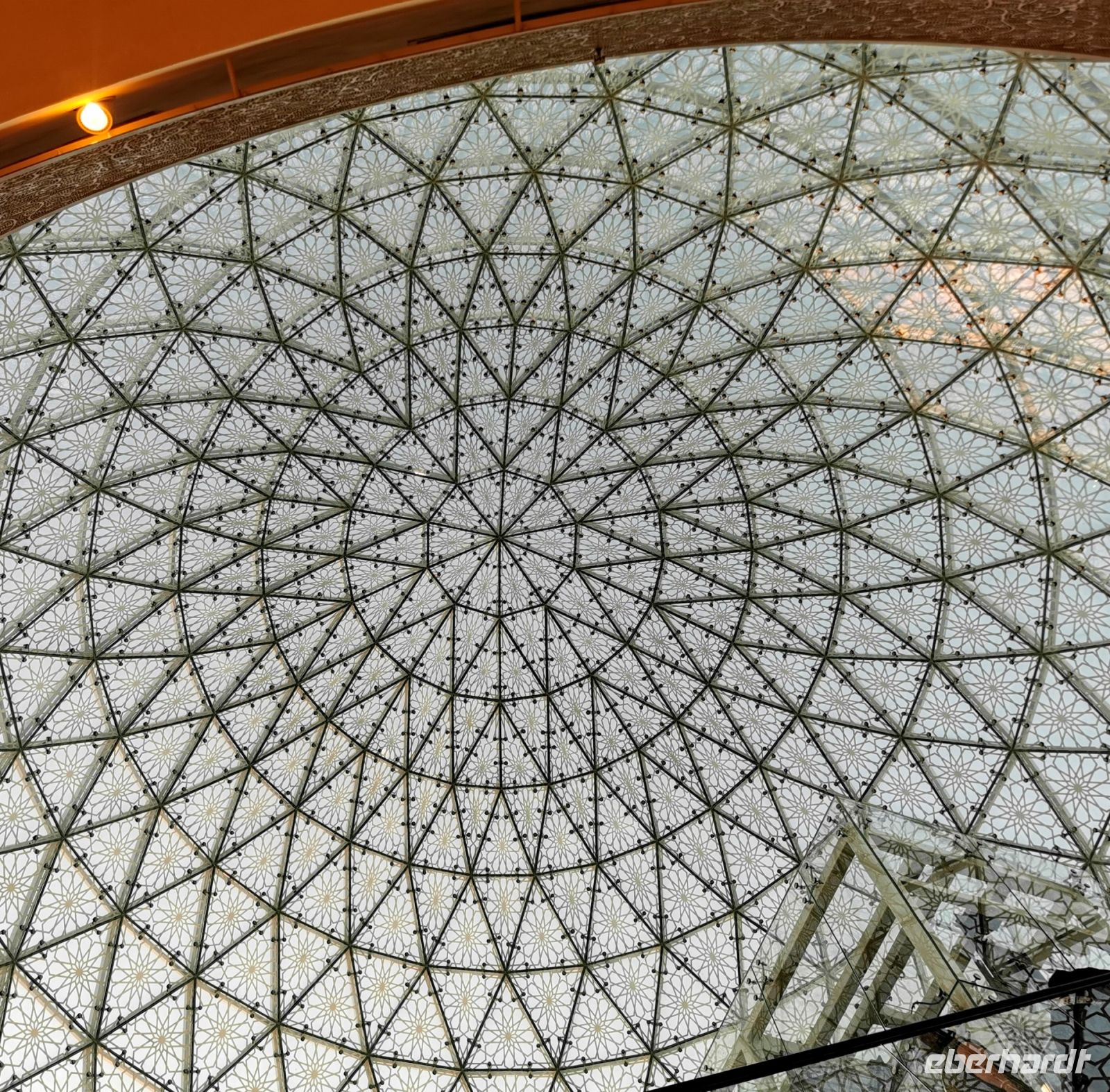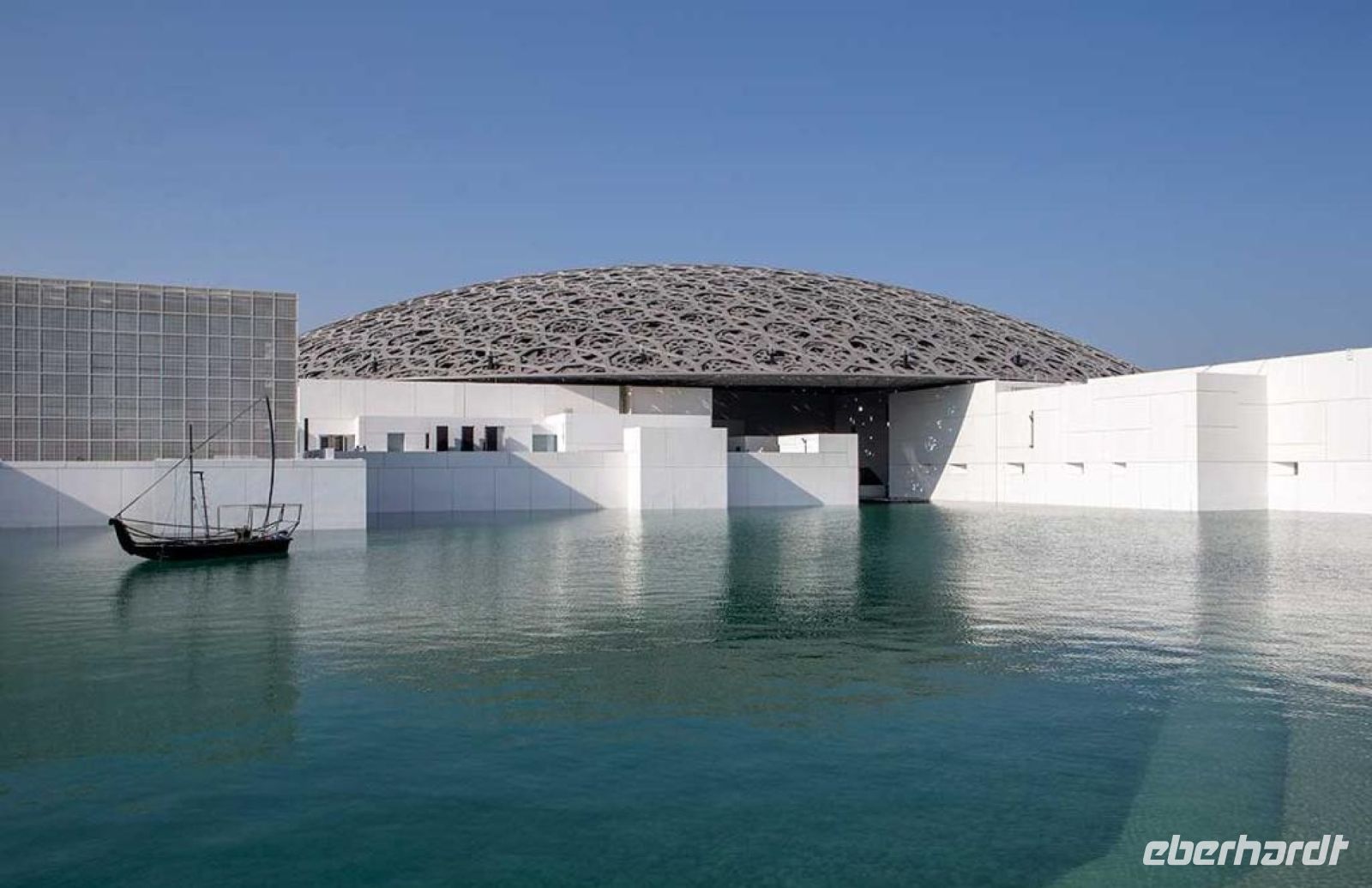 Im Anschluß an diese interessante Führung halten wir am Louvre Abu Dhabis. Diese "Schwester" der Pariser Kunstausstellung kooperiert eng mit dem Louvre in Paris und die Emirate zahlen viel viel Geld an Frankreich, um den gleichen Namen nutzen zu dürfen. Es versteht sich von selbst, daß der Architekt des Louvre in Abu Dhabi ein Franzose war. Seit 2017 kann man hier Kunst und Exponate angefangen von ägyptischen Mumien, alten sumerischen Tontafeln, Bildern aller bekannten Impressionisten und Expressionisten, Svarowski-Installationen und noch Etliches mehr bestaunen.