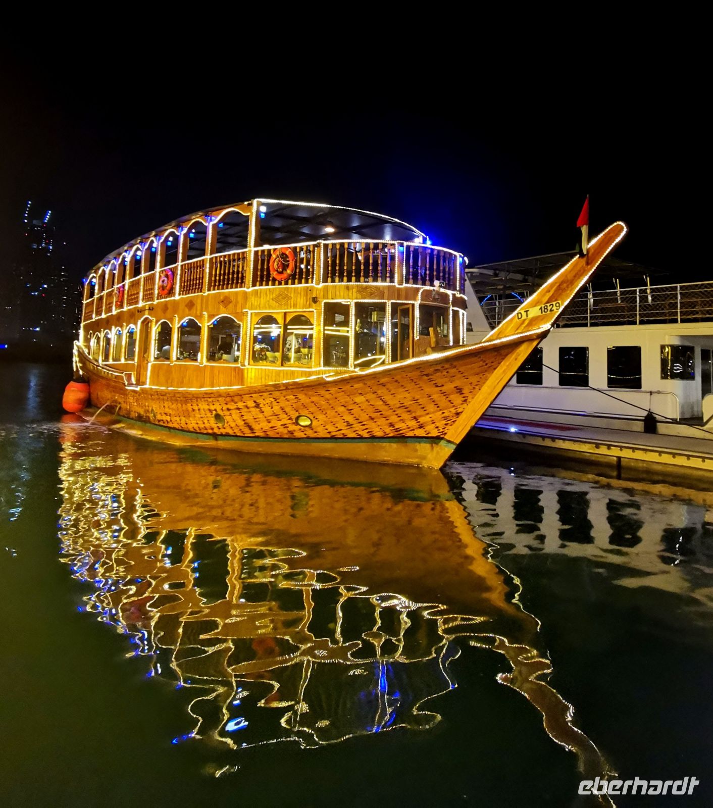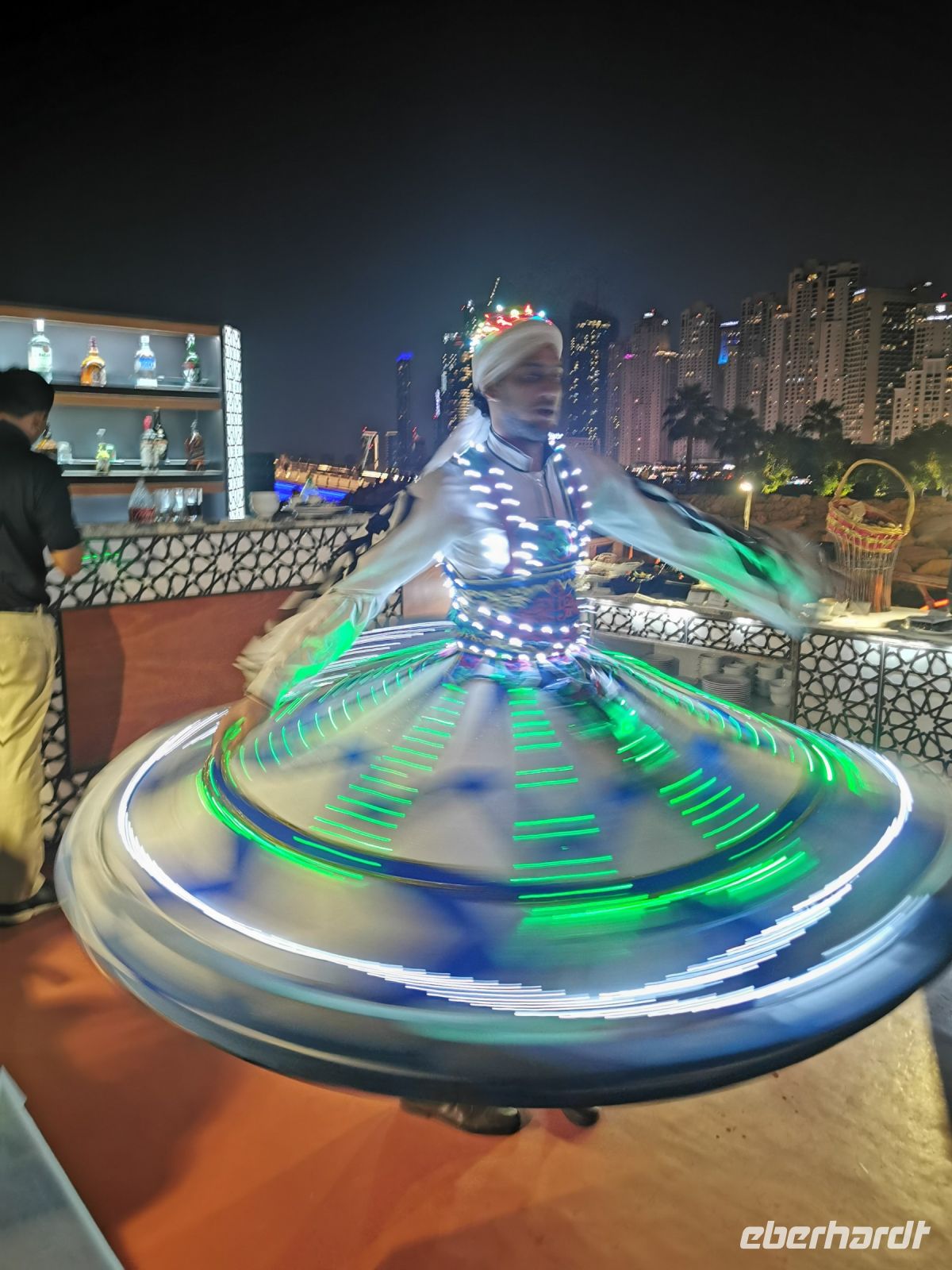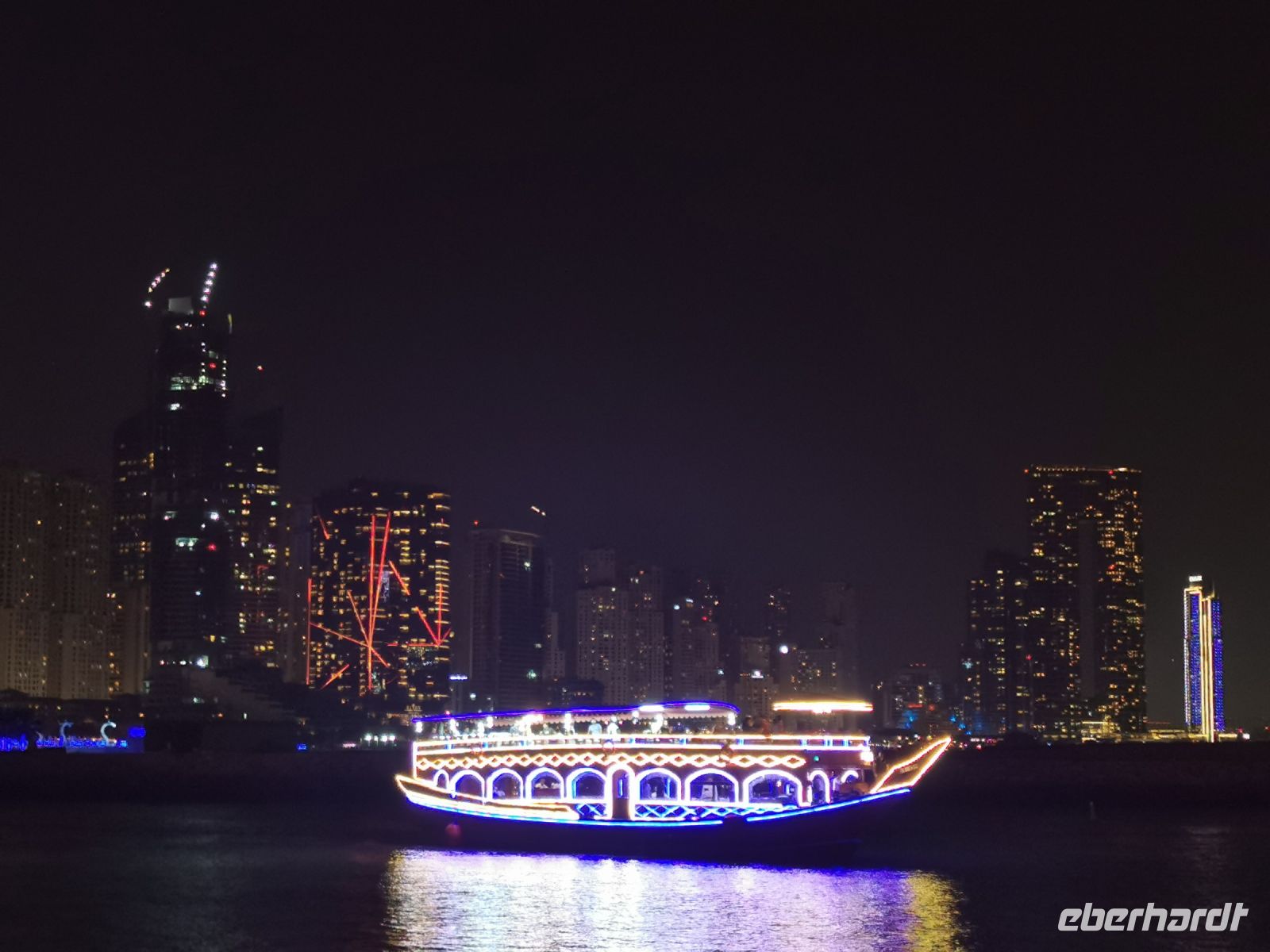 Als es dunkel geworden ist, fahren wir zur Dubai Marina, wo uns unser Ausflugsboot schon erwartet, unser heutiges Abendessen ist auf einer Dhau und währenddessen fahren wir in der Dubai Marina und können die Aussicht auf die Wolkenkratzer, die atemberaubende Skyline und das größte Riesenrad der Welt bewundern. Die Kulisse ist üppig beleuchtet, manche Häuser glitzern wie Diamanten und das Riesenrad zeigt eine Lichtinstallation mit Herzen und dem Schriftzug von Dubai. Sogar eine Tanzvorführung mit leuchtenden Röcken dürfen wir erleben. Ein absolutes Highlight dieser Reise.