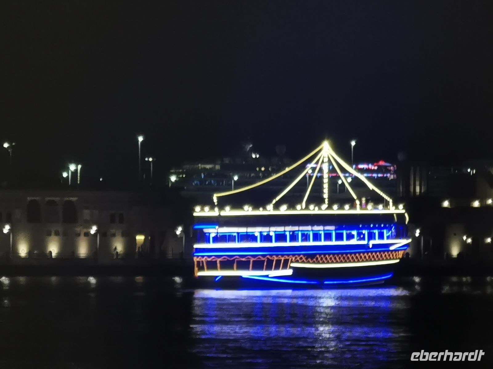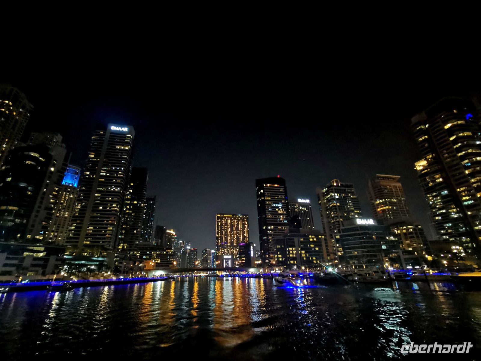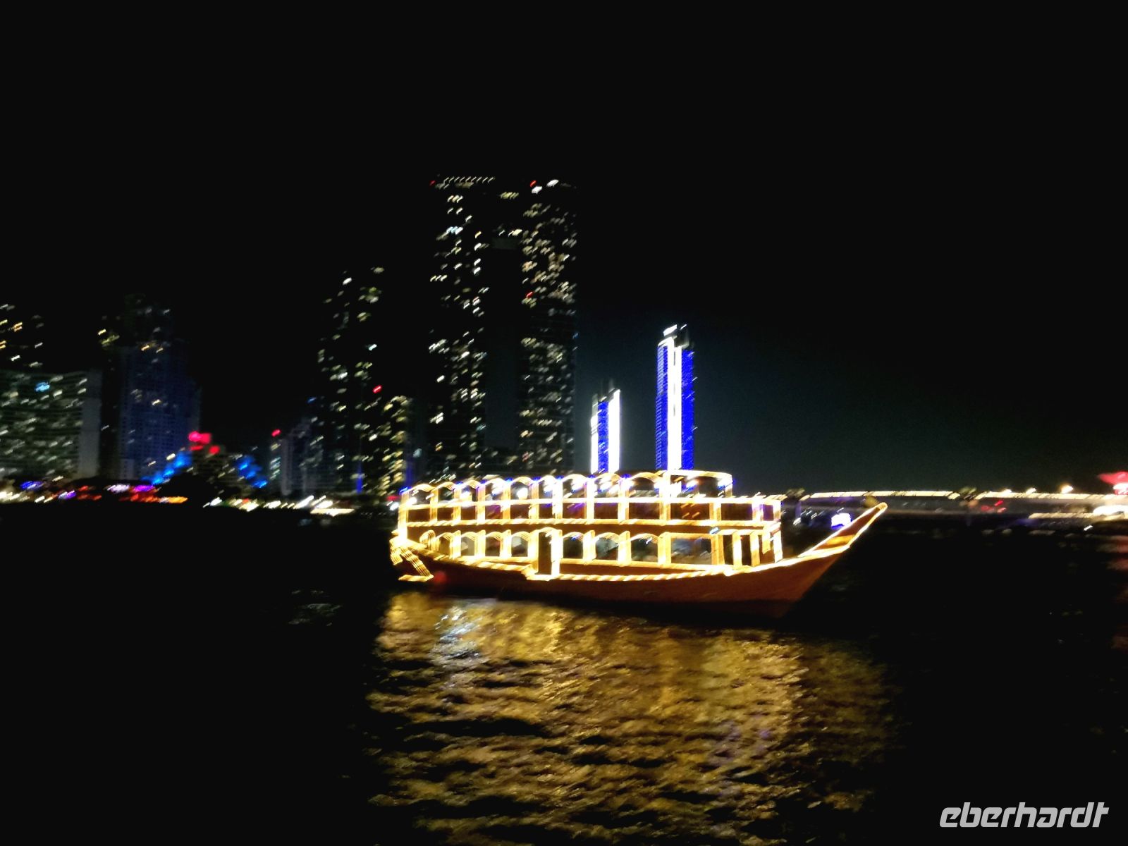 Als es dunkel geworden ist, fahren wir zur Dubai Marina, wo uns unser Ausflugsboot schon erwartet, unser heutiges Abendessen ist auf einer Dhau und währenddessen fahren wir in der Dubai Marina und können die Aussicht auf die Wolkenkratzer, die atemberaubende Skyline und das größte Riesenrad der Welt bewundern. Die Kulisse ist üppig beleuchtet, manche Häuser glitzern wie Diamanten und das Riesenrad zeigt eine Lichtinstallation mit Herzen und dem Schriftzug von Dubai. Sogar eine Tanzvorführung mit leuchtenden Röcken dürfen wir erleben. Ein absolutes Highlight dieser Reise.