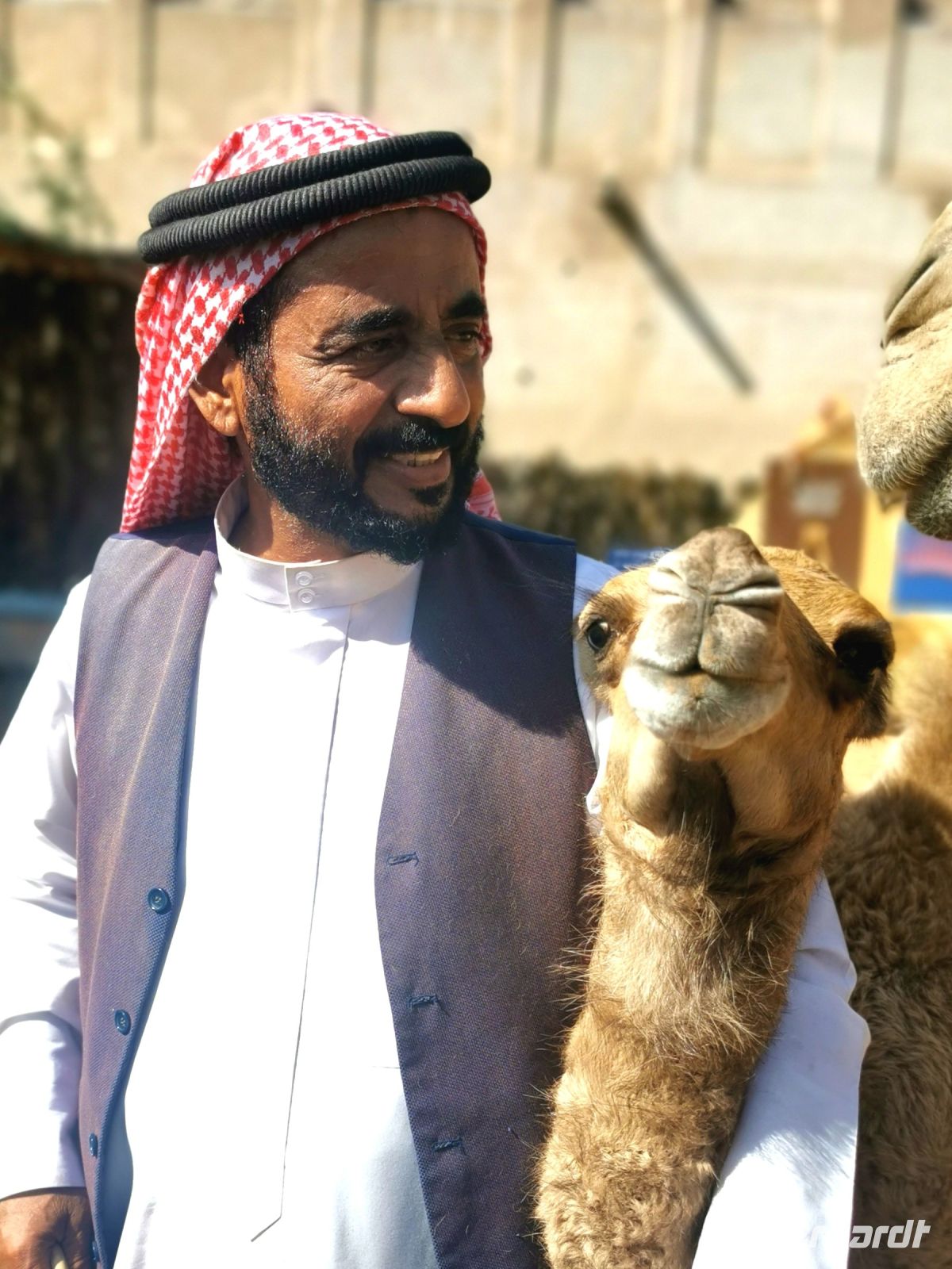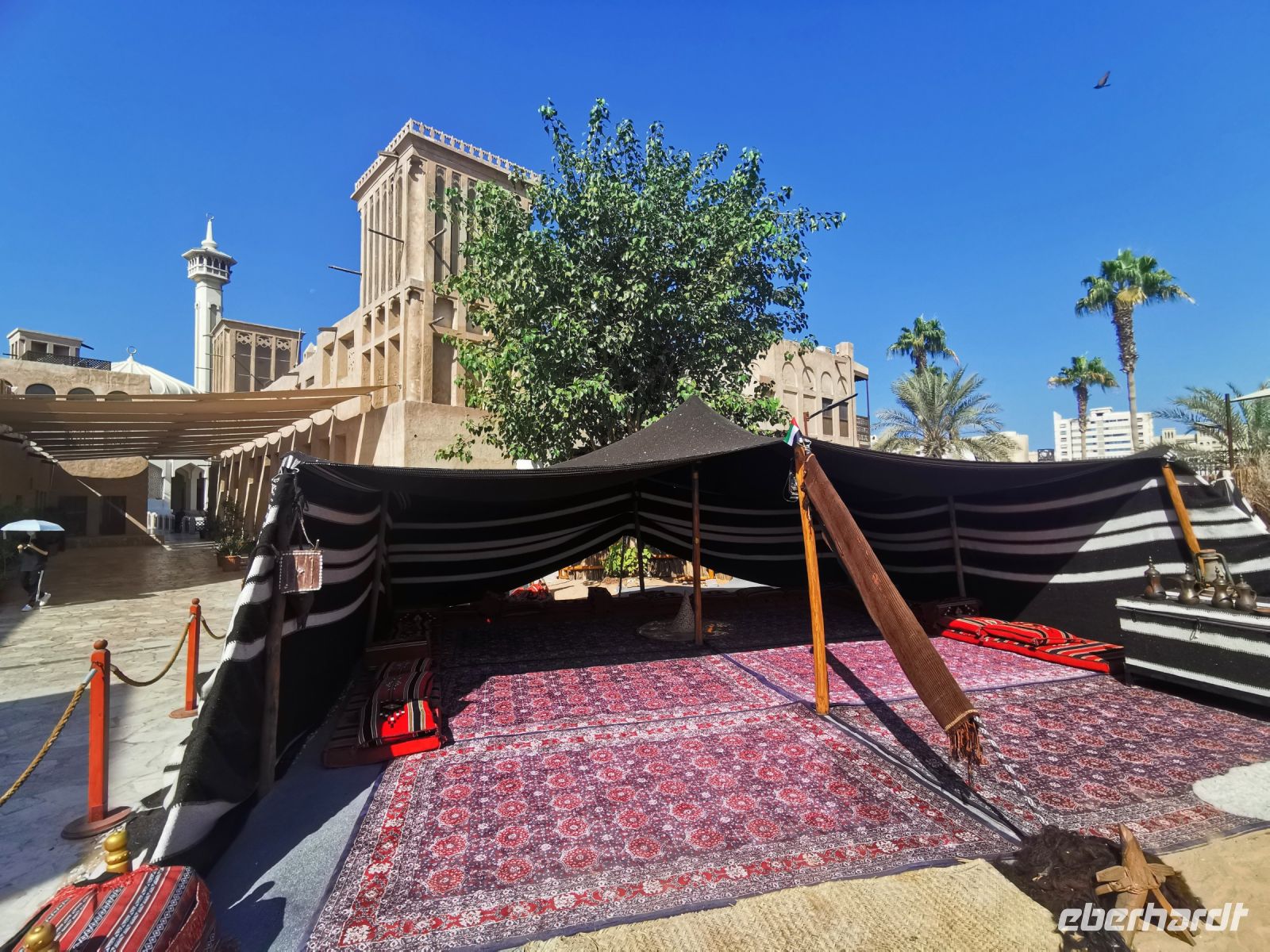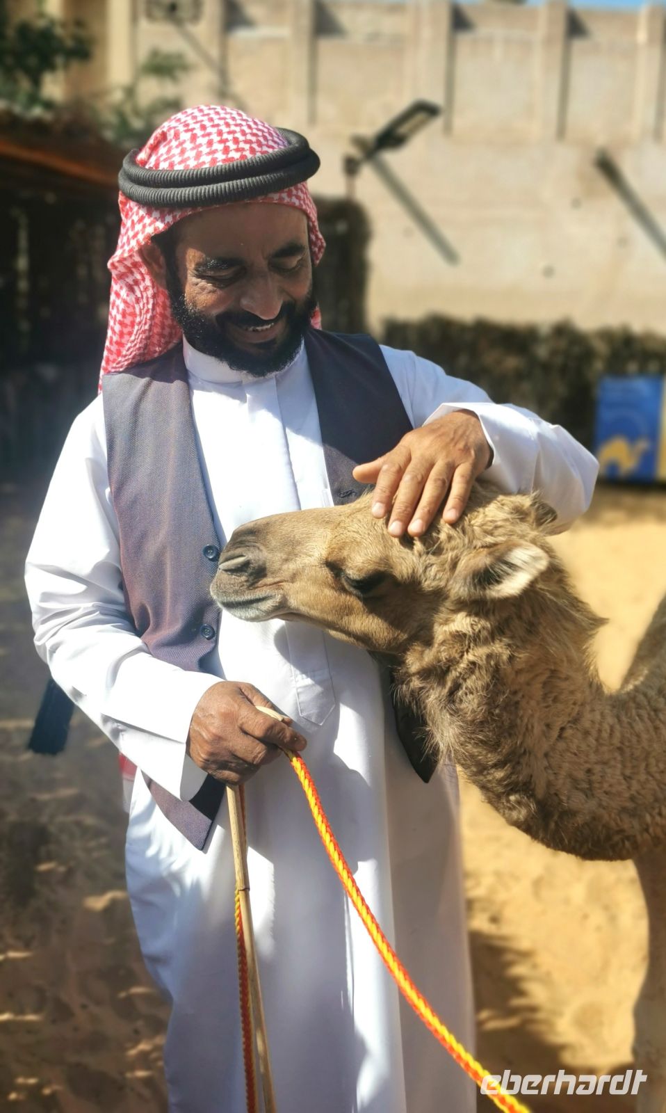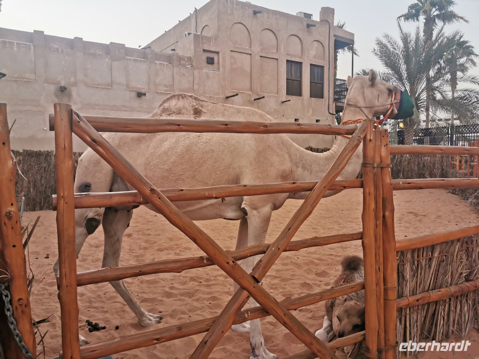 Im Kaffeemuseum können wir einen weiteren lebendigen Einblick bekommen, wie das Leben auf der arabischen Halbinsel in den 1950er Jahren abgelaufen ist und wie man Kaffee auf traditionelle Weise zubereitet hat, nämlich auf heißem Sand und Feuer. Gleich daneben kann man ein traditionelles Wohnhaus besuchen und wir können uns nun gut vorstellen, wie es in Dubai ausgesehen haben muß, bevor der Ölboom einsetzte. Am Ausgang von Bastakiya steht ein Freund von Ibrahim, der uns seine zwei Kamele vorstellt, eine Kameldame um genauer zu sein, mit ihrem Baby. Das ist natürlich ein Ereignis und viele Fotos werden geschossen.