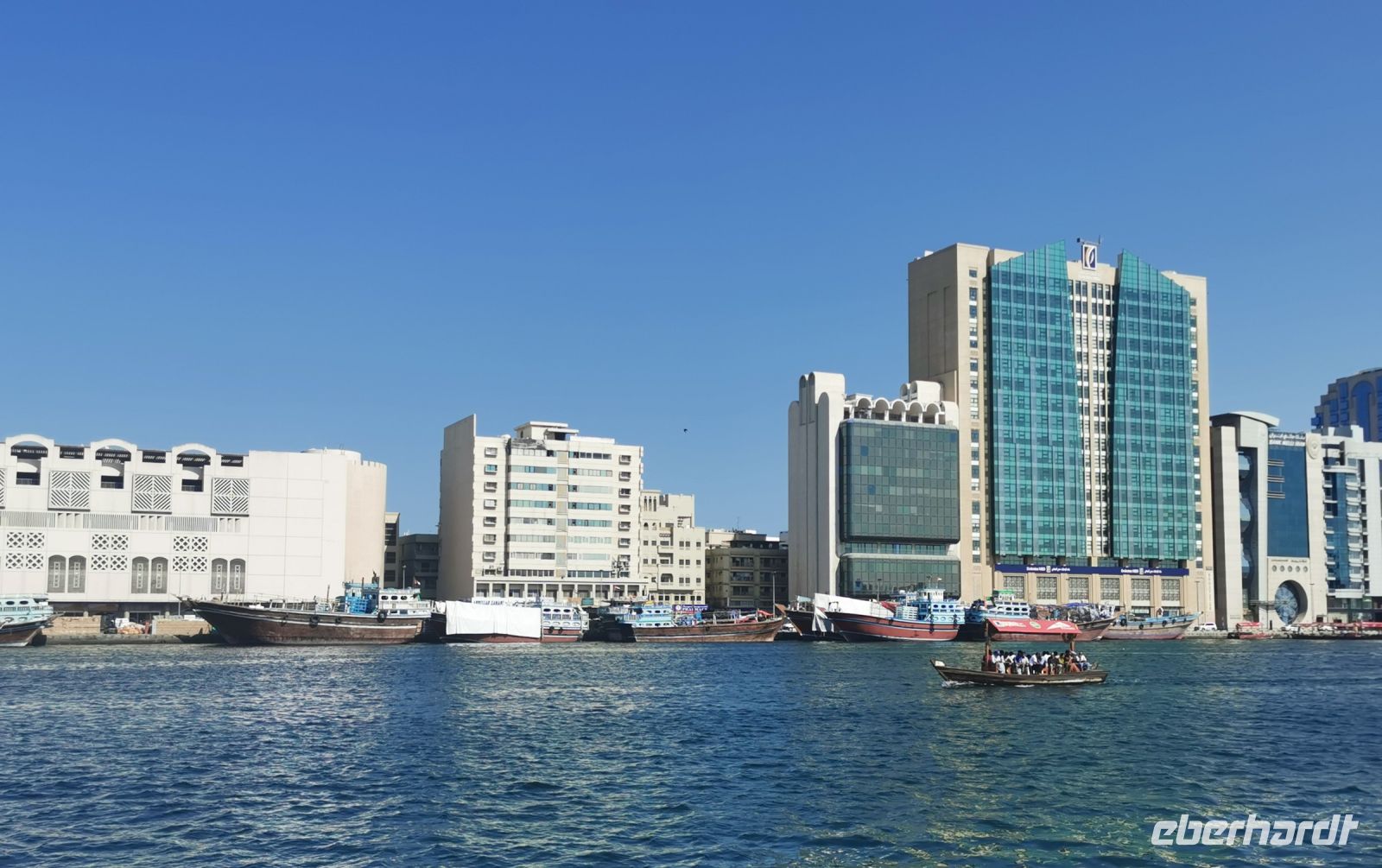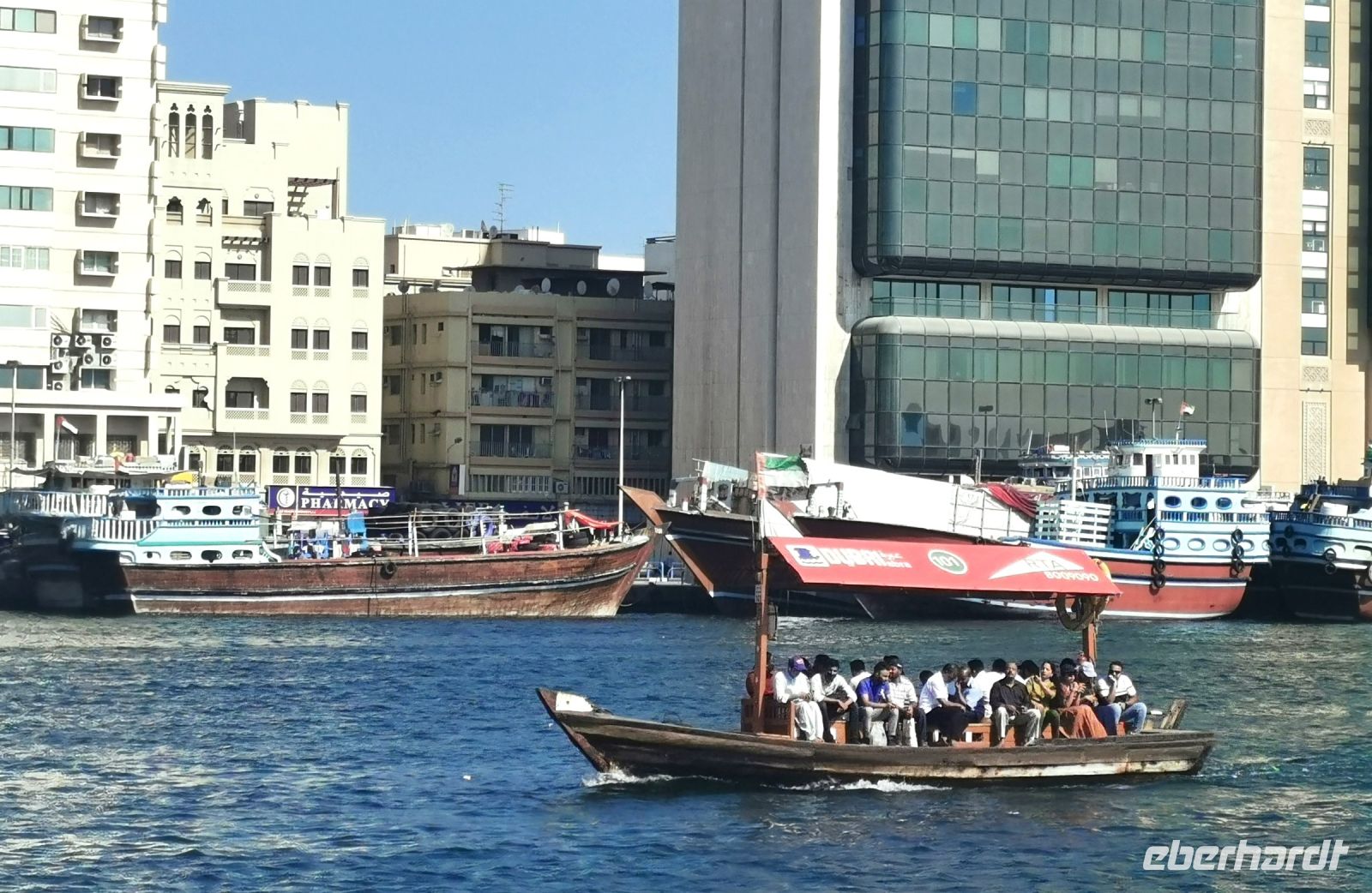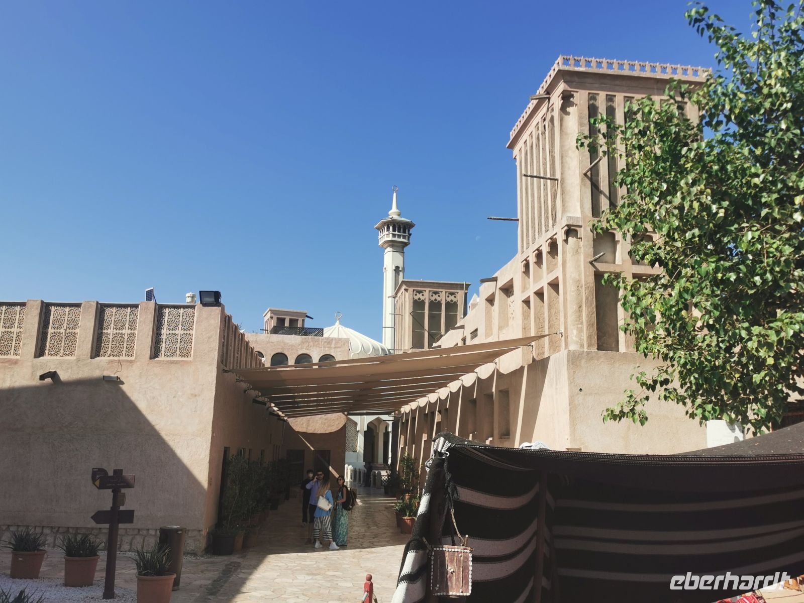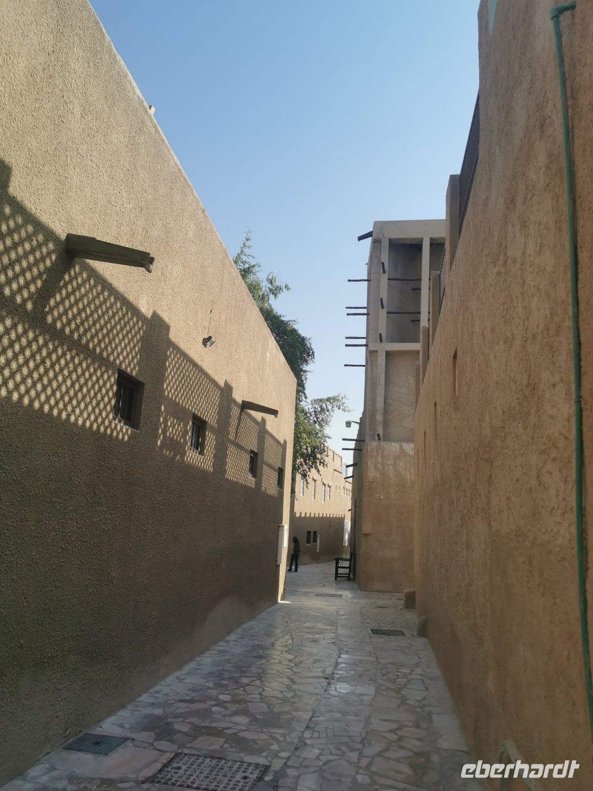 Am heutigen Morgen laufen wir vom Hotel in Richtung der nah gelegenen Altstadt zum Creek hinunter, dem Meeresarm, der durch Dubai fließt und der die Lebensader des alten traditionellen Teils der Stadt ist. Hier sieht man noch die Lehmbauten, die es in fast allen orientalischen Altstädten einstmals gab, Windtürme kühlten die Luft der Häuser auf angenehme Innentemperaturen hinunter, als es noch keinen Strom gab und inmitten des Viertels war der Bazar mit allen kleinen Lädchen, die Waren feilboten, die man zum Alltagsleben brauchte.