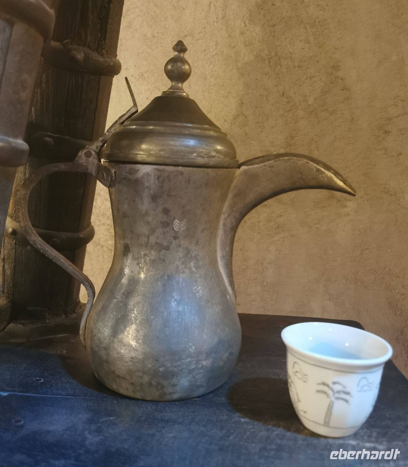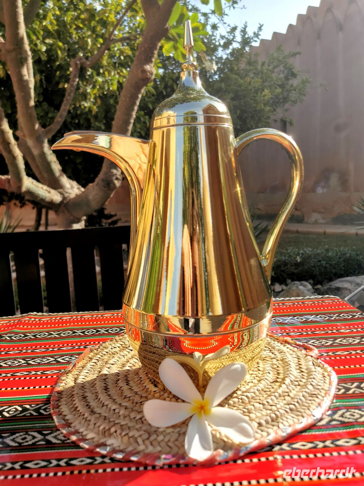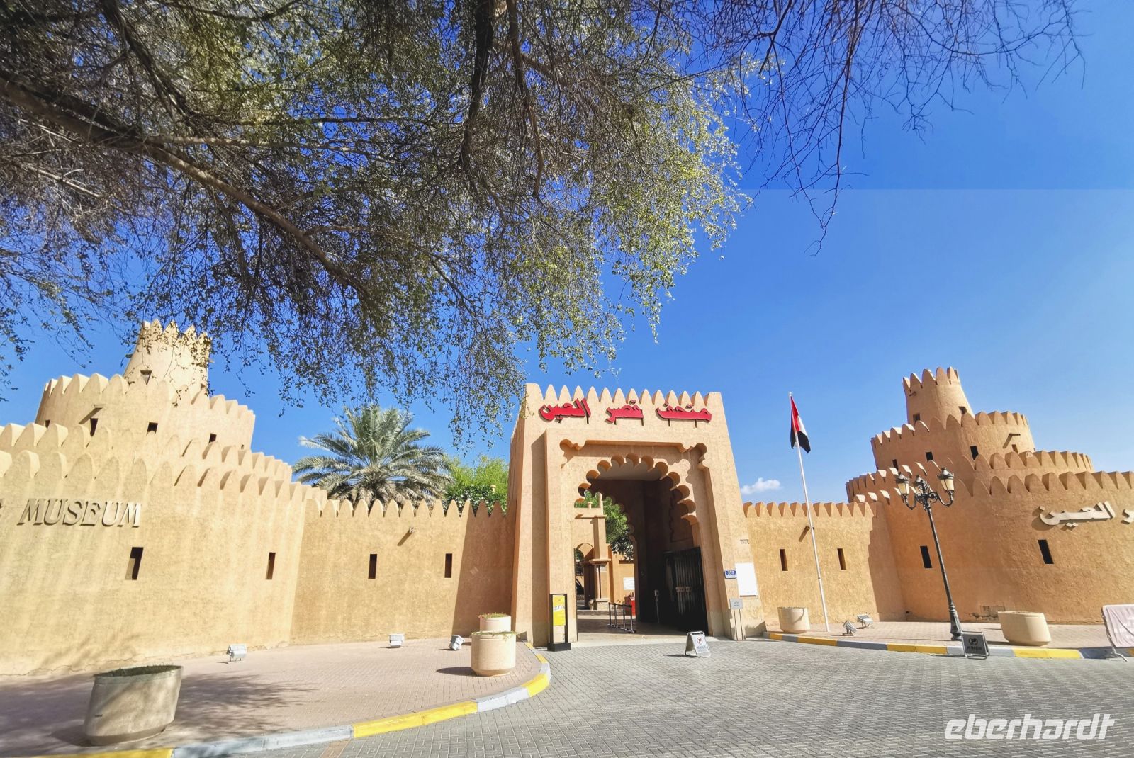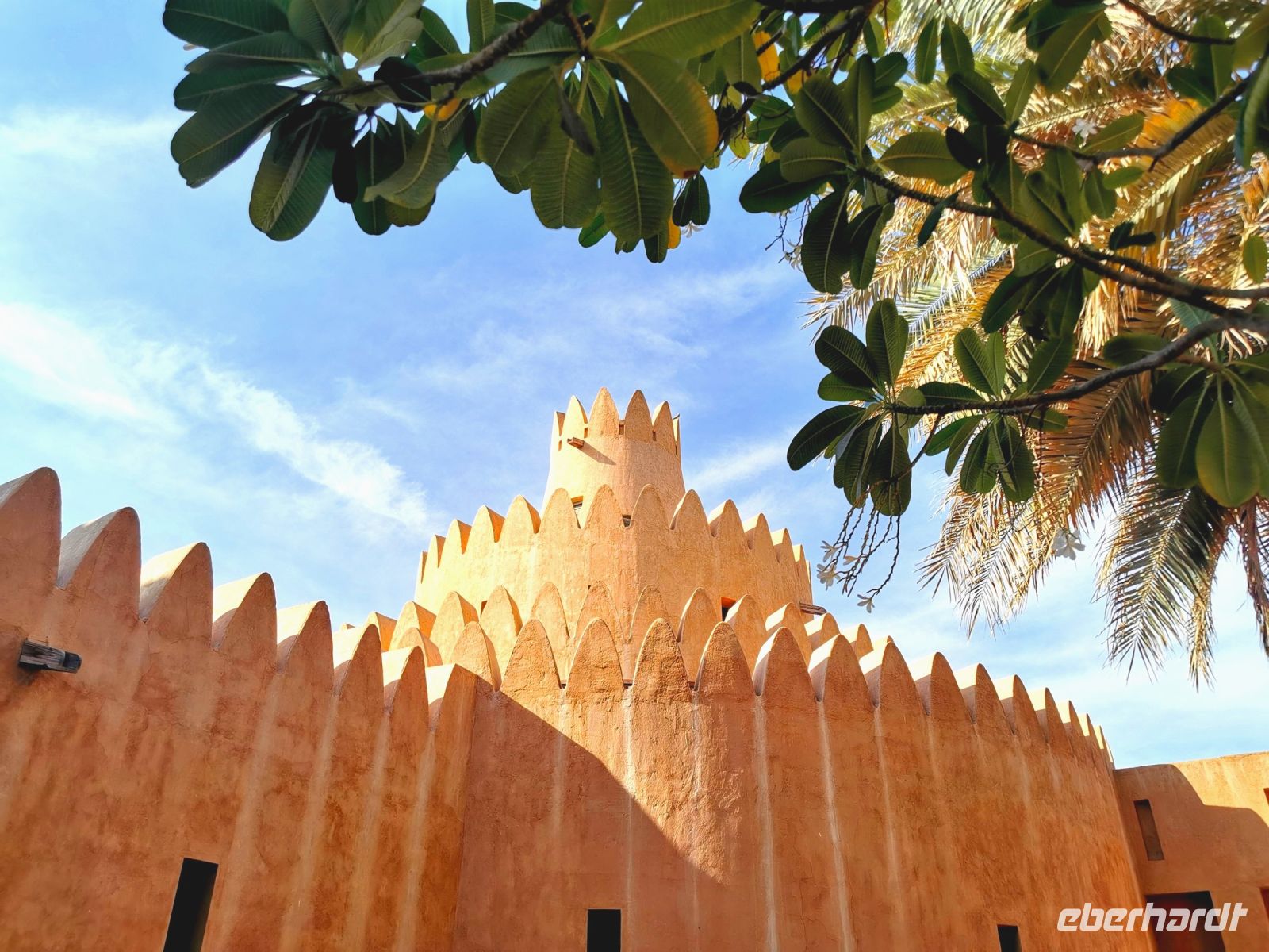 Nach diesem Fotostopp fahren wir zu den Hili-Gärten, die wir heute besuchen wollen. Zu ihnen gehört das archäologische und historische Palastmuseum Al Ain (Qasr al-Ain). Es liegt in einer der besterhaltenen Festungen des Emirates und zeigt das Alltagsleben des verstorbenen Herrschers Sheikh Zayed und seiner Familie, die hier höchstselbst bis 1966 residierte. Die gesamte Anlage ist im Beduinenstil errichtet worden. In den Innenhöfen gibt es große Schatten spendende Bäume, an denen Wasserkrüge hängen, in denen das wichtige Naß kühl gehalten wurde in Zeiten ohne Kühlschrank. Ein Beduinenzelt mit alten Kaffeekannen läßt erahnen, wie das Leben hier bis in die 1960er Jahre war.