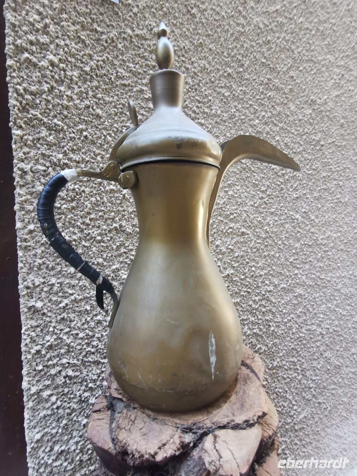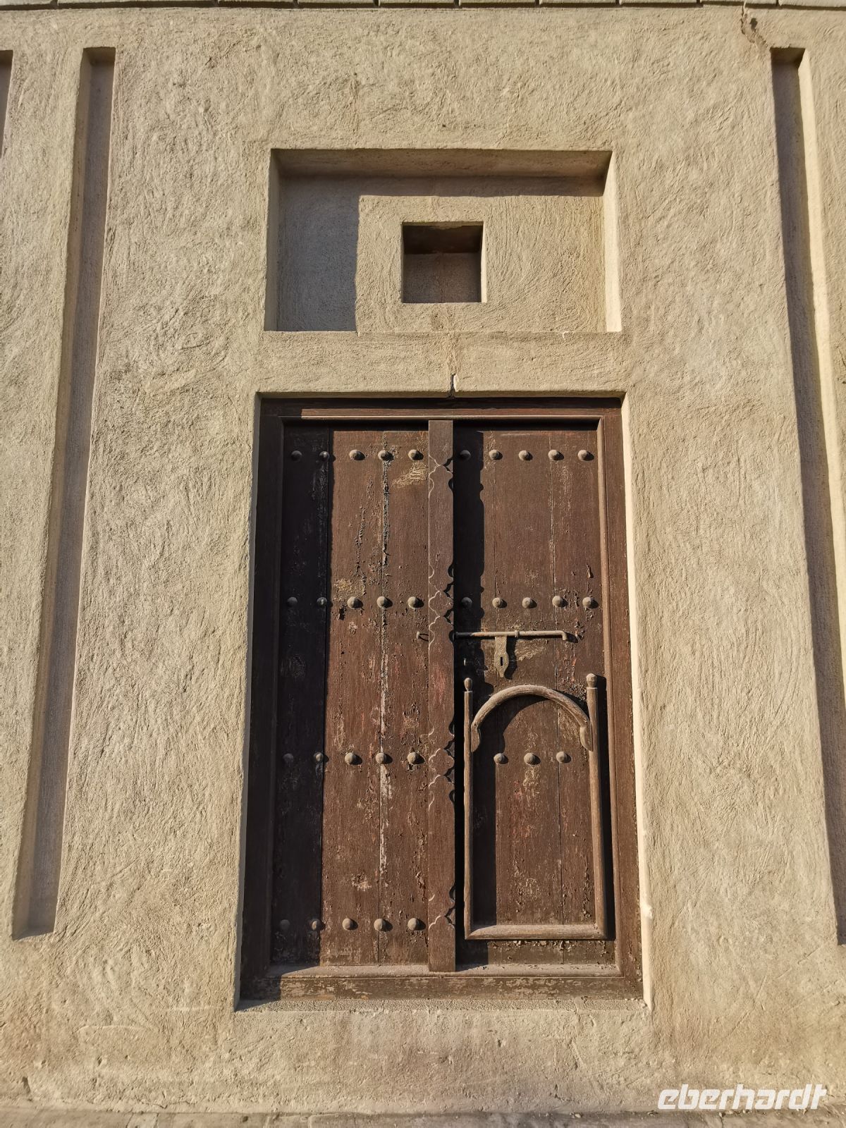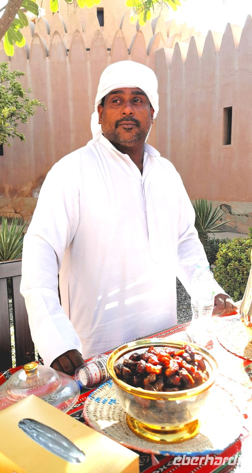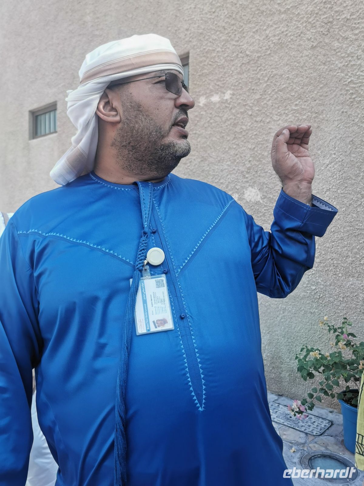 Nach diesem Fotostopp fahren wir zu den Hili-Gärten, die wir heute besuchen wollen. Zu ihnen gehört das archäologische und historische Palastmuseum Al Ain (Qasr al-Ain). Es liegt in einer der besterhaltenen Festungen des Emirates und zeigt das Alltagsleben des verstorbenen Herrschers Sheikh Zayed und seiner Familie, die hier höchstselbst bis 1966 residierte. Die gesamte Anlage ist im Beduinenstil errichtet worden. In den Innenhöfen gibt es große Schatten spendende Bäume, an denen Wasserkrüge hängen, in denen das wichtige Naß kühl gehalten wurde in Zeiten ohne Kühlschrank. Ein Beduinenzelt mit alten Kaffeekannen läßt erahnen, wie das Leben hier bis in die 1960er Jahre war.