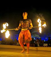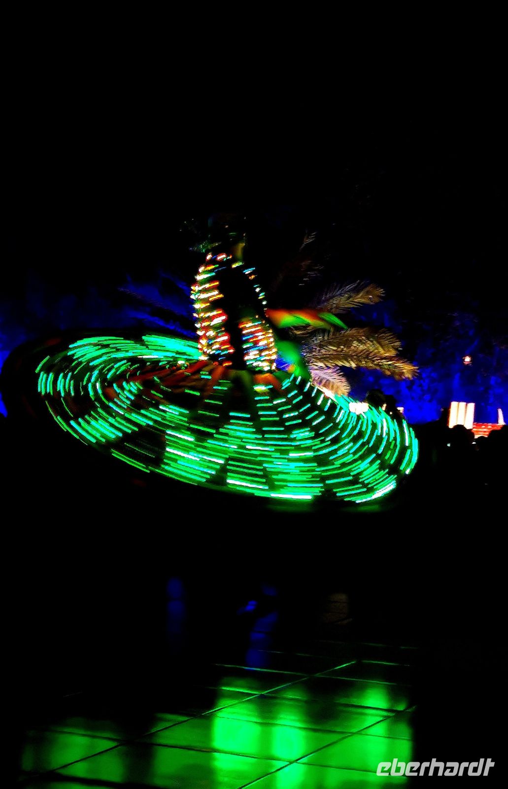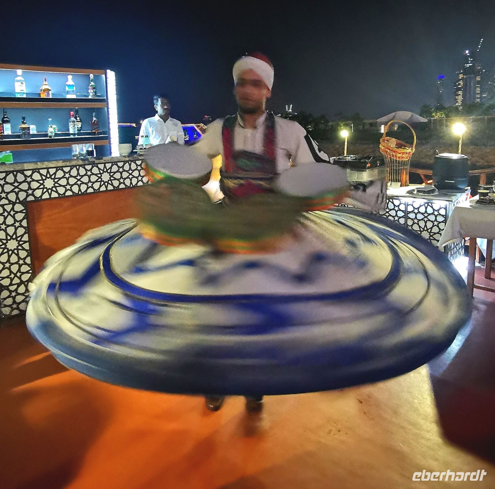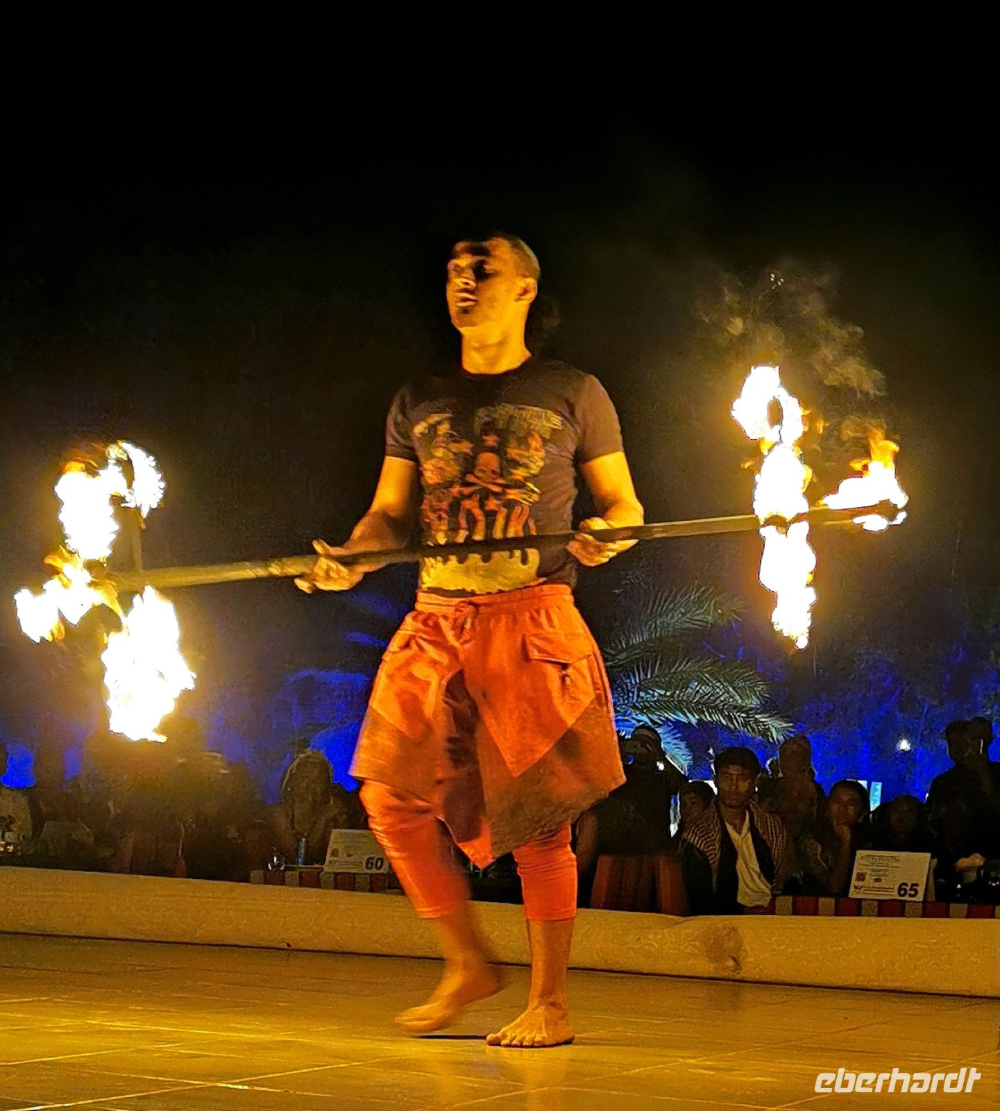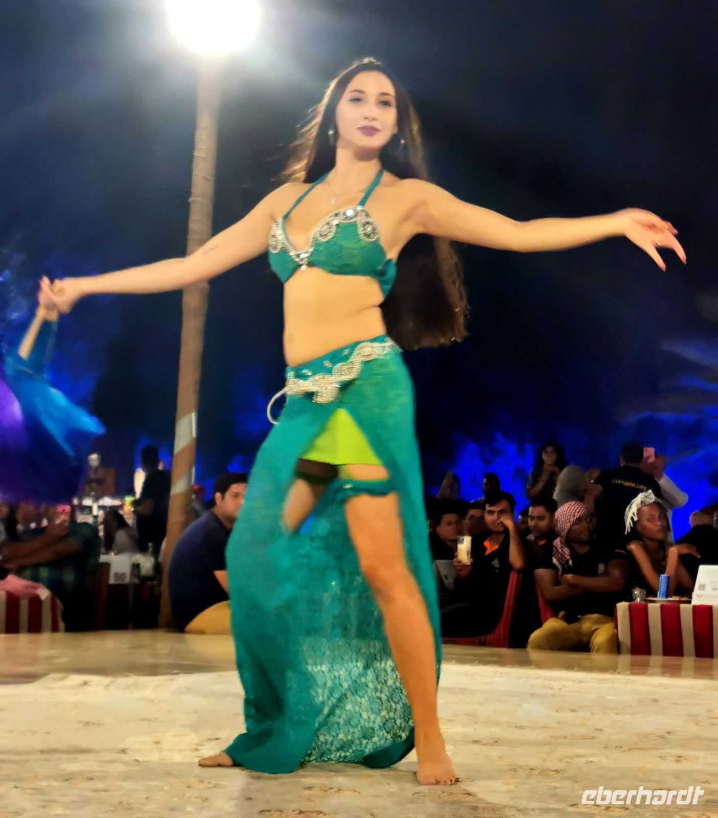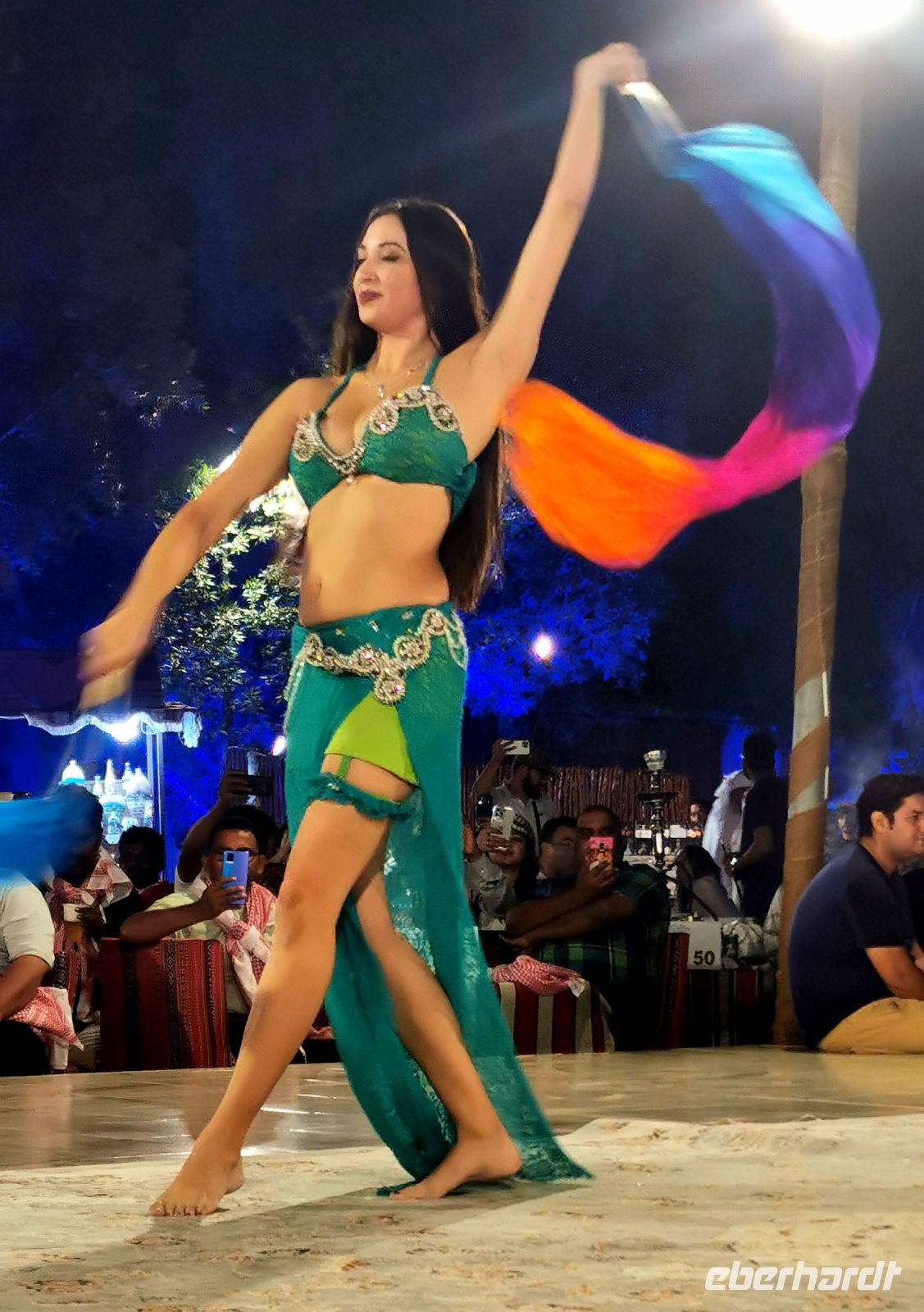 Auf der großen Bühne zeigt man uns zuerst einen Kingkongtanz. Danach bezaubert uns Abdallah mit seiner Tanzkunst. Er wirbelt wie ein Sufi im Kreis herum und hat dabei etliche Trommeln in Hand und Mund, mit denen er verschiedene Muster formt. Seine wehenden Gewänder sind sogar beleuchtet - sehr eindrucksvoll in der sonst dunklen Wüste. Wir lassen uns anschließend Hühnchenspieße vom Grill und Kebap schmecken und warten alle gespannt, was uns erwartet. Es gibt eine spektakuläre Feuershow und endlich kommt die lang ersehnte Bauchtänzerin. Eine dunkelhaarige sehr hübsche Dame vollführt Drehungen mit Hüfte, Bauch und Oberkörper.