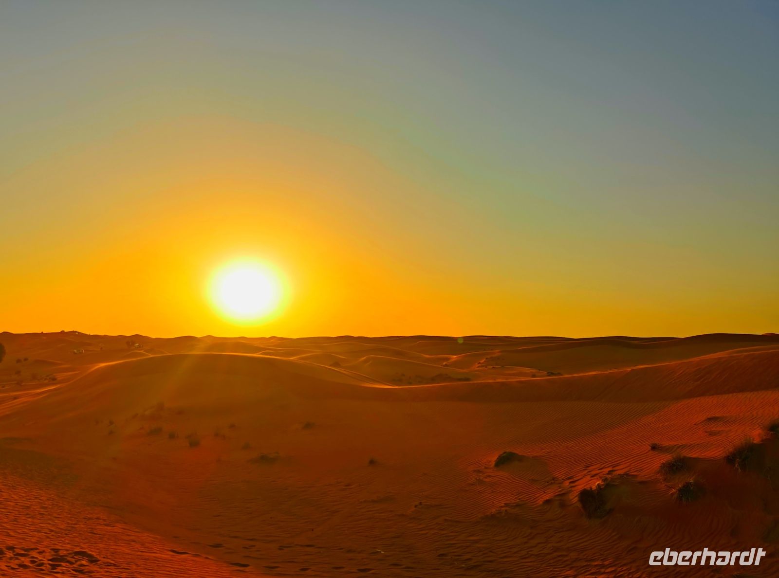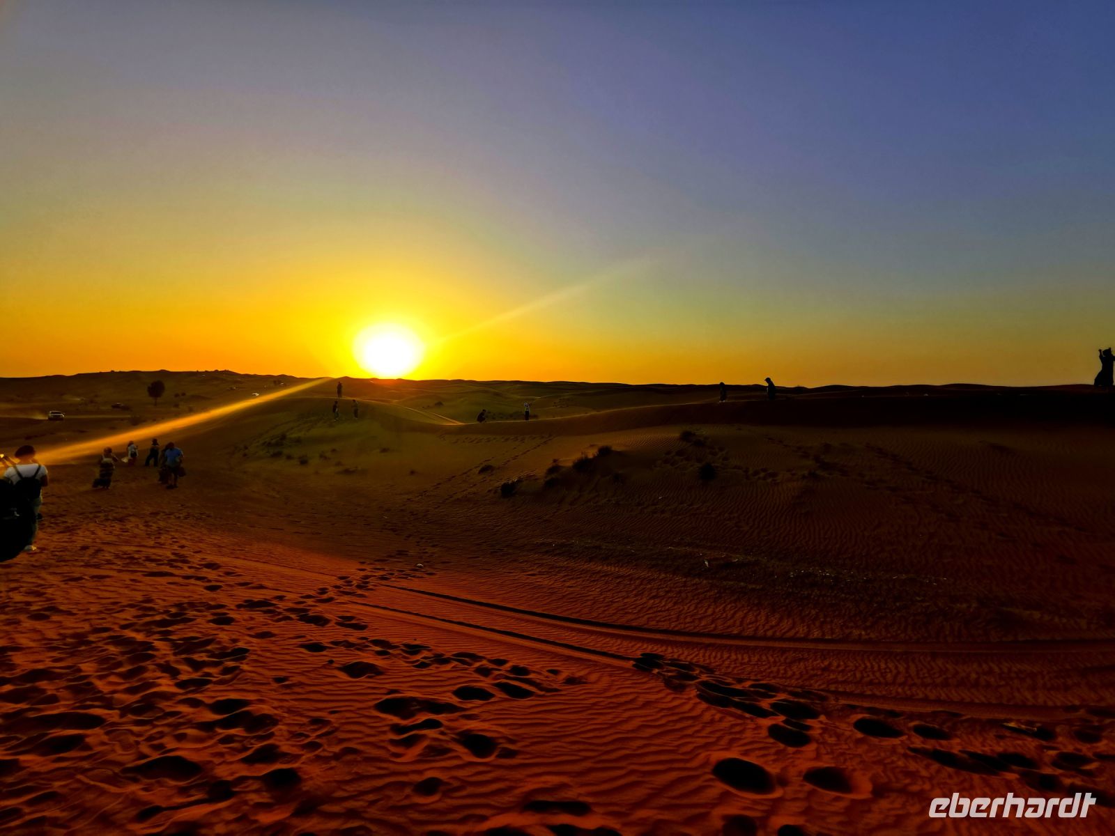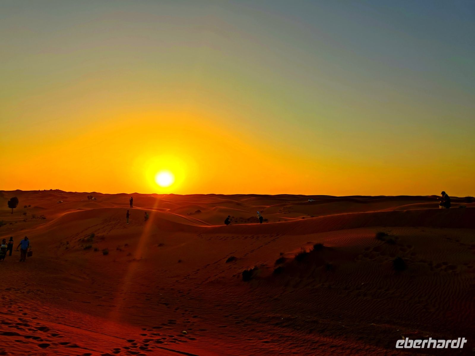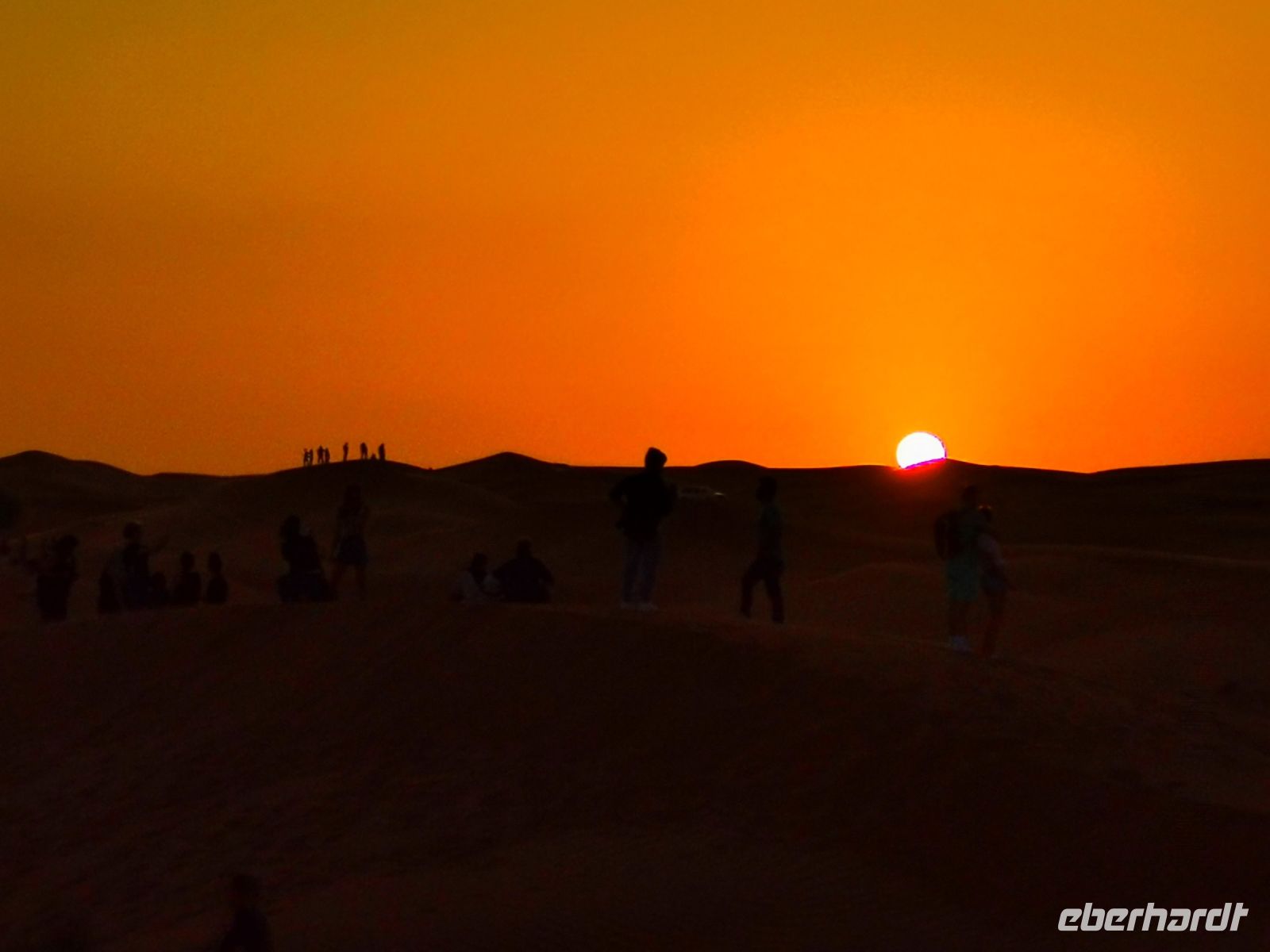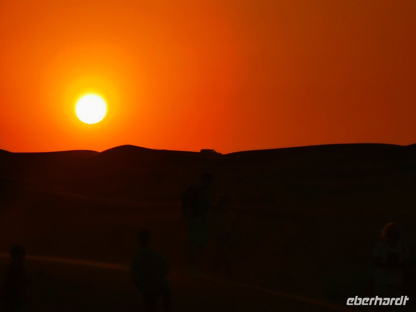 Ein Auf und Ab über die Dünen, unsere Fahrer zeigen, was sie können. In den weichen Ledersitzen läßt es sich bequem aushalten und wir staunen, zu was für Schräglagen solch ein Jeep fähig ist, ohne zur Seite zu kippen. Zum Sonnenuntergang machen wir an den Dünen eine Pause und können nach Herzenslust im glutroten Abendlicht wunderschöne Fotos machen und die Stimmung in der Wüste ganz ohne Hochhäuser und Verkehrslärm genießen.