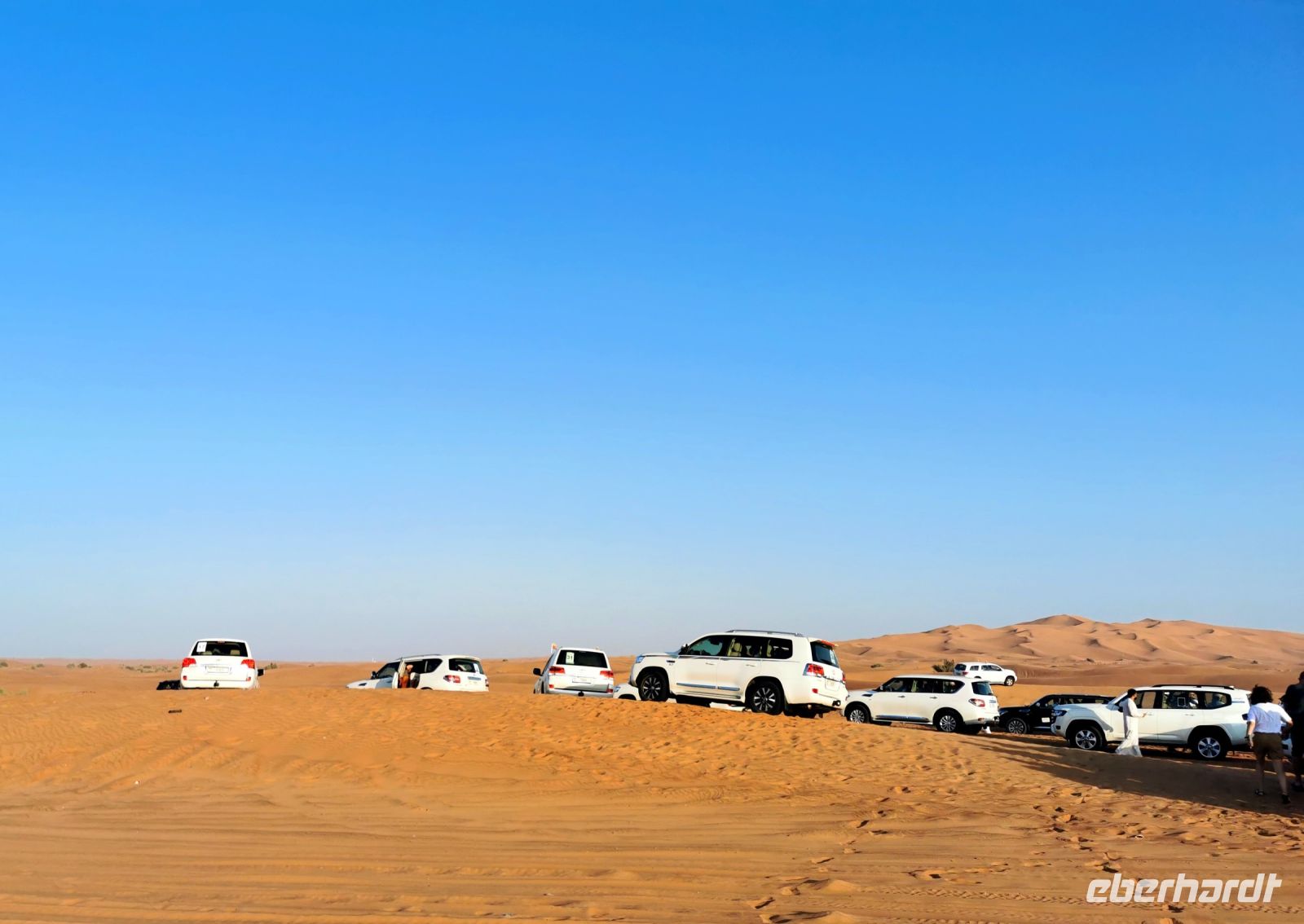 Nach diesem Erlebnis an Farben und Gerüchen überqueren wir wieder gemeinsam den Creek mit der Abra und laufen zurück zum Hotel, wo wir ein Mittagessen genießen, bevor es mit den Jeeps in die Wüste geht. Die Wüste ist der ursprüngliche Lebensraum der Menschen, die hier am Golf mit ihren Kamelen und Zelten jahrhundertelang durch die Wüste zogen. Wir starten mit den dicken Geschossen direkt vor dem Hotel. Bevor es vom Asphalt auf den Sand geht, wird Luft aus den Reifen gelassen, damit wir nicht in den Dünen stecken bleiben und schon gehts los.