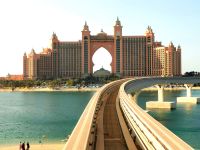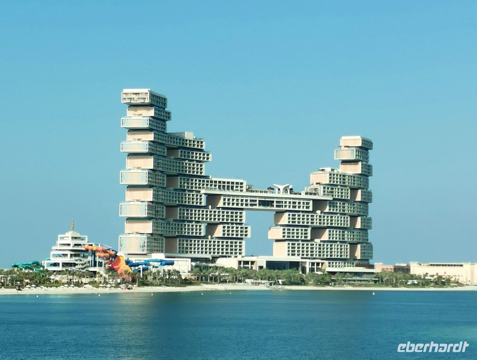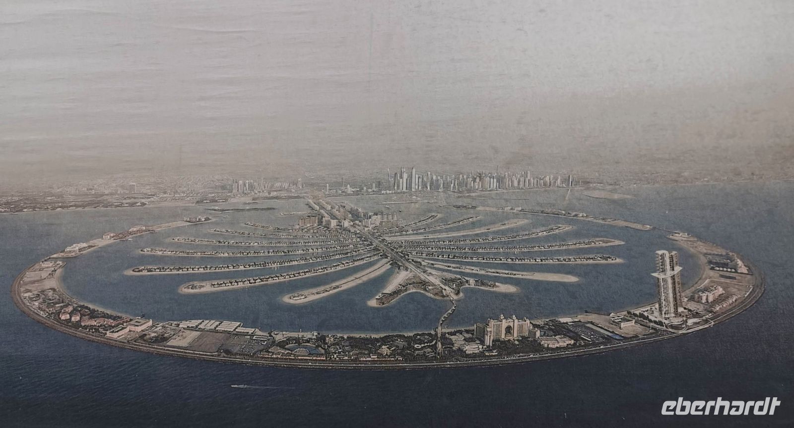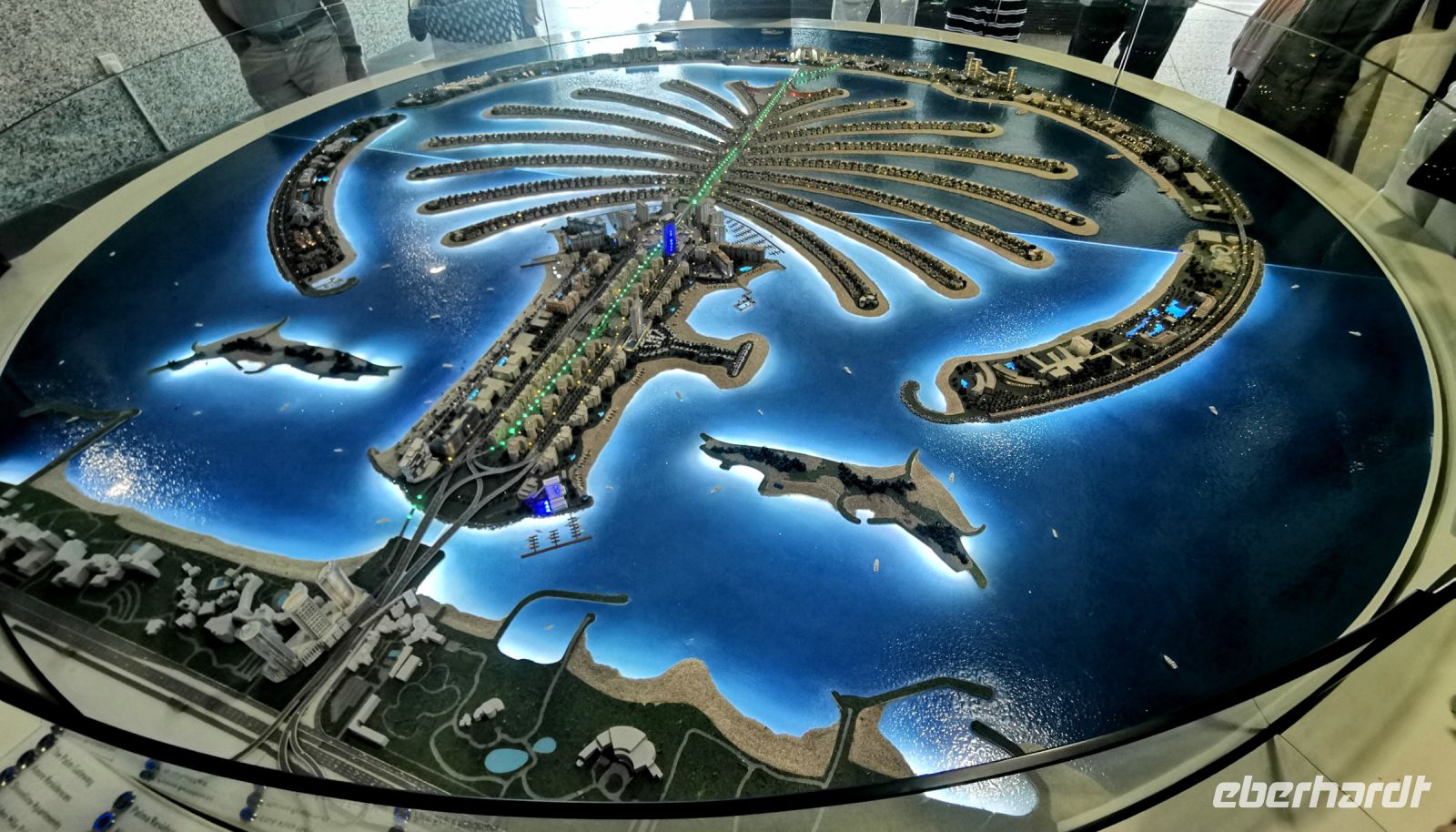Ein spannender Tag beginnt, zwei Gäste haben sich für einen Rundflug mit dem Hubschrauber über die Palm Jumeirah entschieden. So fahren sie heut Morgen auf dieses Wunder aus Sand und Stein: eine künstlich aufgeschüttete Insel in Form einer Palme, mitten im Meer. Die anderen Gäste genießen einen entspannten Morgen am Hotelpool und fahren am späten Vormittag ebenfalls auf die Palme. Der Palmenstamm bildet die Zufahrt und gerade wurde linkerhand des "Stammes" ein Shopping-Center eröffnet. Ursprünglich hatte man drei solcher Inseln geplant, bebaut ist bisher nur The Palm Jumeirah. Es wurden etwa 200 Millionen Kubikmeter Sand und Steine für die Aufschüttung bewegt und die größte Schwierigkeit bestand darin, den Sand so fest zu komprimieren, daß er nicht immer wieder von den Meeresströmungen davongespült wird. Ingenieure und Spezialisten aus aller Welt haben es geschafft! Sie kreierten einen 4 km langen und 600 Meter breiten Stamm und 16 Palmenwedel, eine 300 Meter lange Brücke, die die Insel mit dem Festland verbindet. Selbstverständlich sind alle Villen auf den Wedeln schnell verkauft gewesen, man schweigt sich allerdings darüber aus, wer da nun genau wohnt. Ganz neu entstanden und gerade eröffnet wurde The Point, eine Strandpromenade auf der Palme genau gegenüber des Atlantis Hotel.